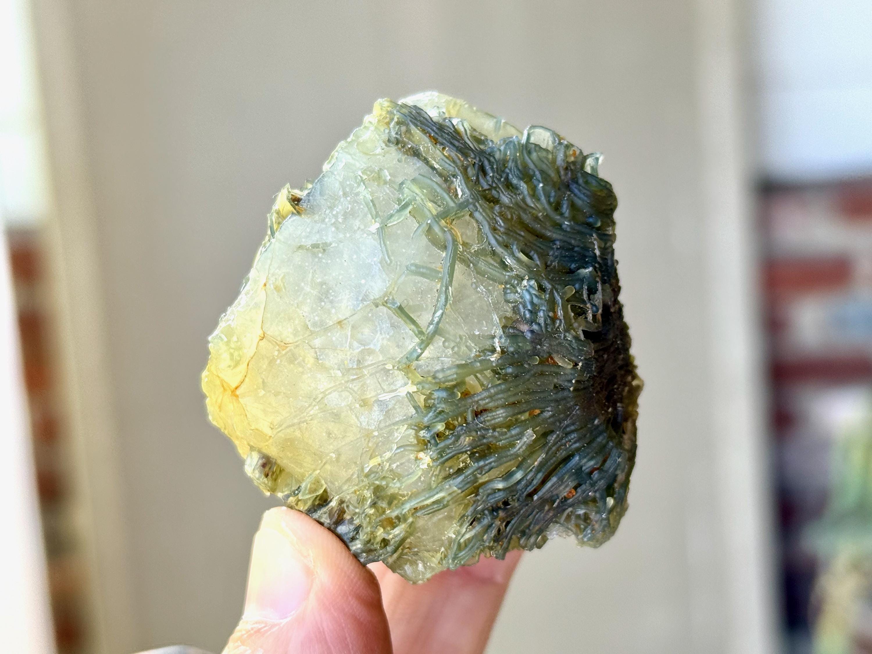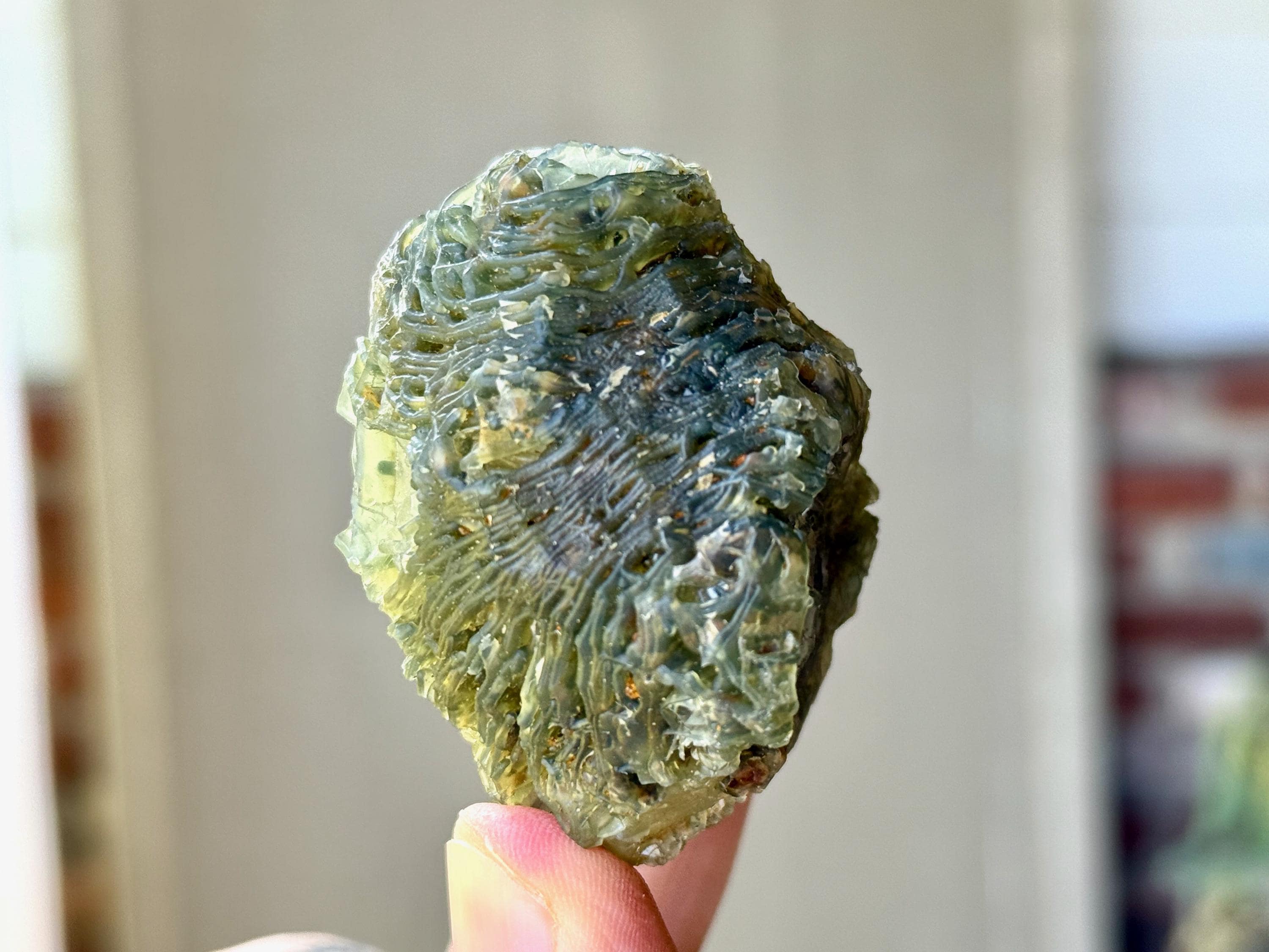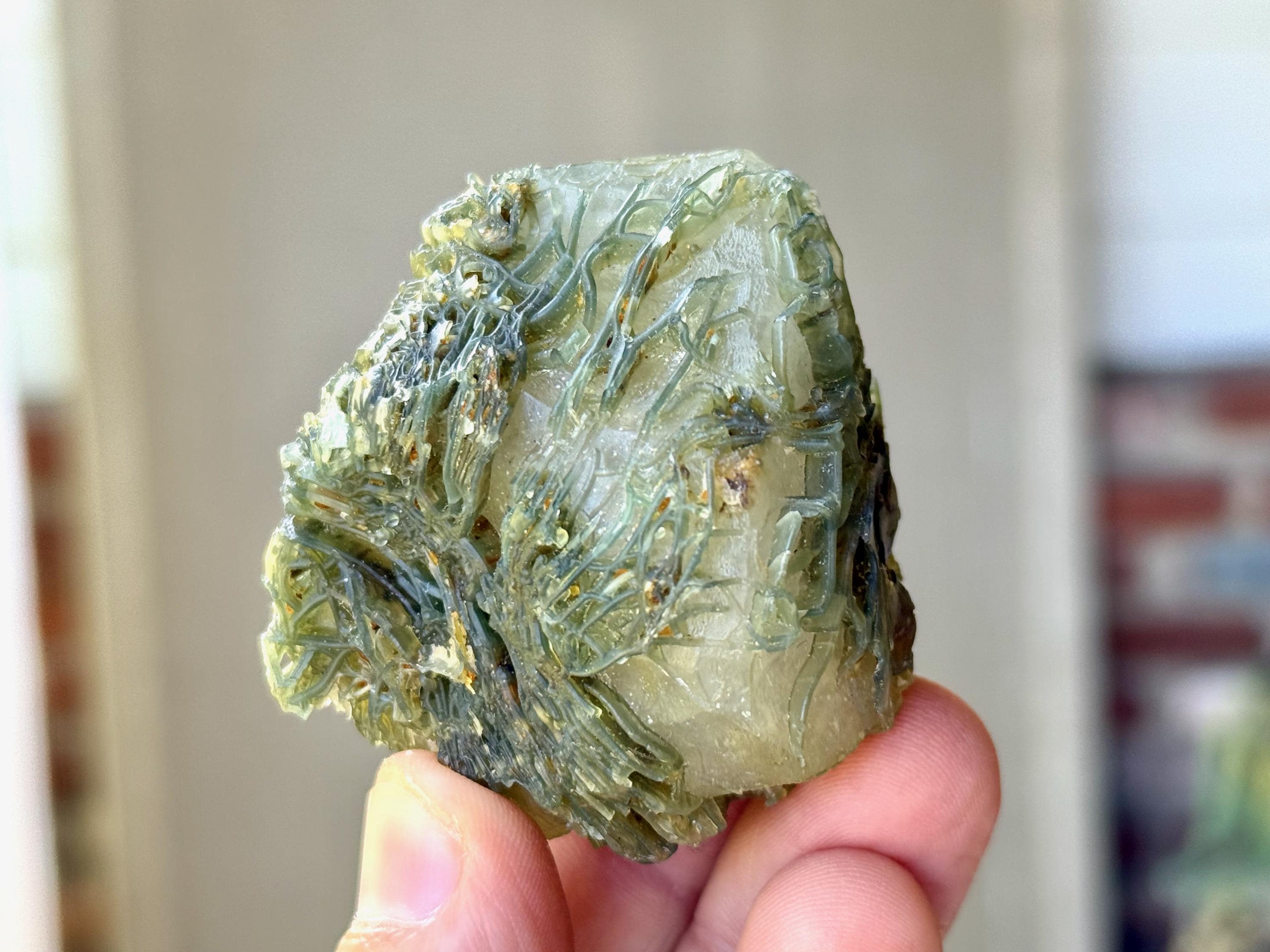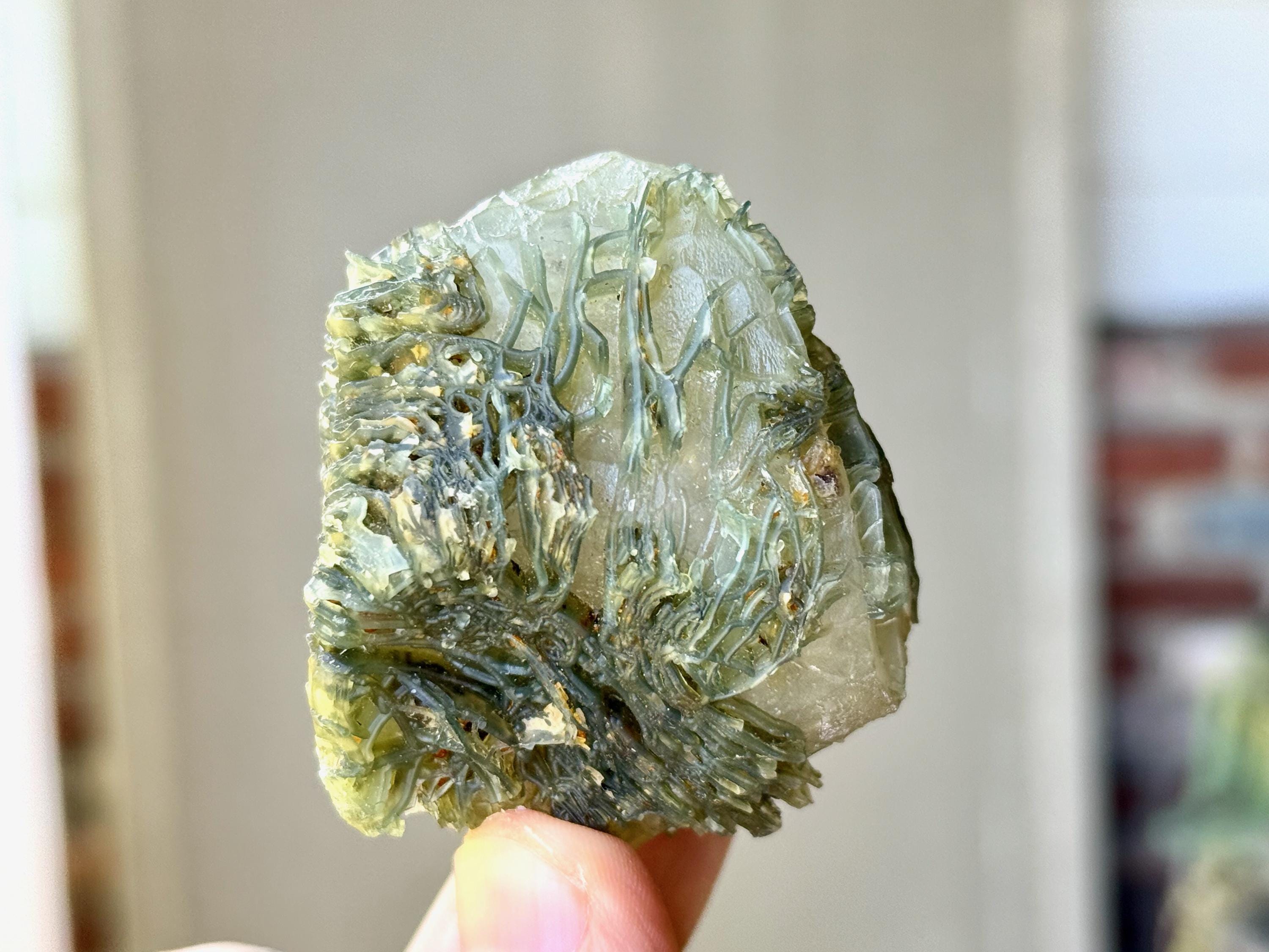 Our favorite piece from this collection, this Black Mountain Gobi Agate features an aesthetic display of fossilized coral growth over a base of what is likely Quartz & Chaledony. In natural light, the greenish overgrowth contrasts beautifully with the white Quartz. However, when backlit, this entire crystal lights up in spectacular fashion (Photos 1, 3-4).