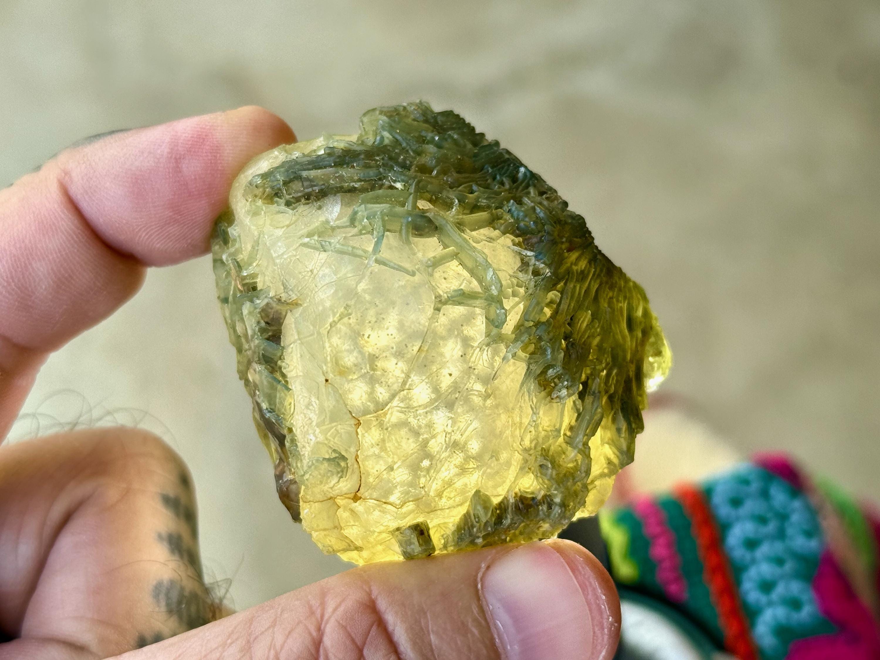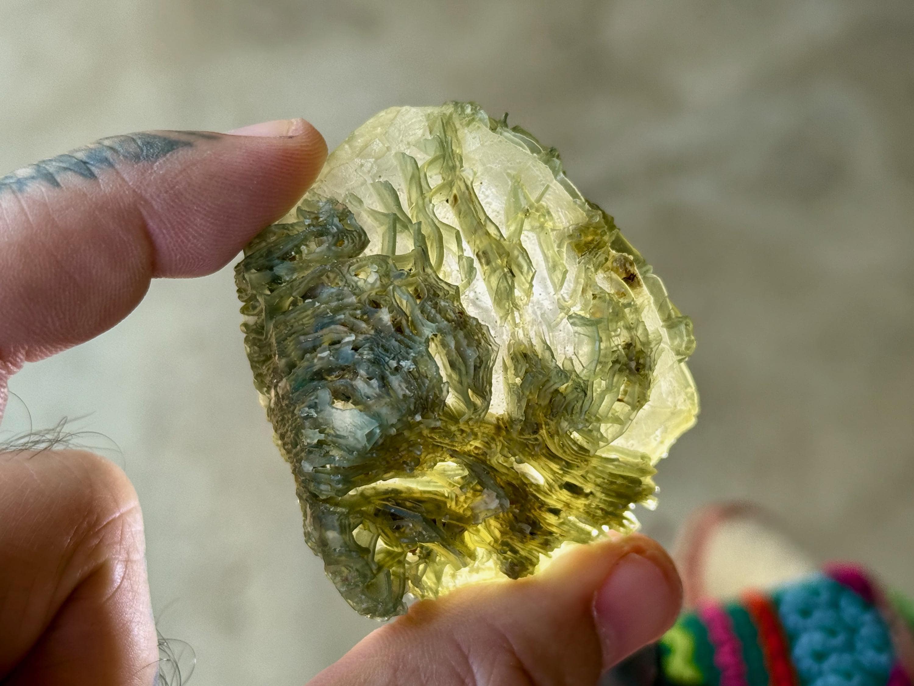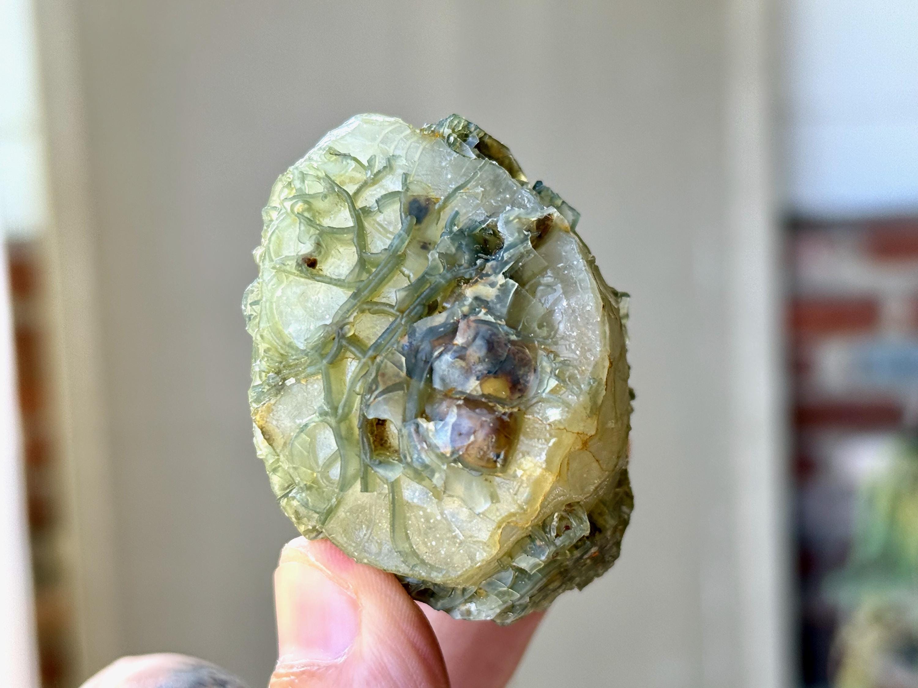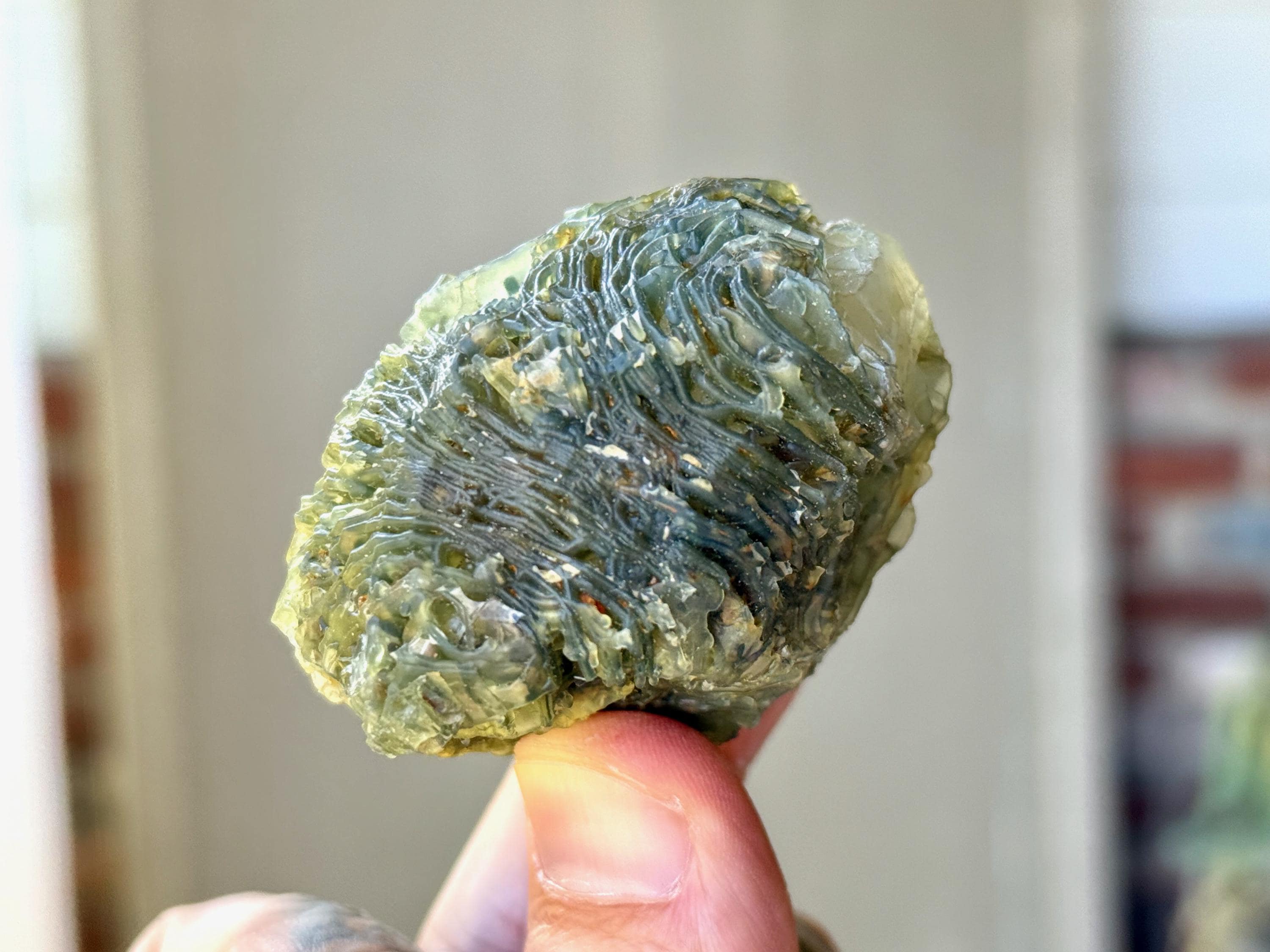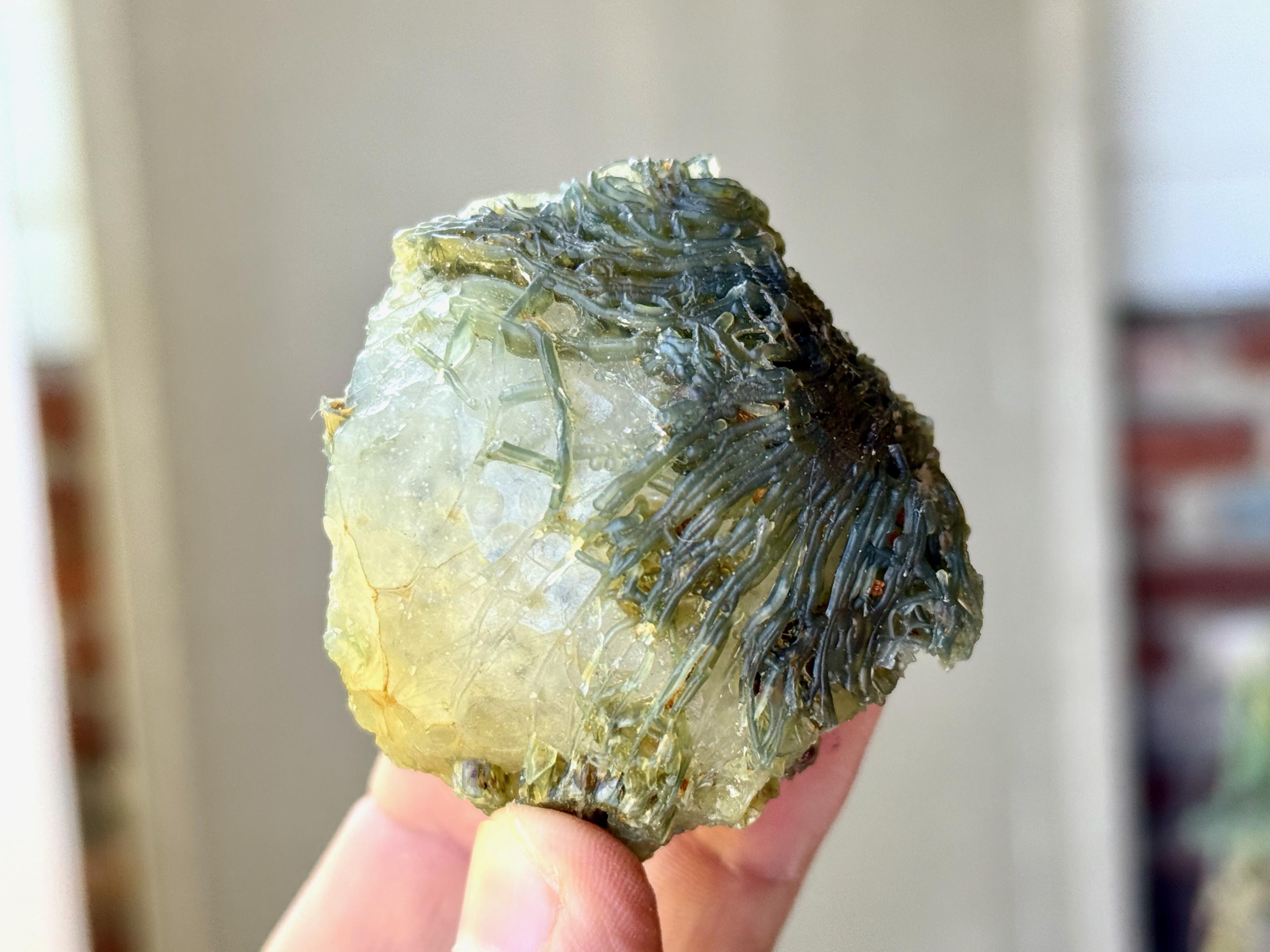 Our favorite piece from this collection, this Black Mountain Gobi Agate features an aesthetic display of fossilized coral growth over a base of what is likely Quartz & Chaledony. In natural light, the greenish overgrowth contrasts beautifully with the white Quartz. However, when backlit, this entire crystal lights up in spectacular fashion (Photos 1, 3-4).