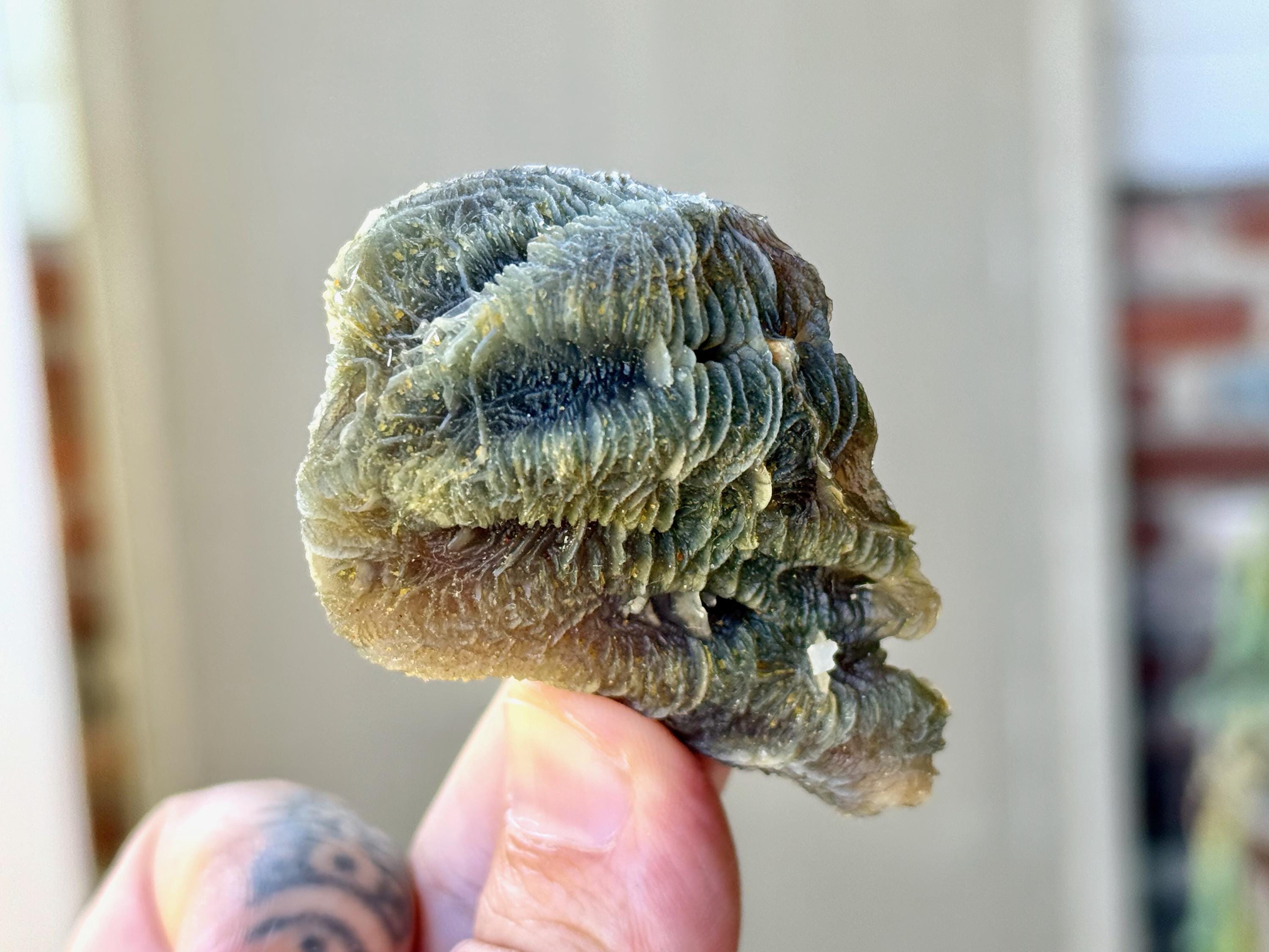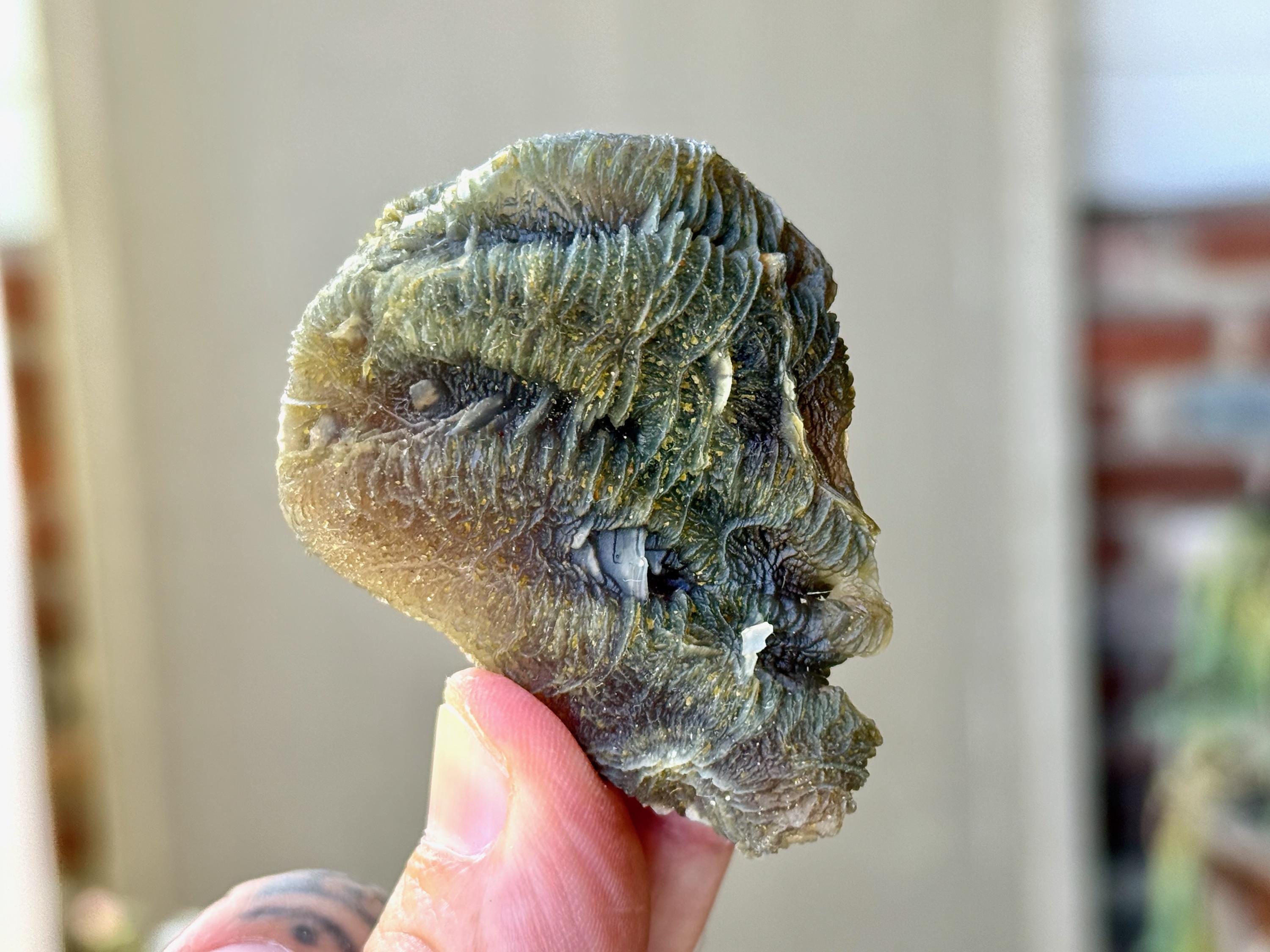 Magnificent patterns and fossilized imprints cover this extraordinary Black Mountain Gobi! In natural light, this stone has a greenish-black color with intricate patterning throughout. When backlit, however, this stone lights up brilliantly! (Photos 2-4). Extraordinary!