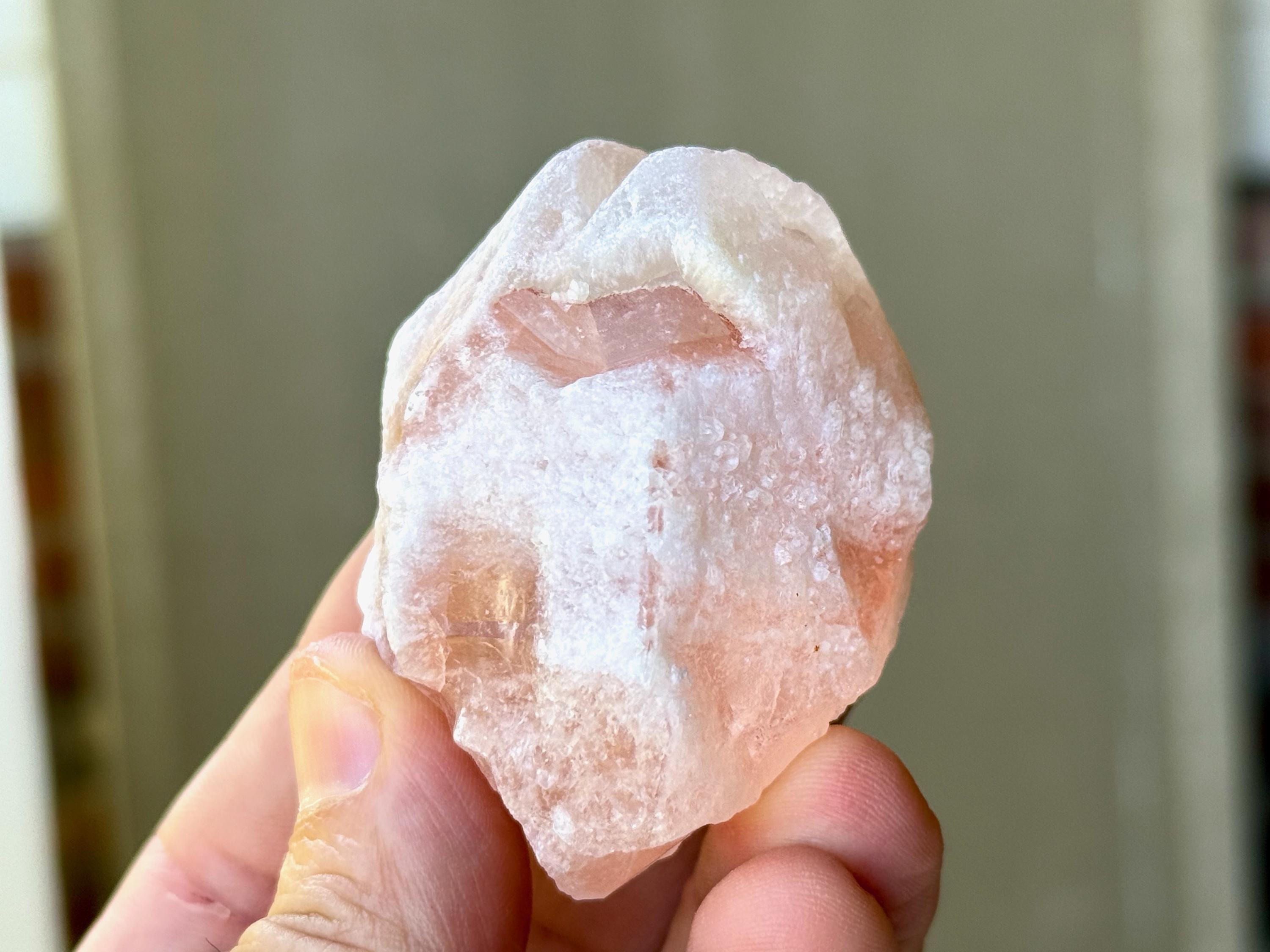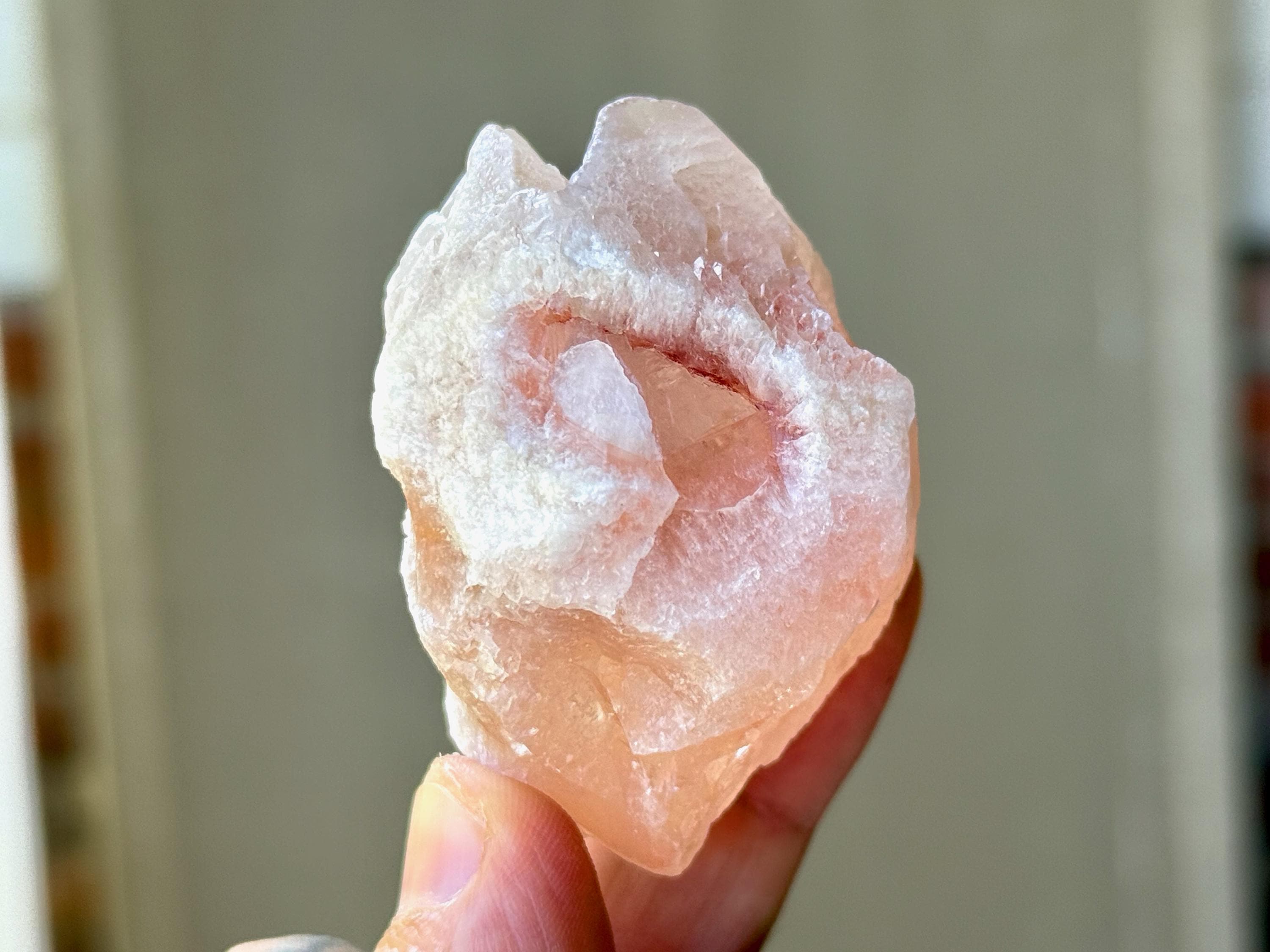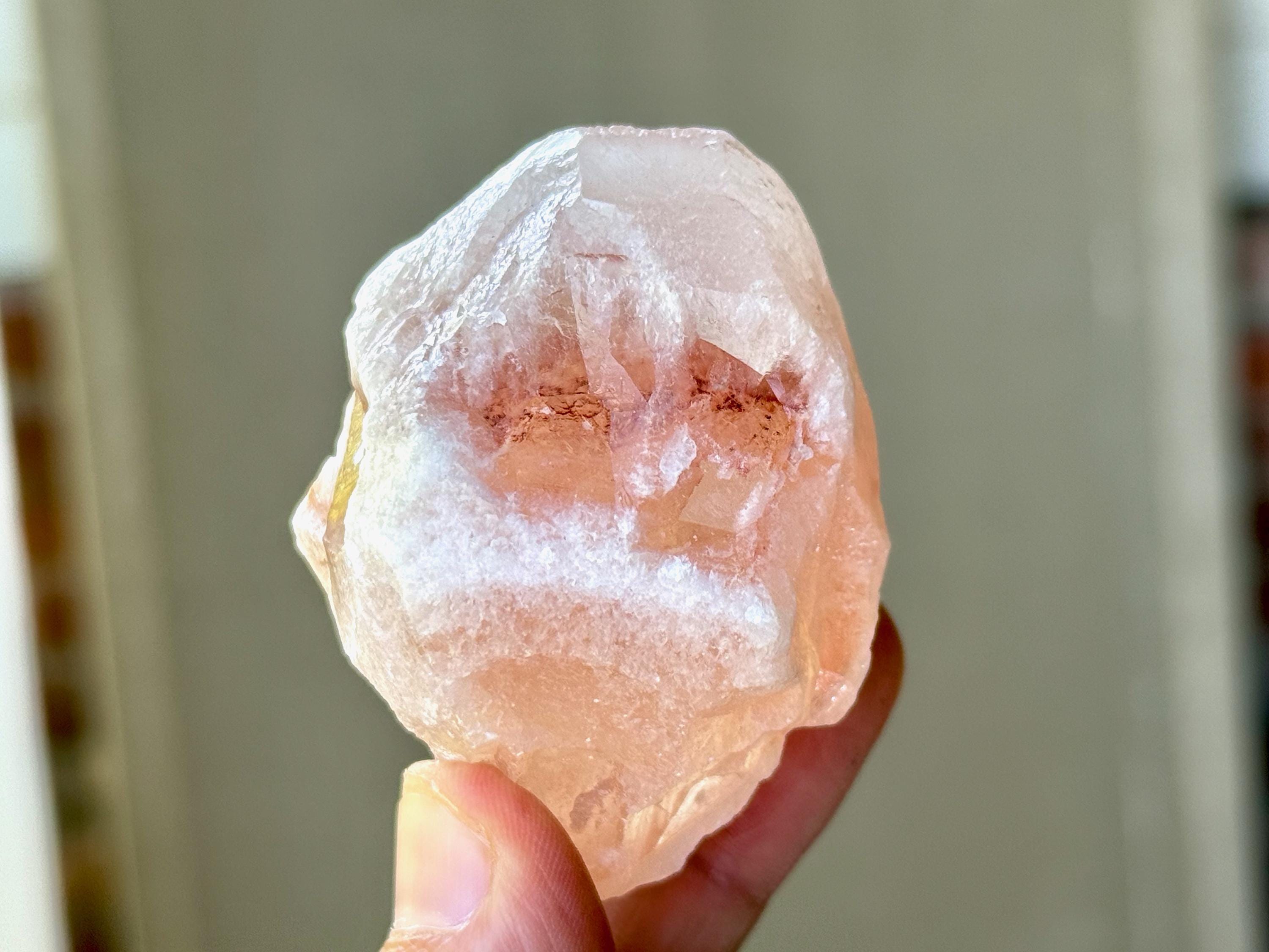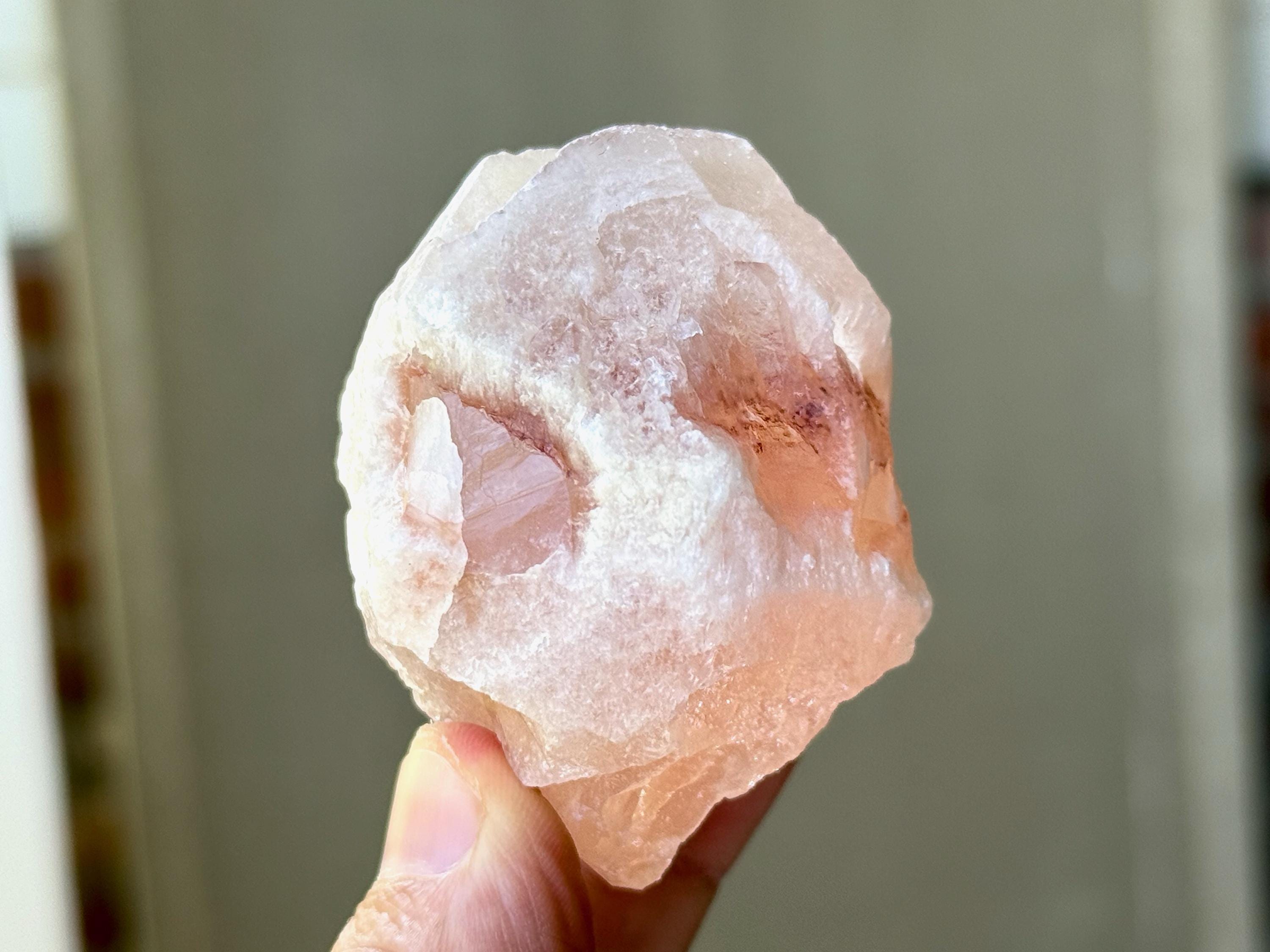 An ethereal dream! This Dreamsicle Lemurian has a vibrant pink hue and a white "frost" overgrowth that blankets most of the surface, creating a lovely contrast of color. When backlit, as in Photos 4-5, we can see how nice the translucency is. We also love the marbling of white over lustrous pink and all the little "windows" that reveal the pink quartz beneath the snowy exterior.
