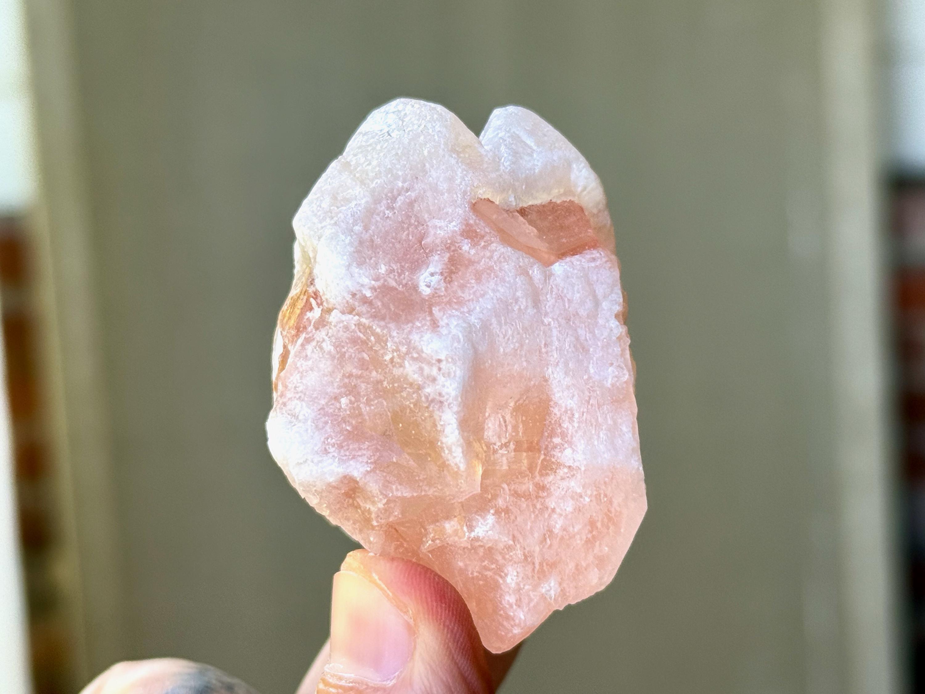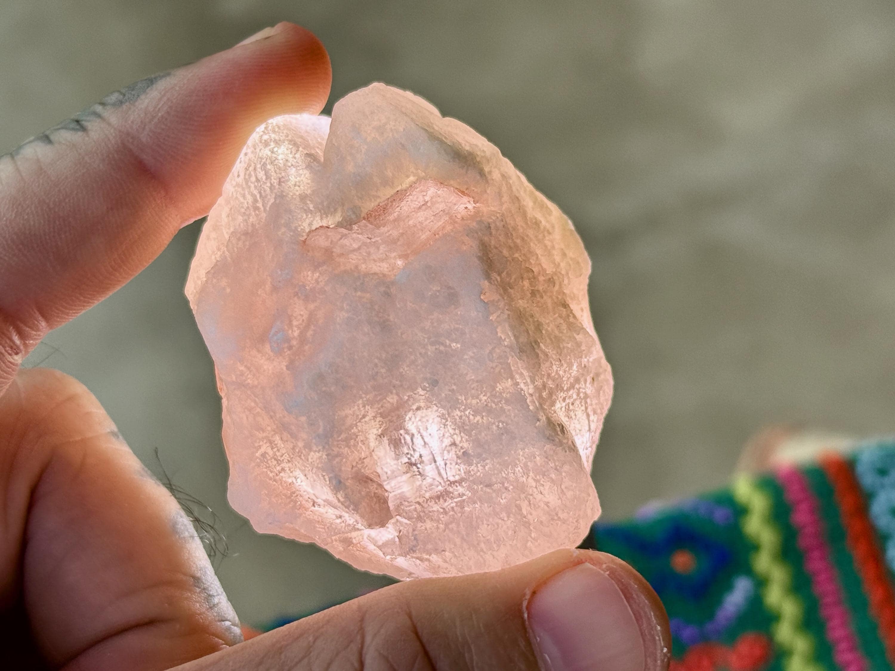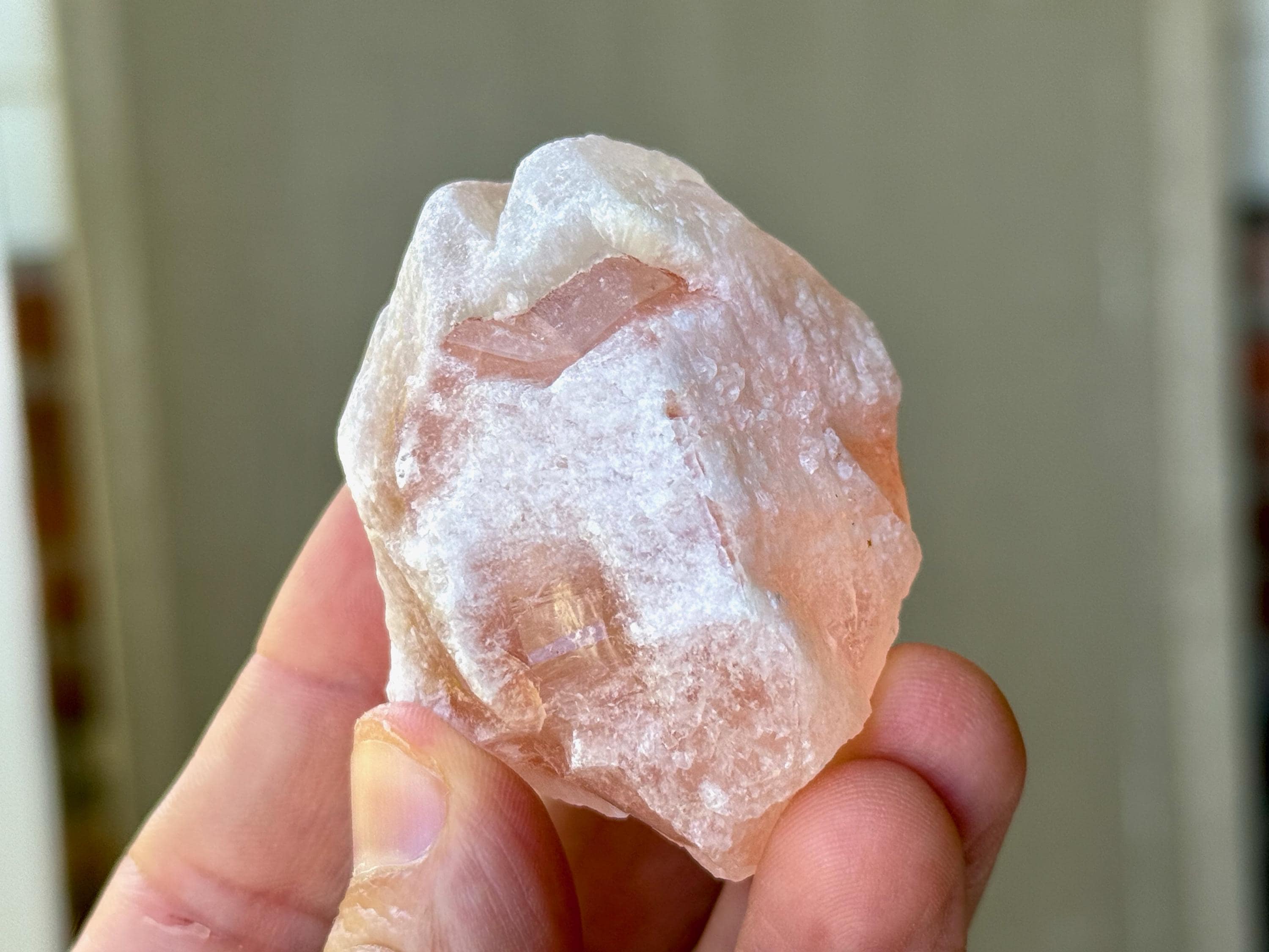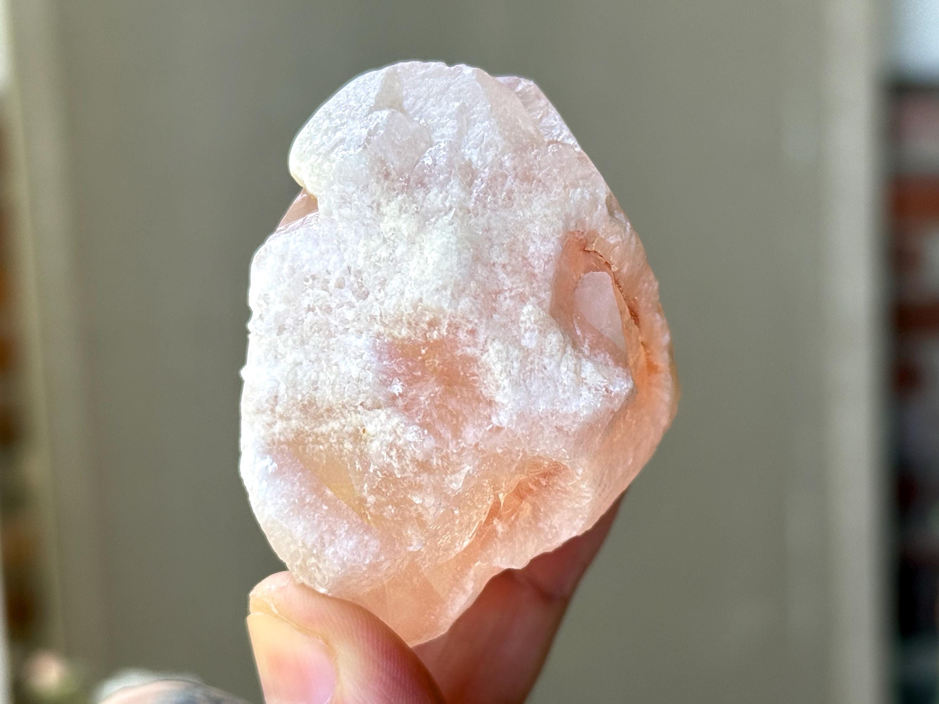 An ethereal dream! This Dreamsicle Lemurian has a vibrant pink hue and a white "frost" overgrowth that blankets most of the surface, creating a lovely contrast of color. When backlit, as in Photos 4-5, we can see how nice the translucency is. We also love the marbling of white over lustrous pink and all the little "windows" that reveal the pink quartz beneath the snowy exterior.