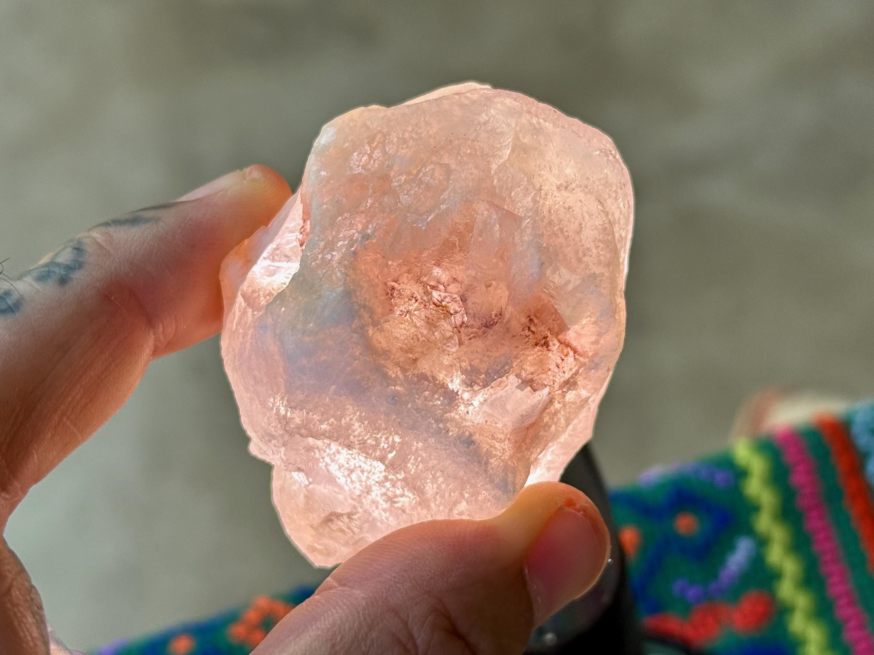 This Pink Dreamsicle Lemurian Quartz comes from a recent find in the Serra do Cabral Mountains, Minas Gerais, Brazil.