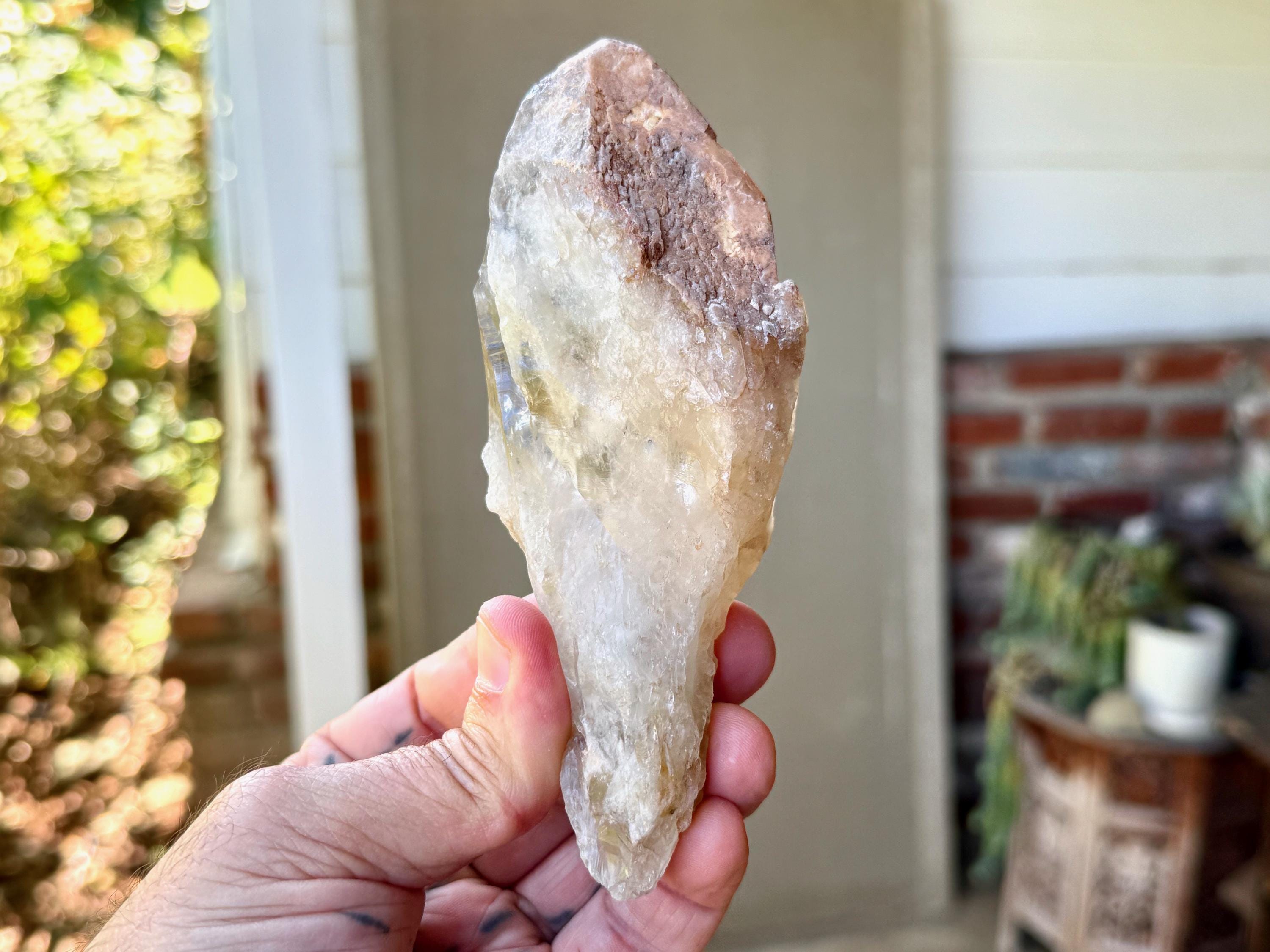 One of the largest Powellite Phantom crystals from this collection! This piece displays a powerful, elongated "root" formation to with outstanding luster and an array of textural contact impressions covering its body. The back main facet area is "frosted" and there's a layer of Amethyst inclusion just below the top.