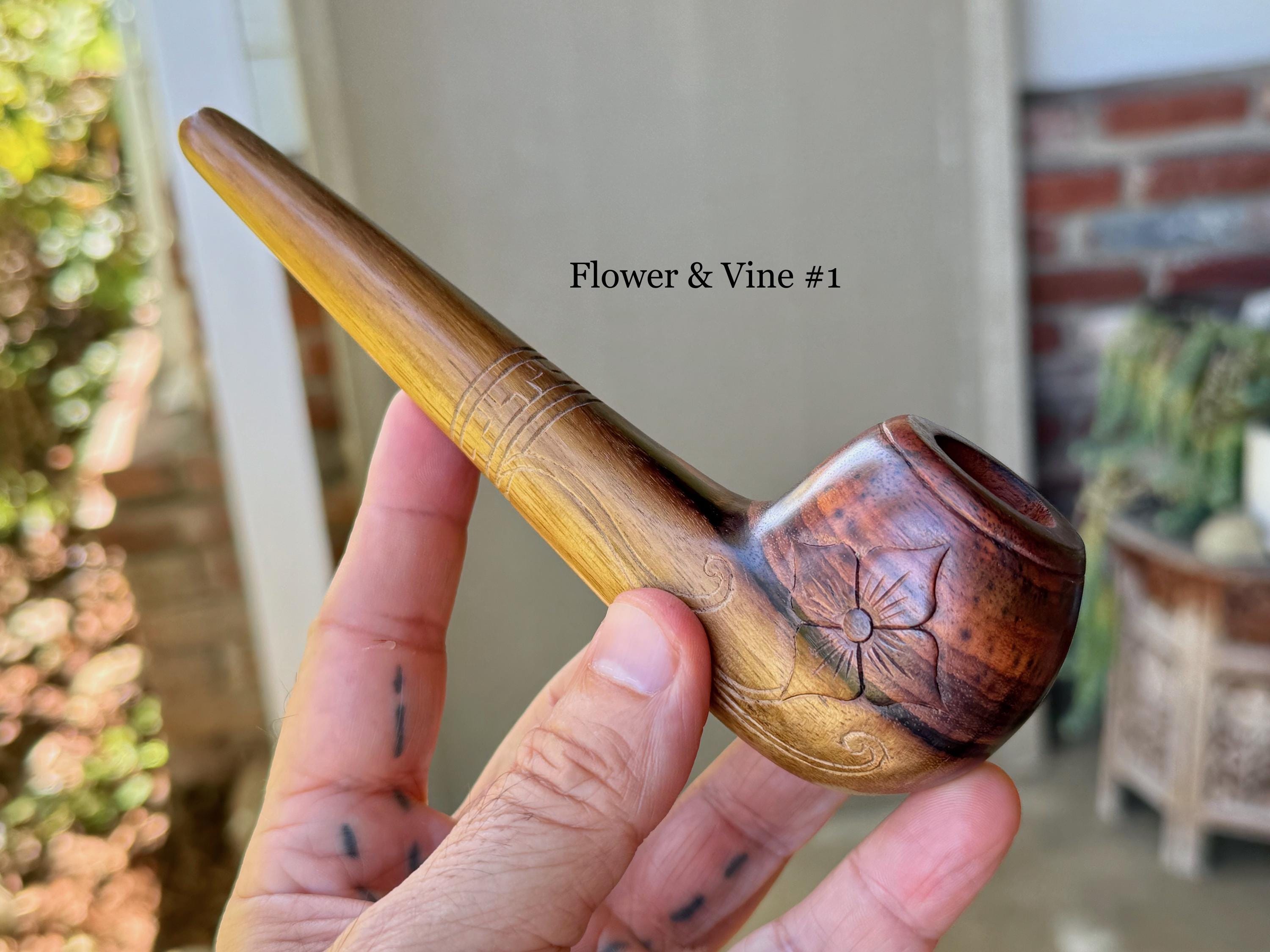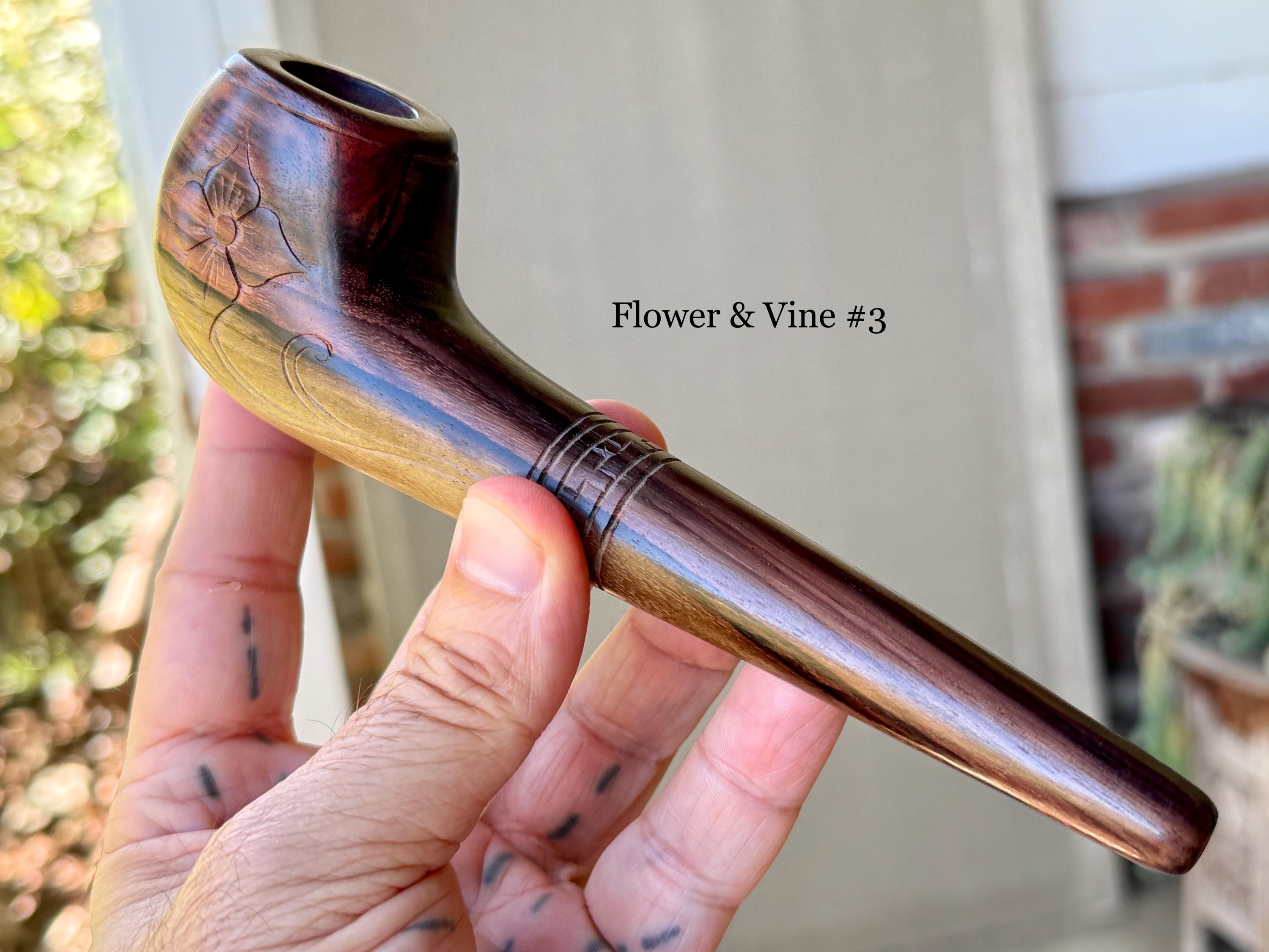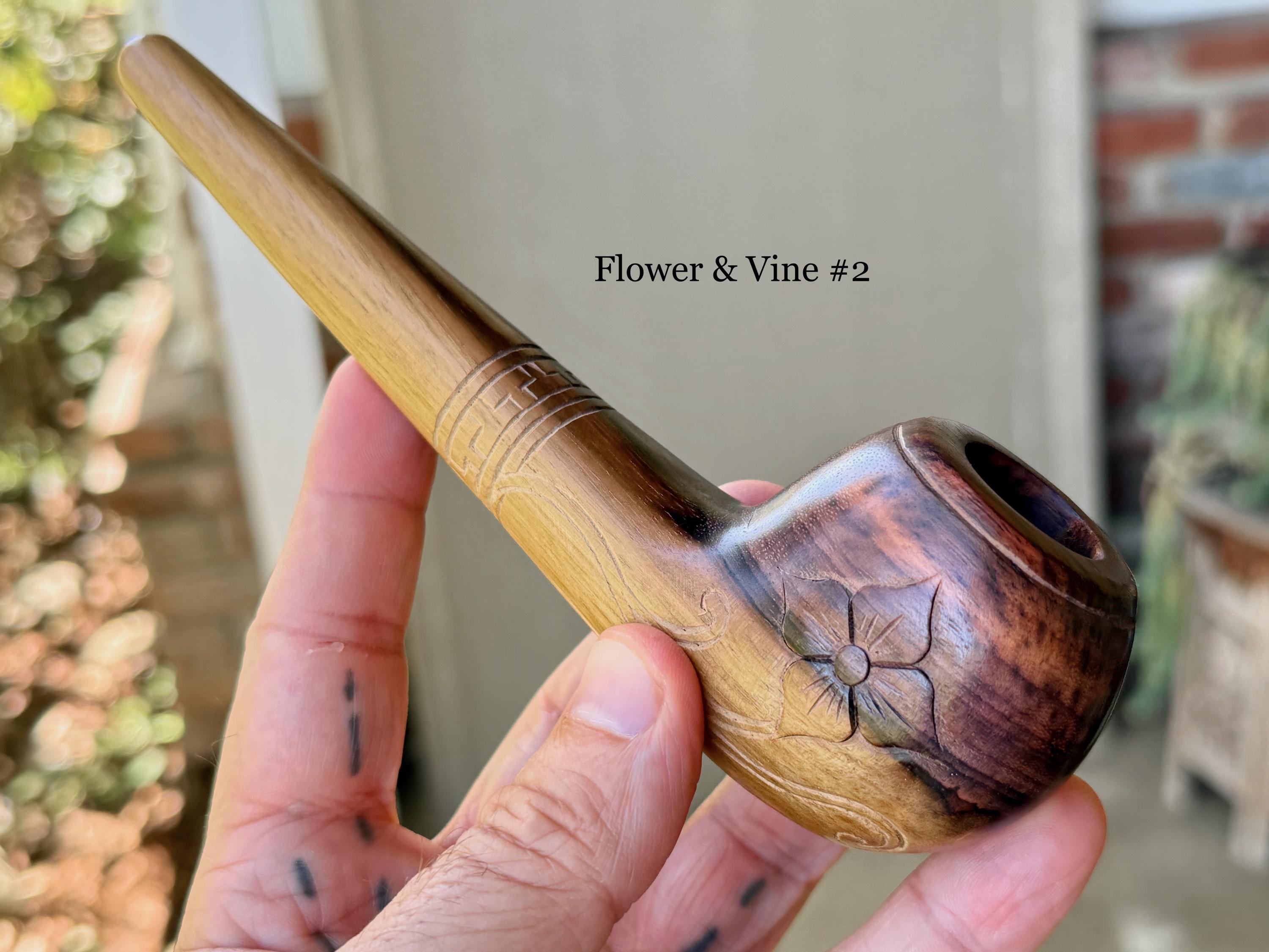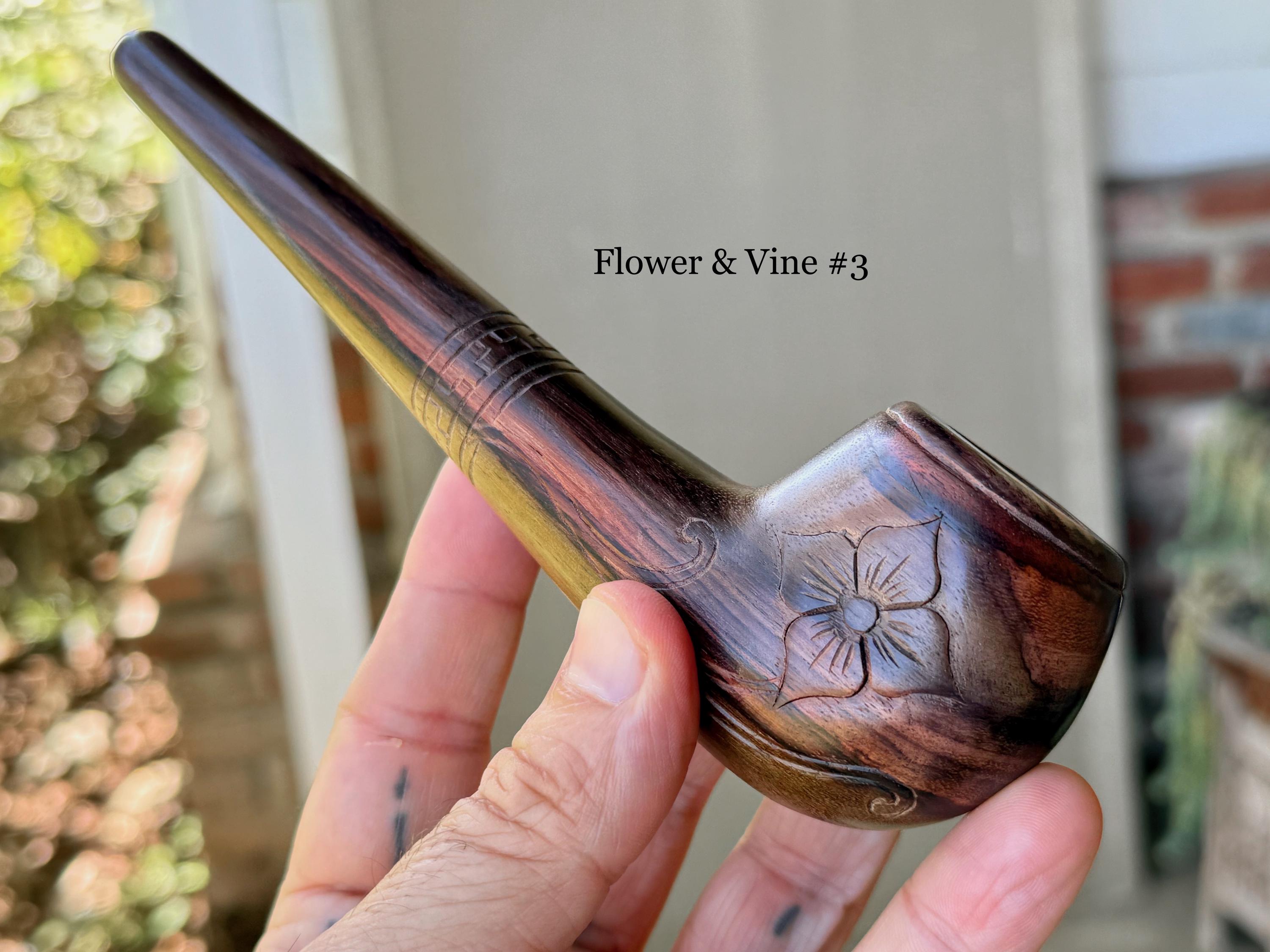 These traditional, handcrafted pipes with floral carvings were made by our artisans in Indonesia. The flower is actually a Tobacco Flower! These elegant pipes are for tobacco/mapacho and intended for — but not limited to — ceremonial use.