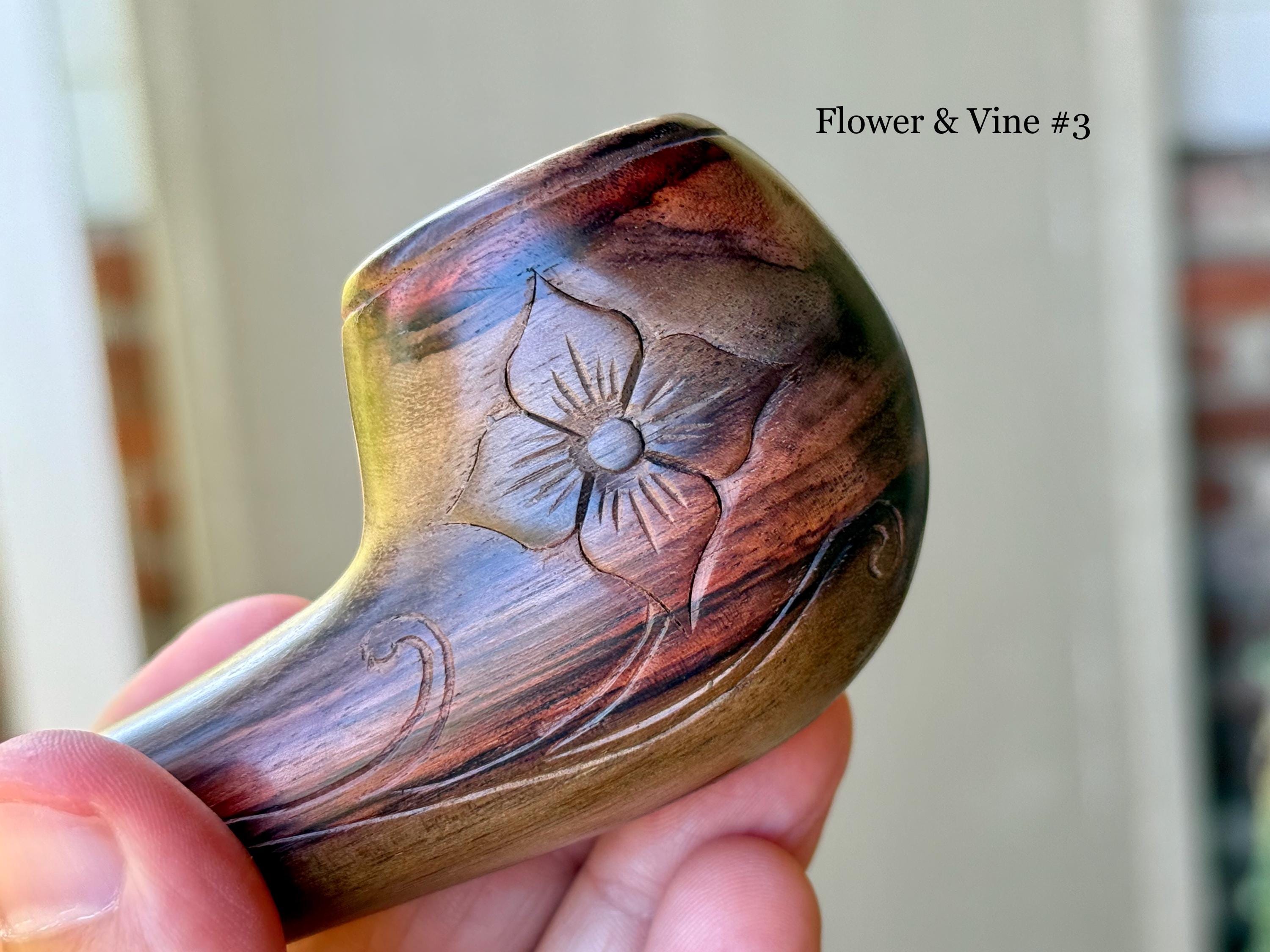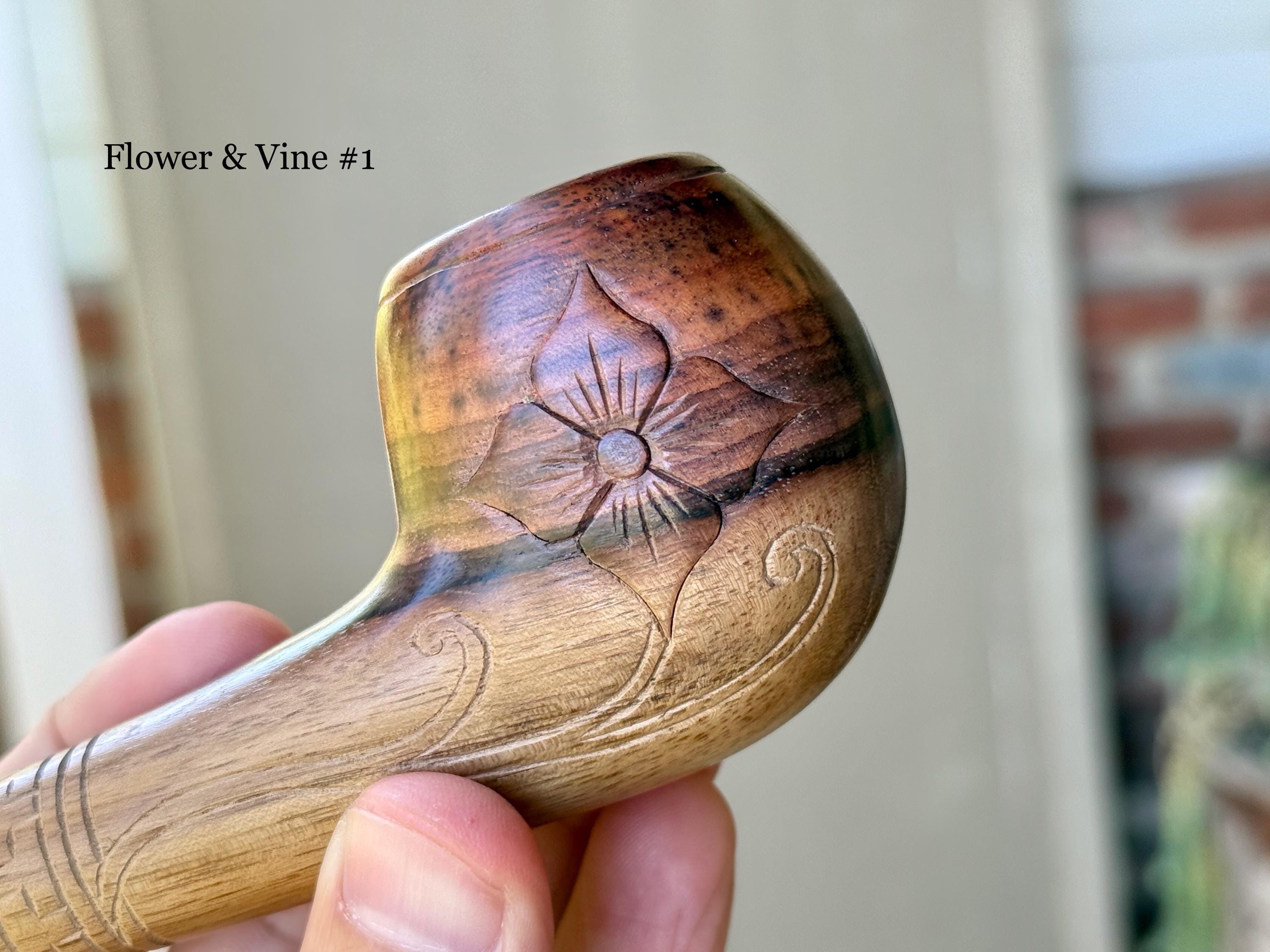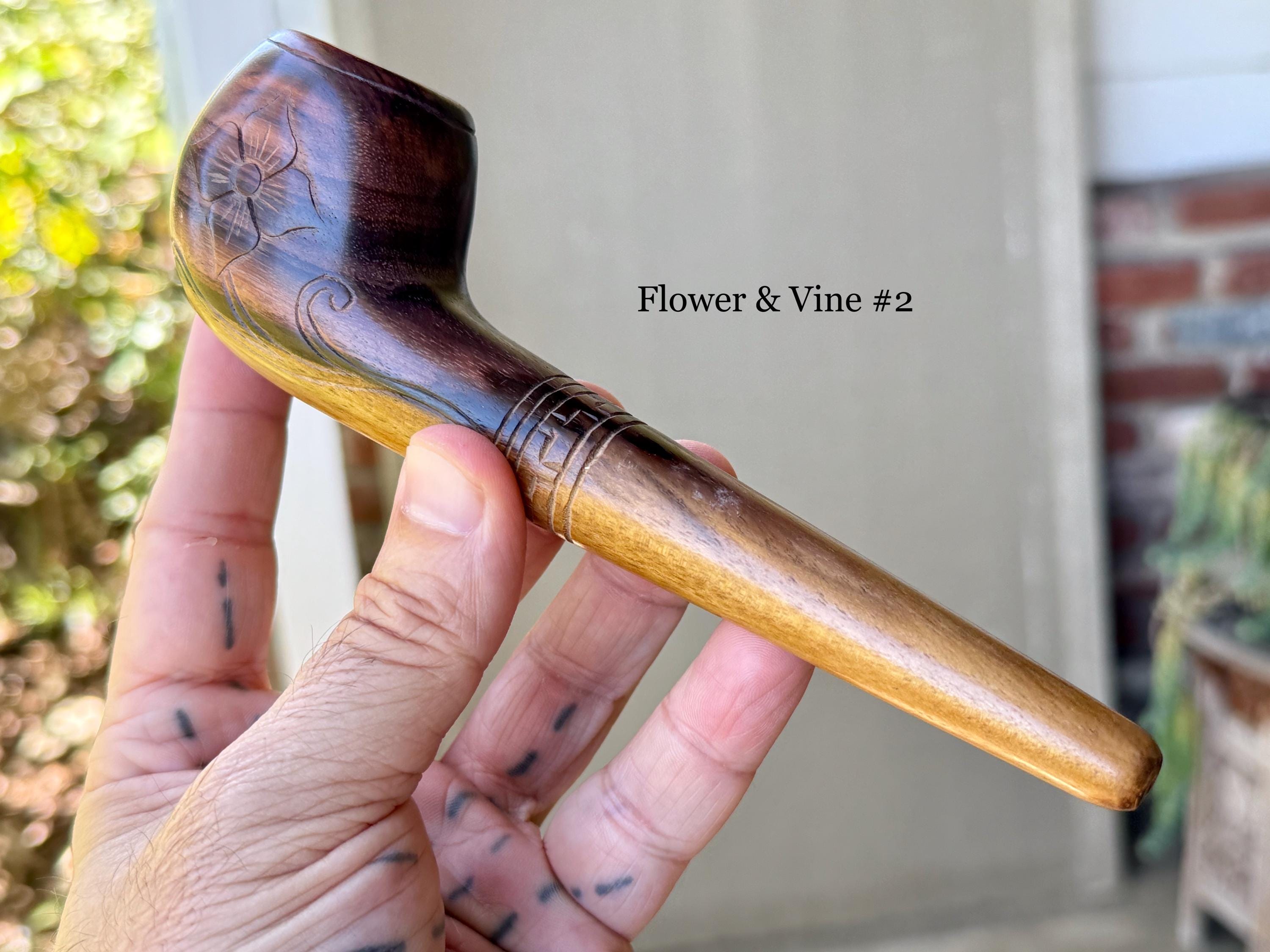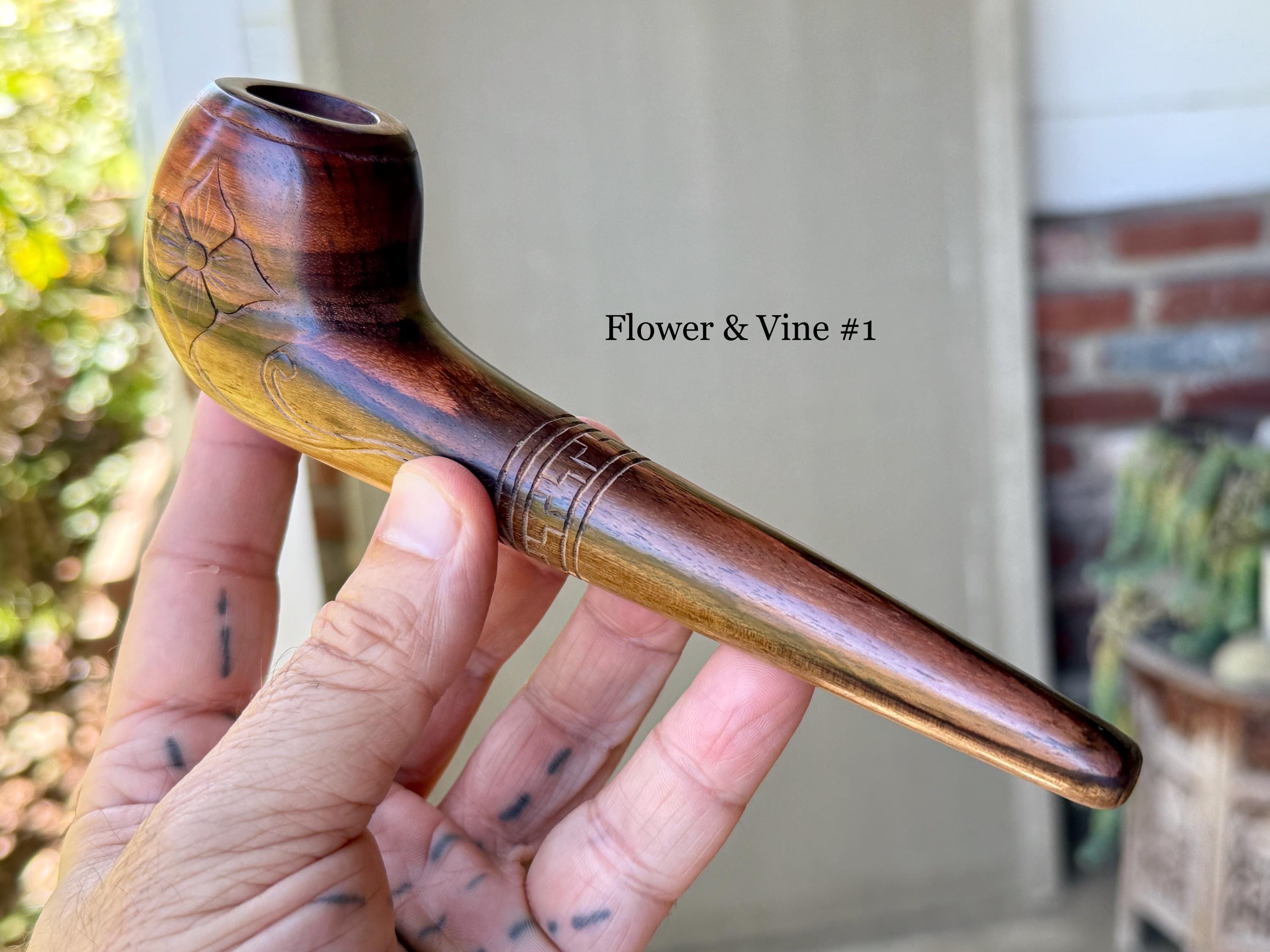 These traditional, handcrafted pipes with floral carvings were made by our artisans in Indonesia. The flower is actually a Tobacco Flower! These elegant pipes are for tobacco/mapacho and intended for — but not limited to — ceremonial use.