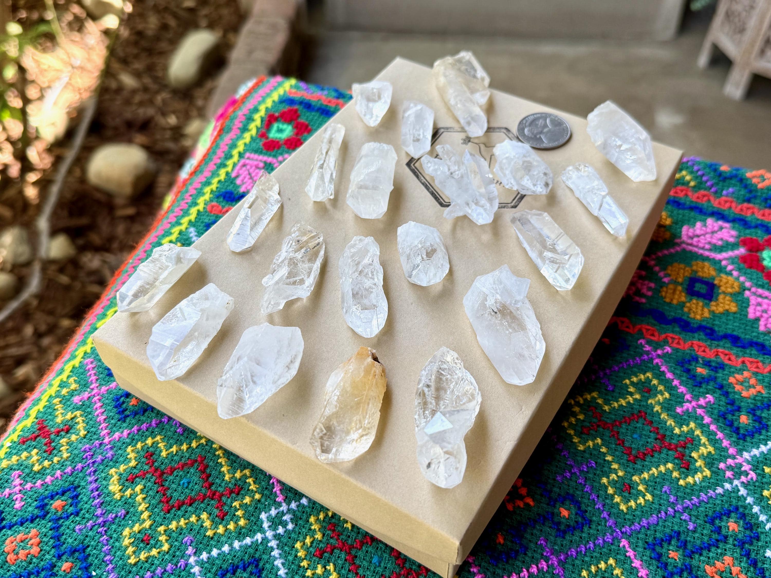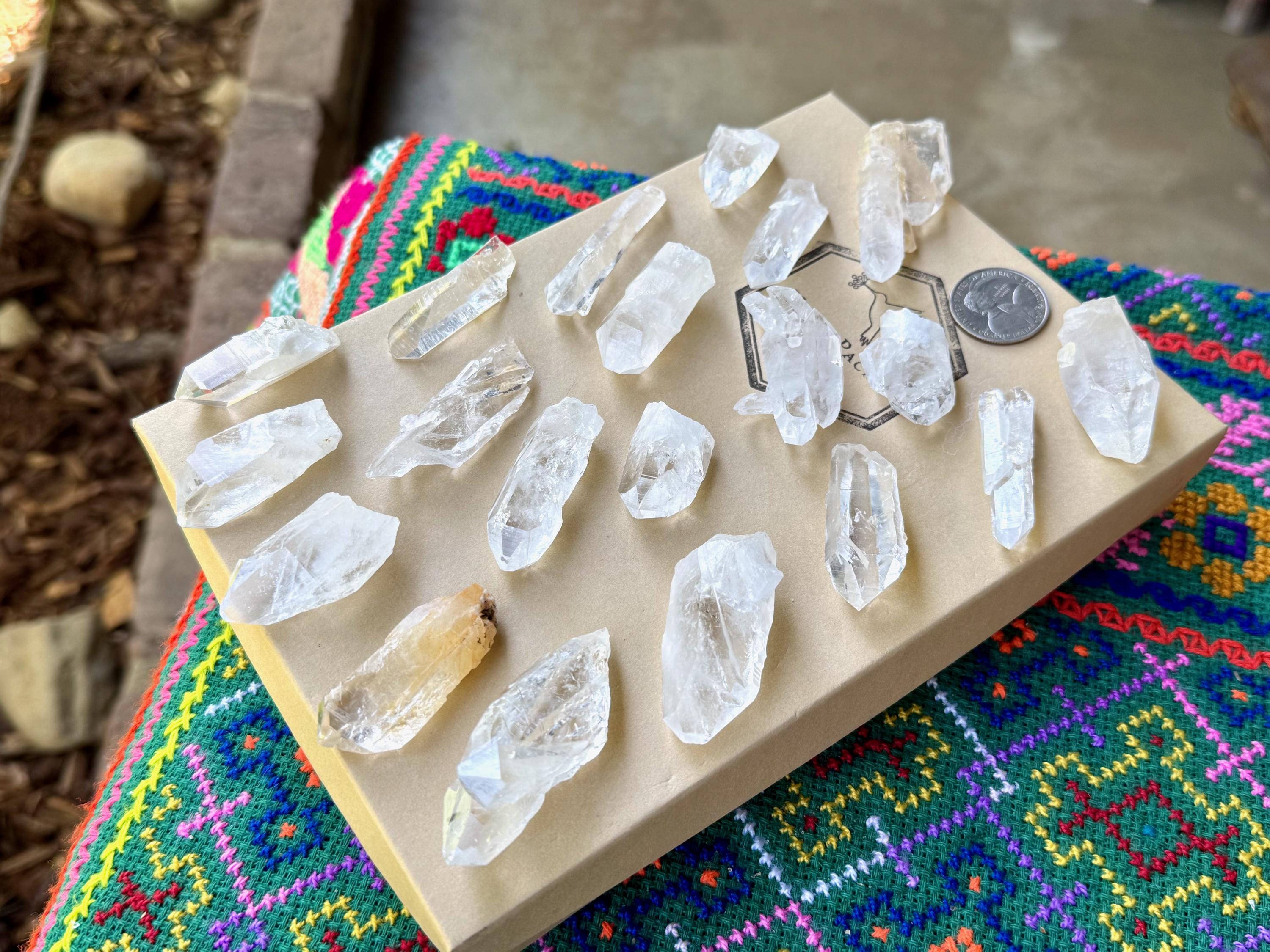 These are mostly smaller to medium sized points included here (see measurements below and Quarter in photos for size comparison). This is an ideal lot for resellers, jewelry makers, crystal gridders, etc.