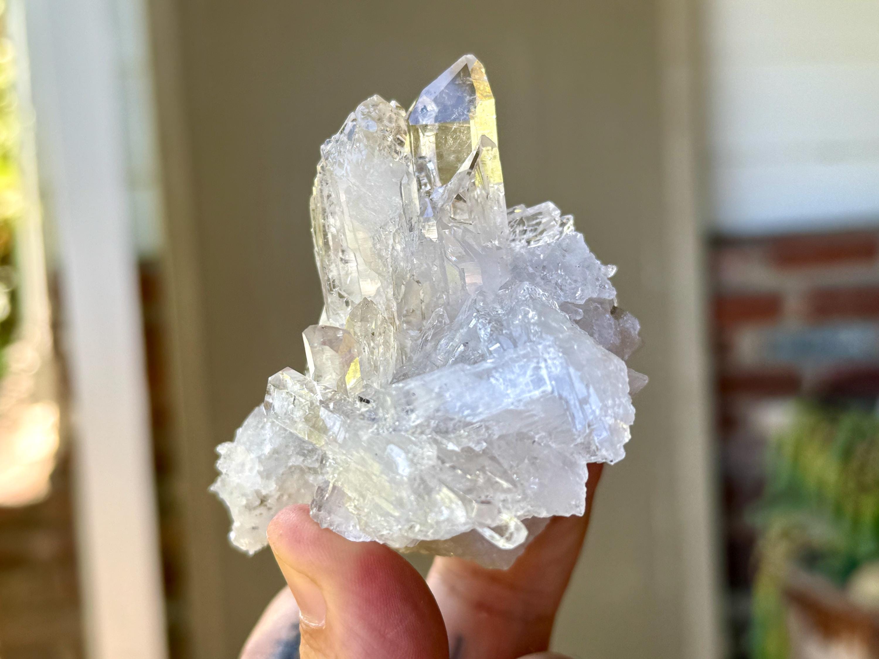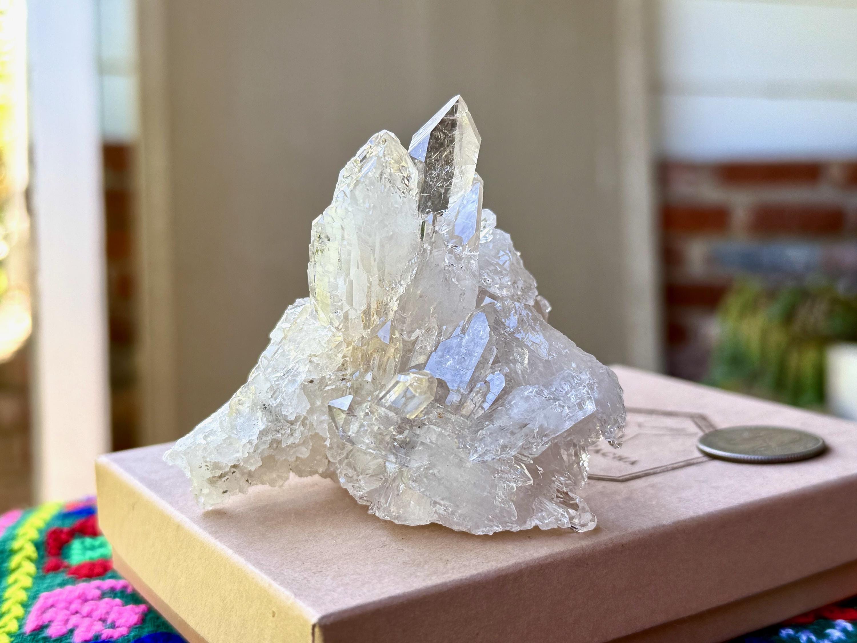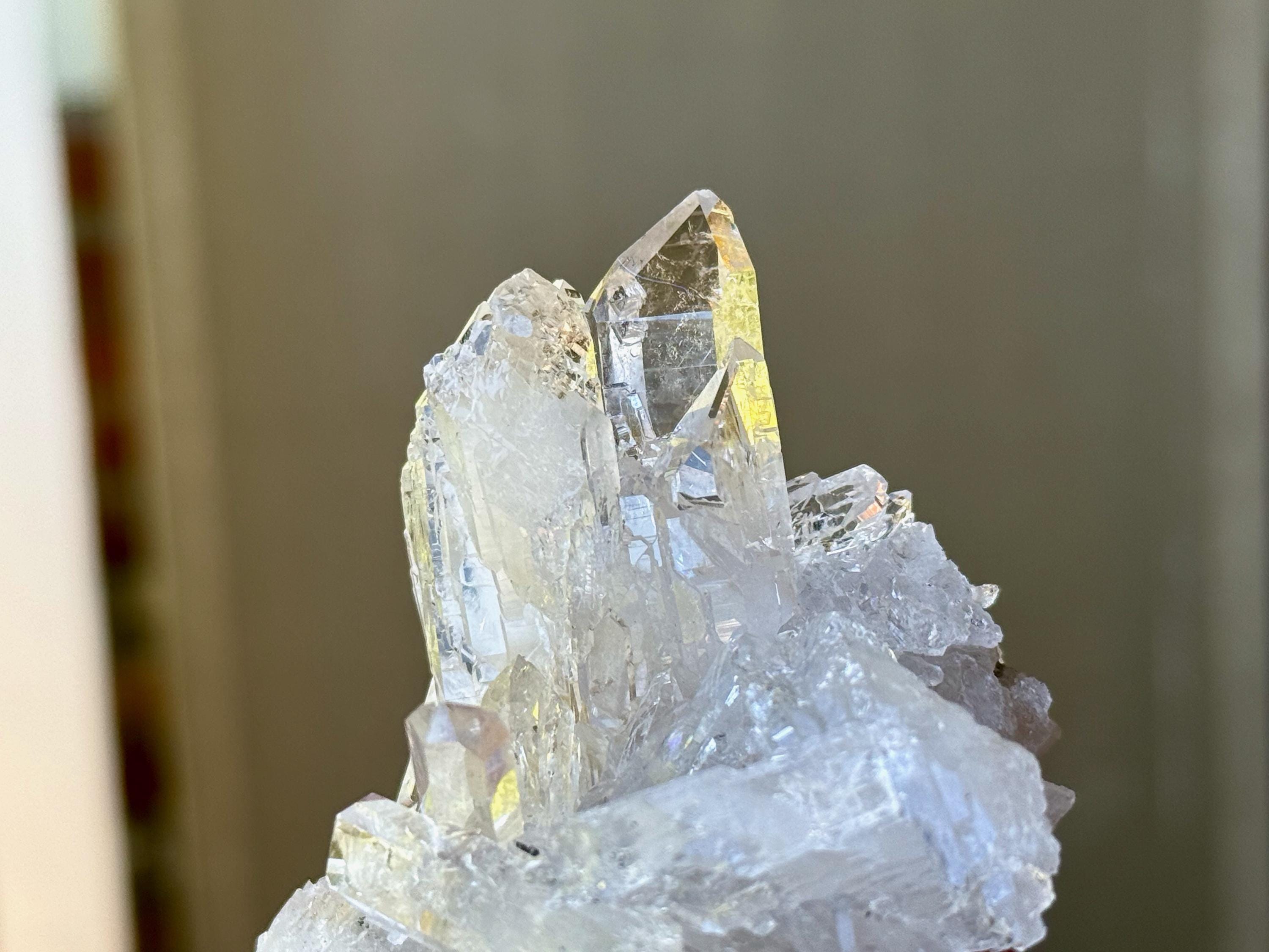 Like an ethereal crystal castle, this magnificent Cathedral Quartz glistens with its multiple spires and glorious luster! This crystal possesses a wonderful formation, with a set of primary crystals in the center sitting amidst of a cluster of crystals at the base. The base is naturally broad and flat, so this piece sits upright on its own for display.