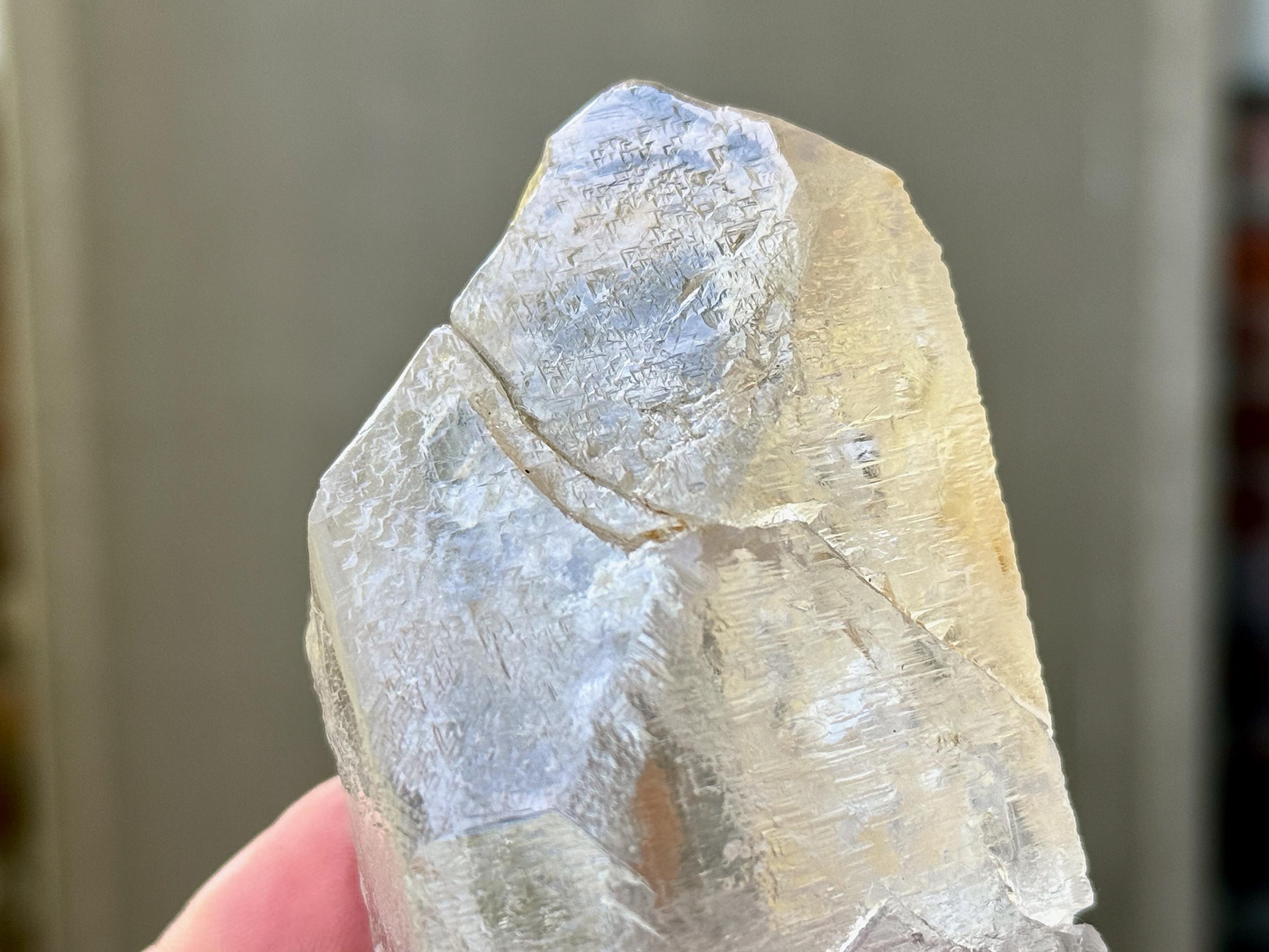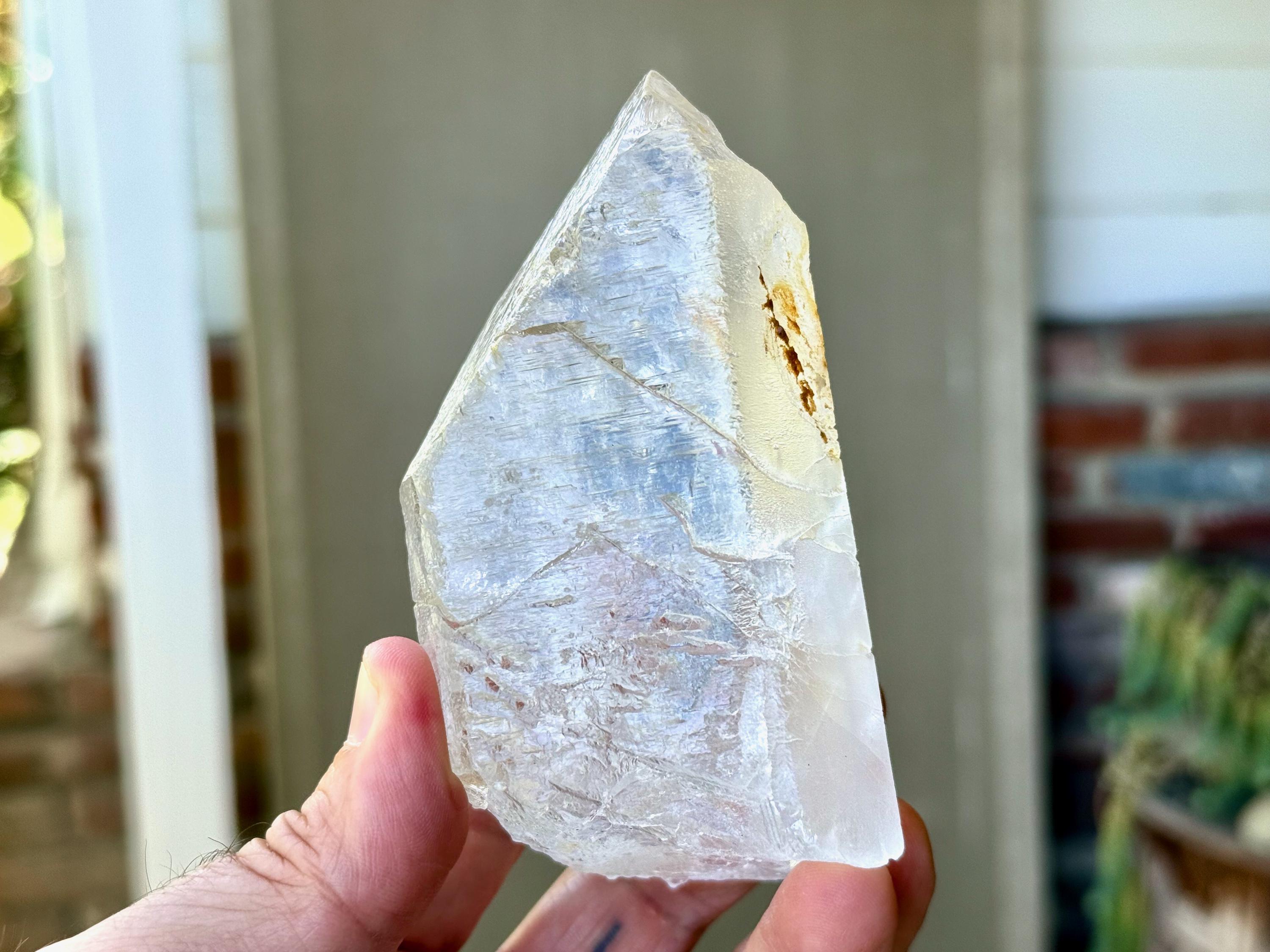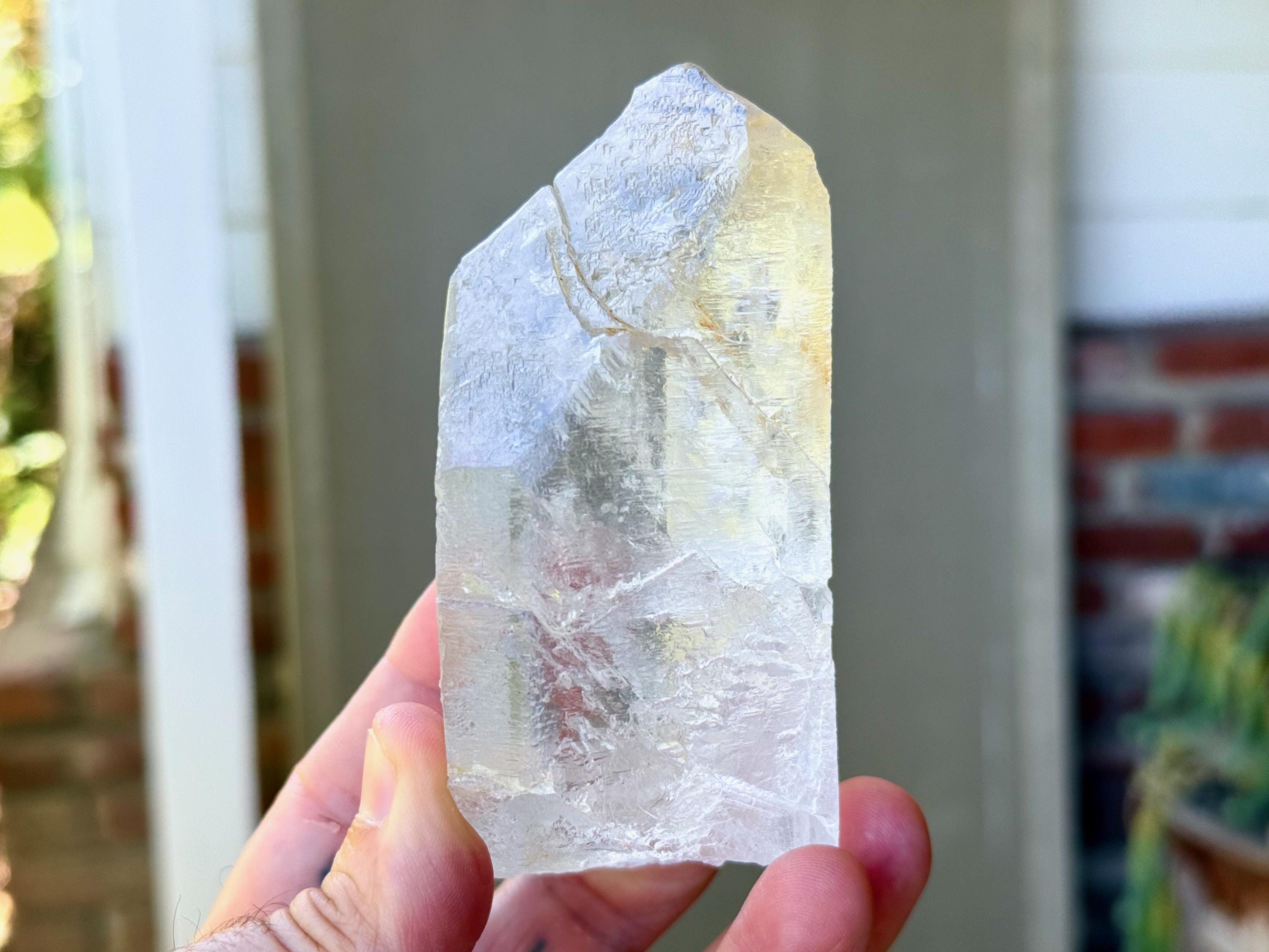 There are two rather prominent self-healed fractures within this crystal, one which bisects the main facet. We sometimes refer to these as "earthquake" crystals, as these indications show where this crystal fractured due to shifting tectonic plates (or earthquake activity), while still deep in the pocket of the earth. Over the course of hundreds of millions of years, this crystal managed to heal itself in a profound way. Crystals with these types of indications tend to have extremely powerful healing energies