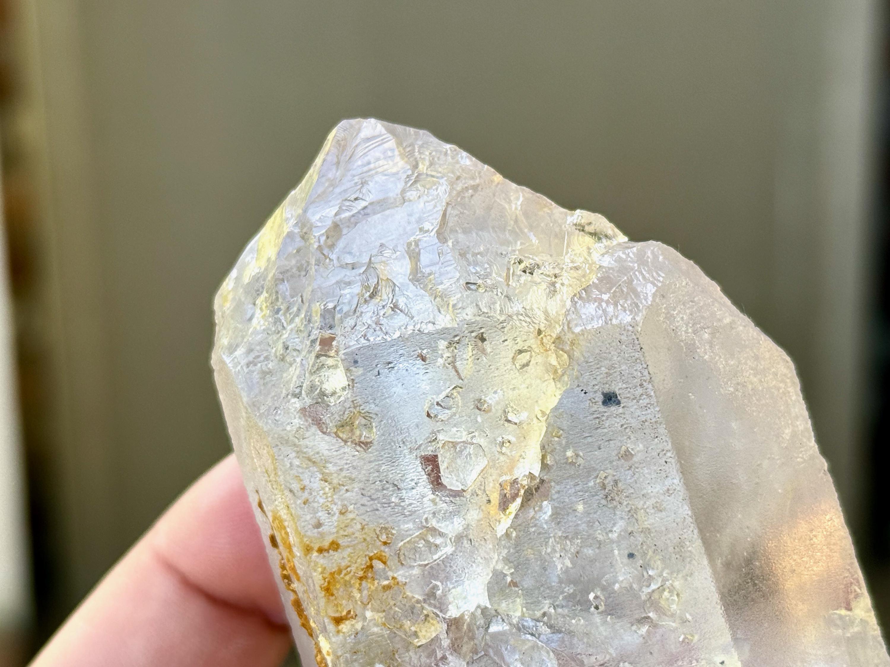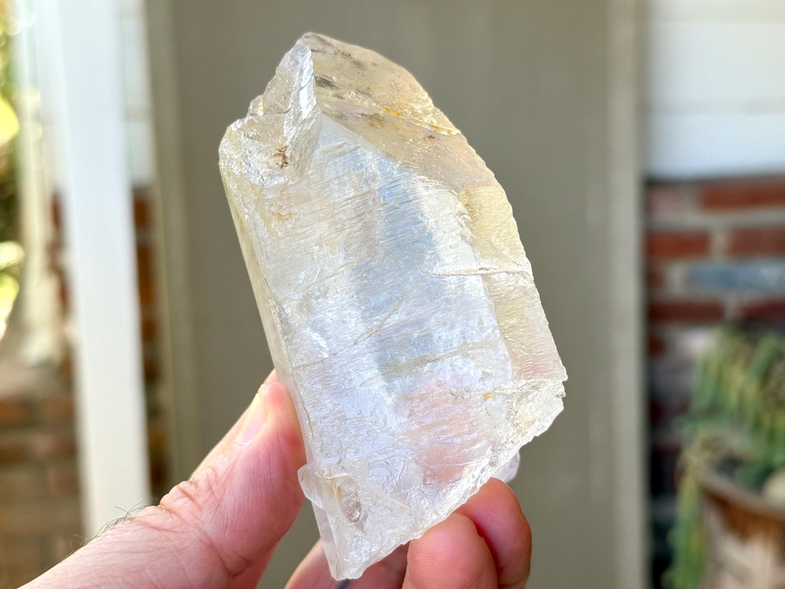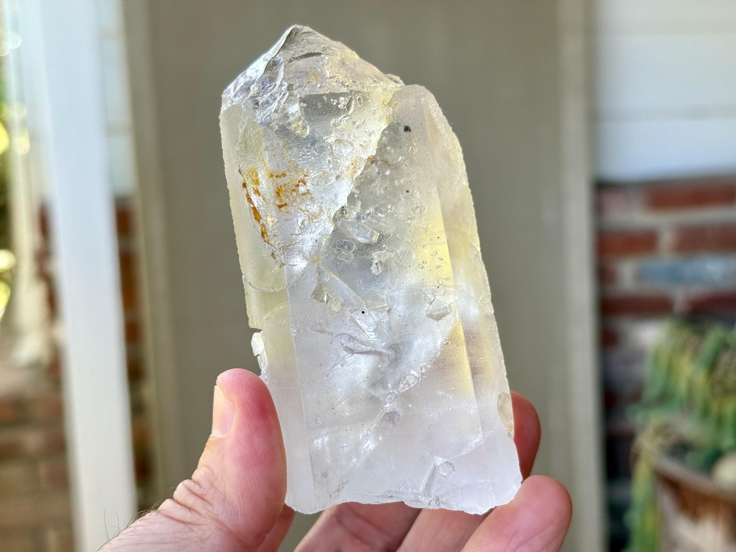 There are two rather prominent self-healed fractures within this crystal, one which bisects the main facet. We sometimes refer to these as "earthquake" crystals, as these indications show where this crystal fractured due to shifting tectonic plates (or earthquake activity), while still deep in the pocket of the earth. Over the course of hundreds of millions of years, this crystal managed to heal itself in a profound way. Crystals with these types of indications tend to have extremely powerful healing energies