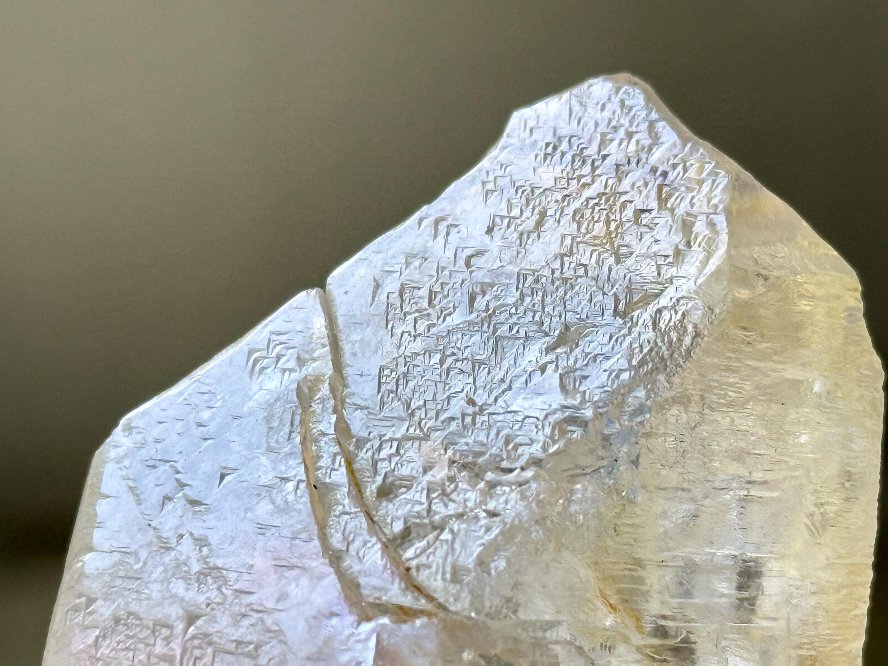 This exceptional Dissolution Quartz features an array of hydrothermal "dissolution" etchings on its body as well as a multitude of trigonic imprints covering its main facet!