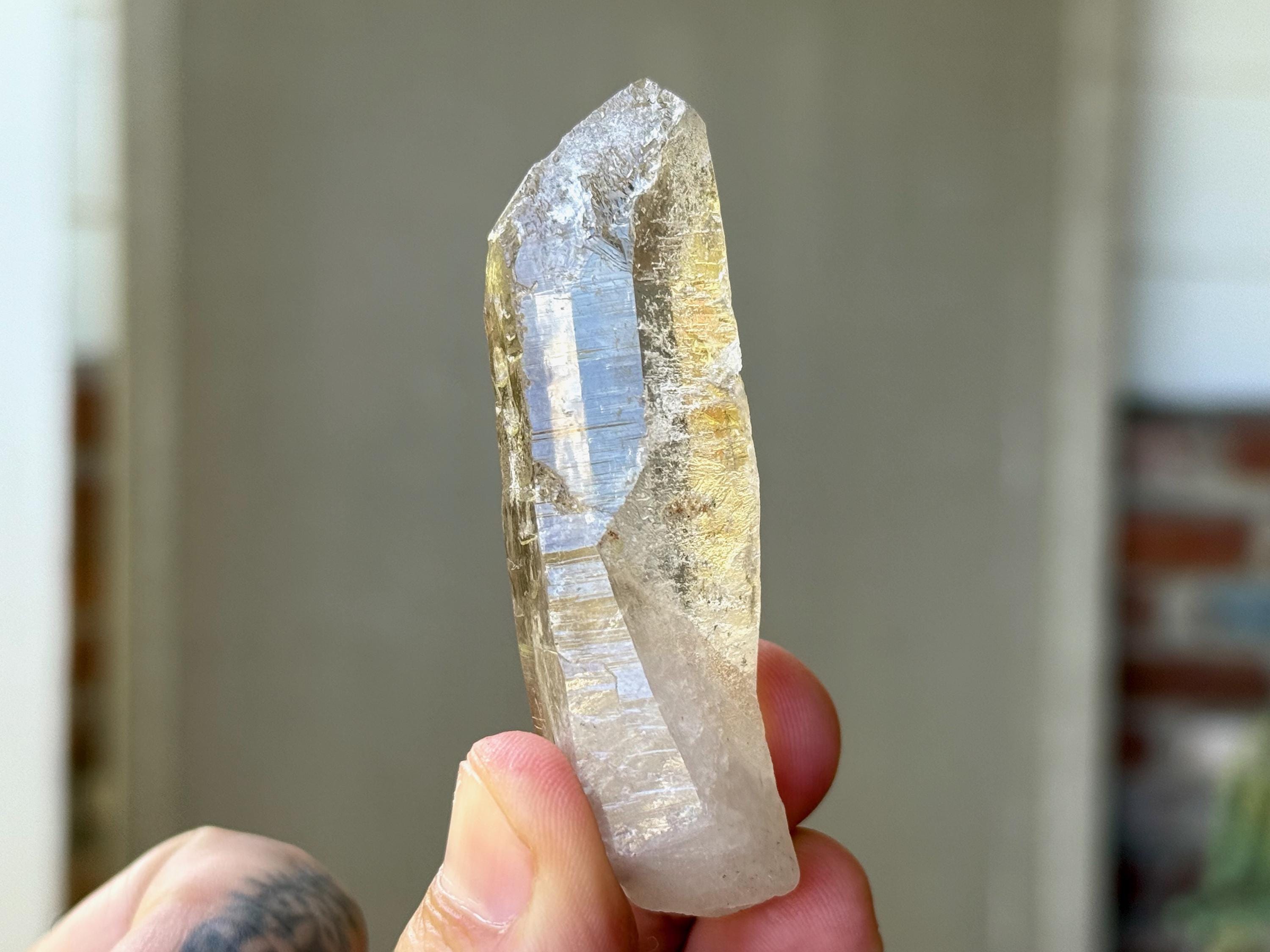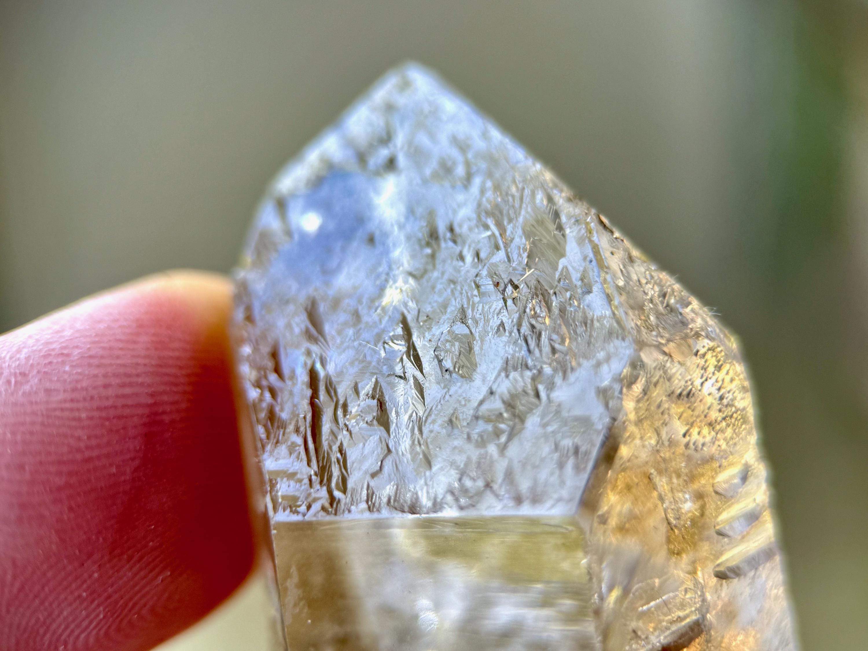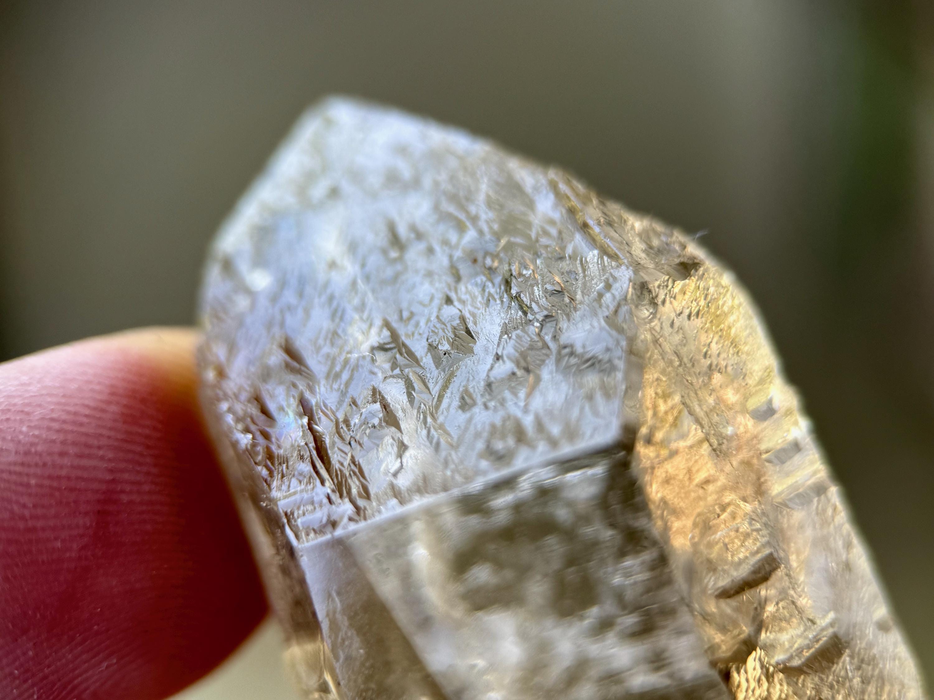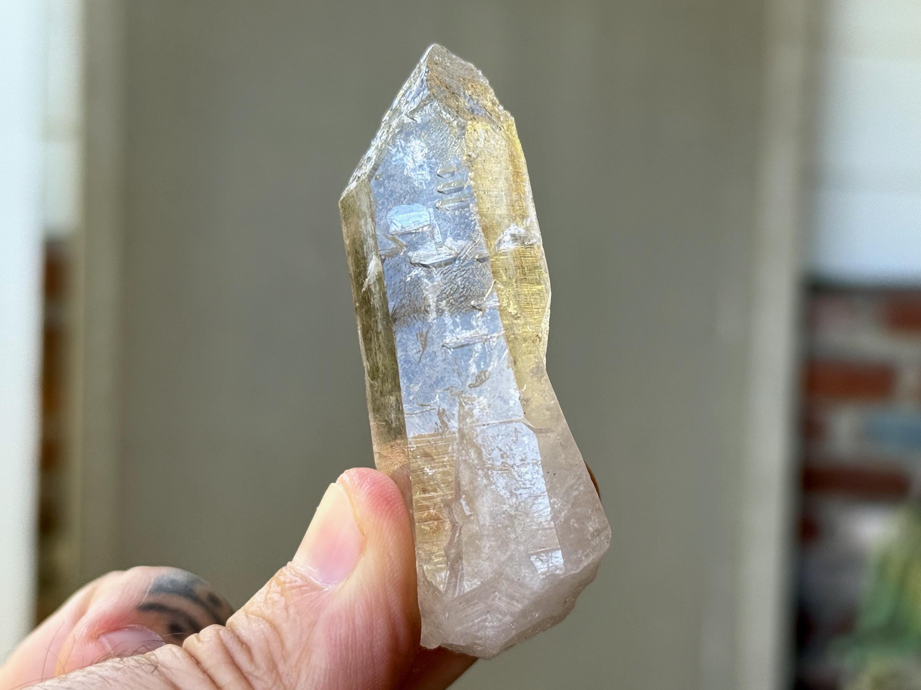 Water clear clarity and superb luster to this stunning Golden Healer Starbrary Quartz with a mild champagne color. This crystal exhibits the highest quality and features unique etchings on its sides and main facets.