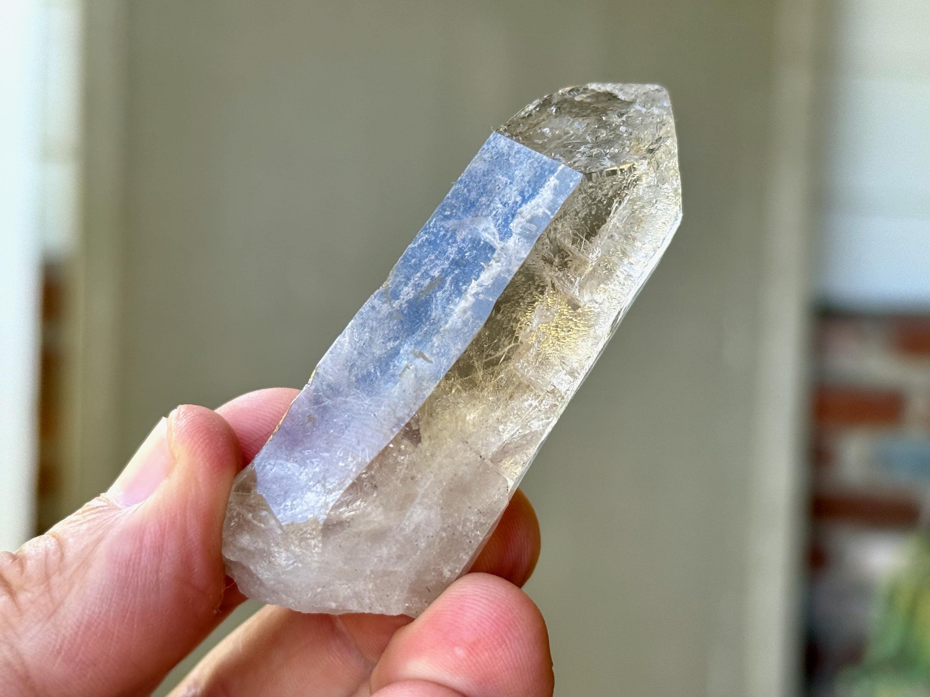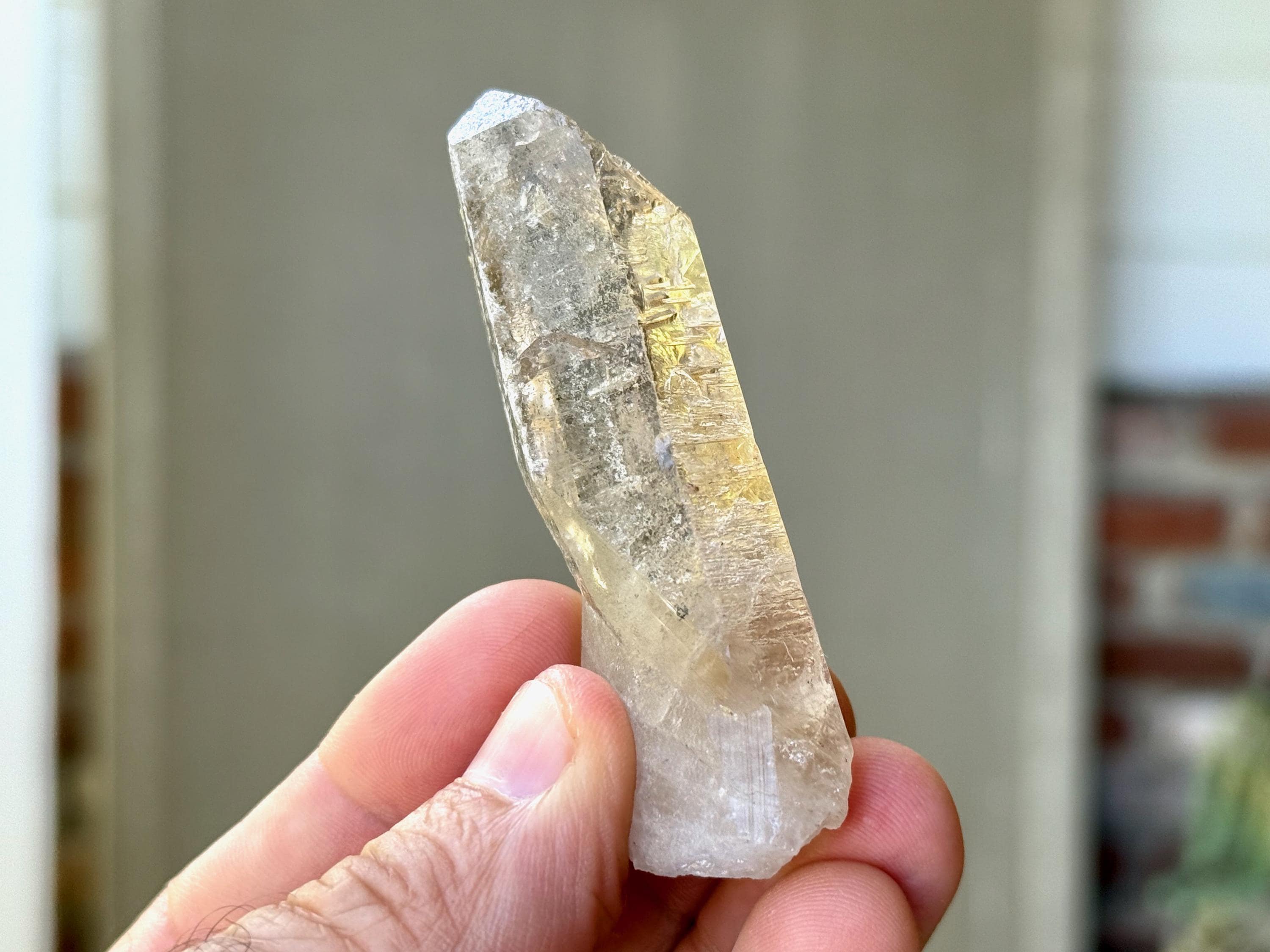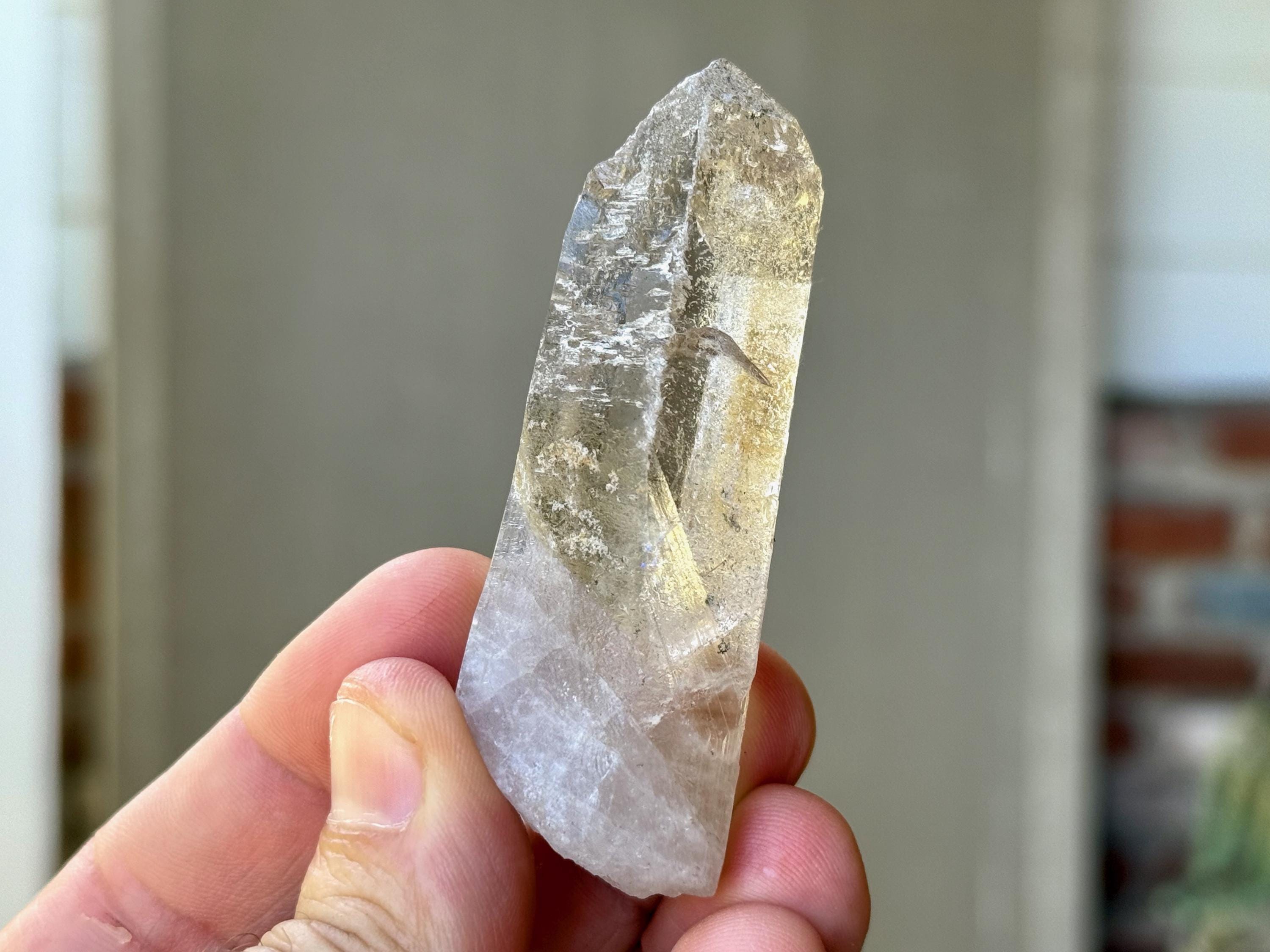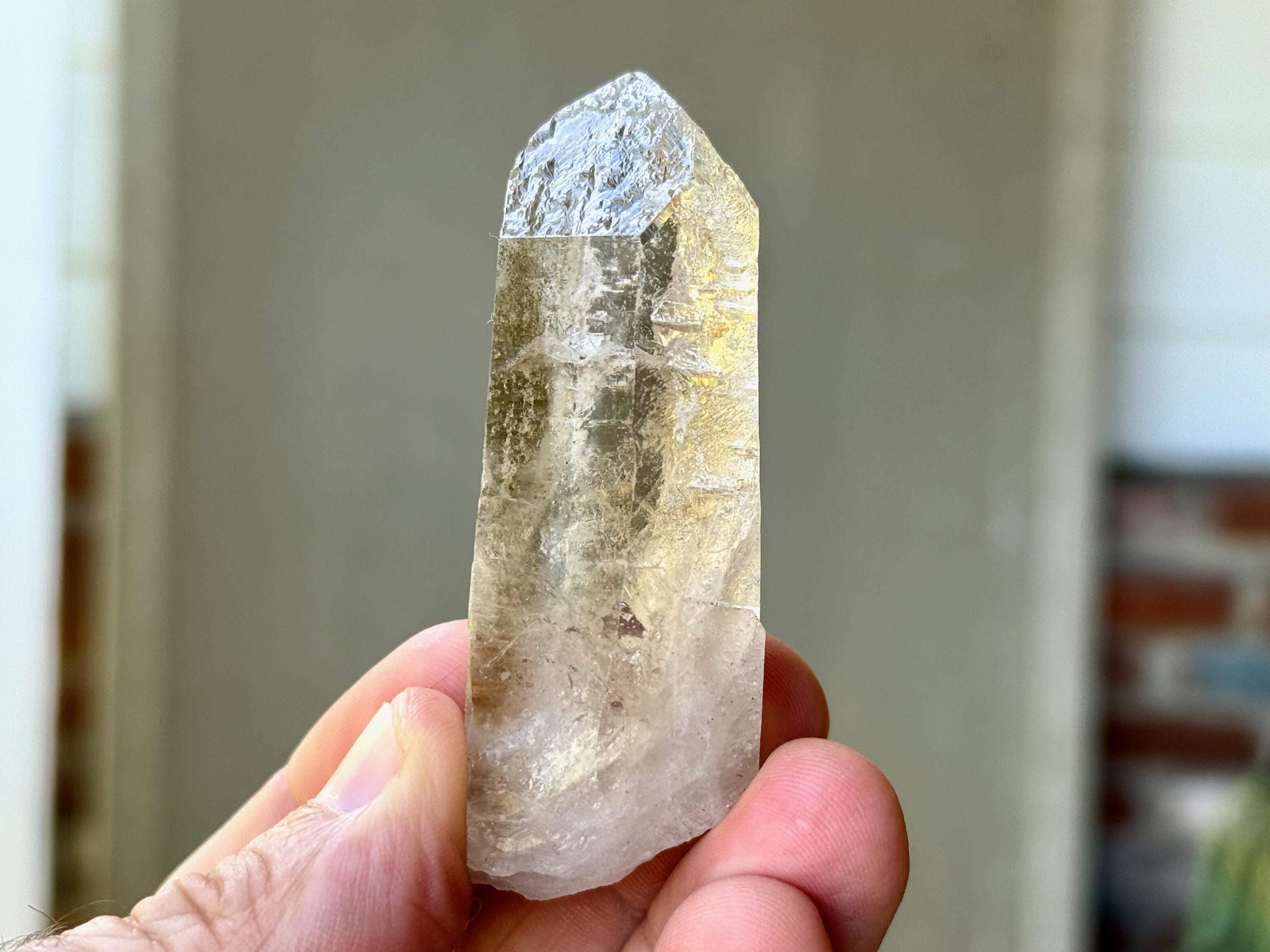 Water clear clarity and superb luster to this stunning Golden Healer Starbrary Quartz with a mild champagne color. This crystal exhibits the highest quality and features unique etchings on its sides and main facets.