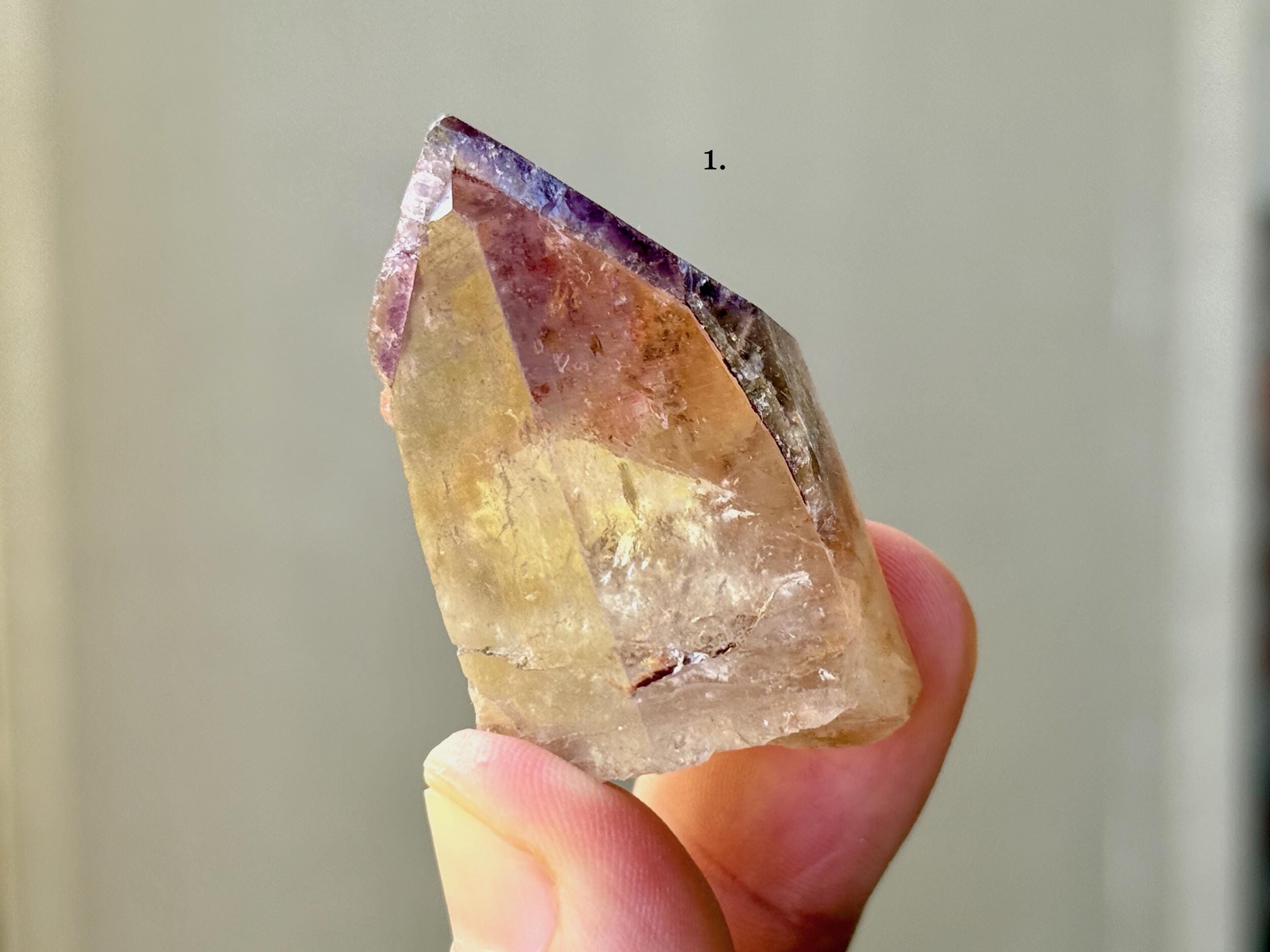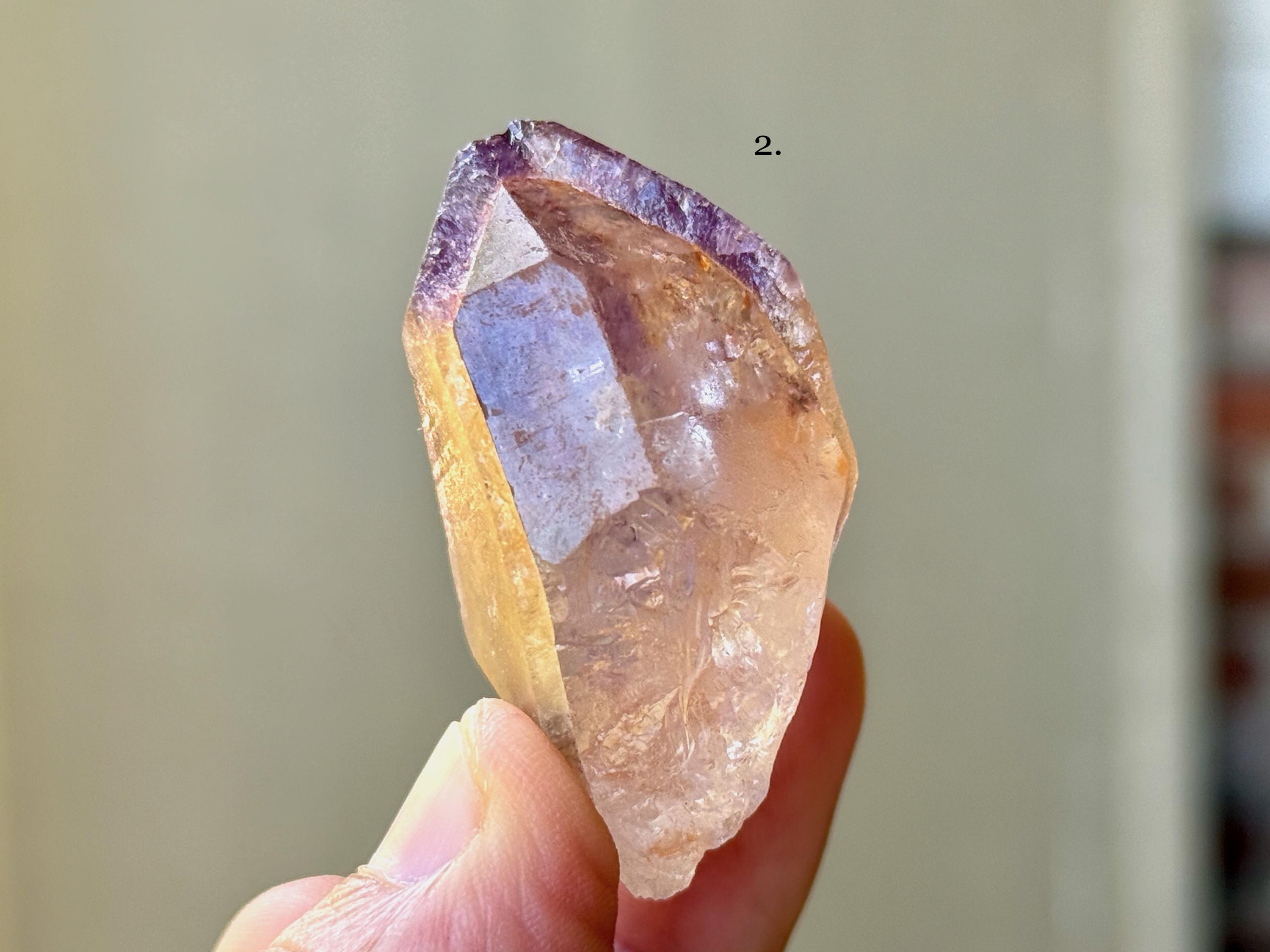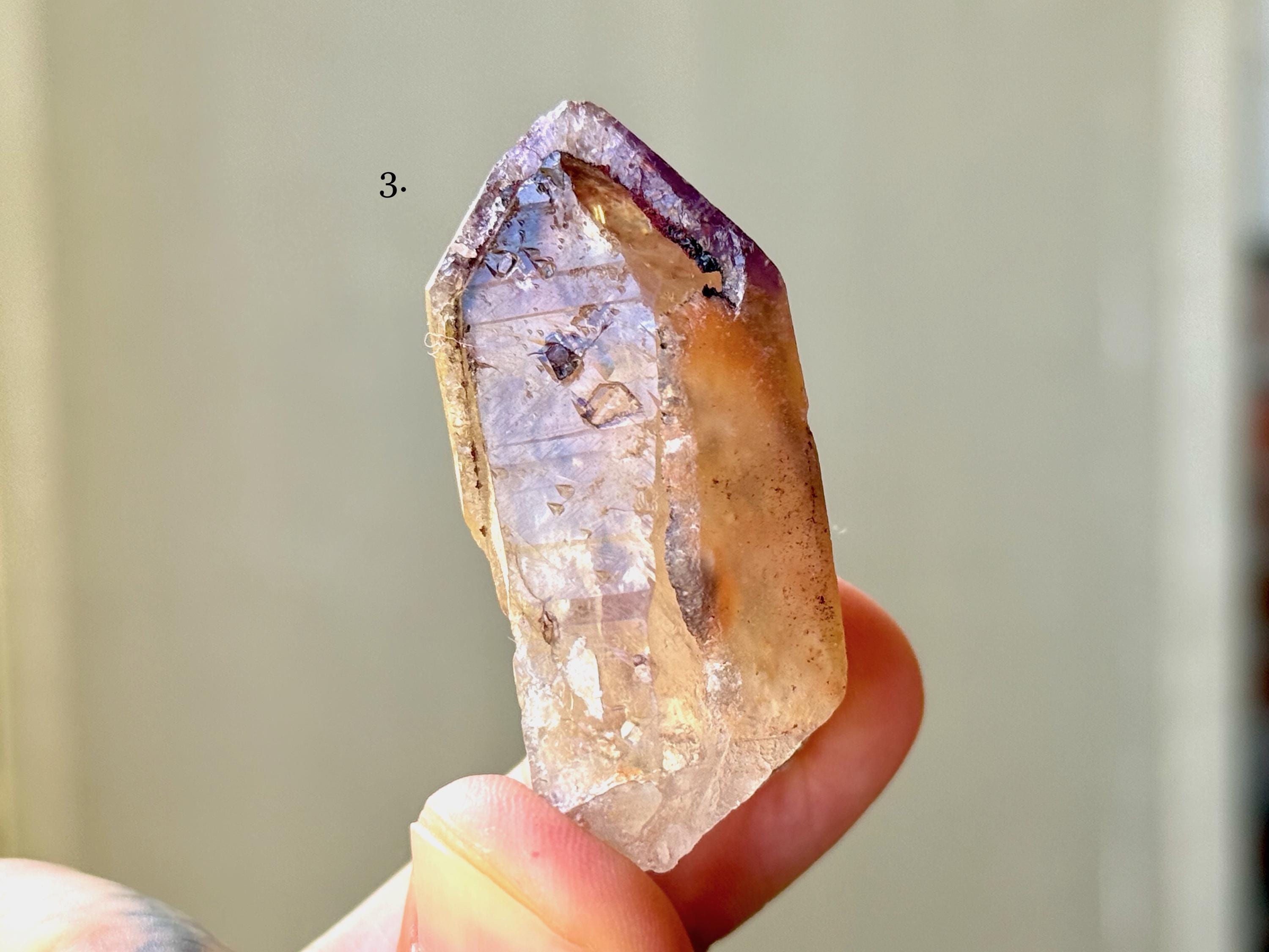 Exceptional beauty to these unique Dreamcoat Lemurians with Golden Healer bodies and purple Amethyst "caps." Please note that in most of these, the Amethyst overgrowth is partial, as indicated in the photos. When backlit, each of these passes light beautifully (see the video!).