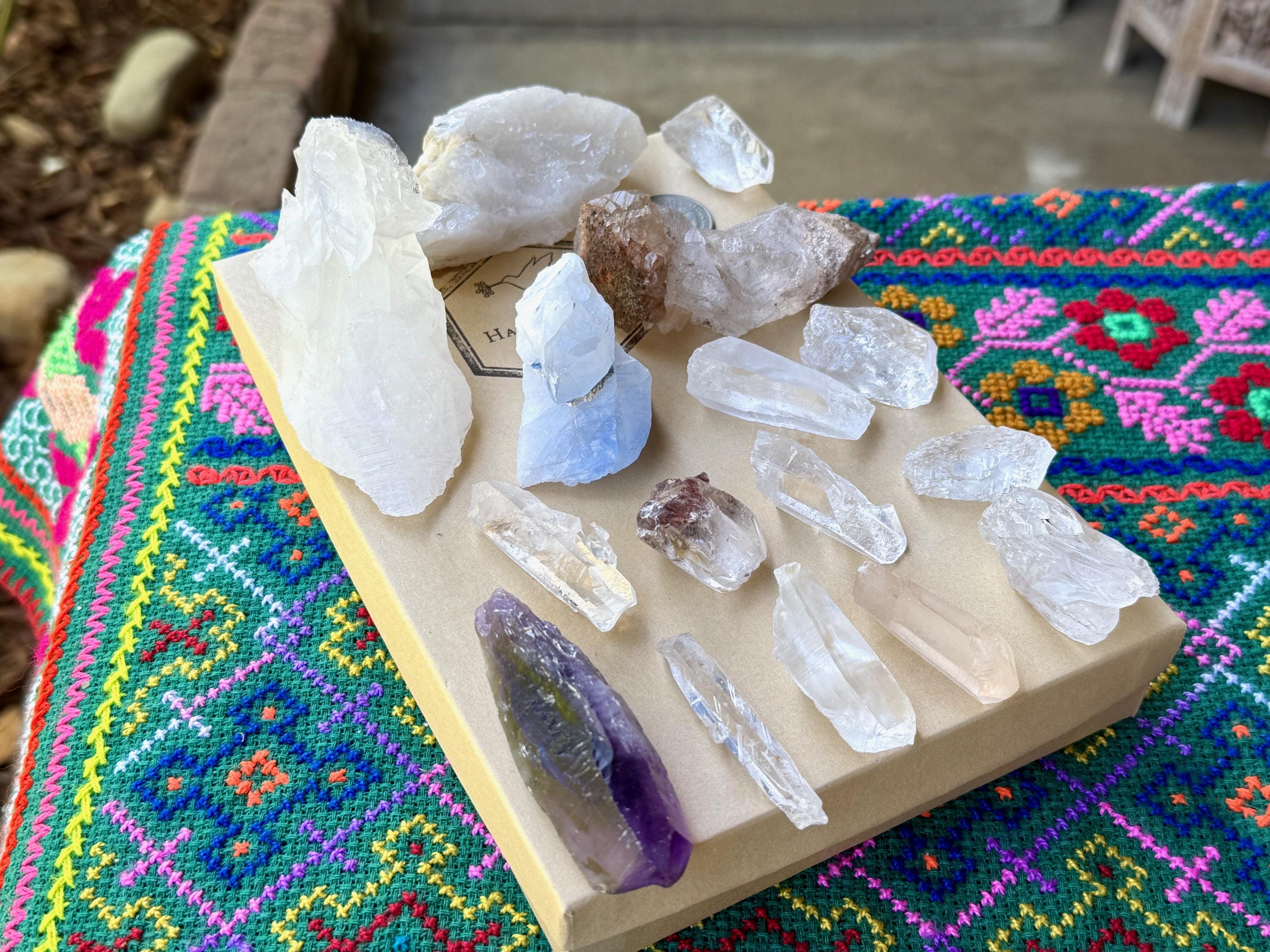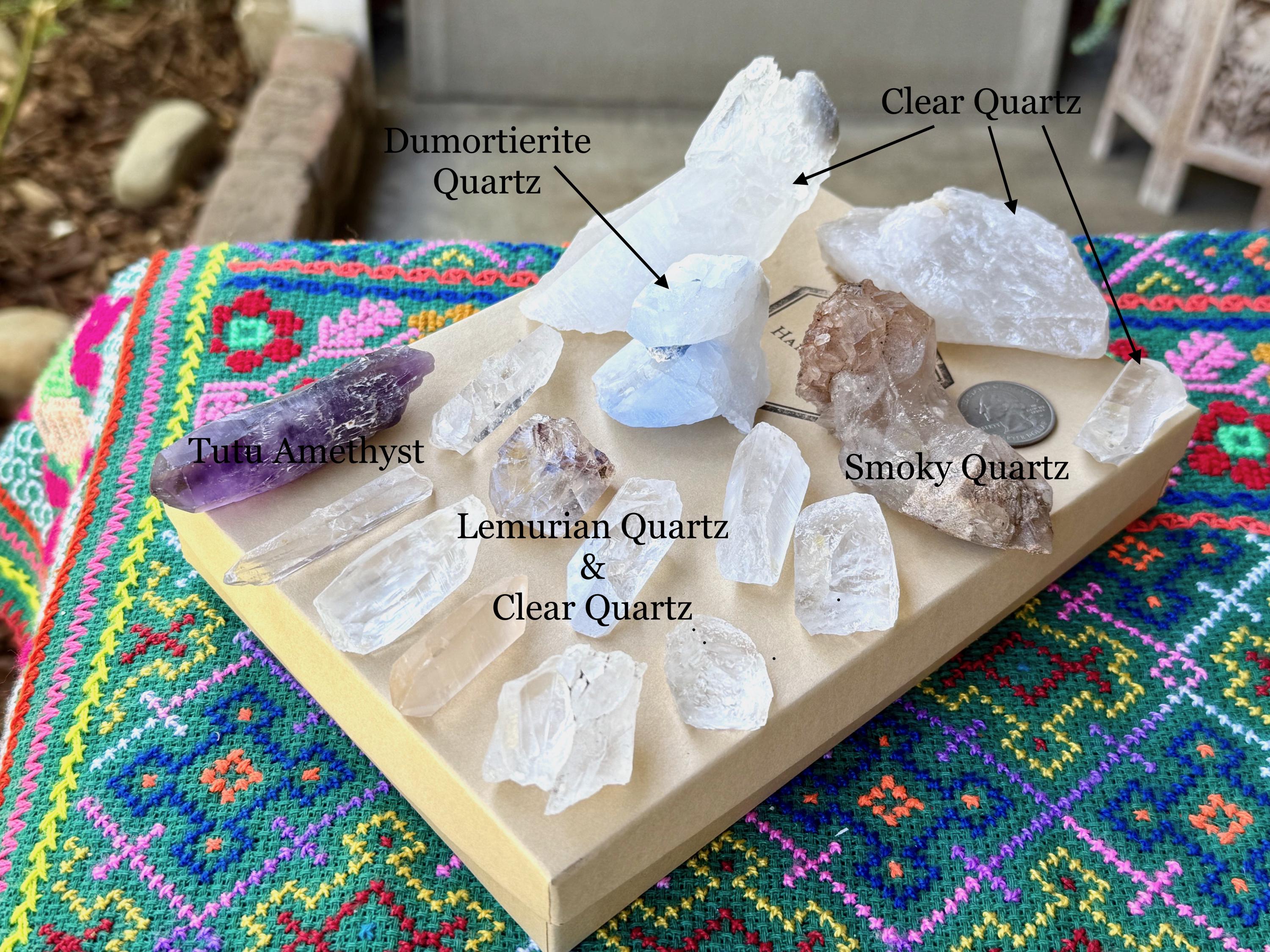 Here is a beautiful lot of SIXTEEN mixed Quartz crystals, all from various areas of Brazil (and one from Nigeria!). We are offering these crystals as a lot, as most of them have some kind of damage, with most having incomplete/broken terminations.