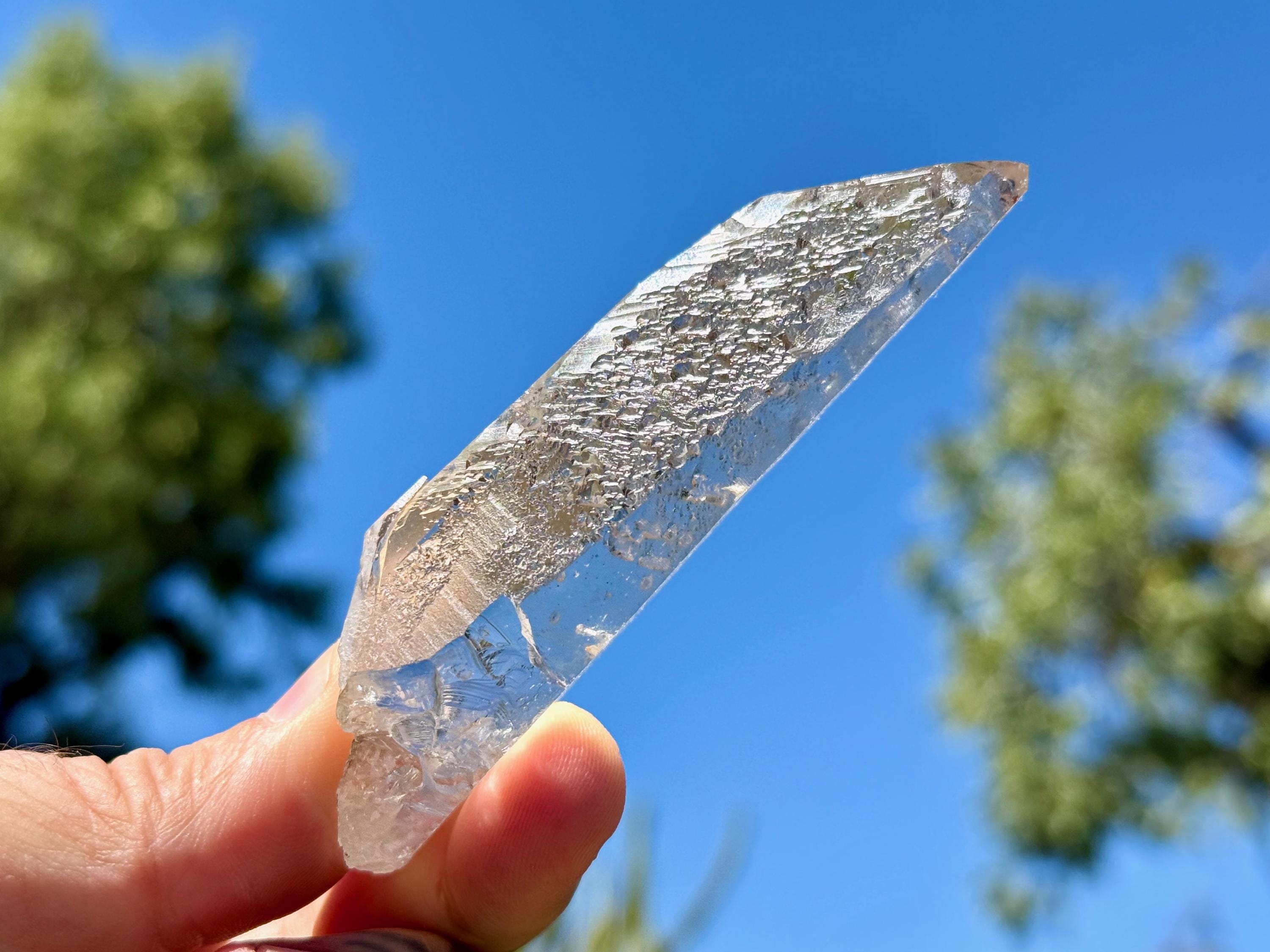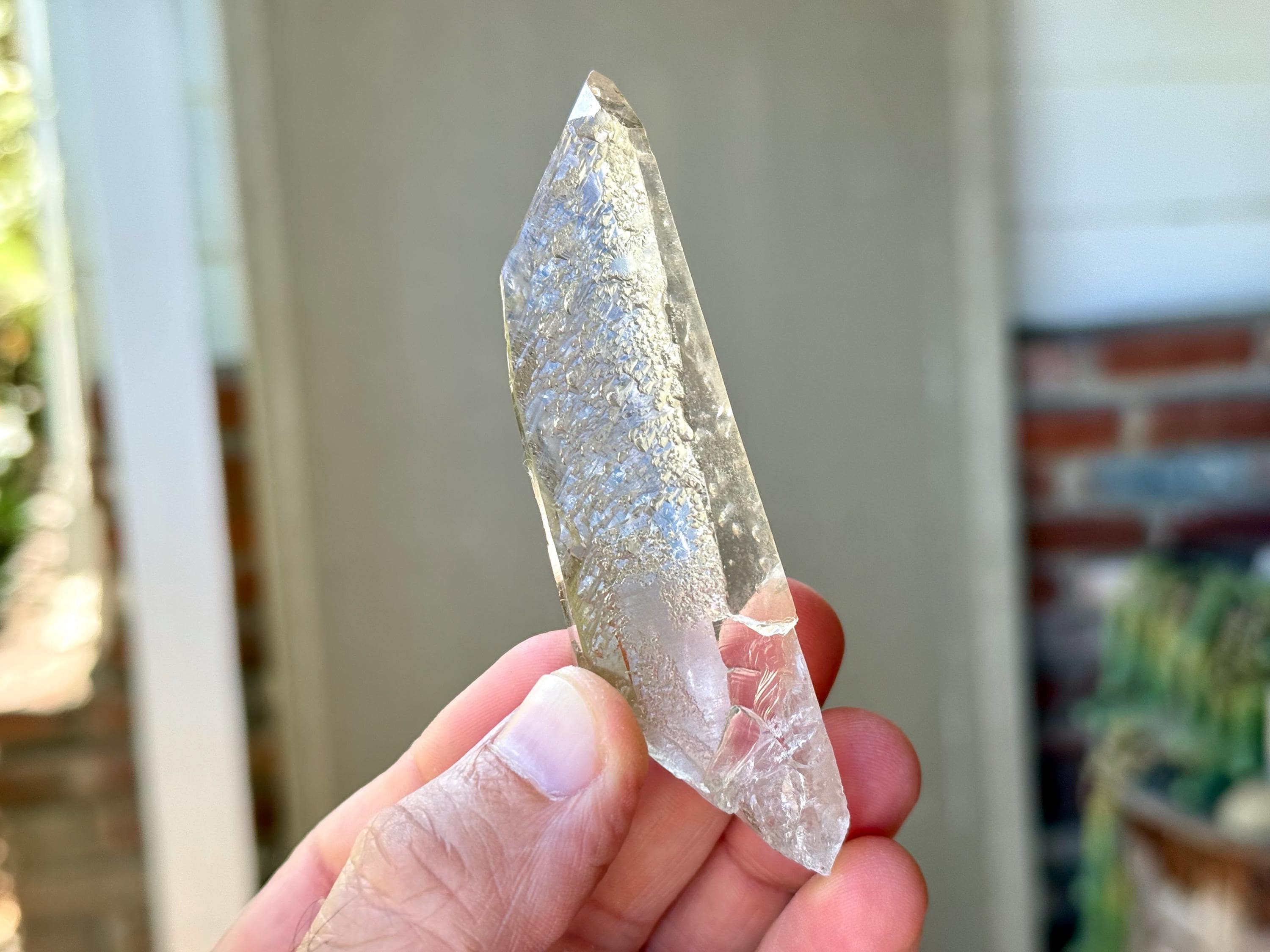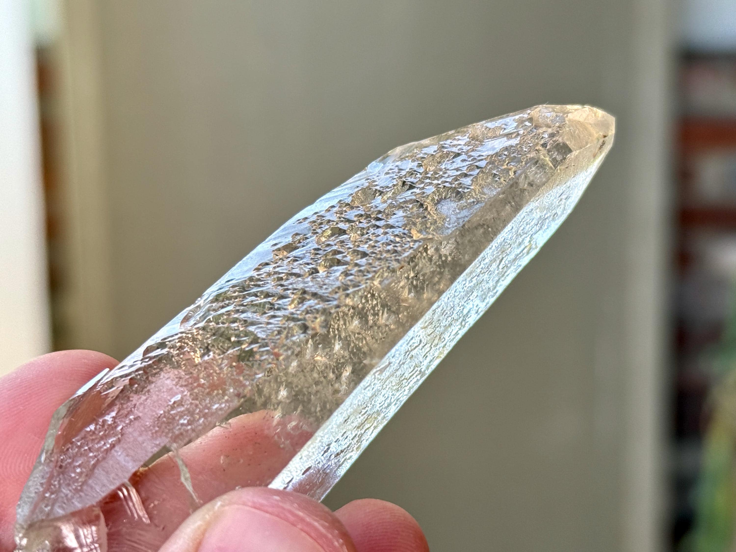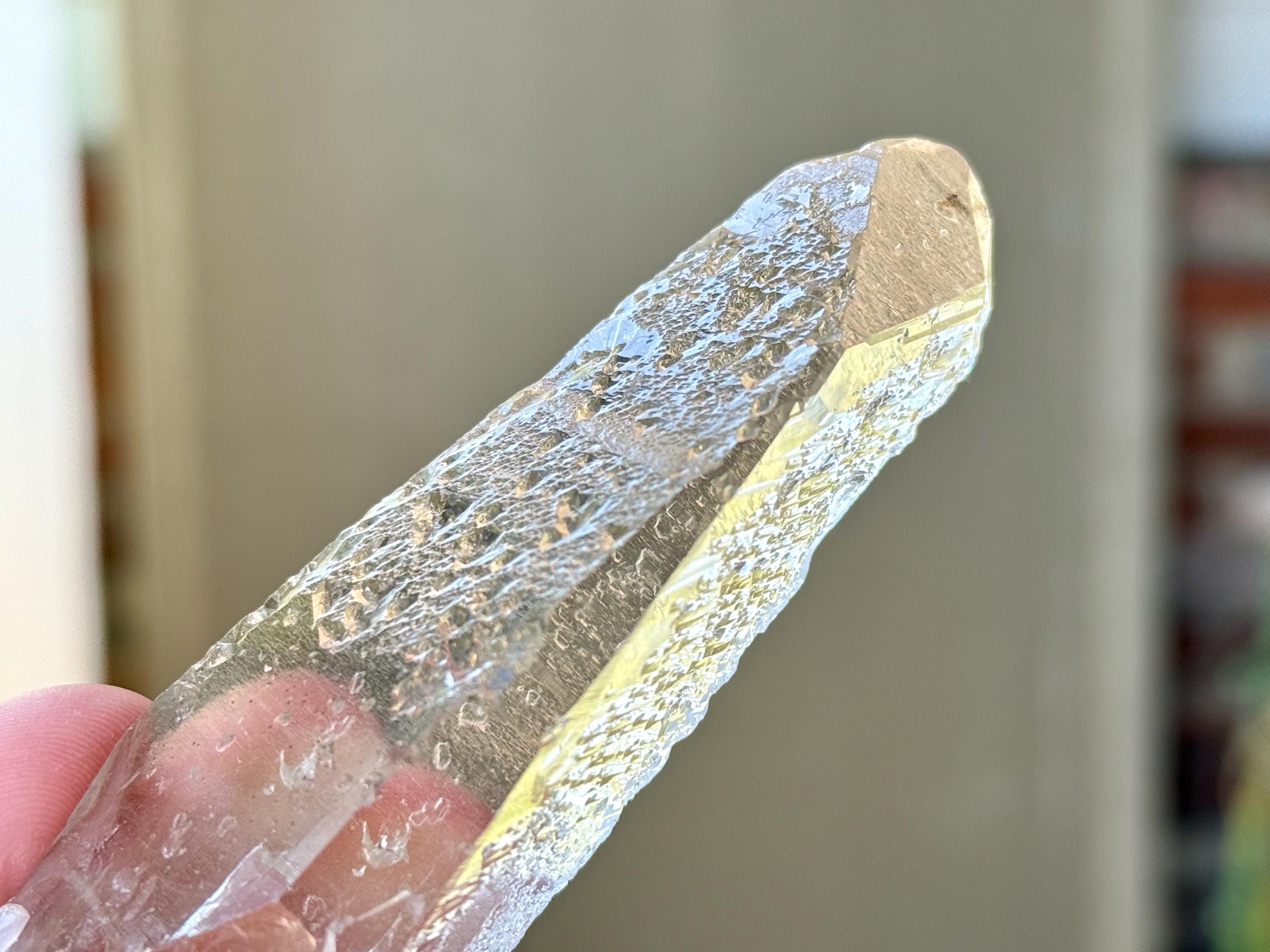 Superb luster, water clear clarity and a lovely champagne-golden hue to this Golden Healer Starbrary Quartz in an elongated formation. This crystal features some of the most mysterious and intriguing Starbrary markings and glyphs on its sides (Photos 2-3). They are amazing!