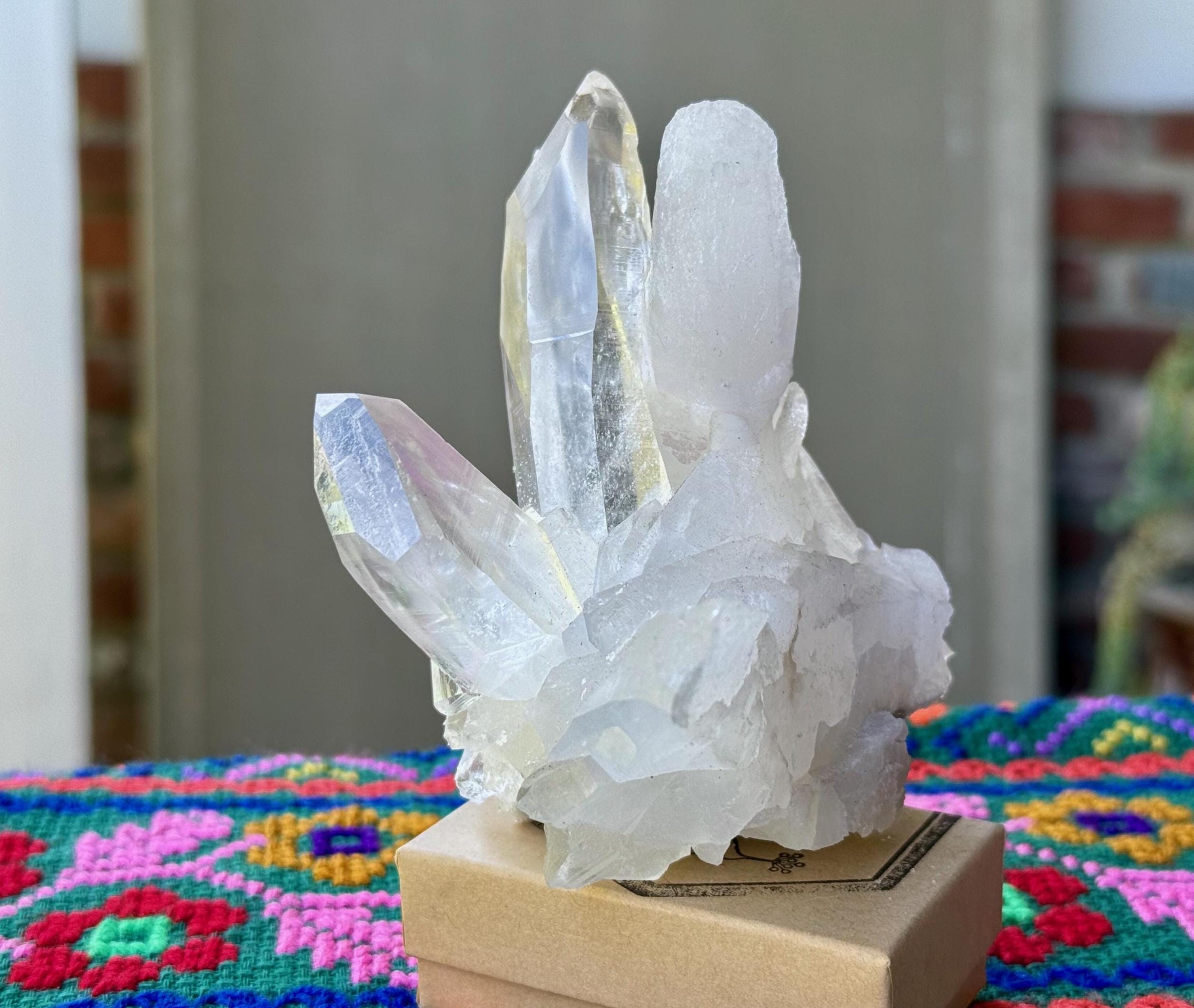 Cluster formations serve to bring the “group” energy of the associated crystal to the surroundings, enhancing harmony and peace in groups, in the family, and in other social and/or business environments. The energy generated is directly proportional to the number of crystals in the cluster. The auric light that surrounds a Quartz cluster is very bright and strong, and will bathe an entire area or room in radiance. They can also be used to activate and to cleanse other minerals, enhancing and increasing their energy. They can be placed in areas to purify the environment of negative energies and feelings, and to foster protection, cooperation, purification, harmony, friendship and intimacy.
