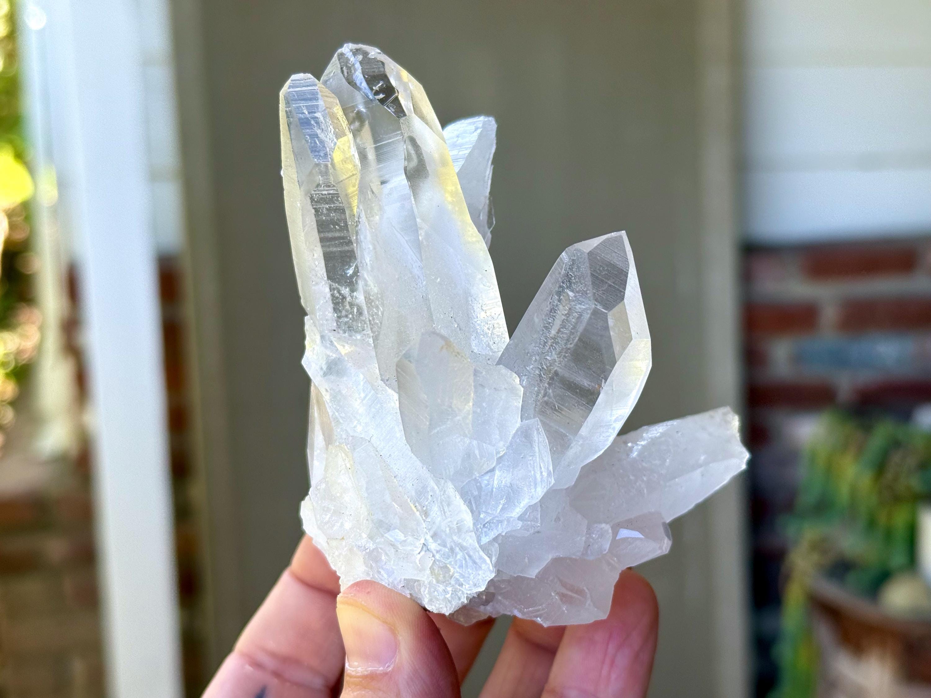 This cluster formation is comprised of multiple individual Lemurian Quartz points, each elongated in formation with marvelous luster and clarity. What's quite special about this piece is that many of the crystals feature slender, rectangular "time link" facets on the left and/or right sides of their main facets.