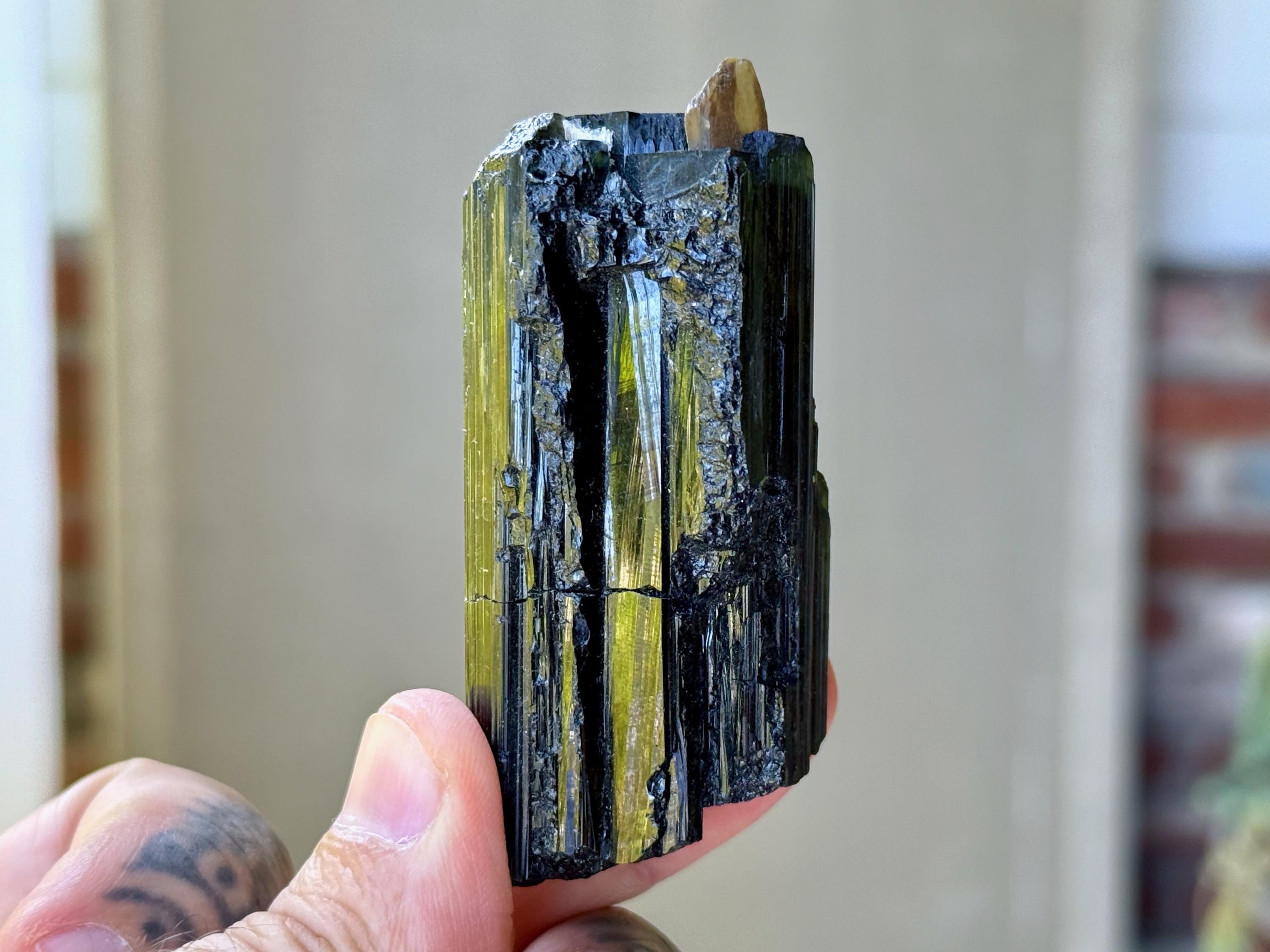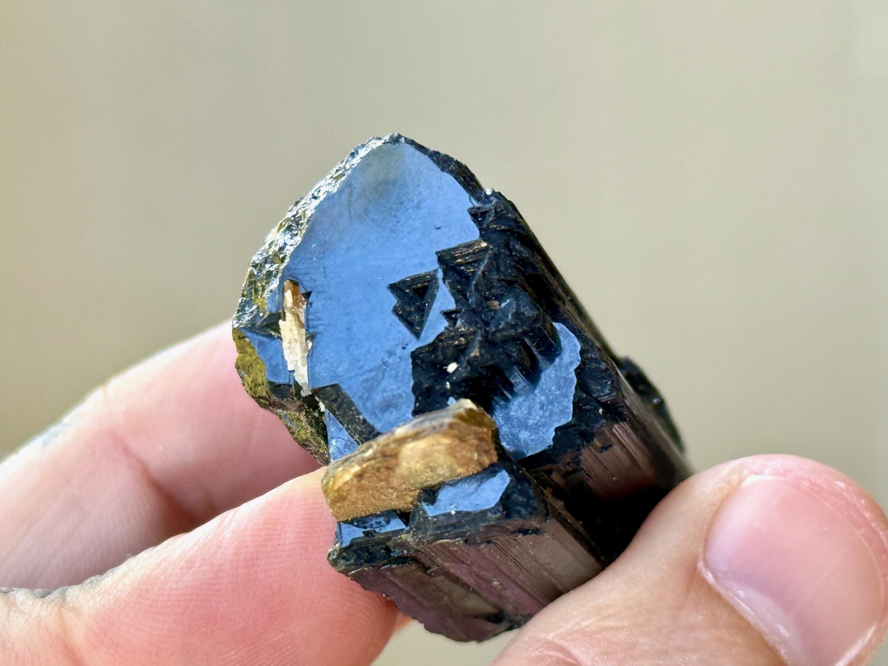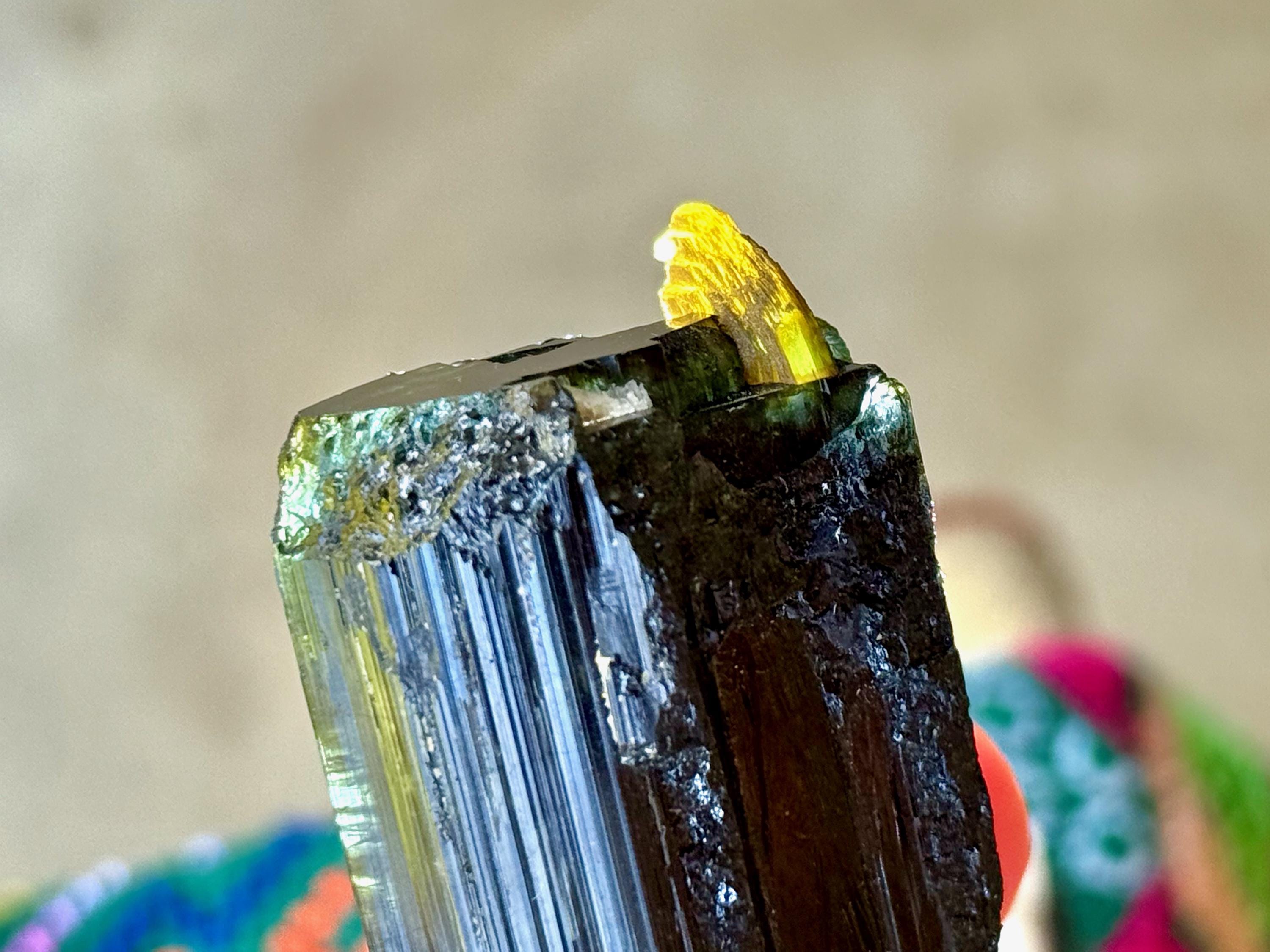 One of the most unique and aesthetically beautiful pieces we've seen from Taquaral, this is a darkly lustrous Blue & Green Tourmaline crystal with a stunning inclusion of Golden Mica at the top