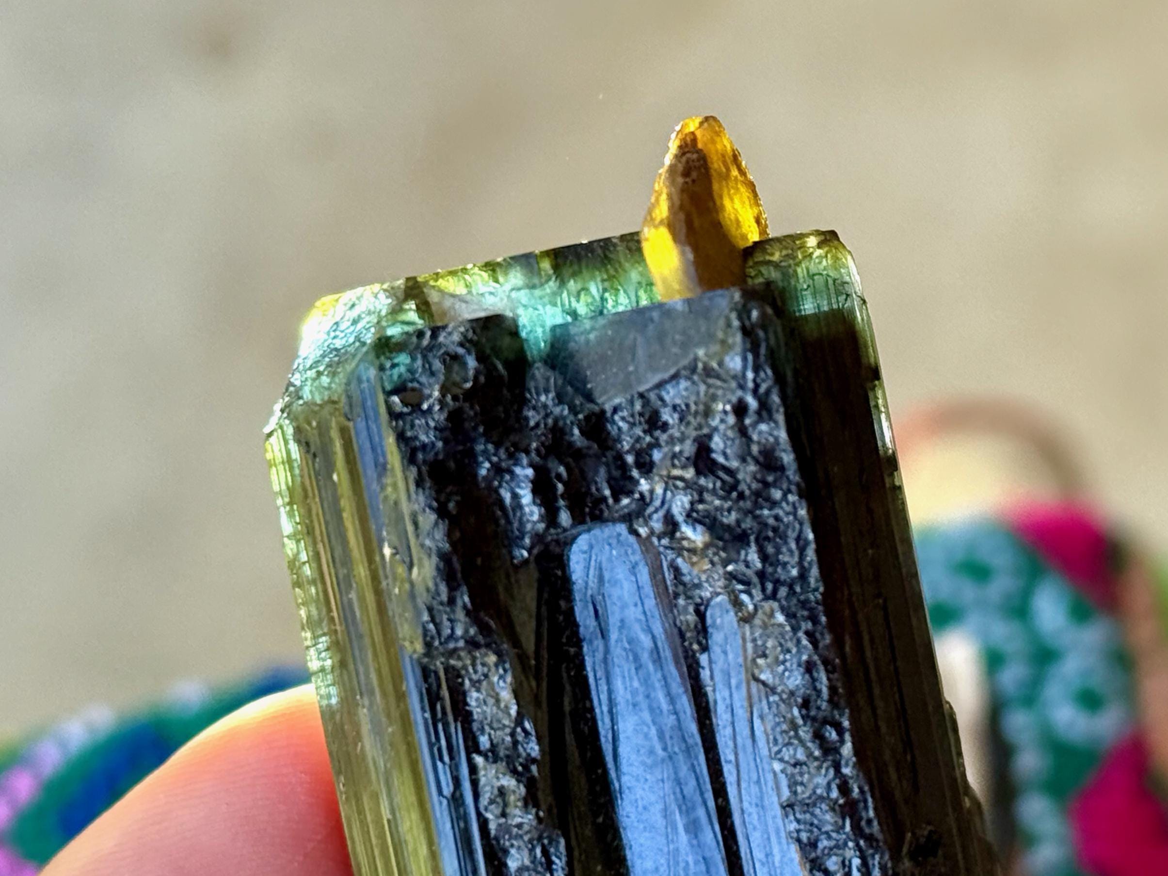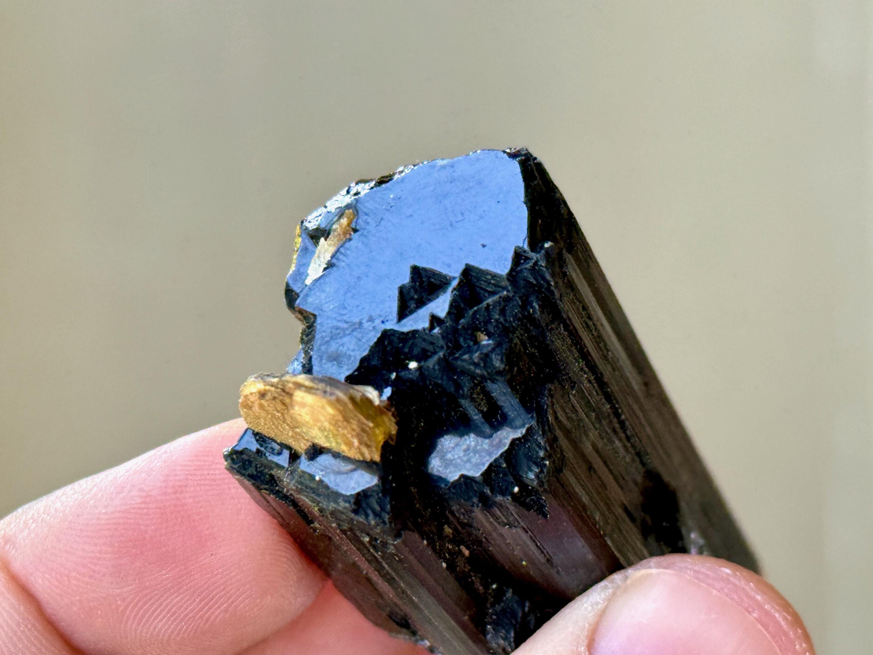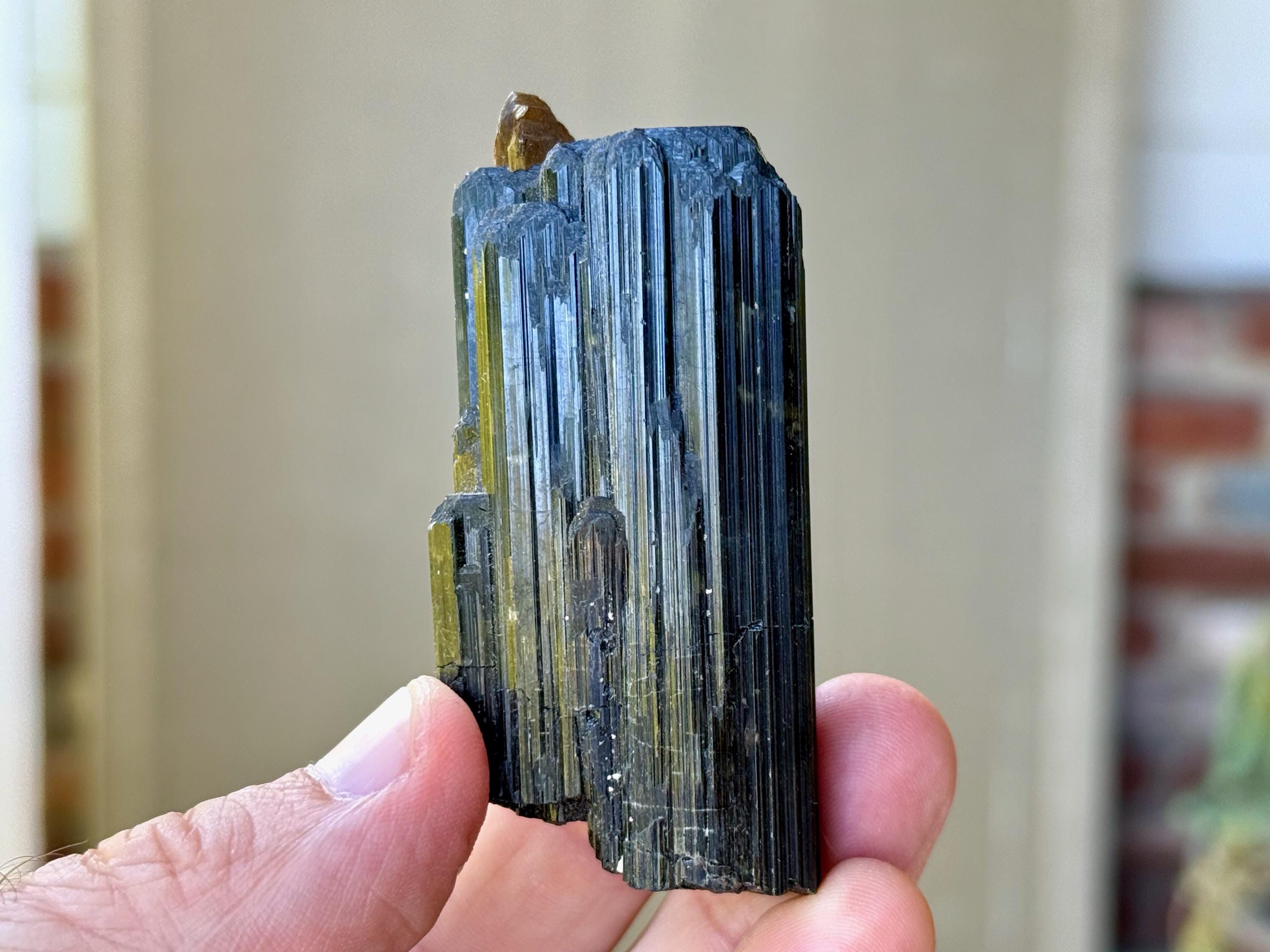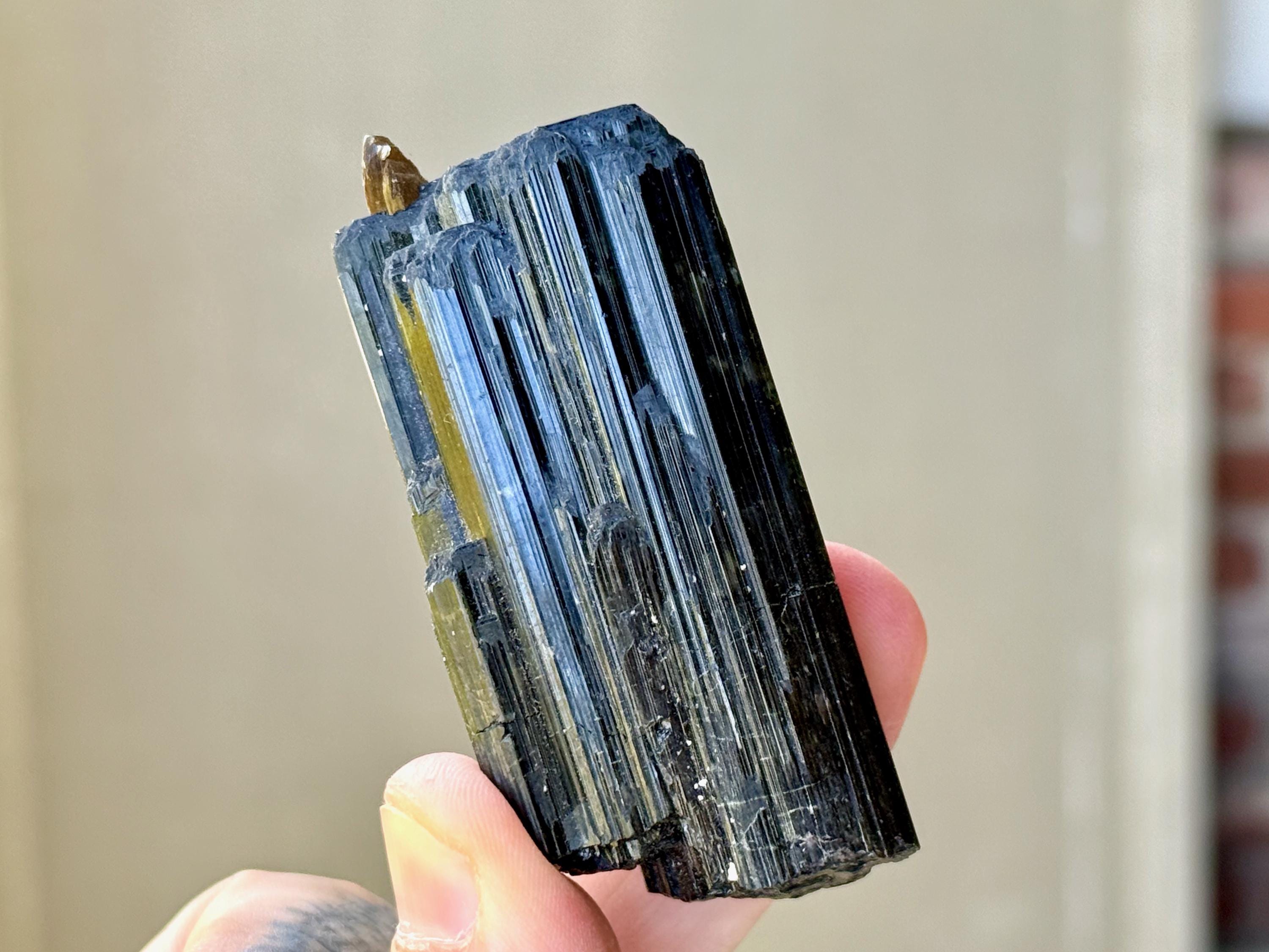 One of the most unique and aesthetically beautiful pieces we've seen from Taquaral, this is a darkly lustrous Blue & Green Tourmaline crystal with a stunning inclusion of Golden Mica at the top