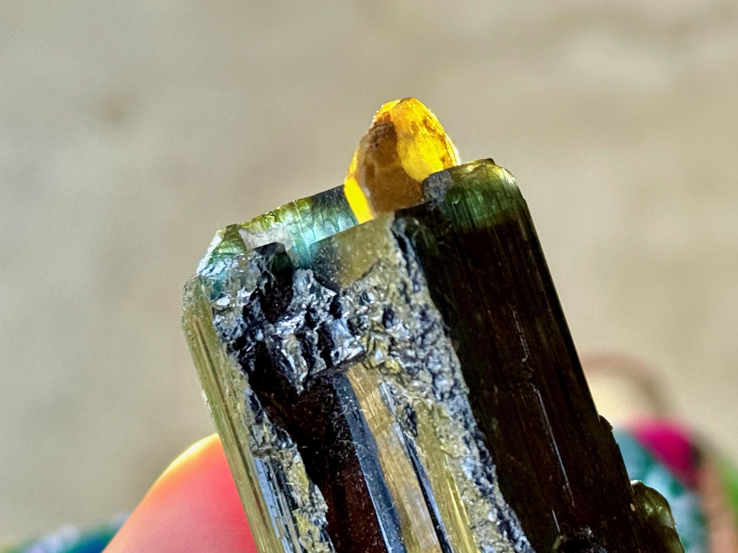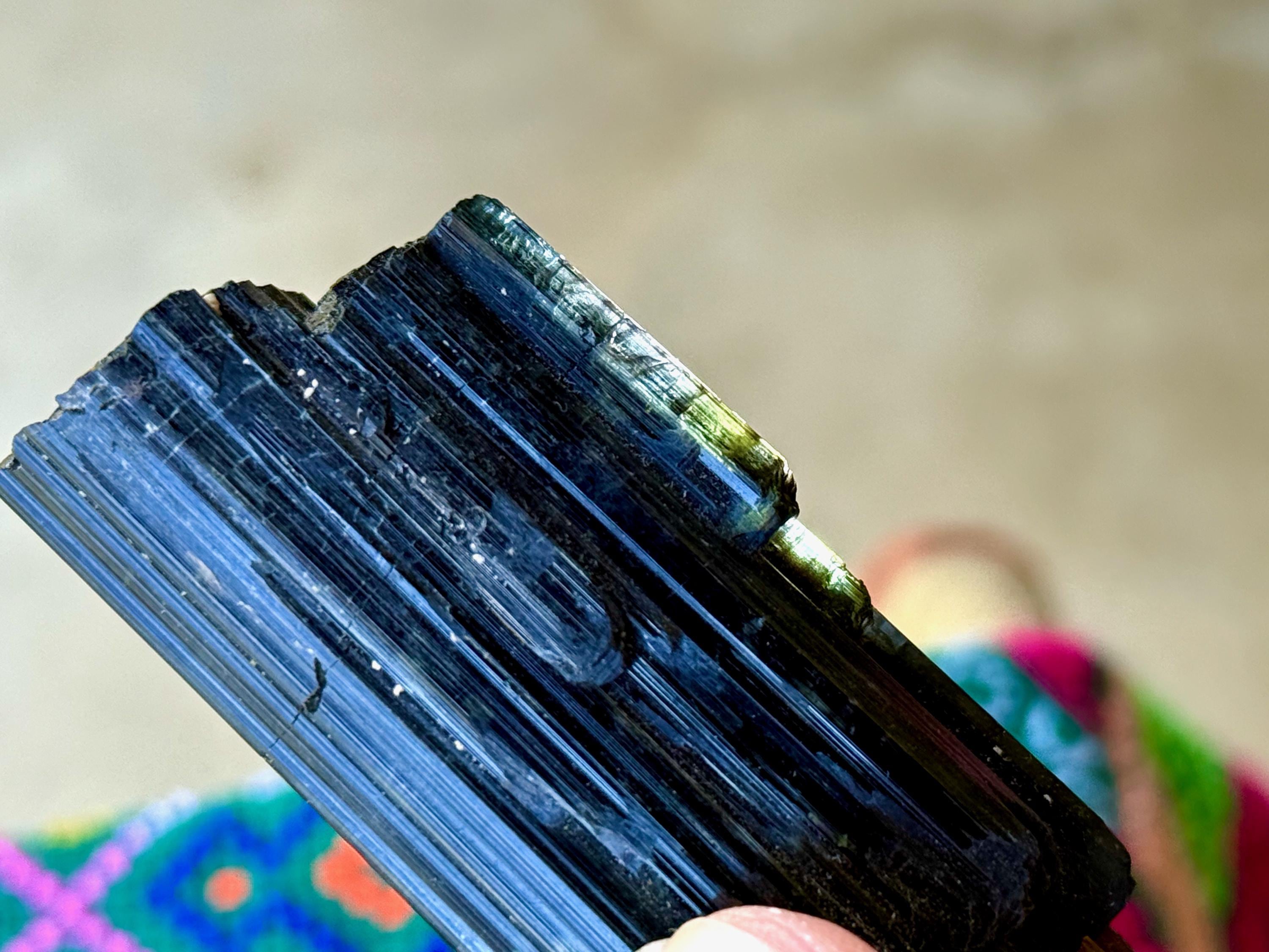 This crystal appears completely black in natural light. However, apply some backlighting and you will see a glorious combination of light blue and green at the top (Photos 1, 3-5). We see these same vibrant colors when we backlight the sides/edges (Photos 6-8). Please note that the crystal is not entirely transparent through the center, just in these areas we've noted.