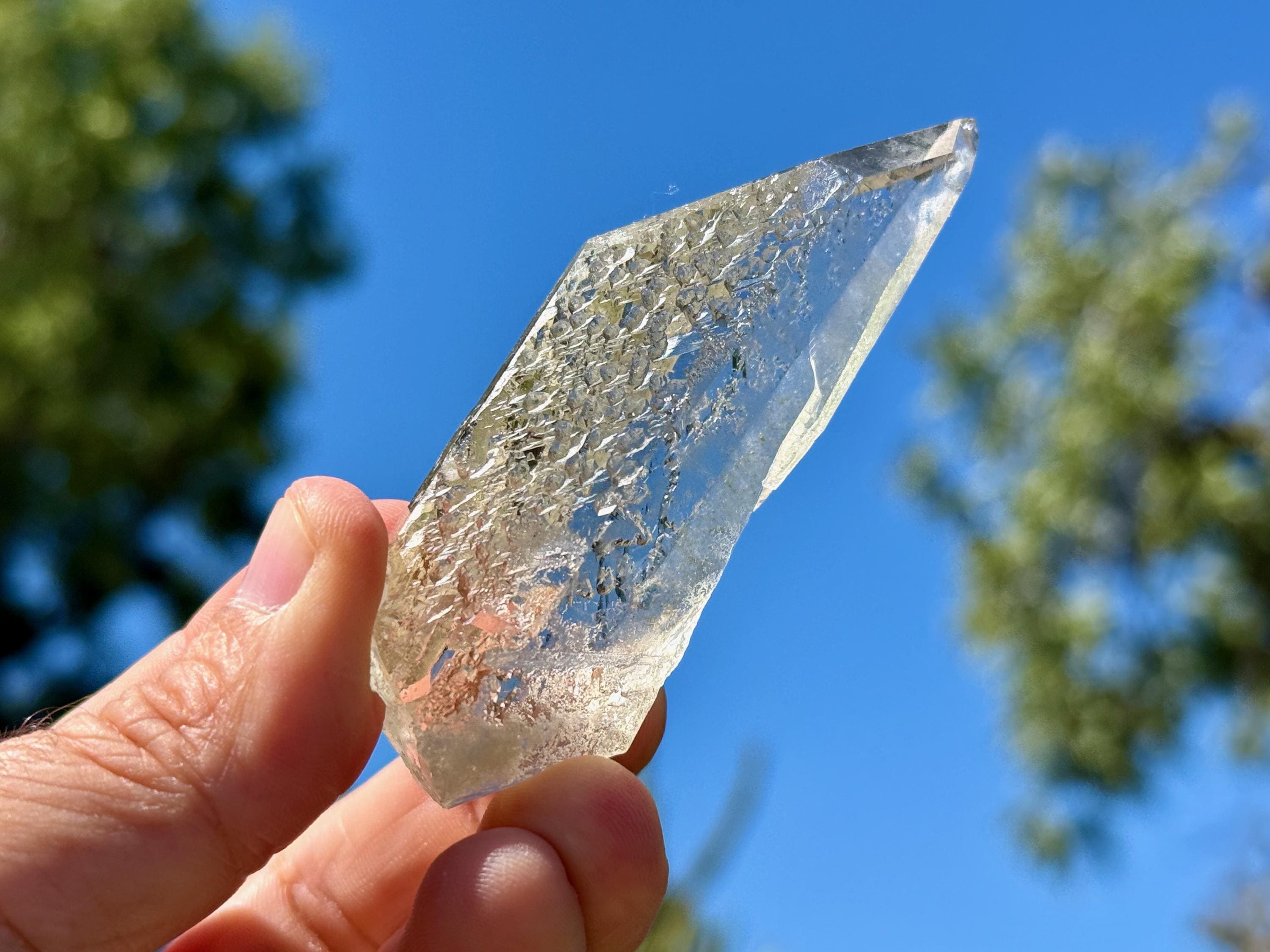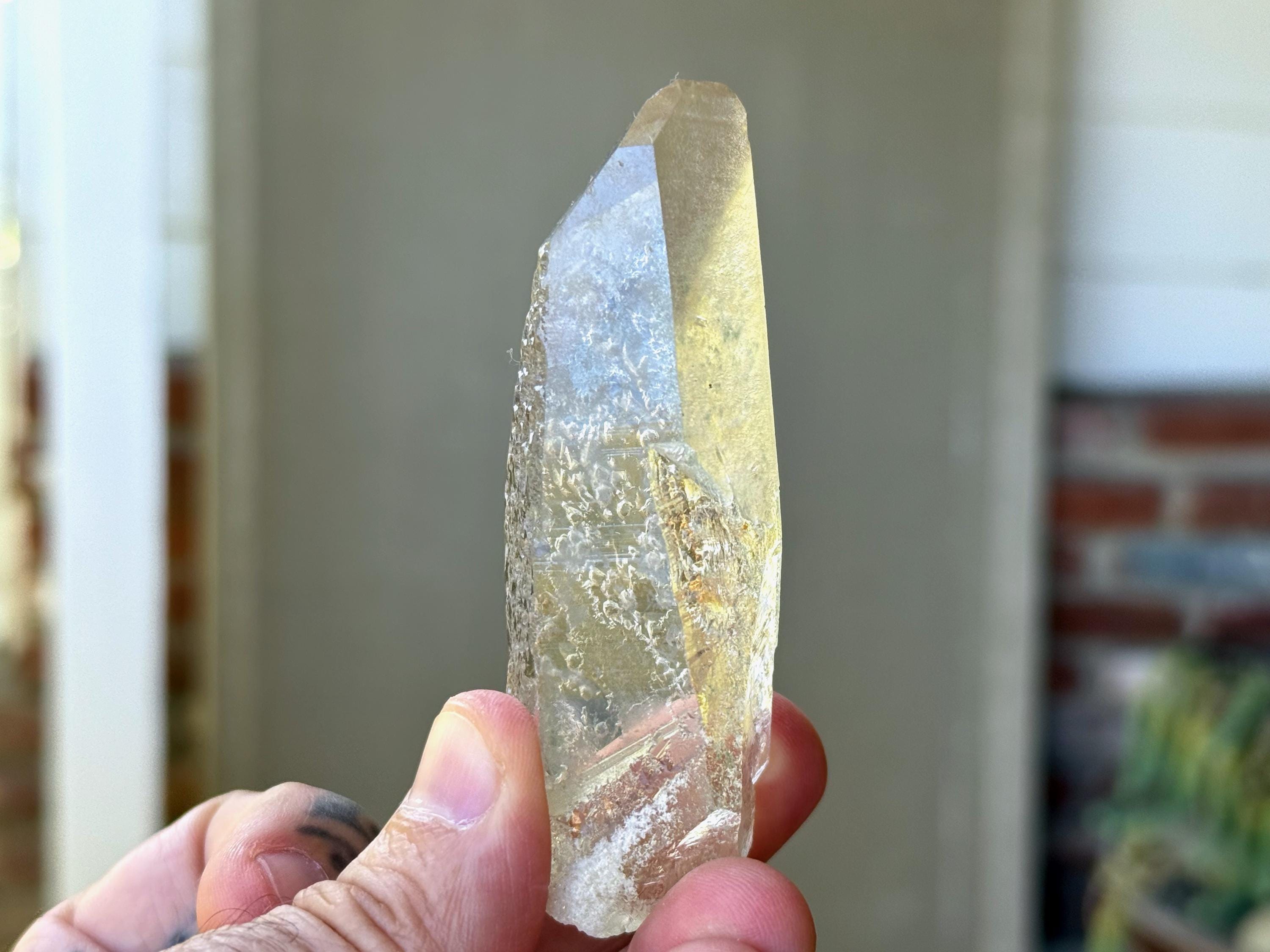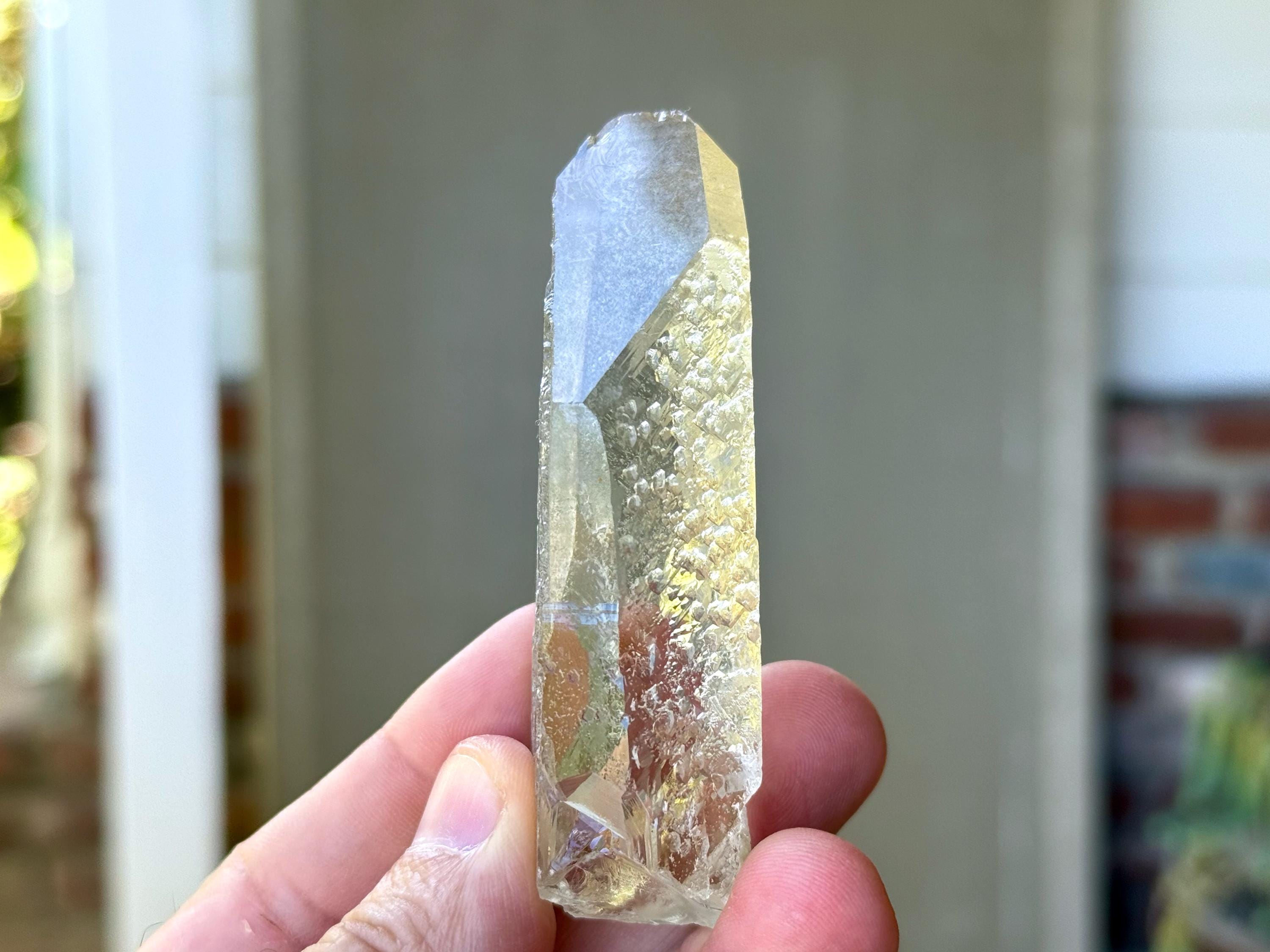 Brilliant luster, water clear clarity and a lovely champagne-golden hue to this Golden Healer Starbrary Quartz with a giant, sloping main facet. This crystal features some of the most mysterious and intriguing Starbrary markings and glyphs on its sides (Photos 2-3). They are amazing!