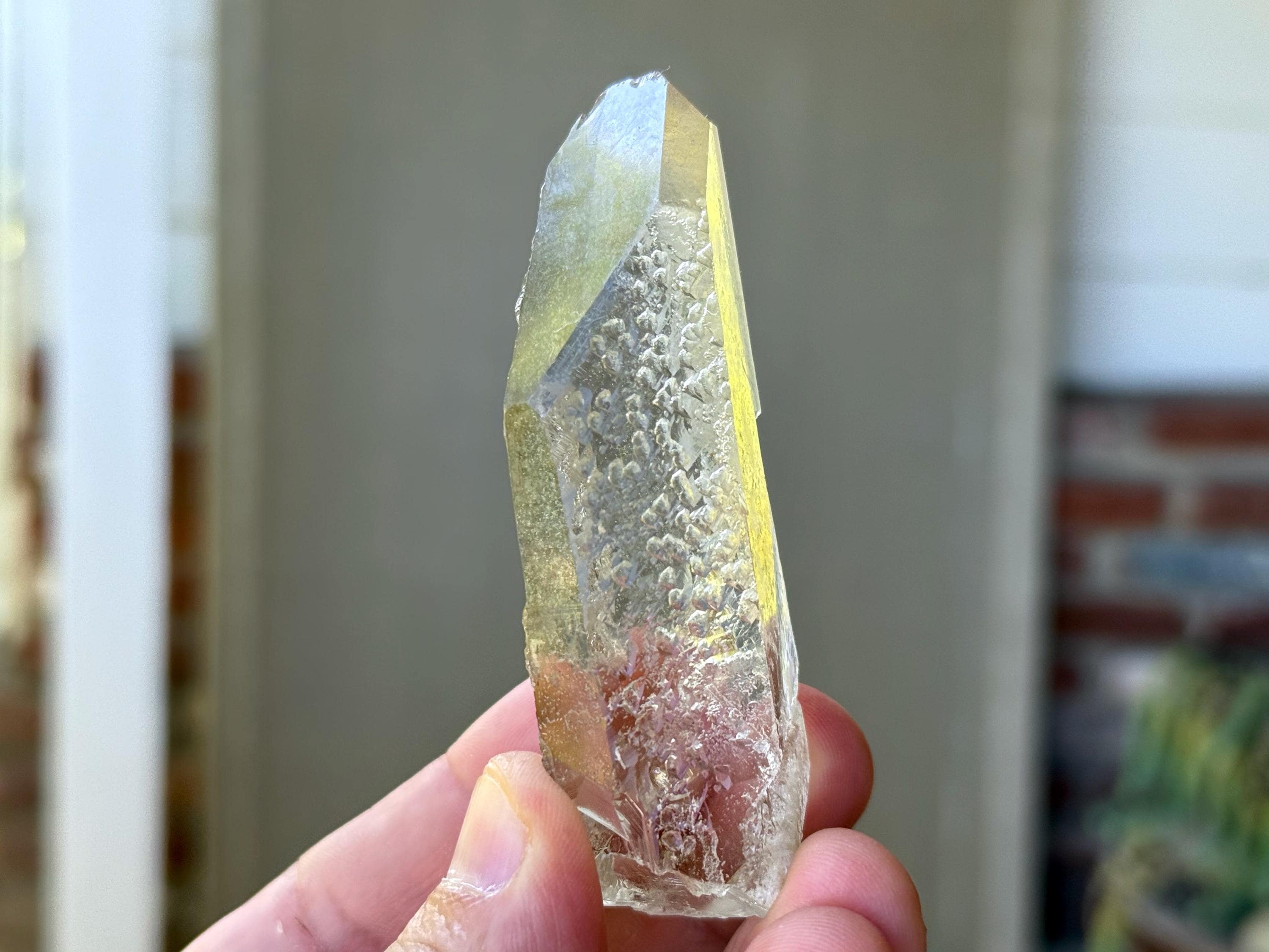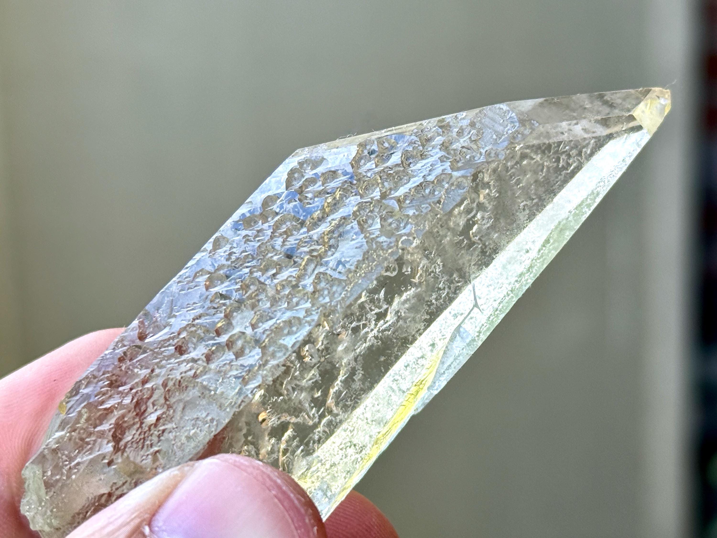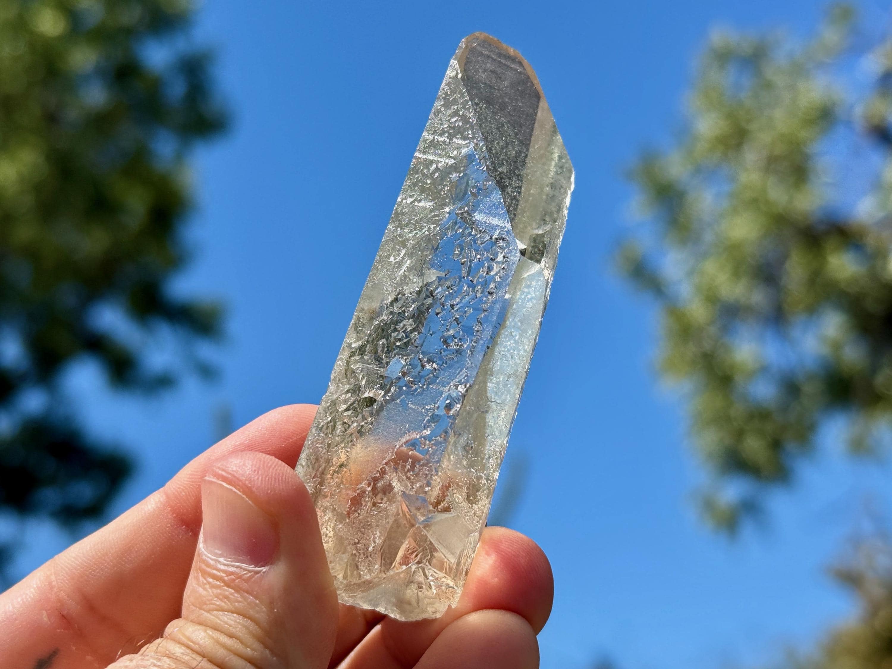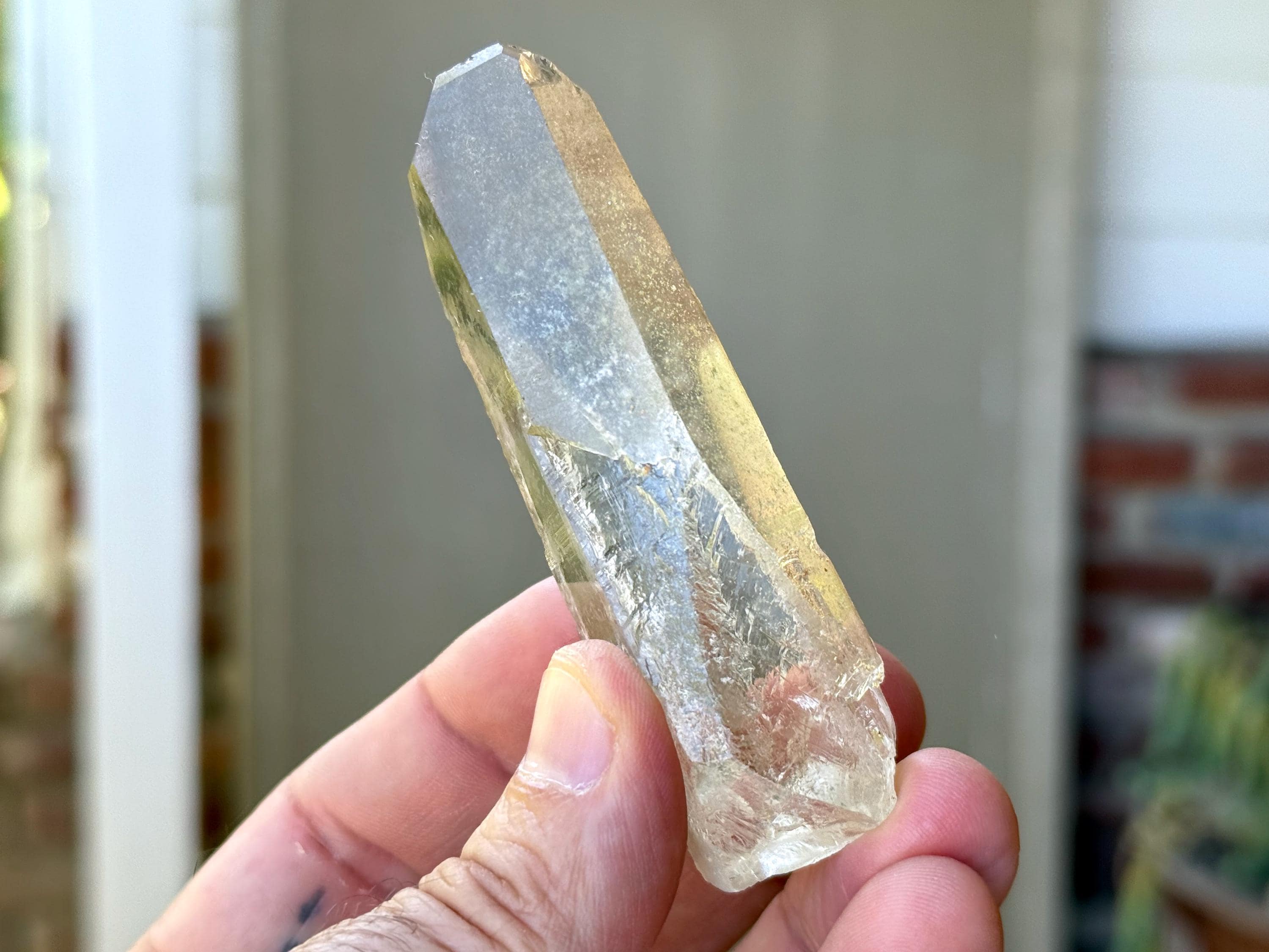 Brilliant luster, water clear clarity and a lovely champagne-golden hue to this Golden Healer Starbrary Quartz with a giant, sloping main facet. This crystal features some of the most mysterious and intriguing Starbrary markings and glyphs on its sides (Photos 2-3). They are amazing!