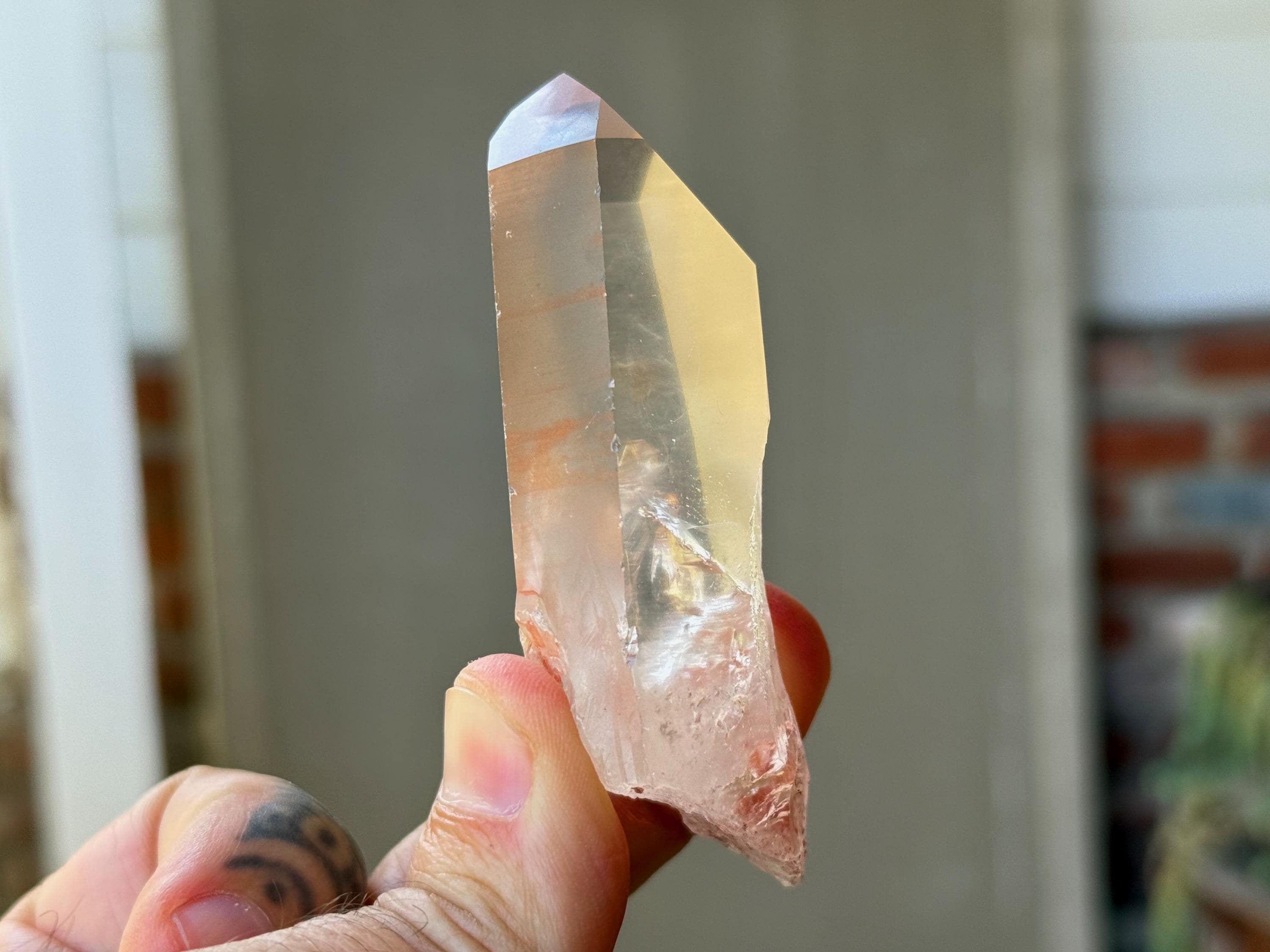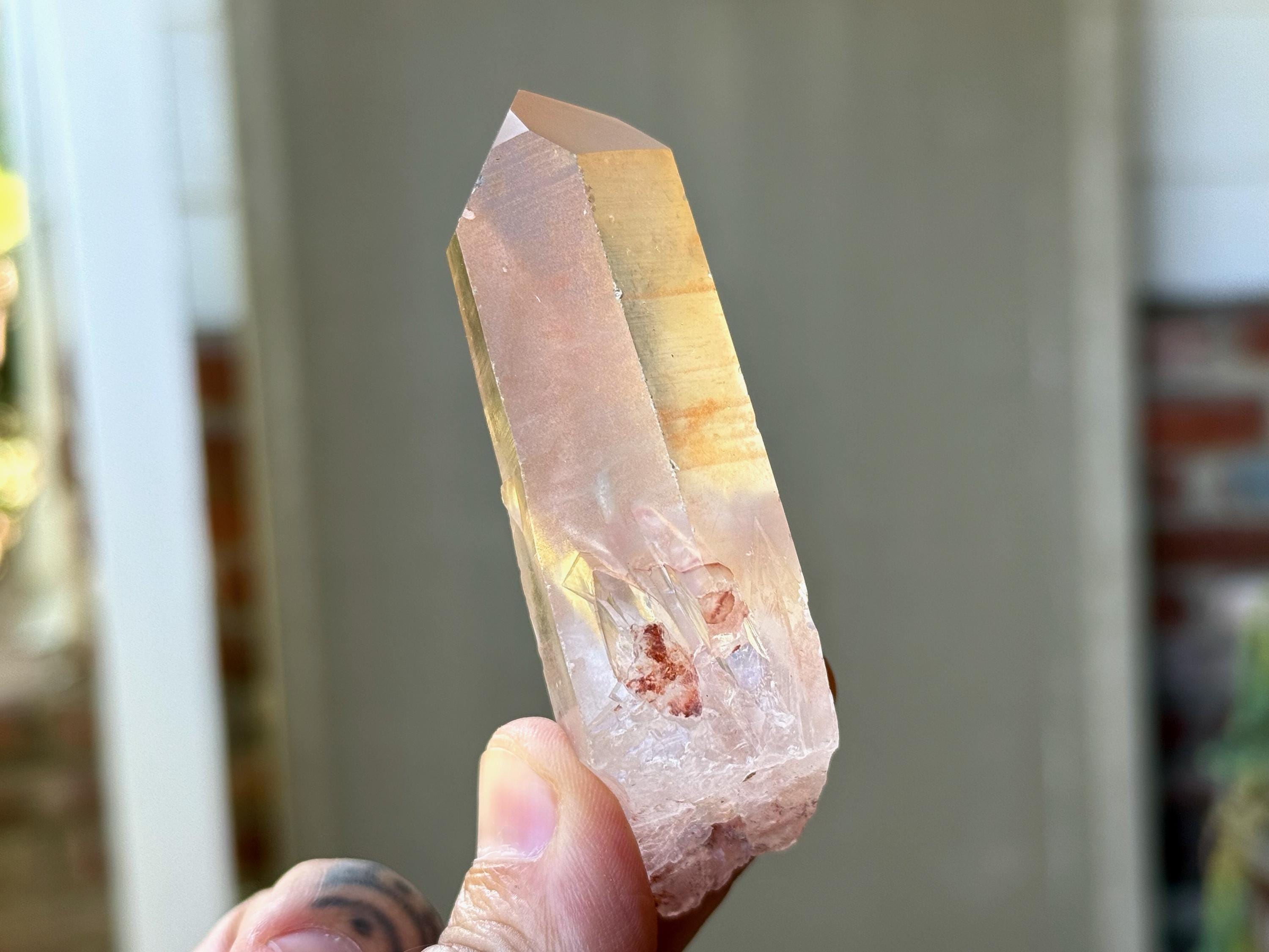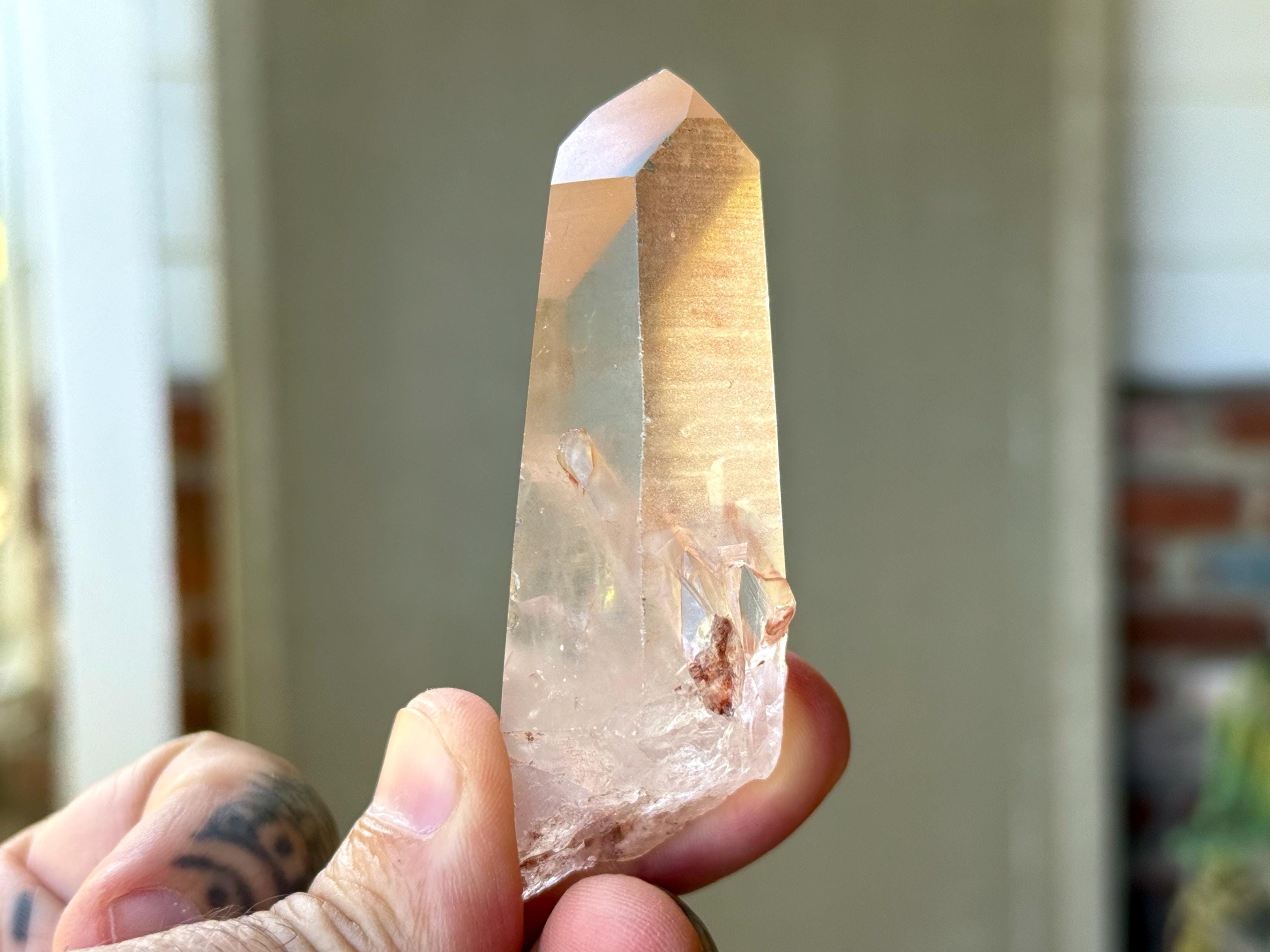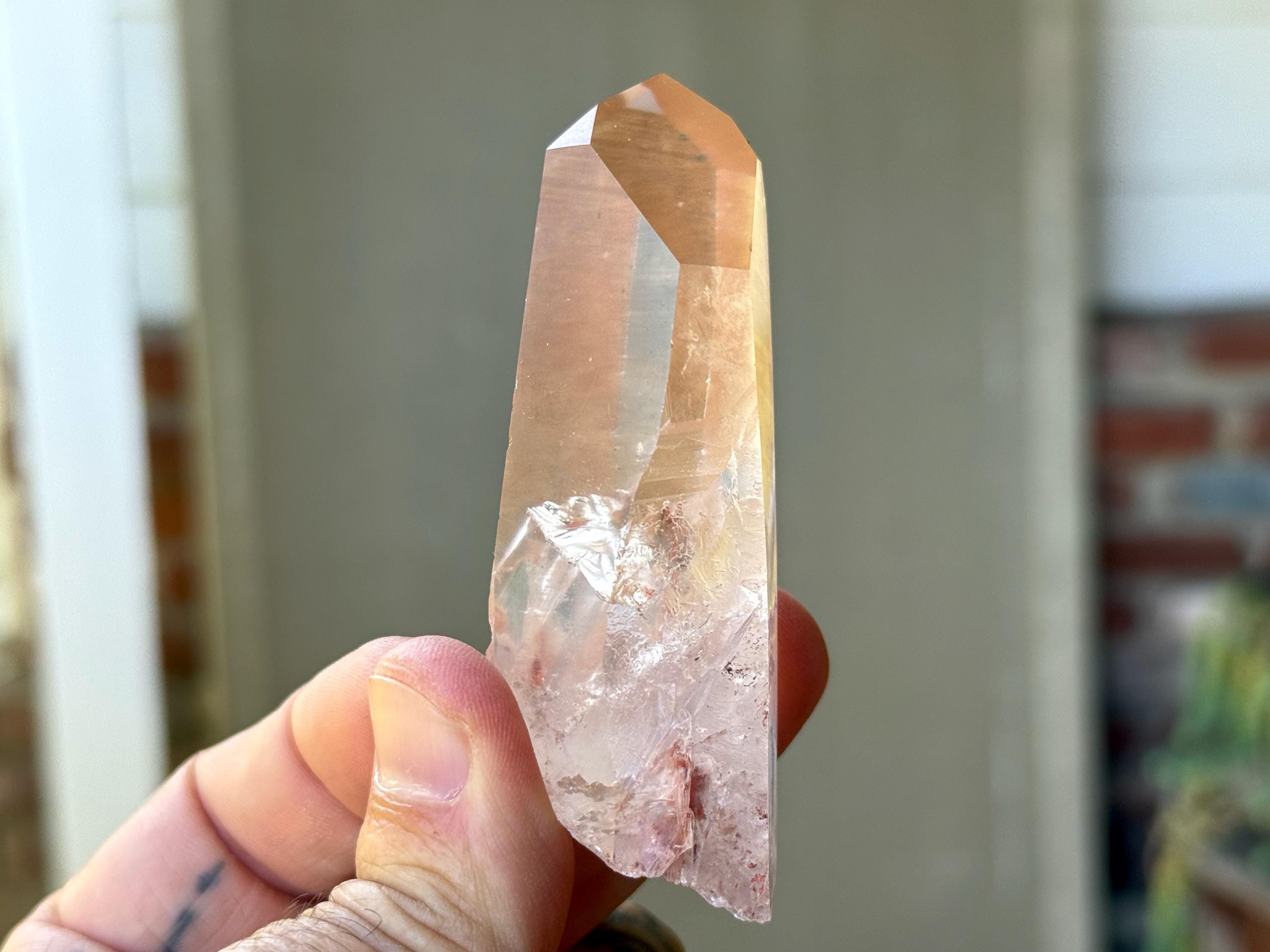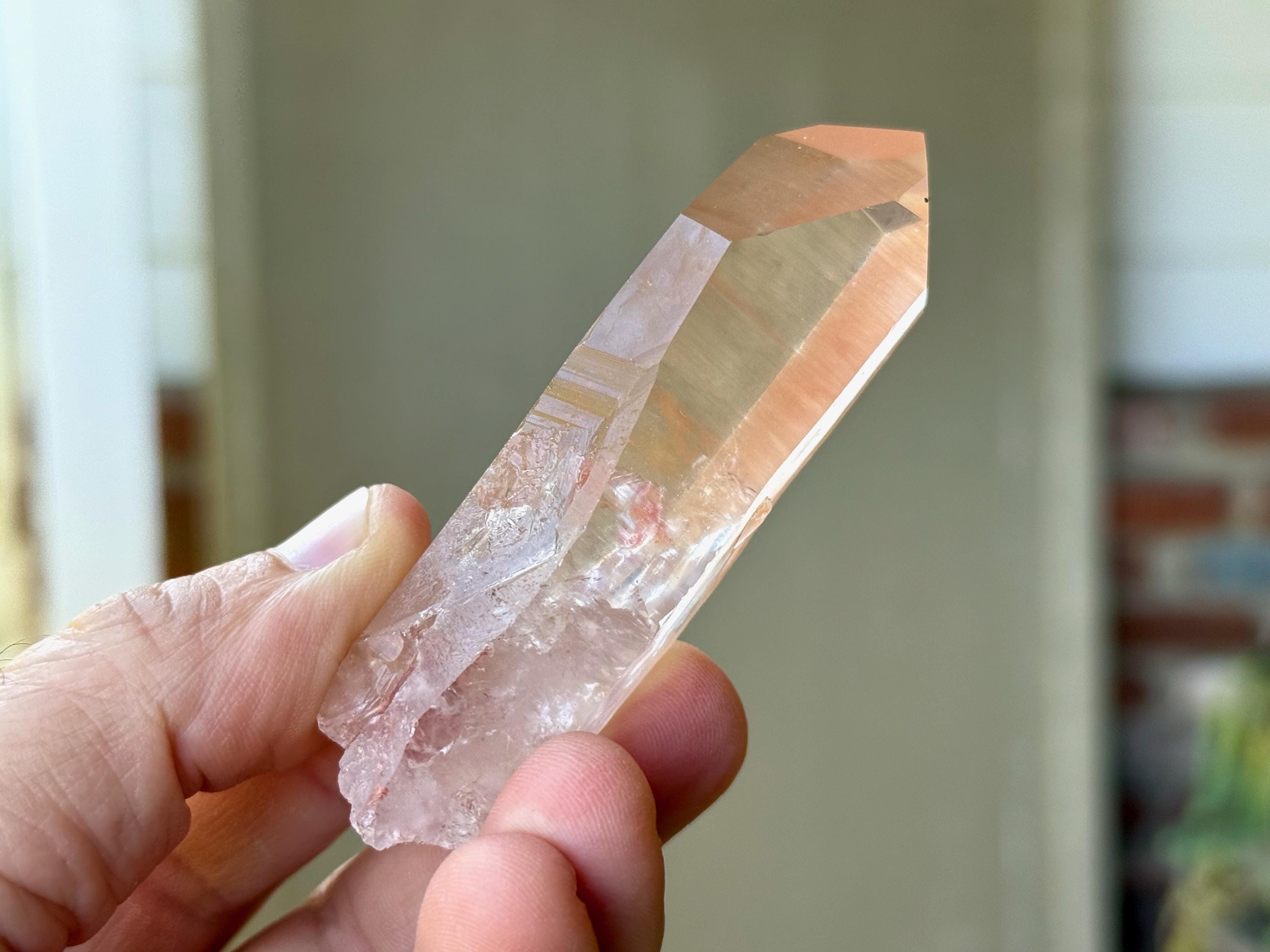 Beautiful, gentle pink hue and excellent clarity to this lovely Pink Lemurian Quartz. This piece is a bit more reminiscent of the original Pink Lemurian find from many years ago, with a color that is much more pink than some of the more pinkish-orange hues we've seen from this collection. You may even spy a flashing rainbow in the center!