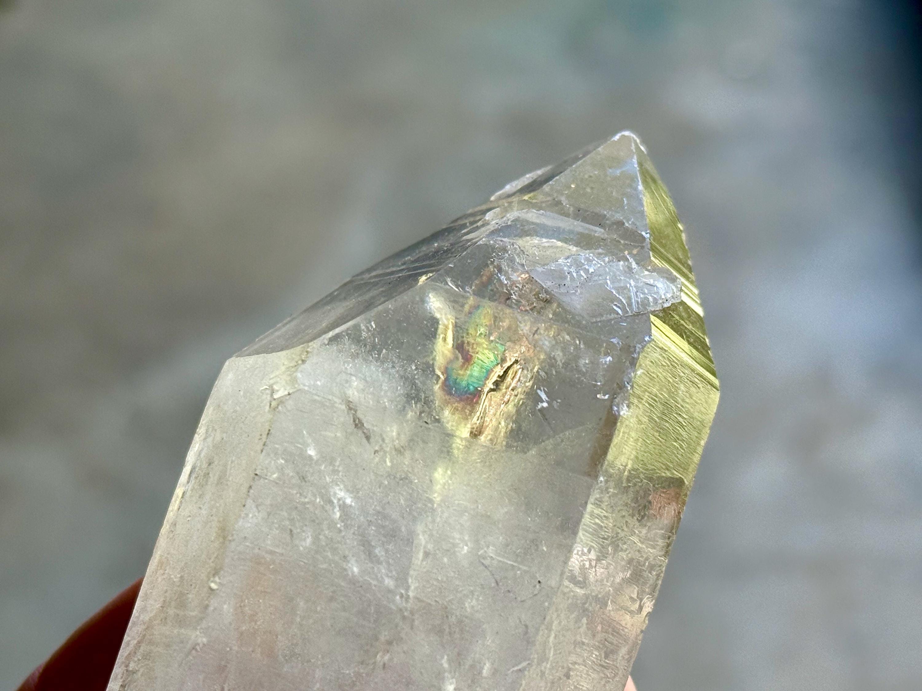 In the main facet, you will find a flashing rainbow that appears at the right angle (Photo 2). There are natural impressions on both the main and base facets. There is a minor chip to one of the base facets and a very minor chip to the lower termination. The primary termination is intact with just a mild scuff at the top.