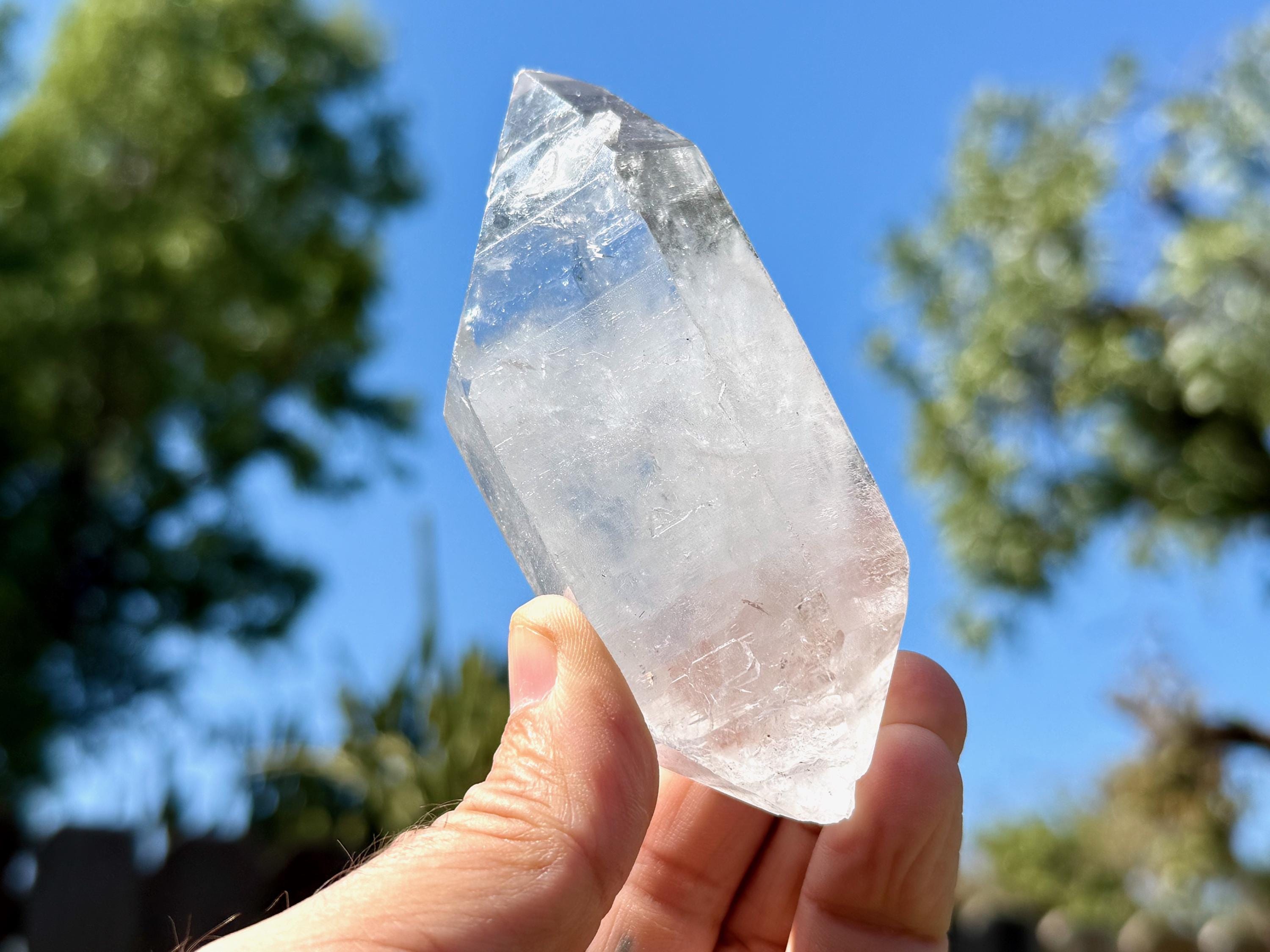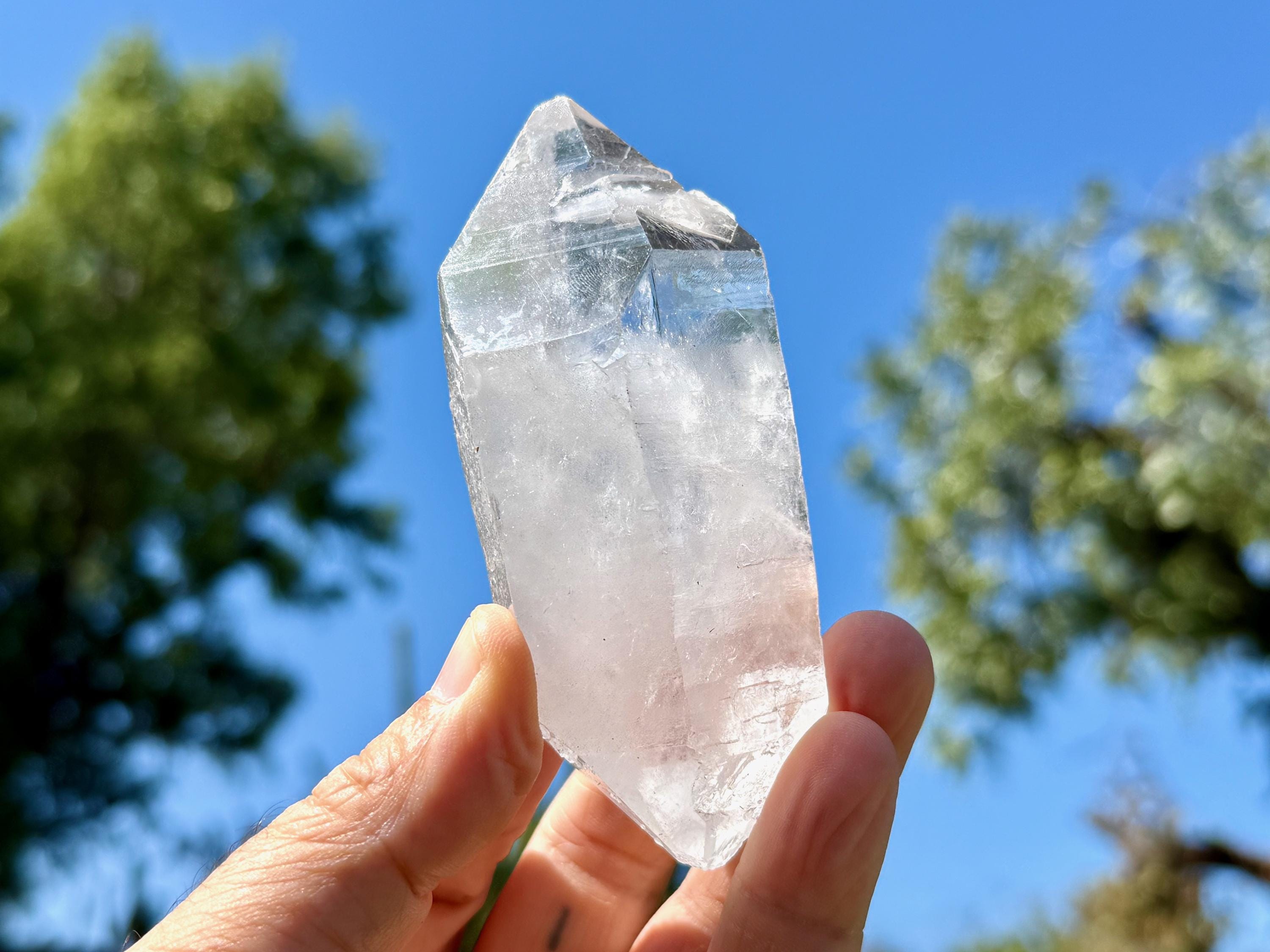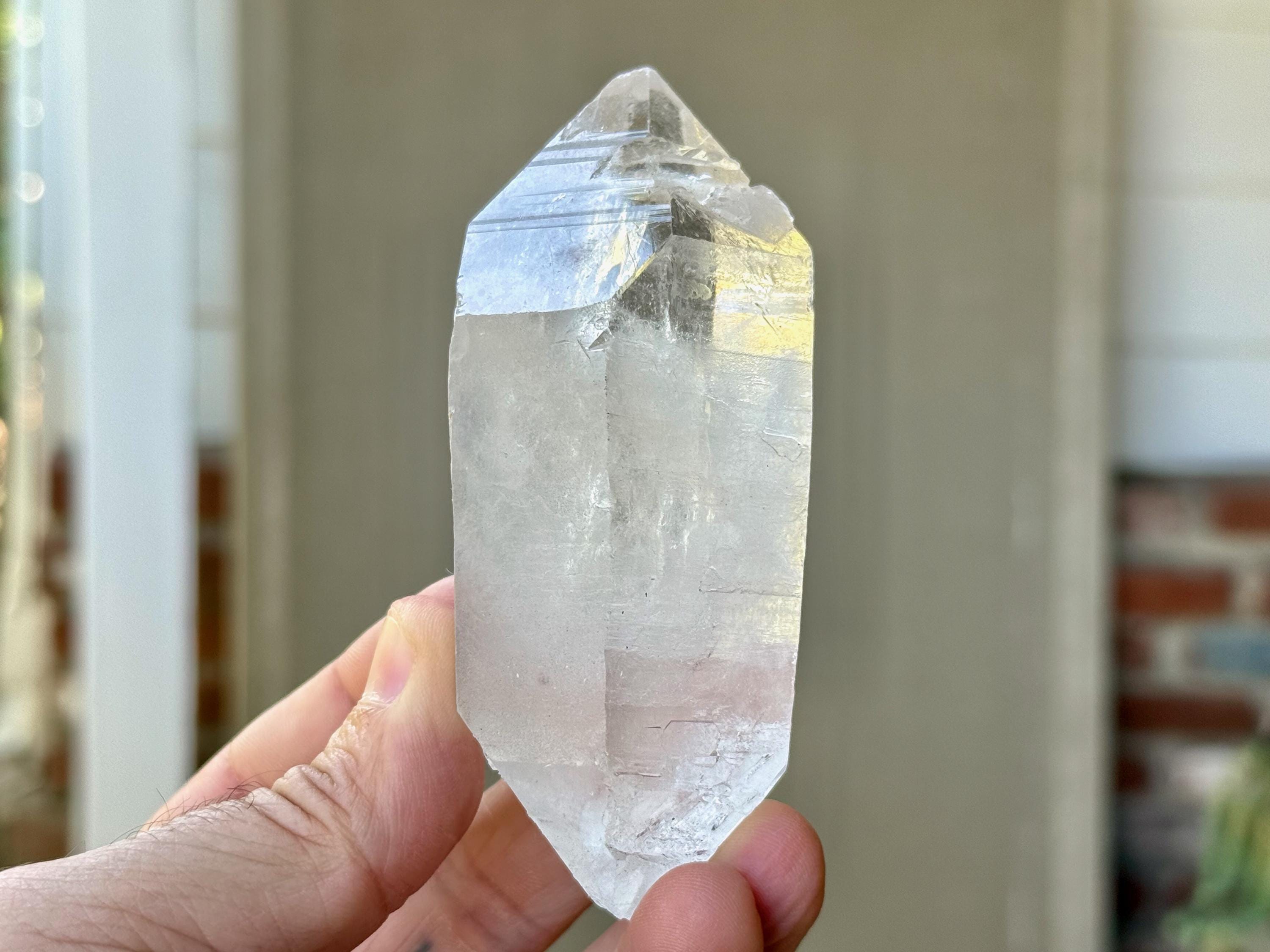 Brilliant, light-bearing luster and beautiful clarity to this Lemurian Quartz crystal with horizontal striations on the main facet! This crystal has a wonderful gradient of mildly cloudy in the center and water clear at both ends.