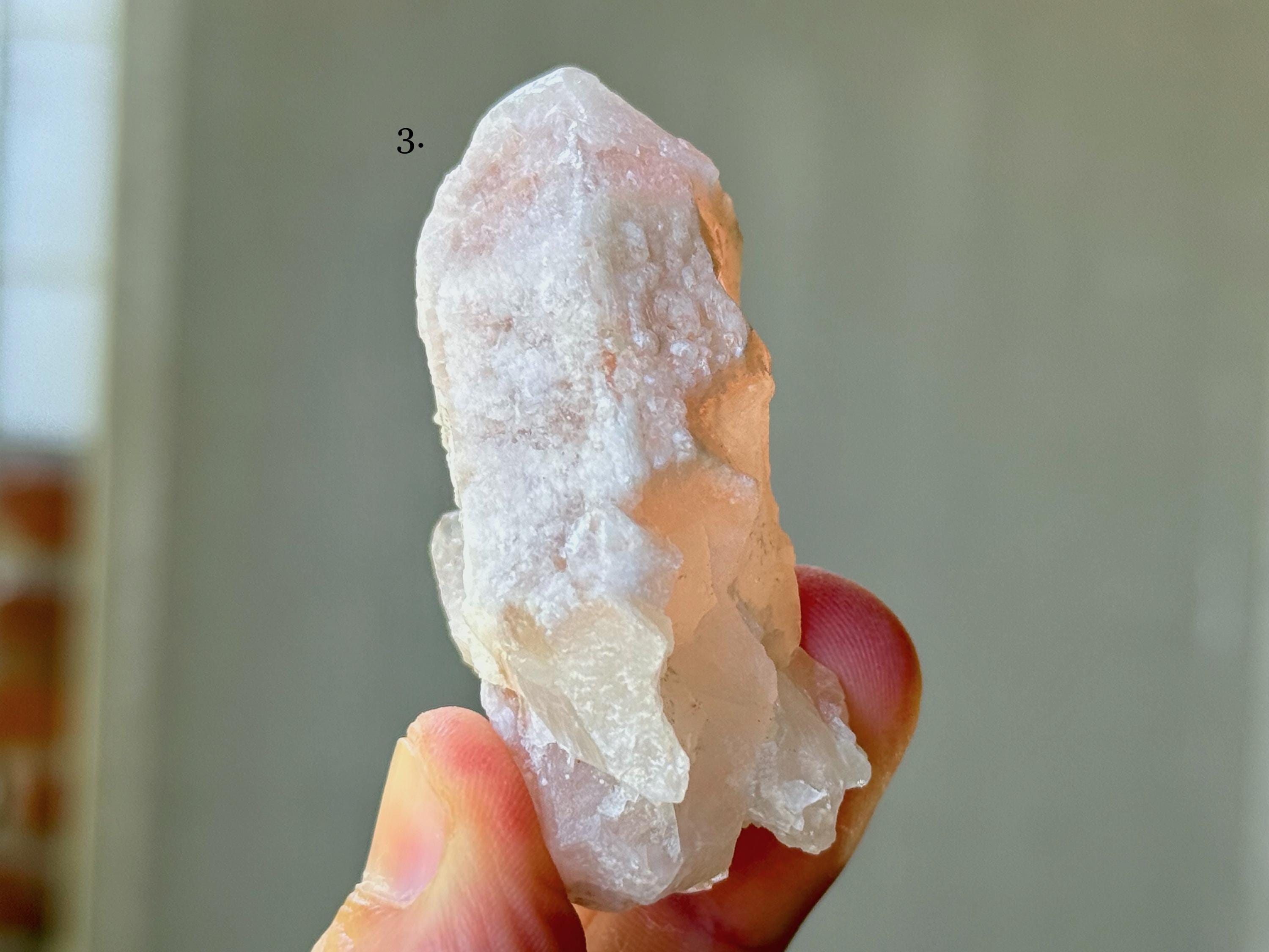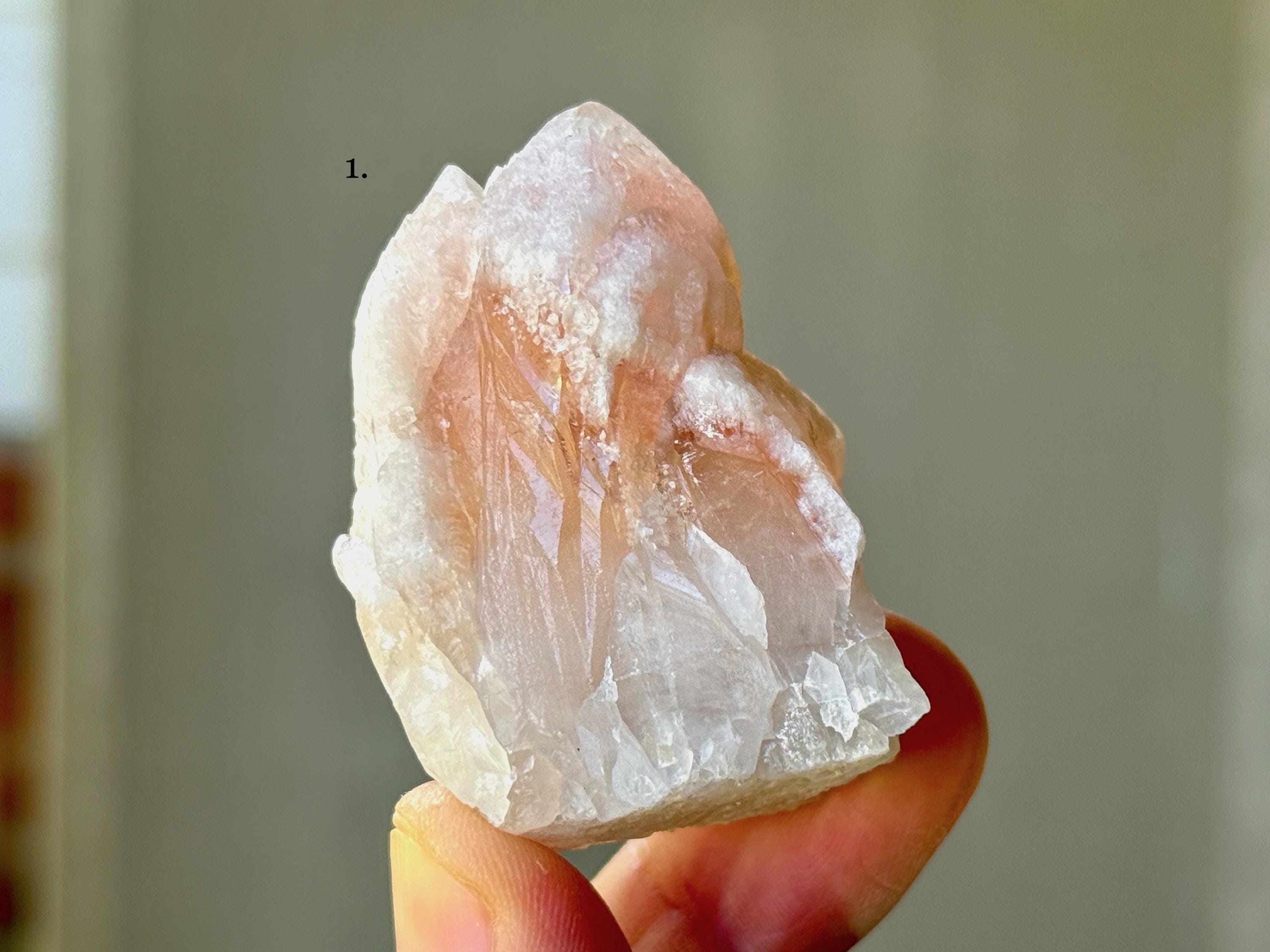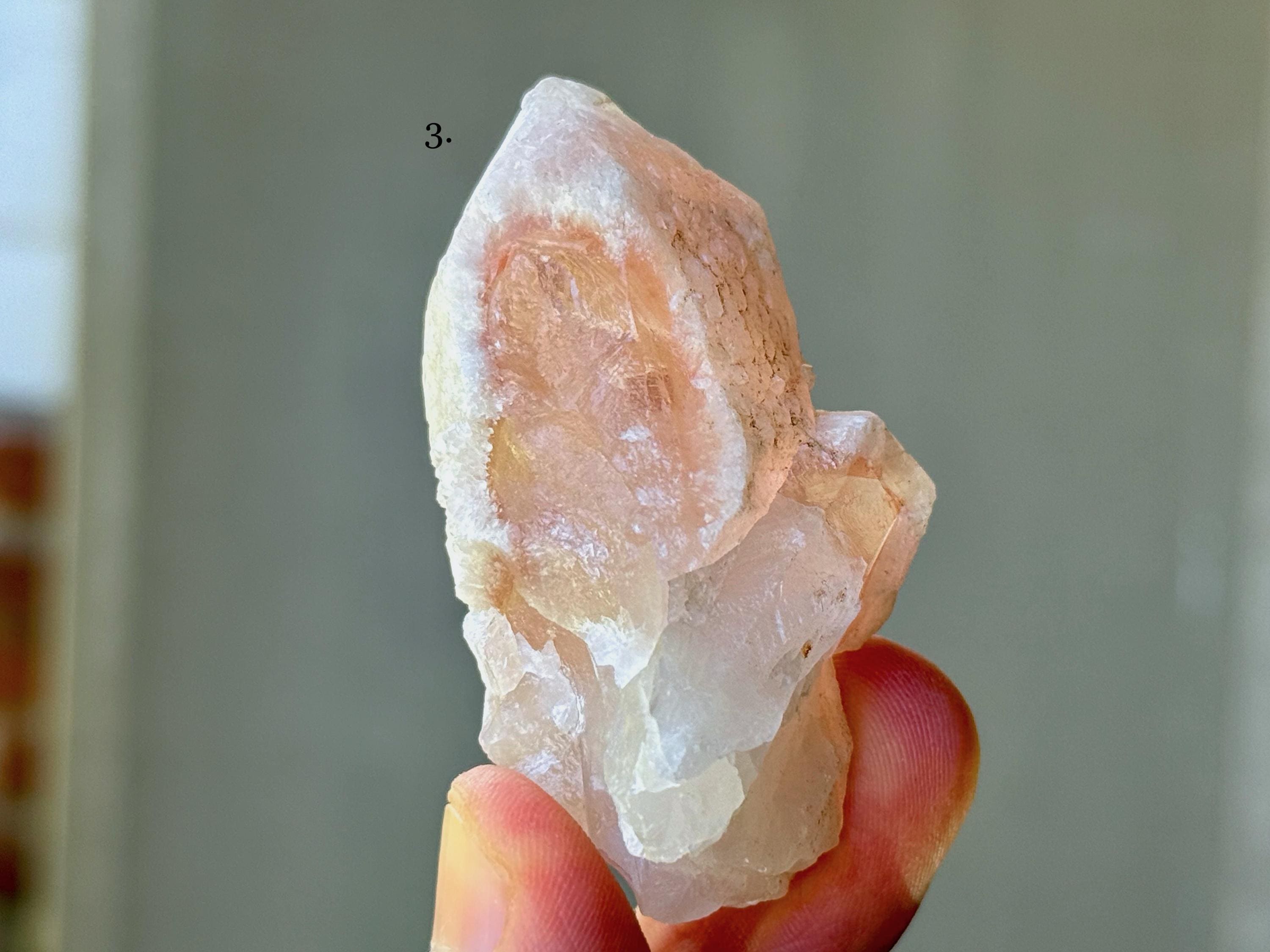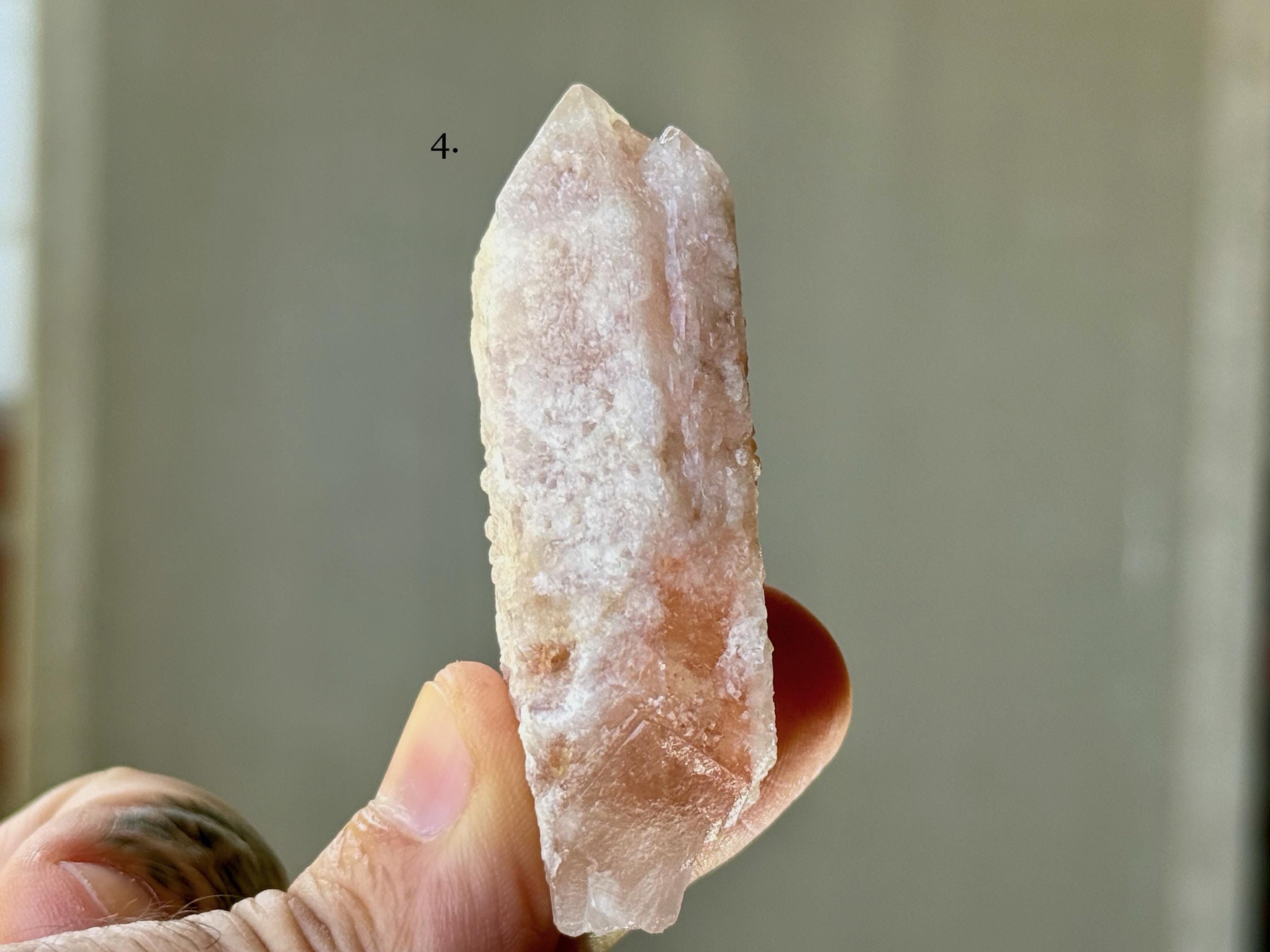 These Pink Dreamsicle Lemurian Quartz come from a recent find in the Serra do Cabral Mountains, Minas Gerais, Brazil. Each selection is numbered, simply select your preference(s) from the dropdown menu.