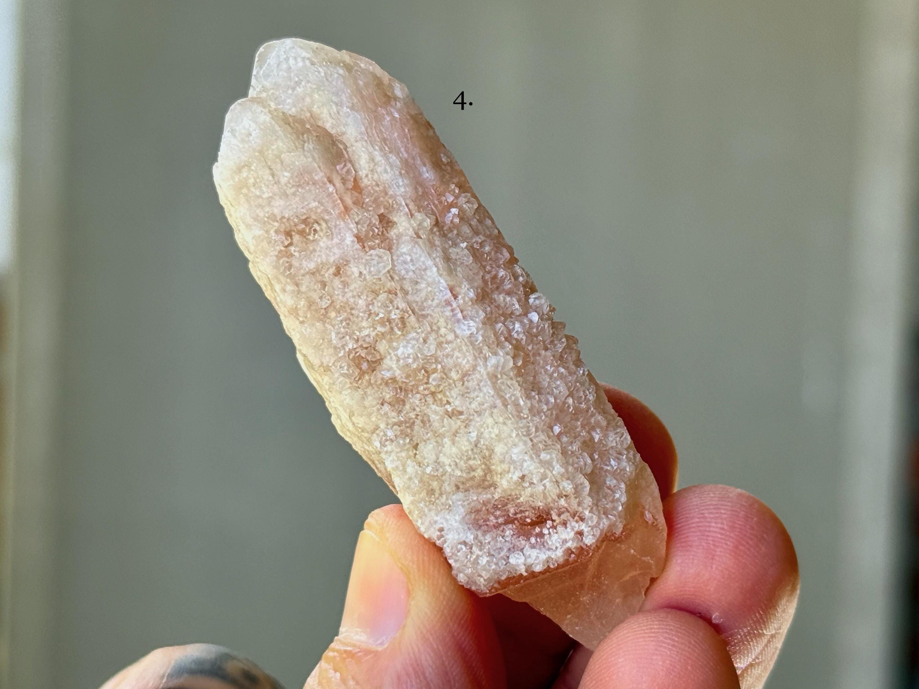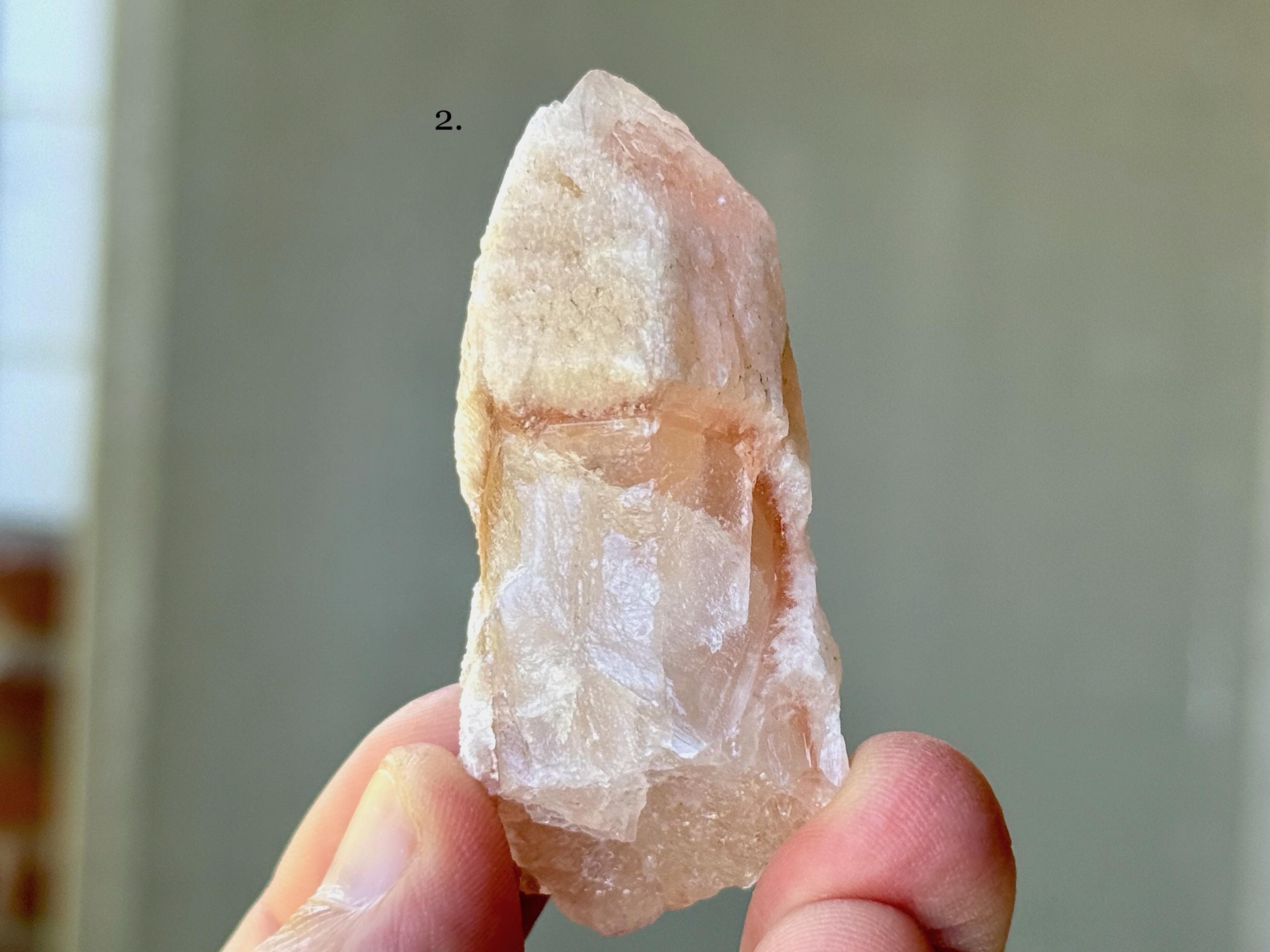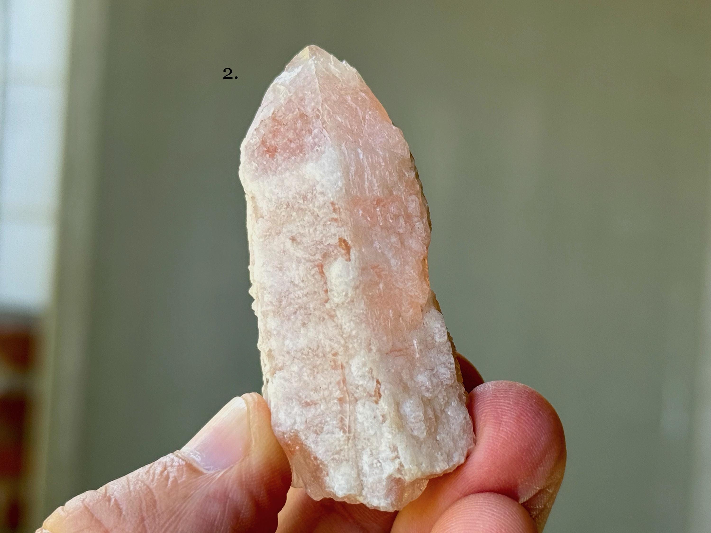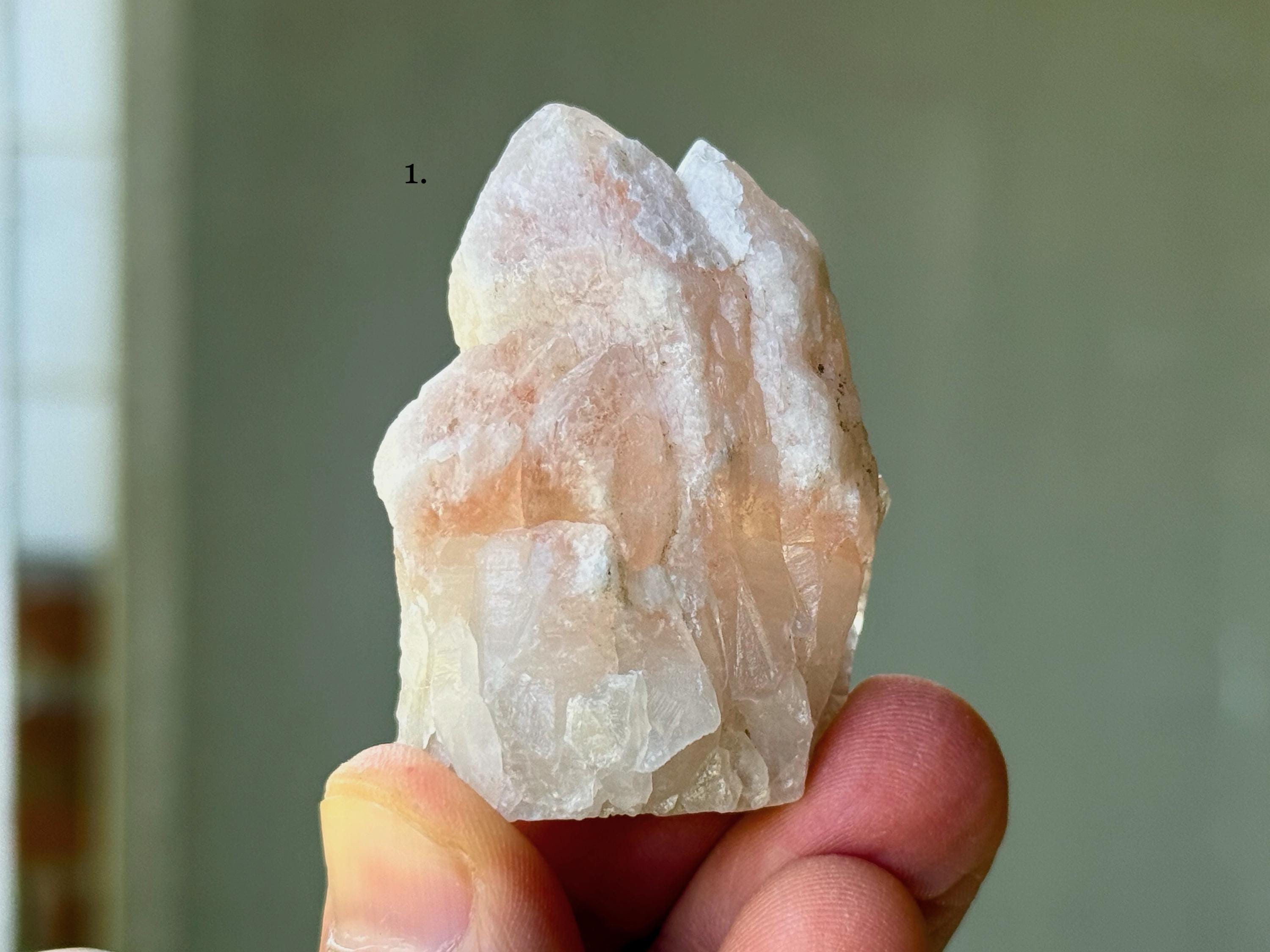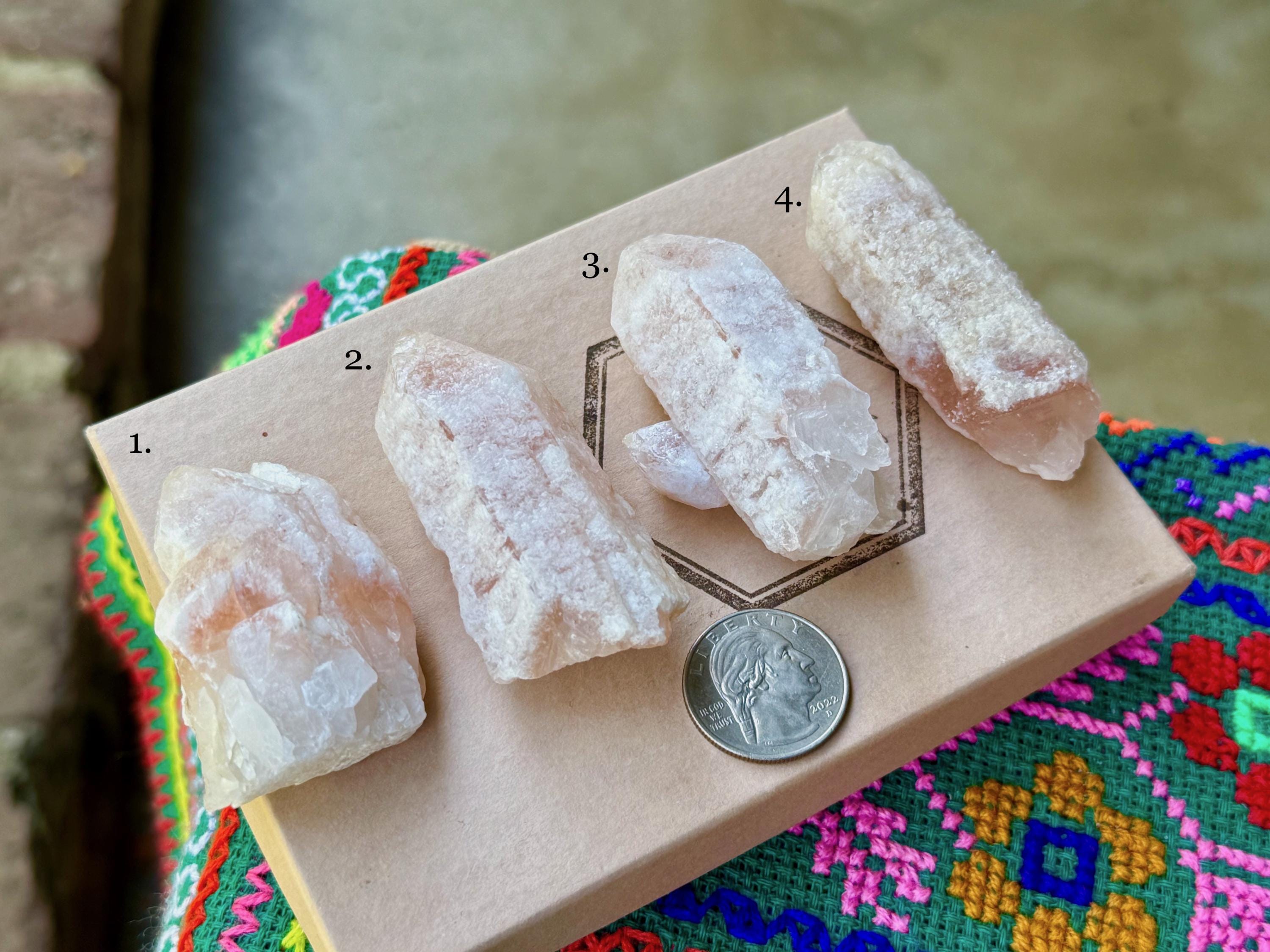 These Pink Dreamsicle Lemurian Quartz come from a recent find in the Serra do Cabral Mountains, Minas Gerais, Brazil. Each selection is numbered, simply select your preference(s) from the dropdown menu.