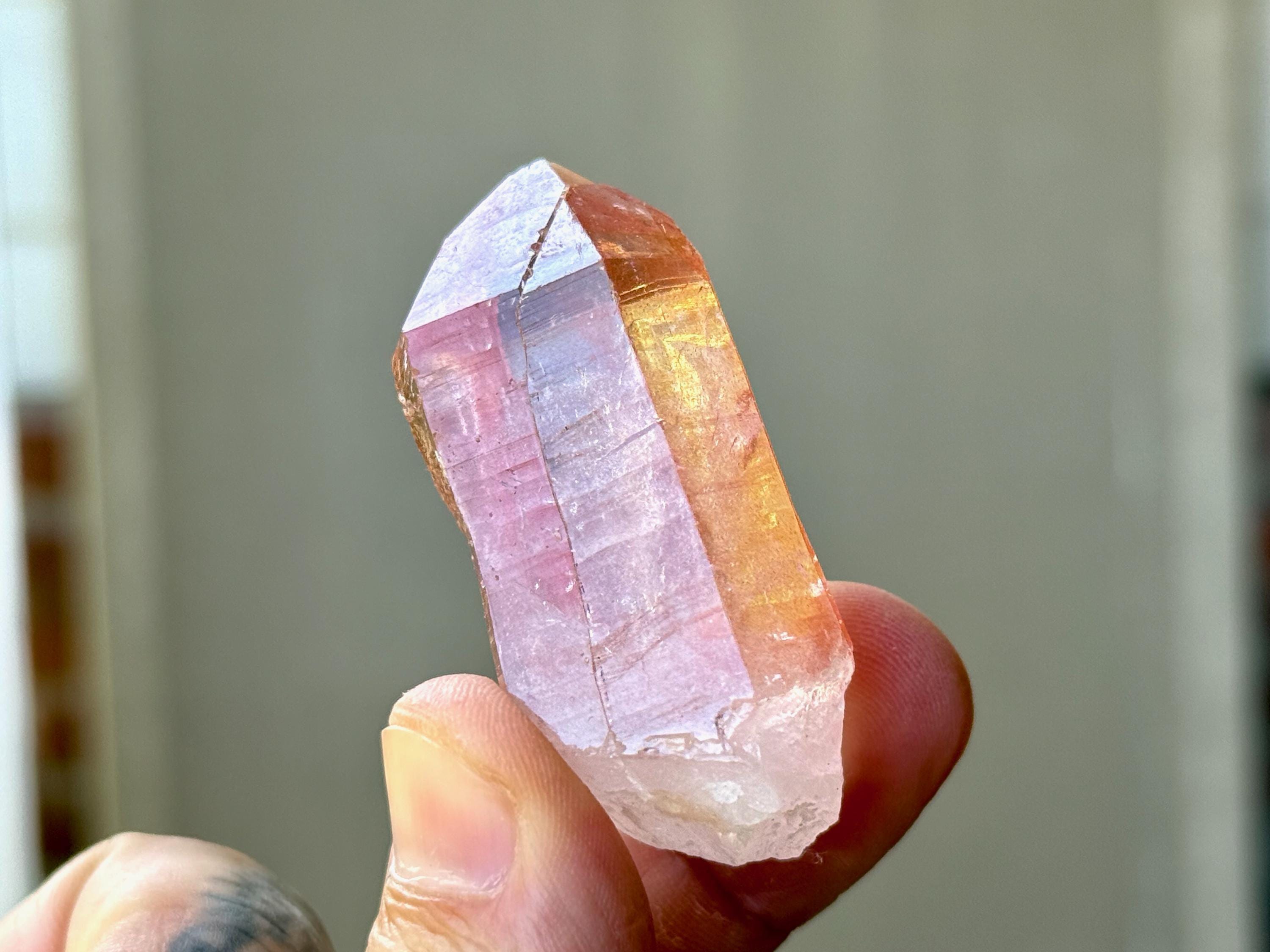 One of the finest pieces from this collection, the photos don't quite do it justice! Brilliant luster, water clear clarity and a vibrant pink hue to this glassy Scarlet Temple Pink Lemurian! This is a bit of a Tantric Twin formation that has grown almost entirely together. Wonderful horizontal striations and excellent termination. The best of the best!