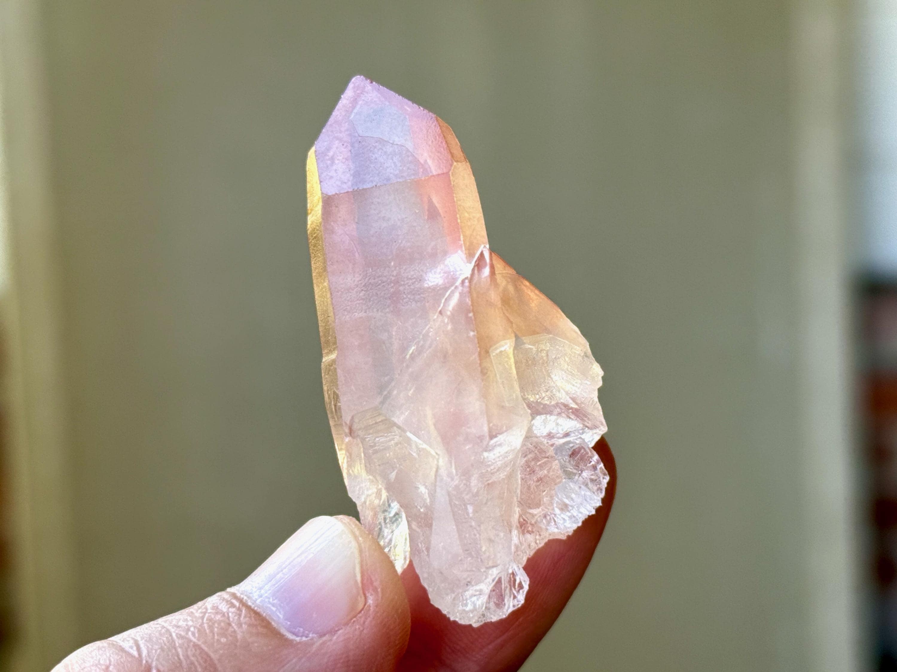 This is a new locale for these special crystals, which exhibit a vibrant pink color from Hematite inclusion. These crystals are known to resonate and align/clear all chakras, but are also associated specifically with the Crown and Heart Chakras.