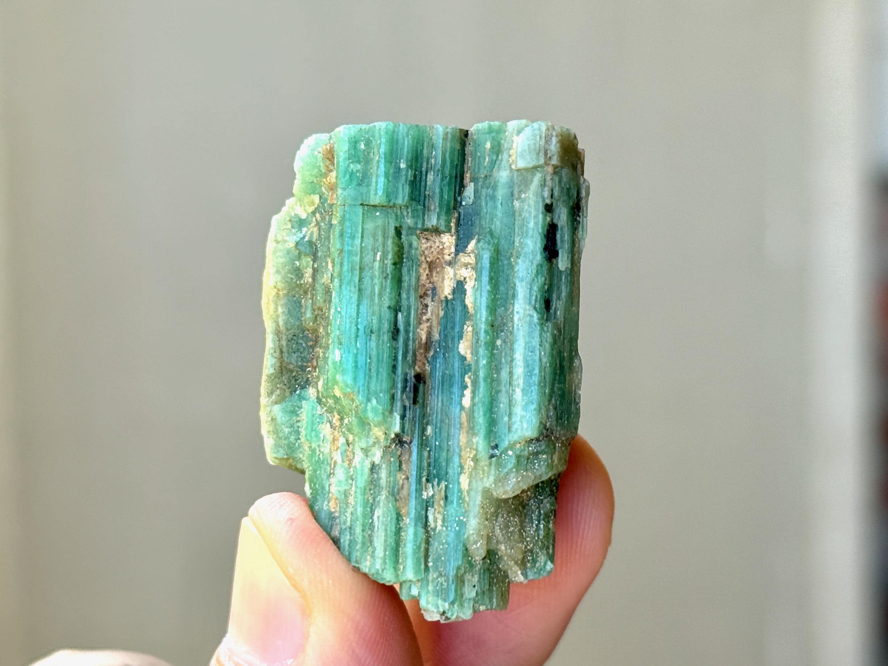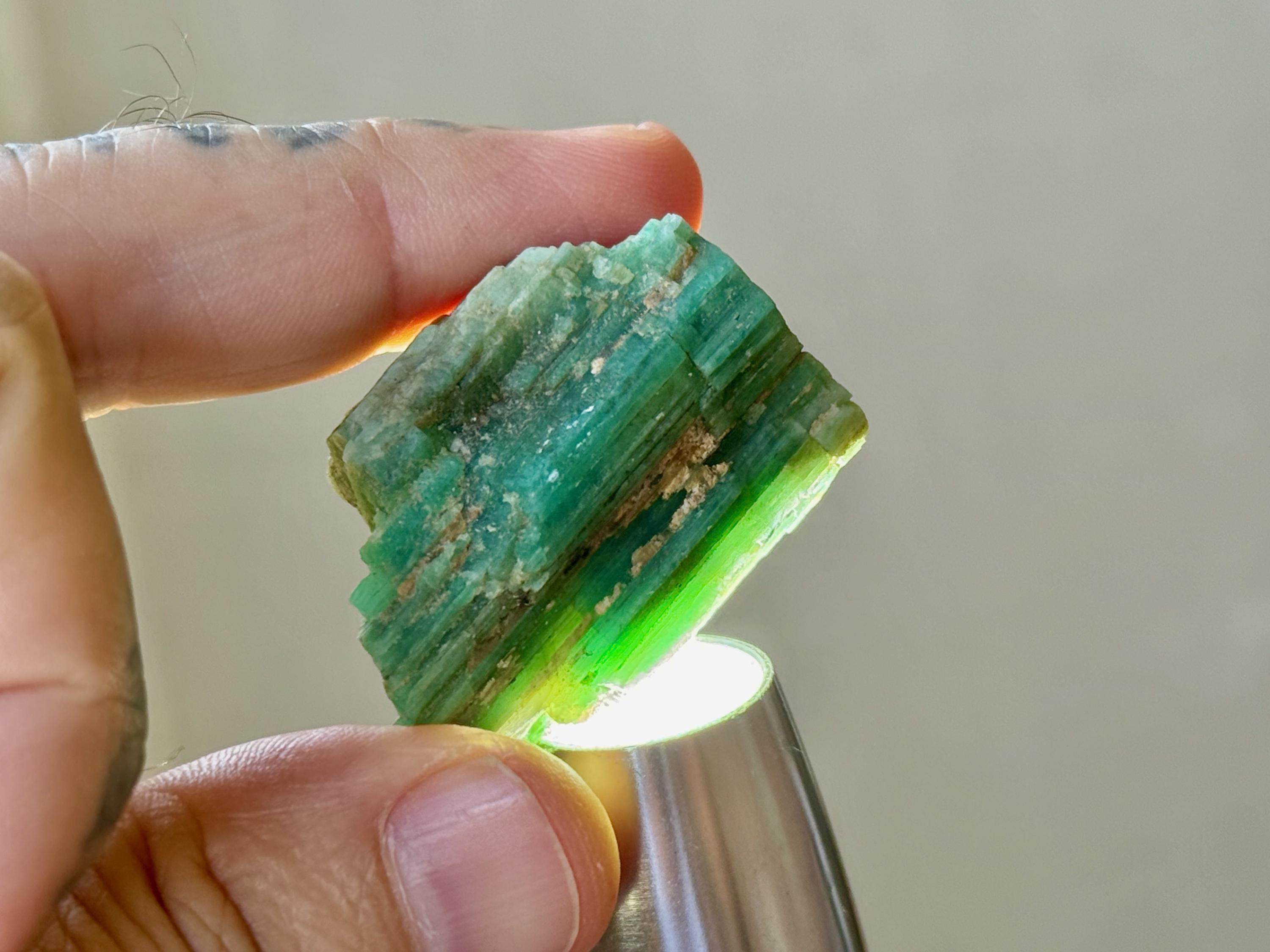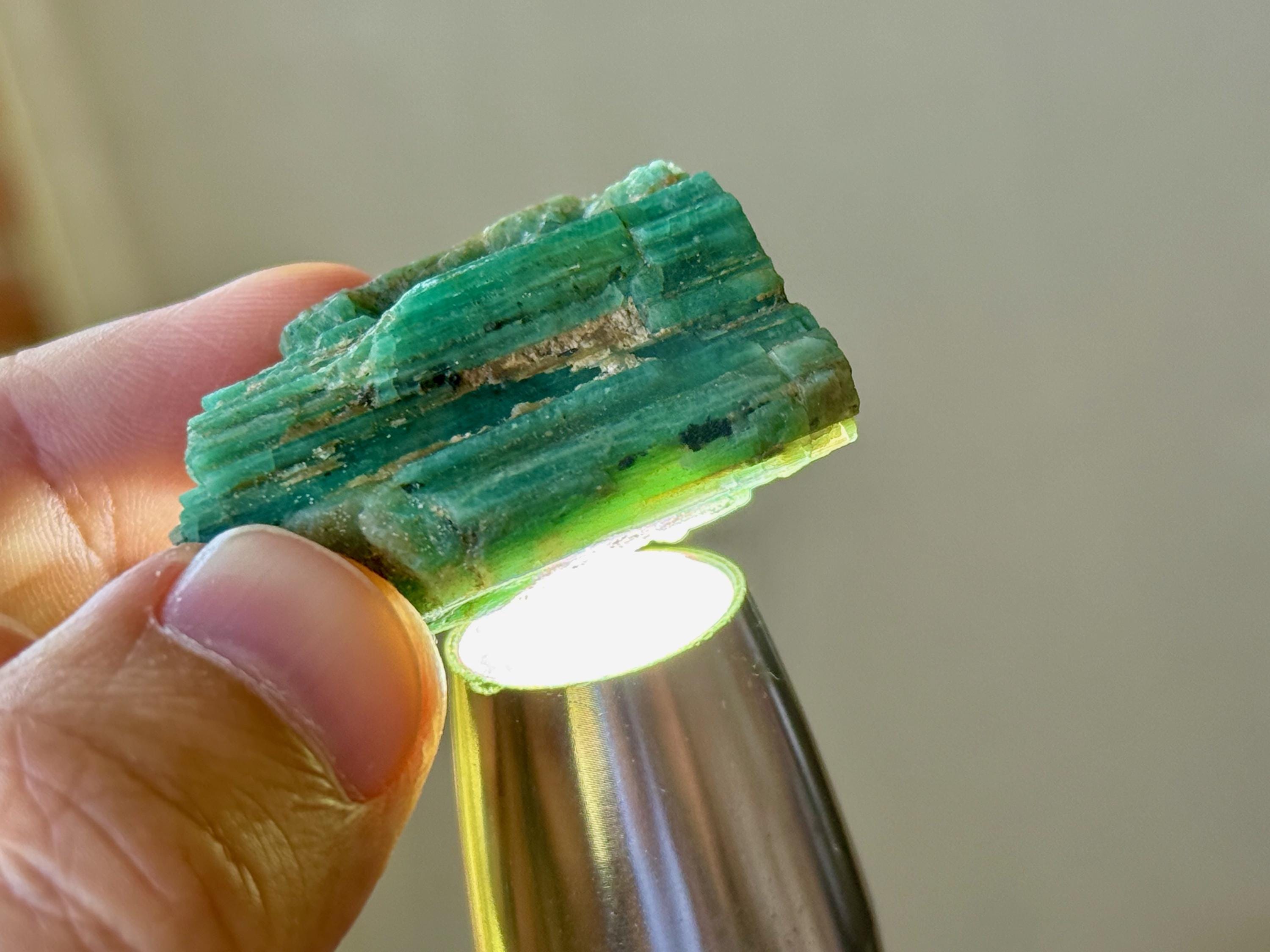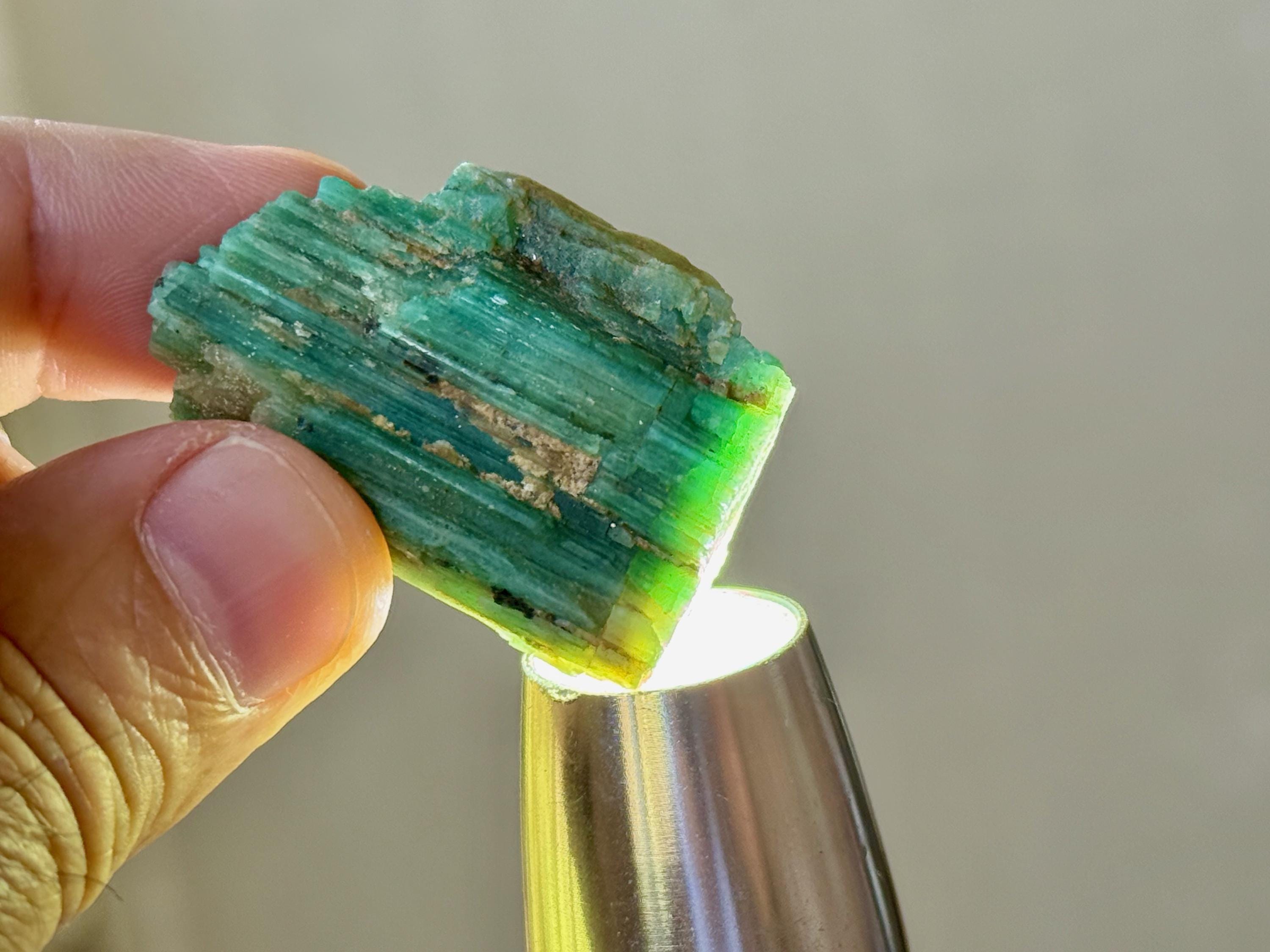 A magnificent, vibrant blue-green hue to this extraordinary natural Emerald crystal! This stone possesses a wonderful ridged formation and a natural termination on top (Photo 10).