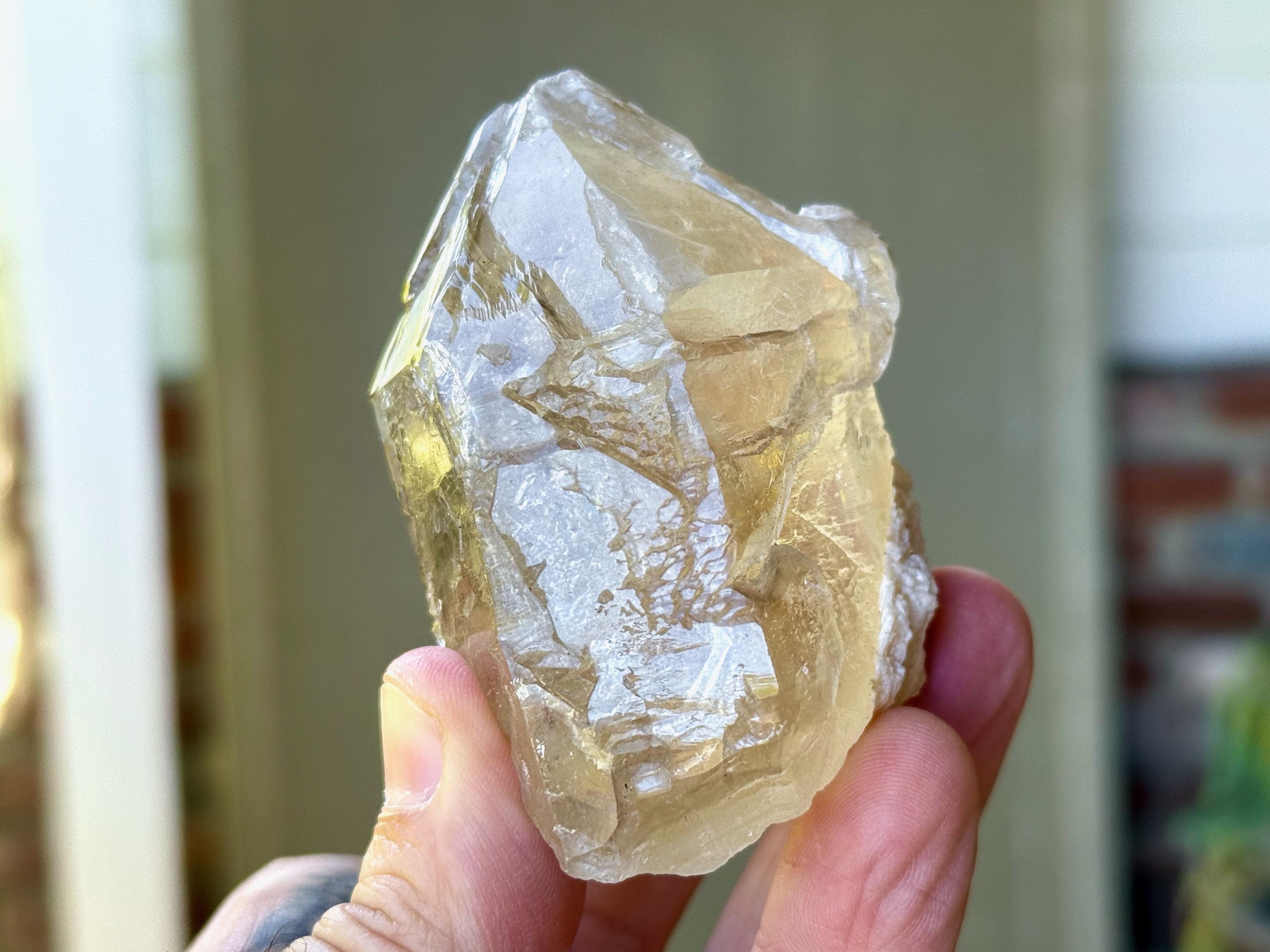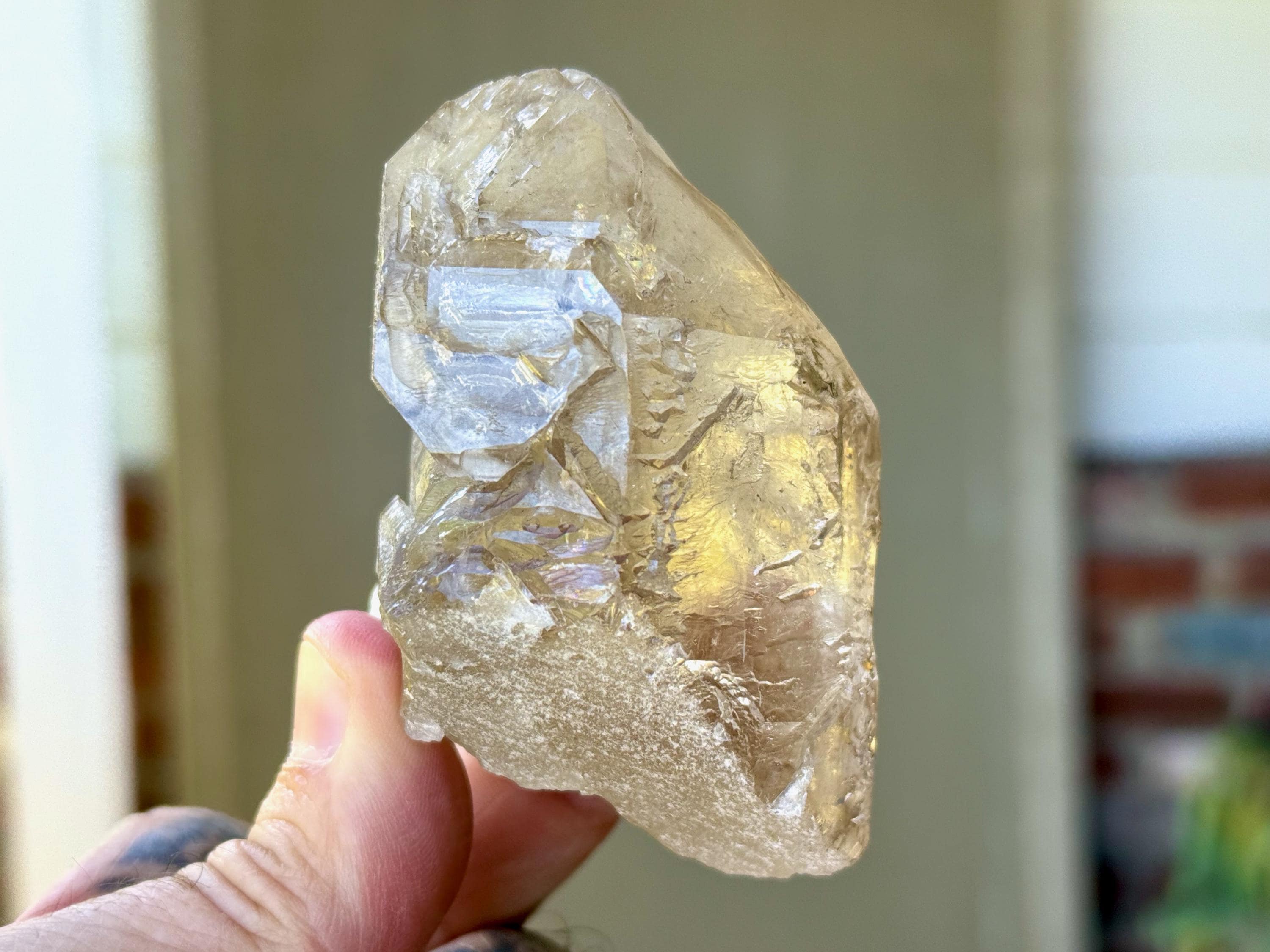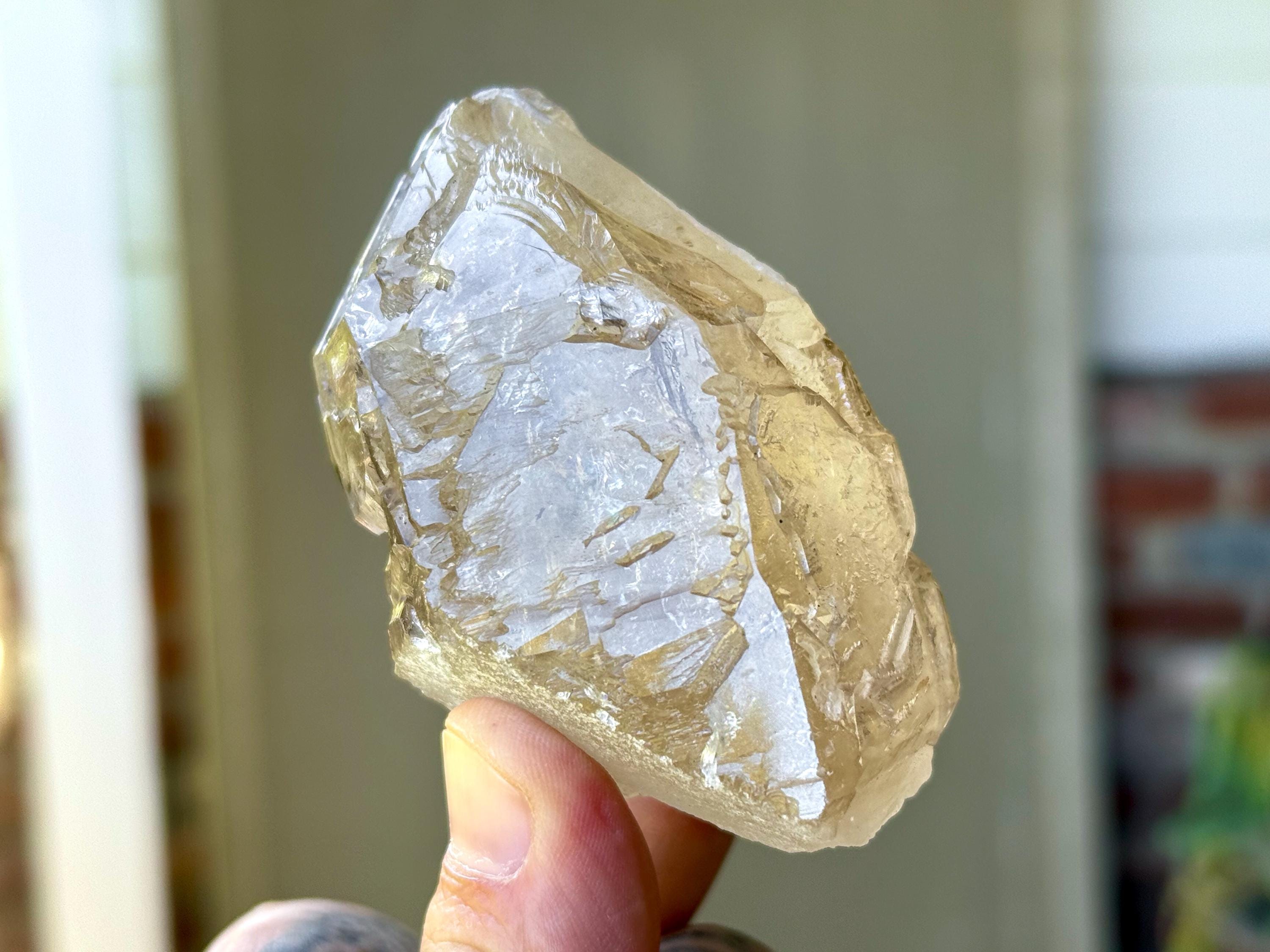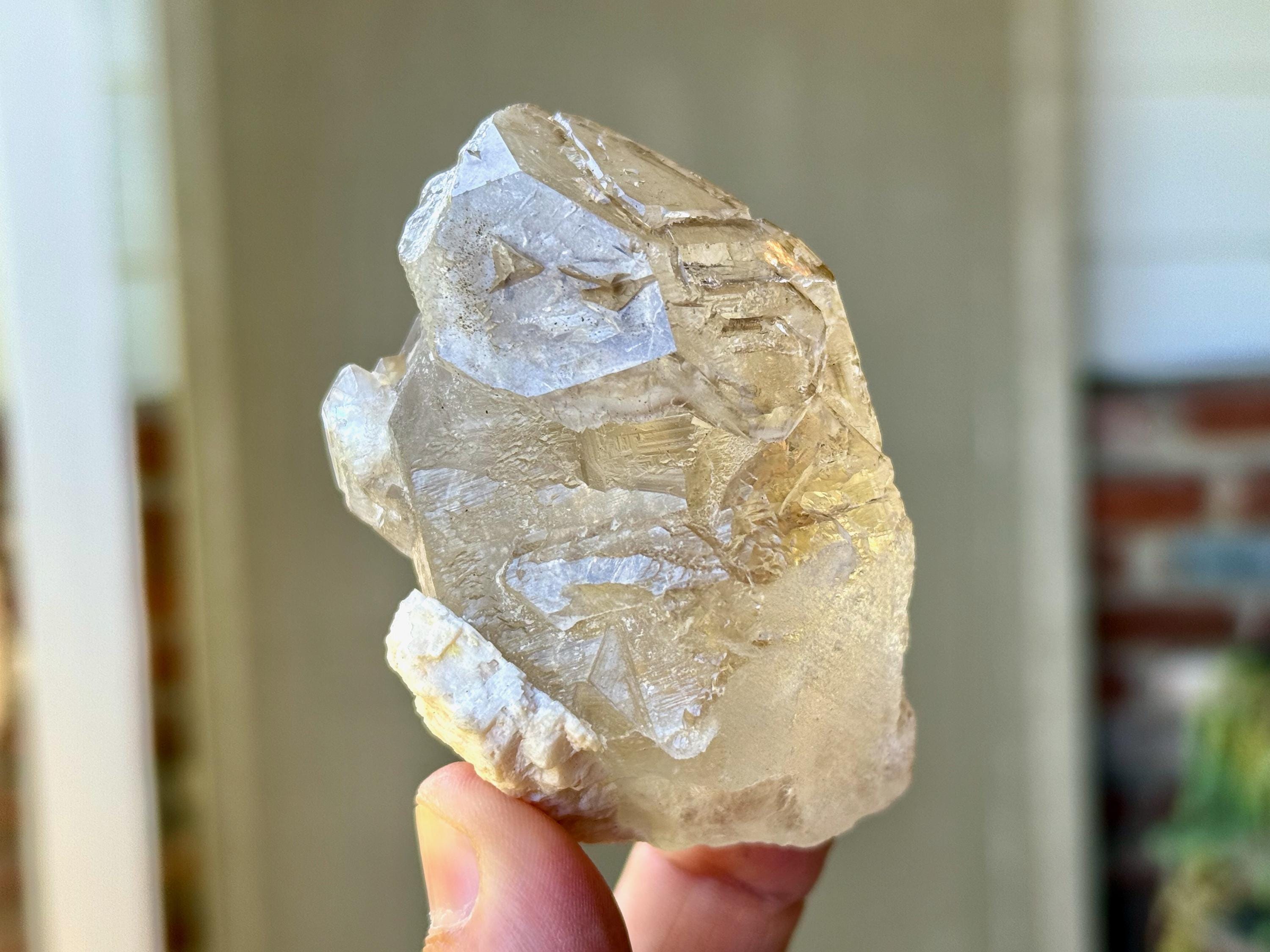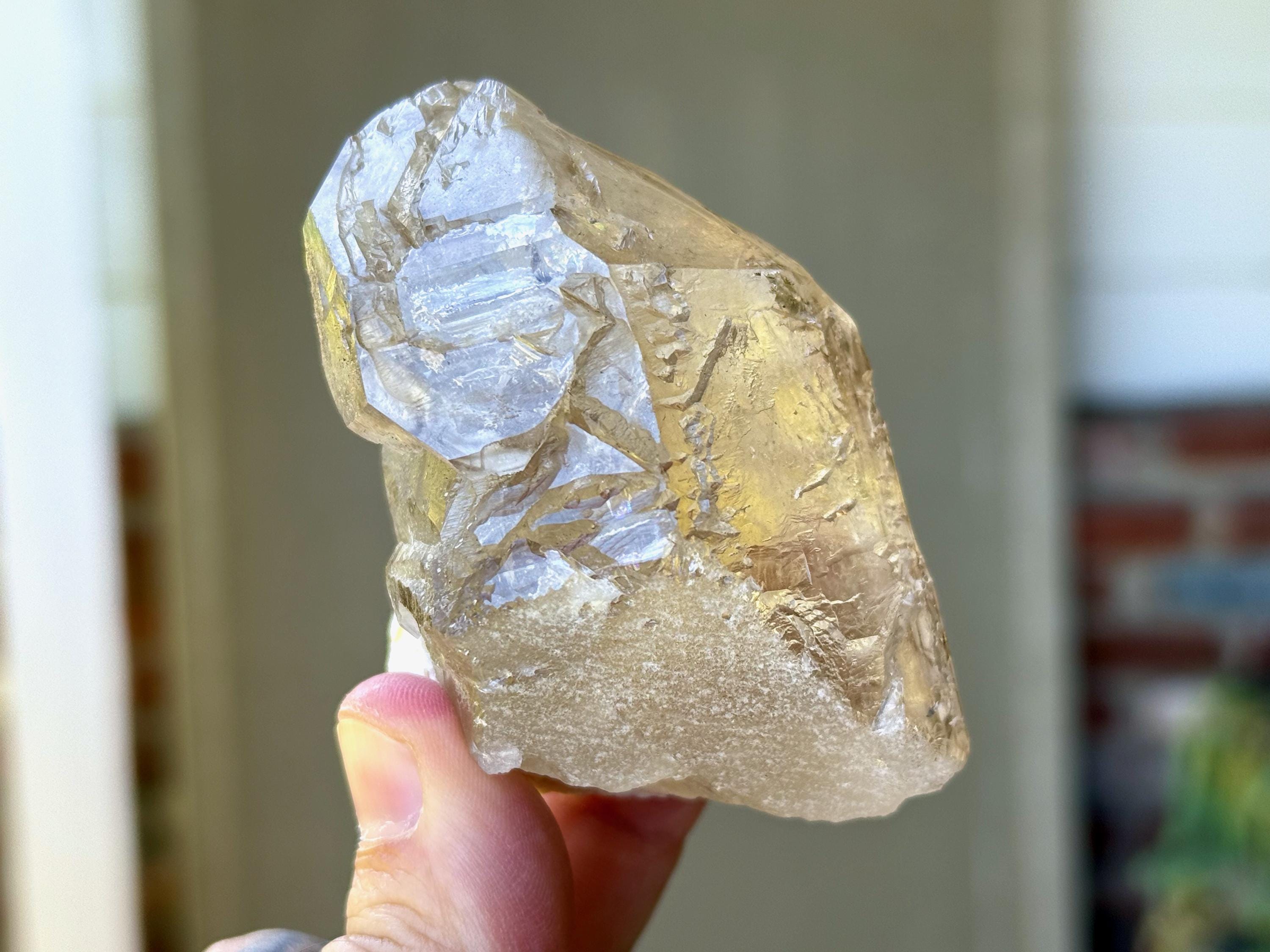 There is one area on the upper right facet that is partially self-healed (does not appear to be damage, but not as smoothly terminated as the other facets), but the termination itself is intact and excellent. Outstanding beauty and energies to this one!