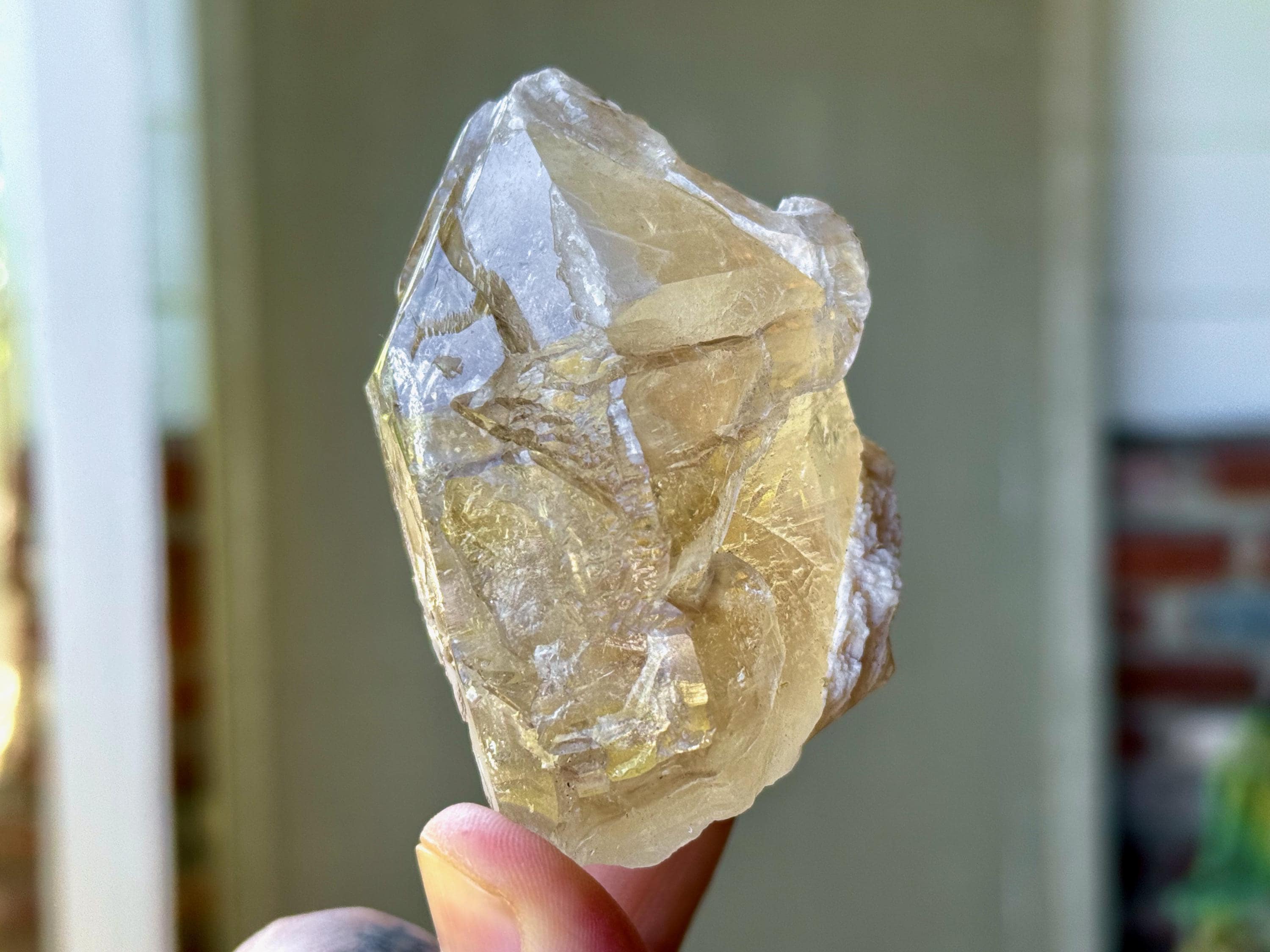 Brilliant luster and a lovely gradient golden hue to this handsome Elestial Citrine crystal with an inclusion of white Feldspar near the base. This crystal has a color that is more golden yellow at the bottom and blends into a slightly more clear and milky white complexion near the top. It features an array of etched textures and impressions throughout its sides and main facets.