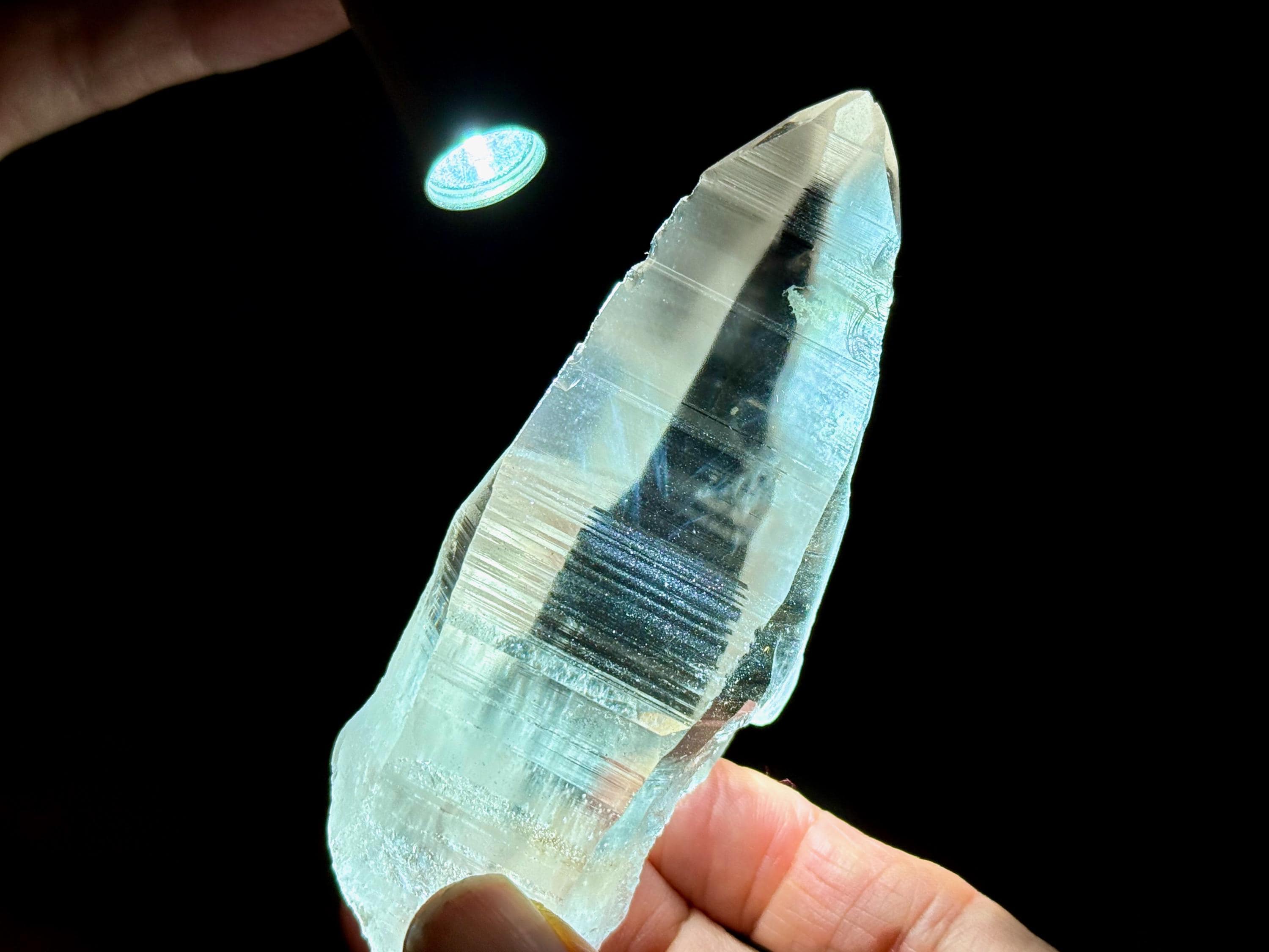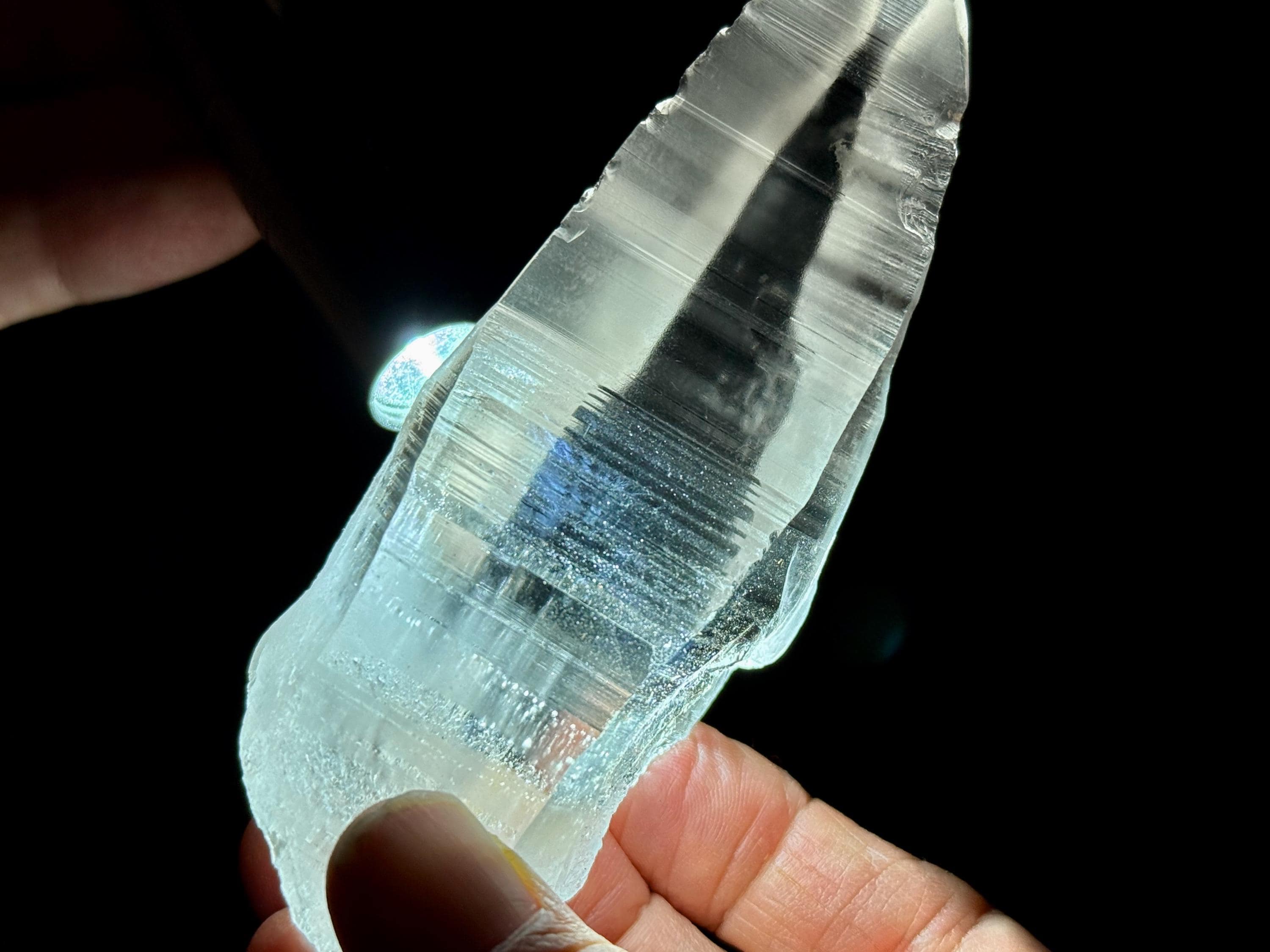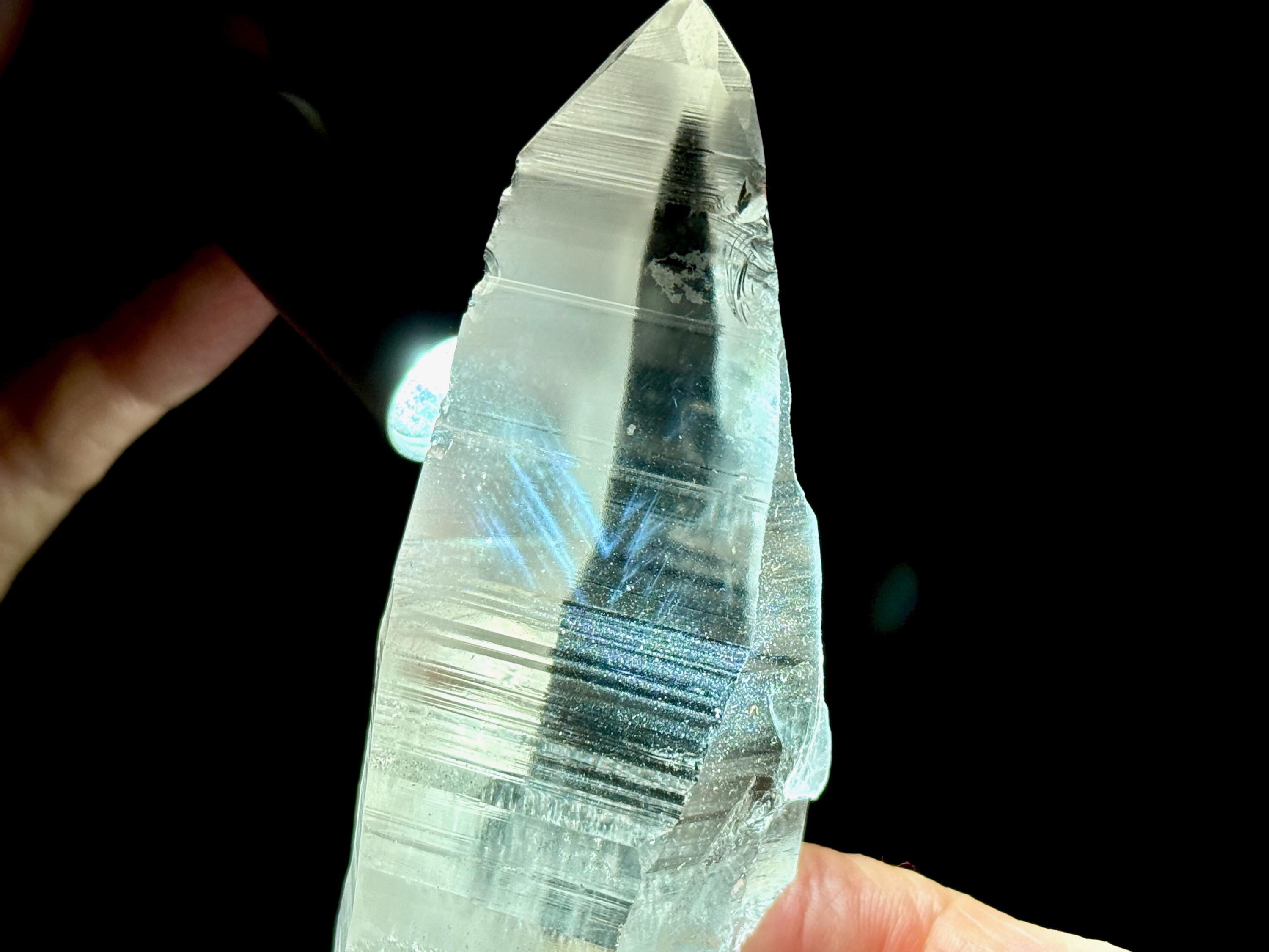 One of the best of the best! Tremendous quality to this Blue Needle Lemurian Quartz with water-clear clarity and brilliant luster. This crystal features a tapered Muzo Habit formation with extremely well-defined striations on its broad sides.