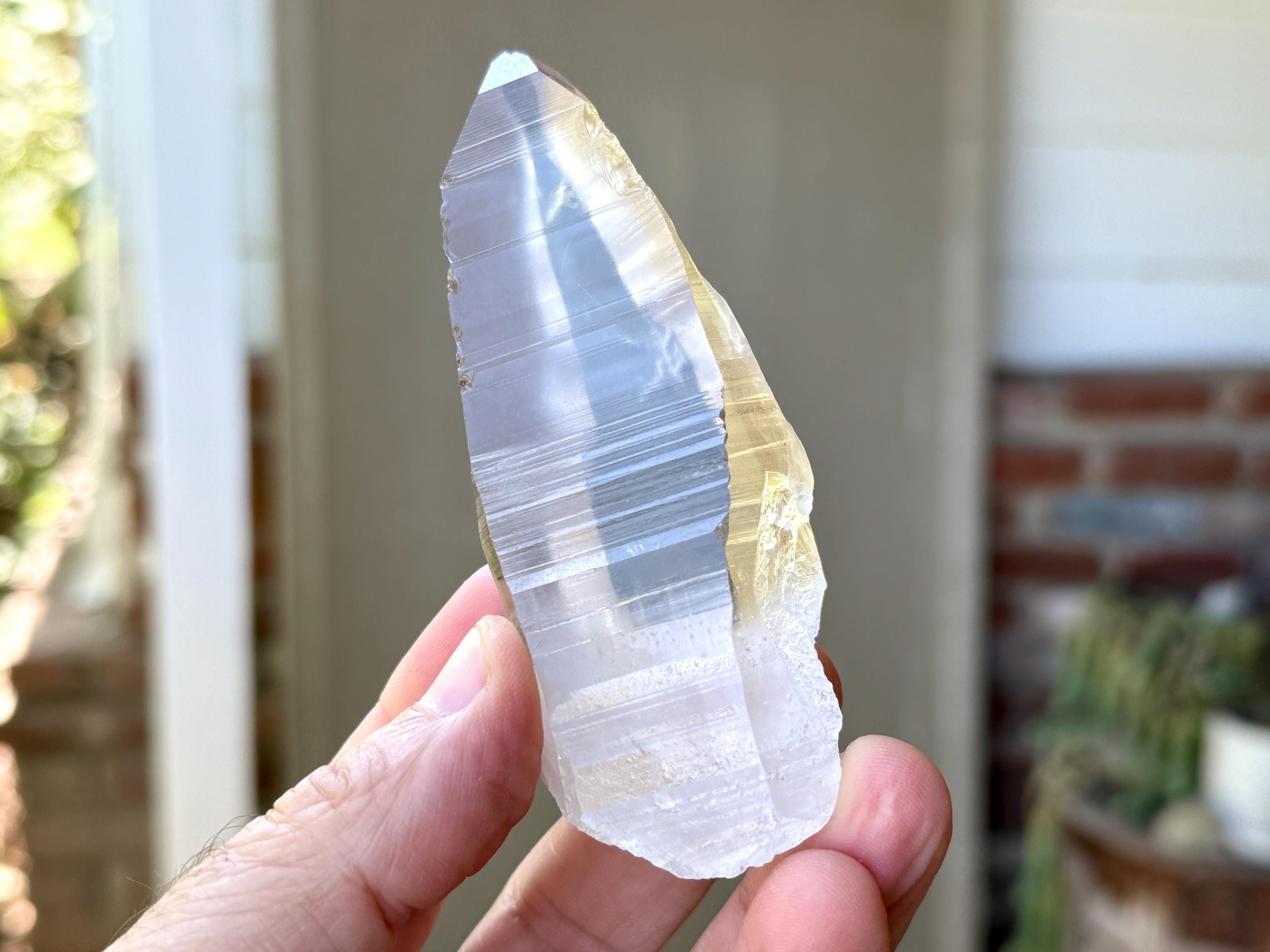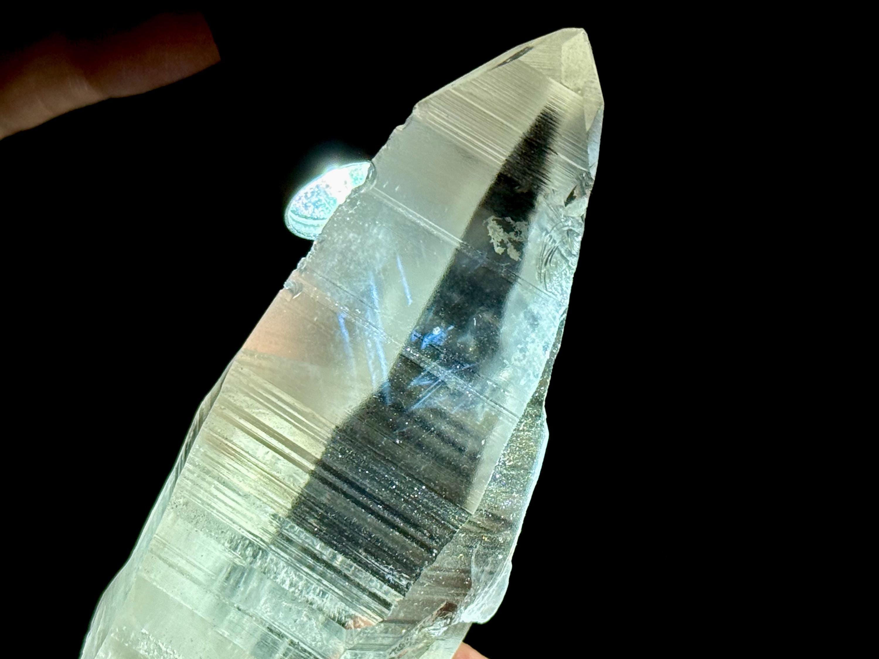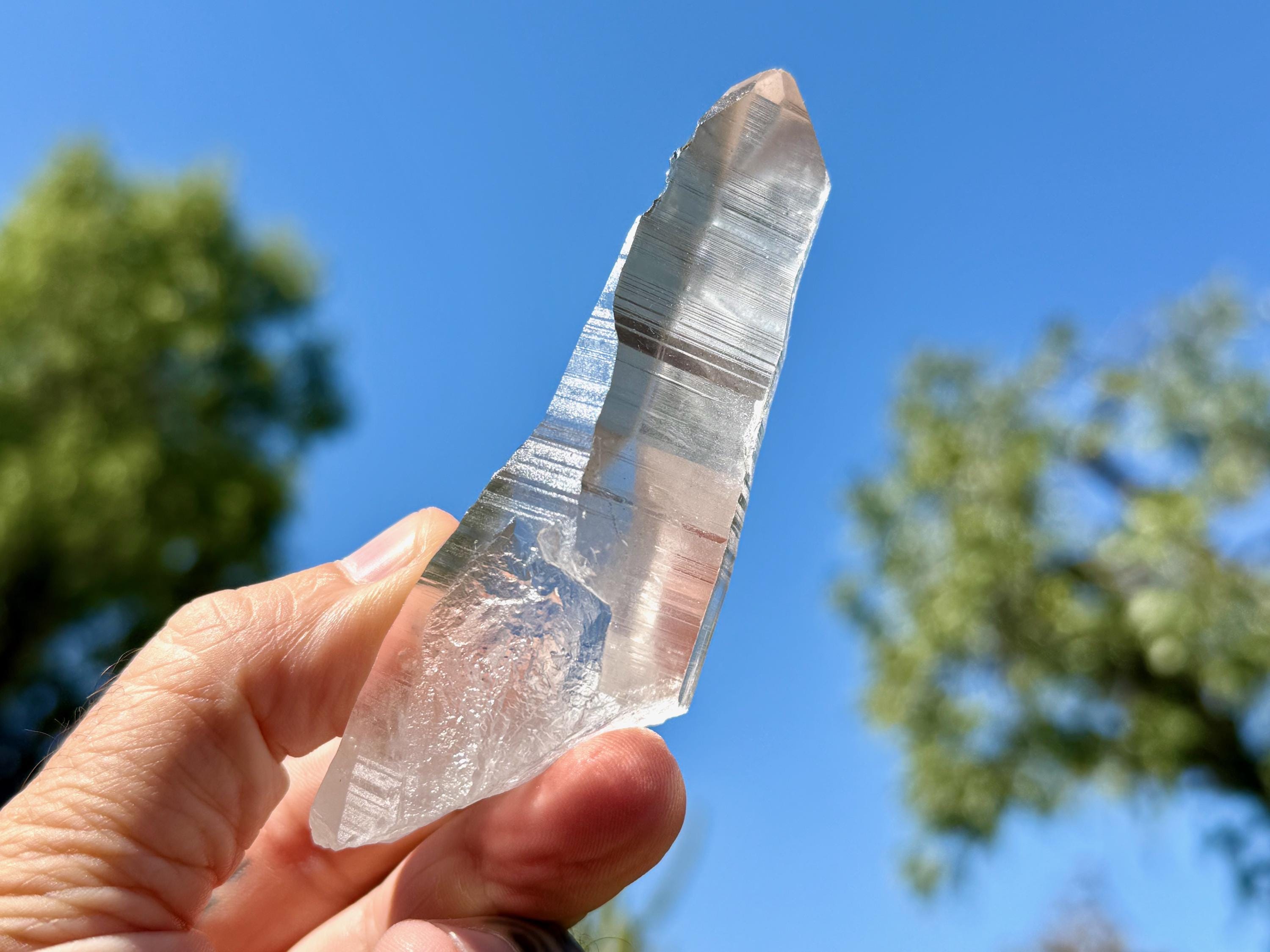 One of the best of the best! Tremendous quality to this Blue Needle Lemurian Quartz with water-clear clarity and brilliant luster. This crystal features a tapered Muzo Habit formation with extremely well-defined striations on its broad sides.
