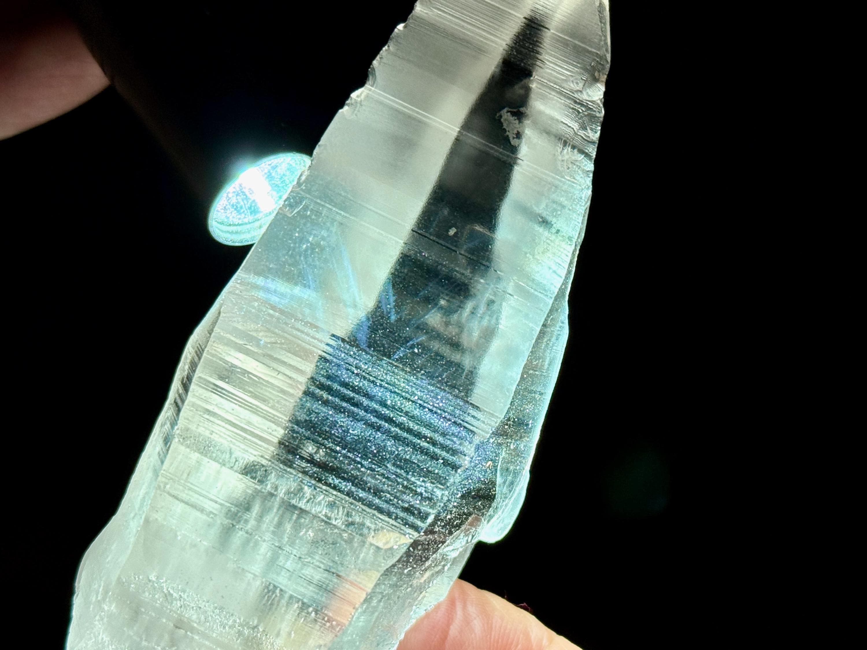 The crystals from this find exhibit a unique phenomenon that causes the appearance of blue needle-like inclusions within. In actuality, these are not physical inclusions, but instead thin tubes of gas suspended within, formed naturally inside the crystal over hundreds of millions of years during the crystal's formation. When light is shone on them from the exact right angle, they glow a ghostly blue color (some say due to the Tyndall Effect).