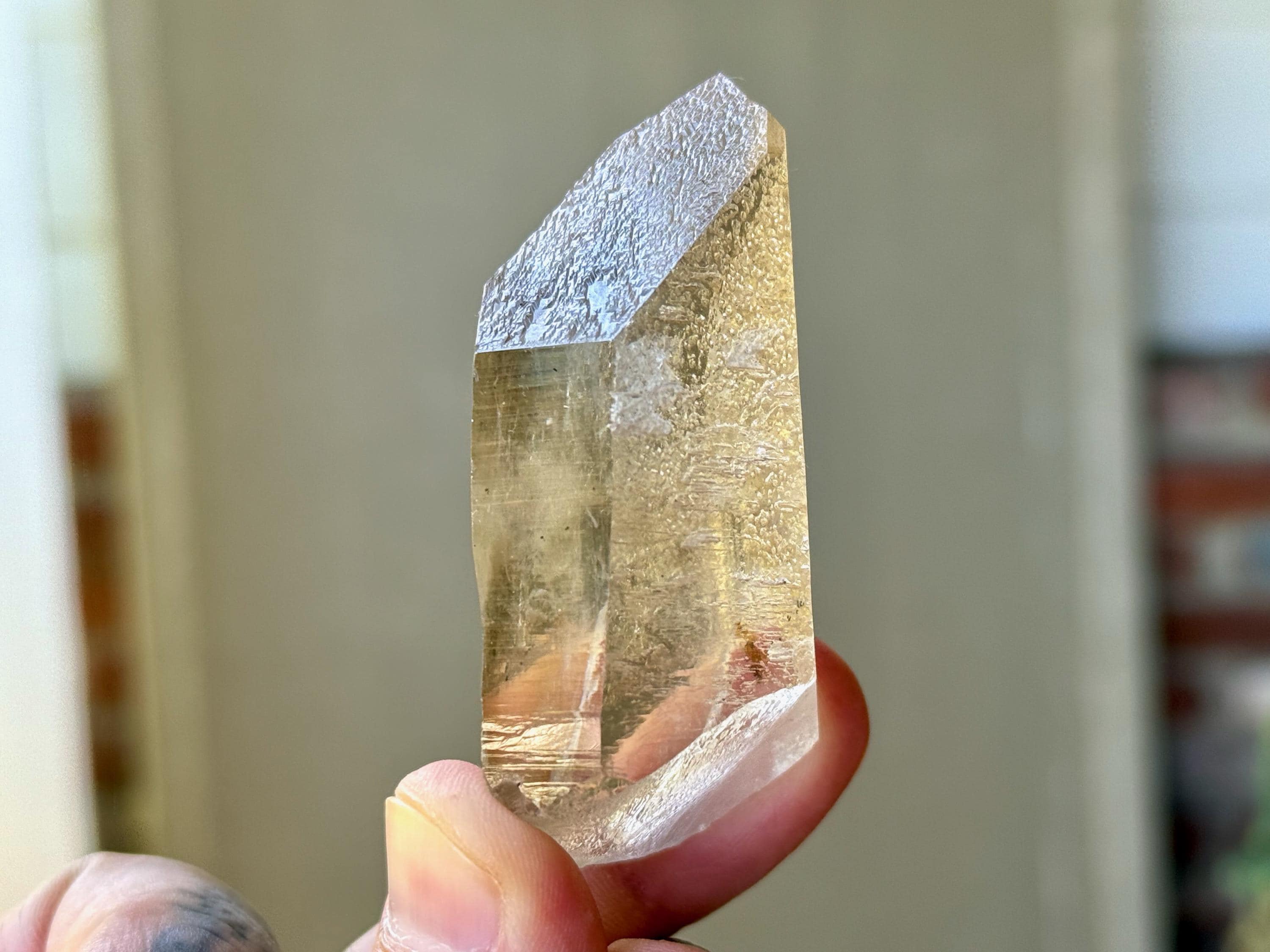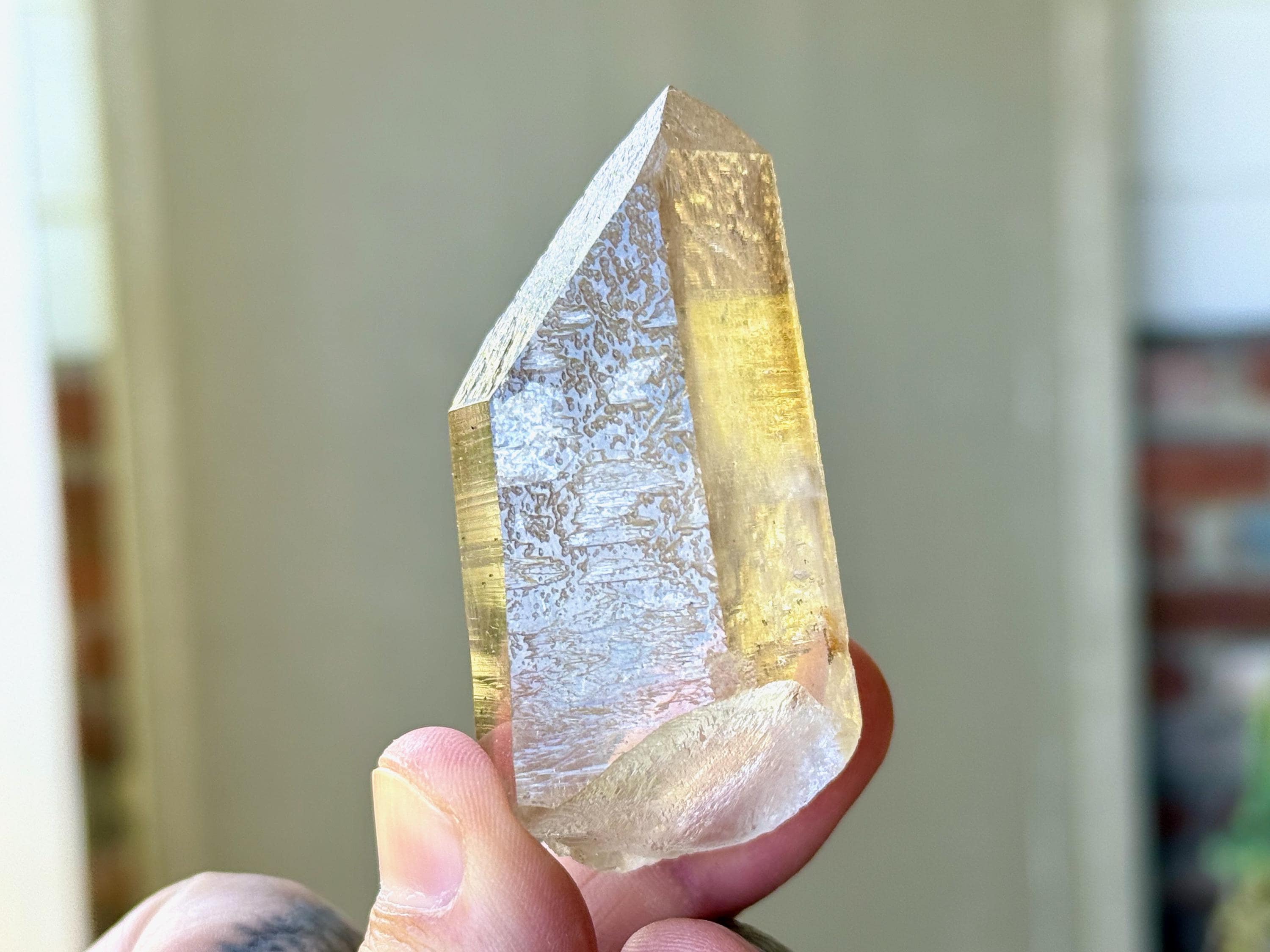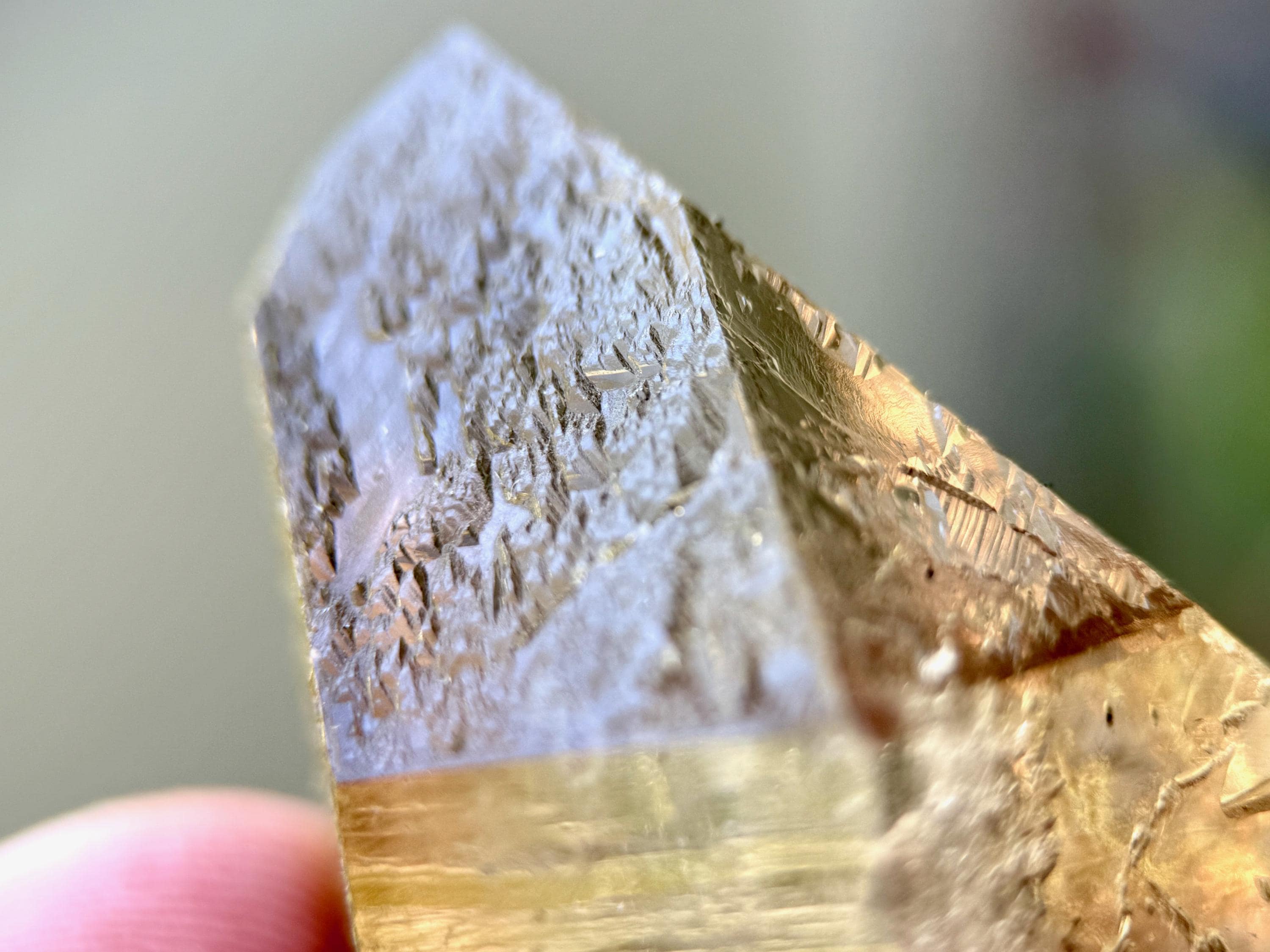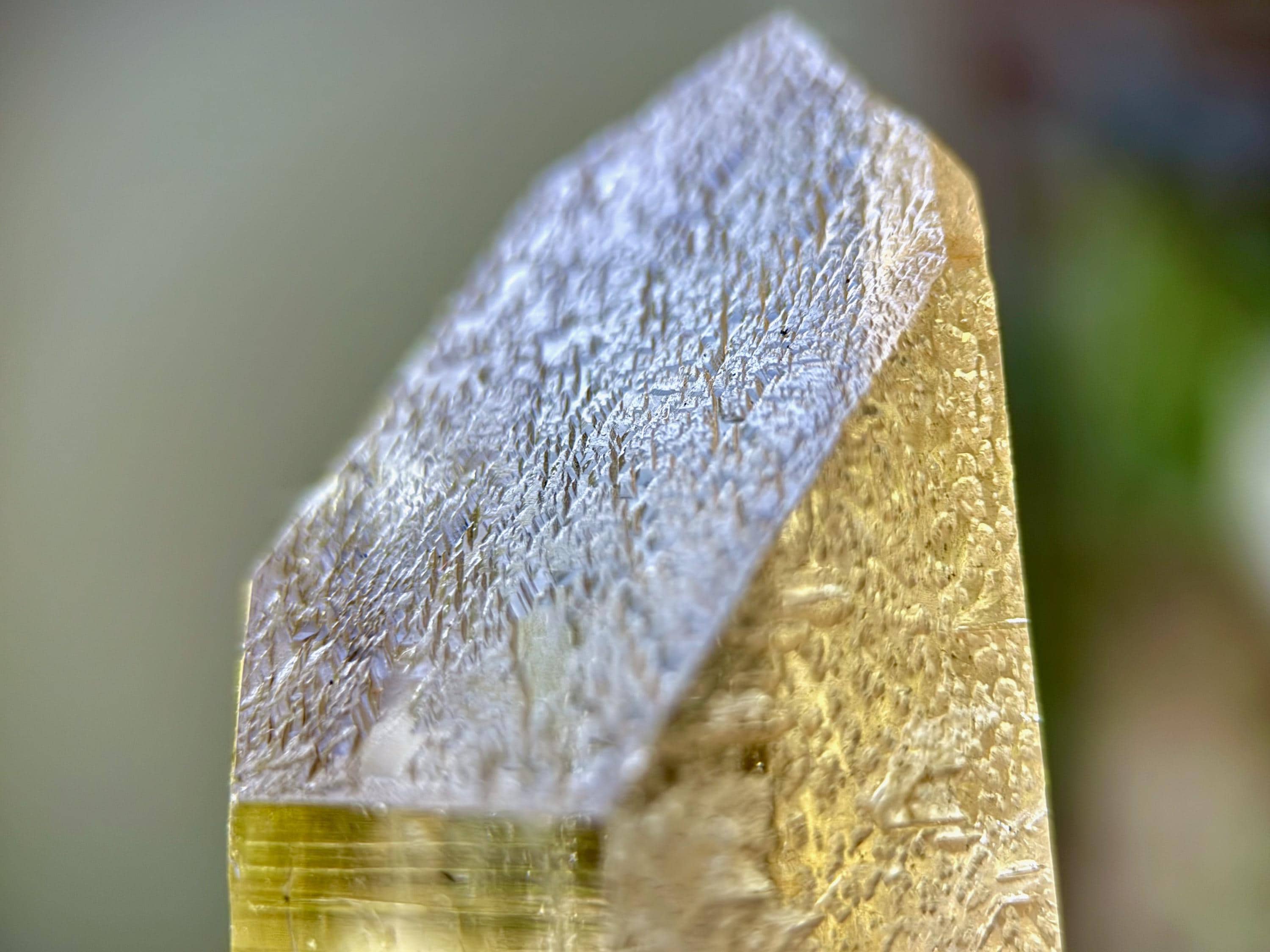Water clear clarity and a mild golden hue to this lustrous Golden Healer Starbrary Quartz crystal. This piece exhibits an array of etched impressions on the main facet and beautiful Starbrary markings on its sides. The main facet is 7-sided, opposing a 3-sided facet making this a Channeling formation (more on this below). The termination is excellent. Outstanding quality!