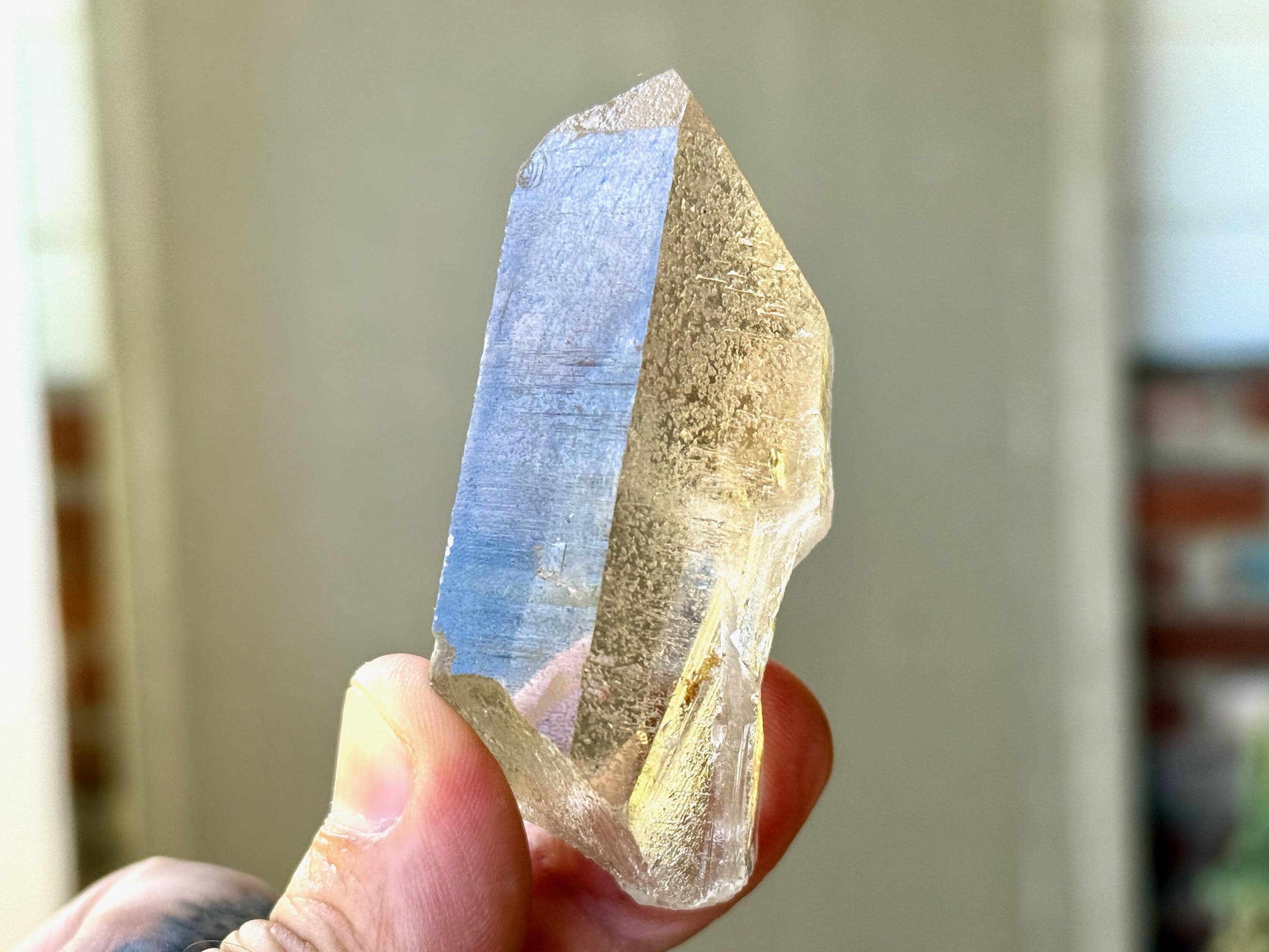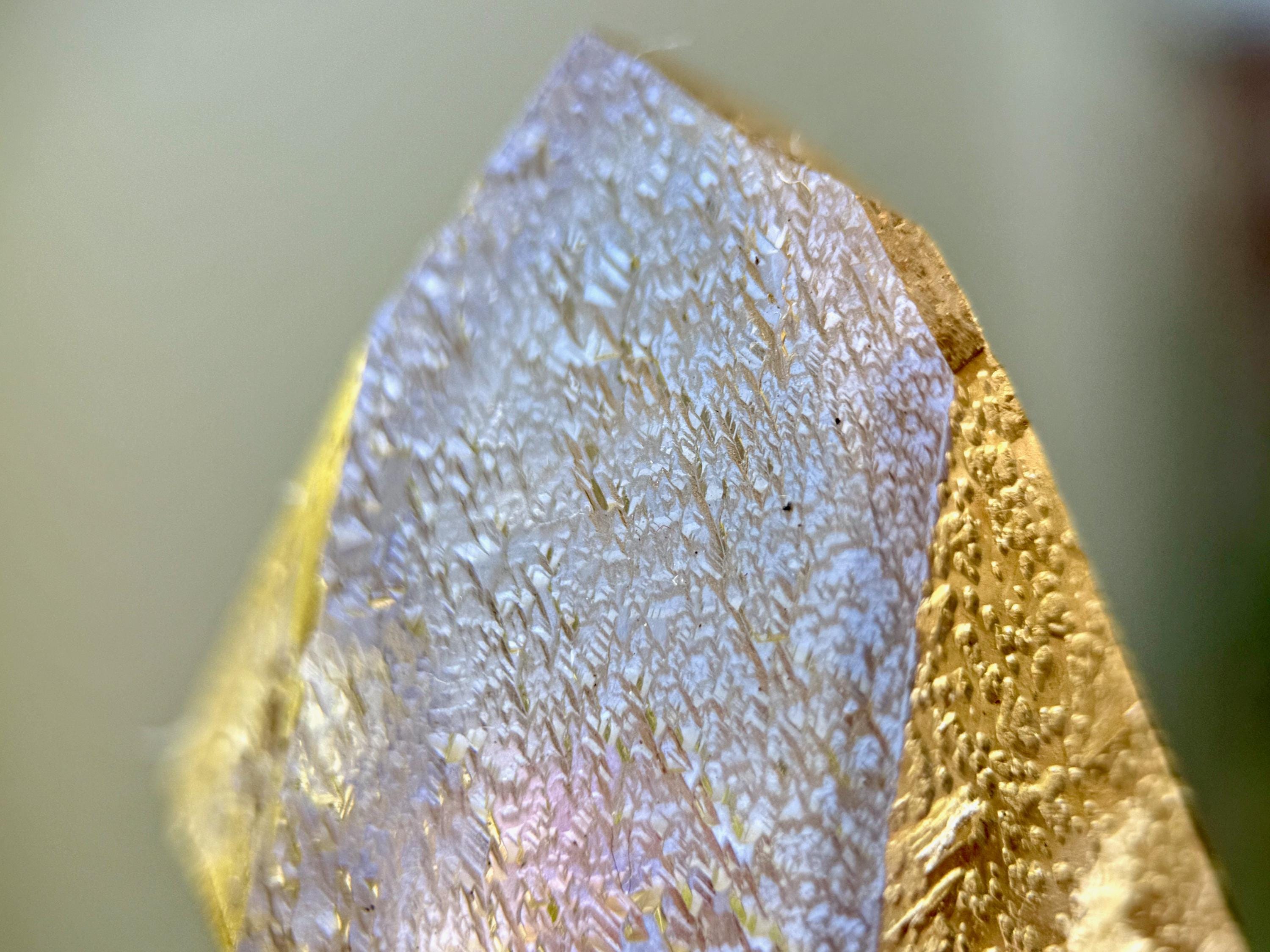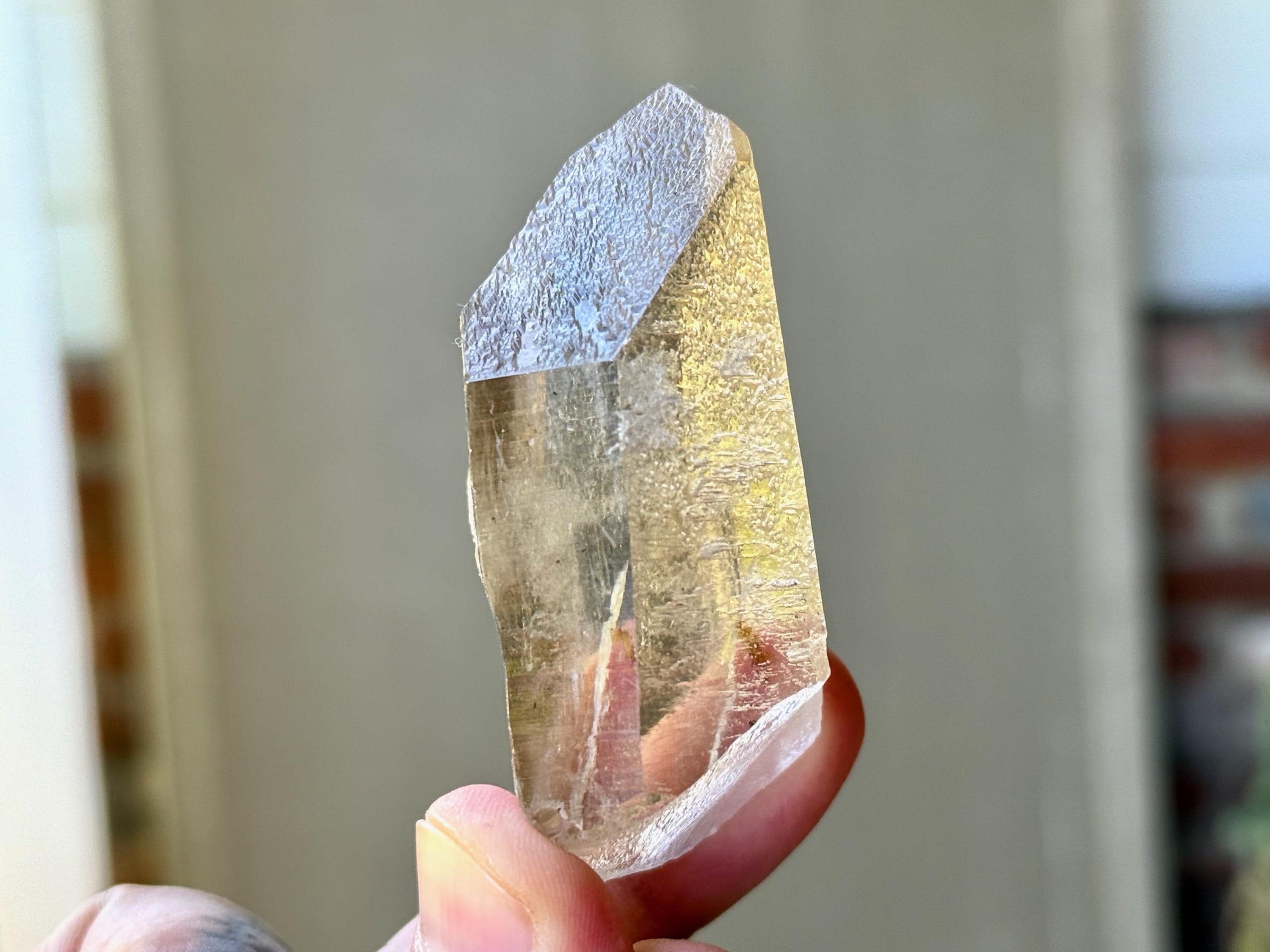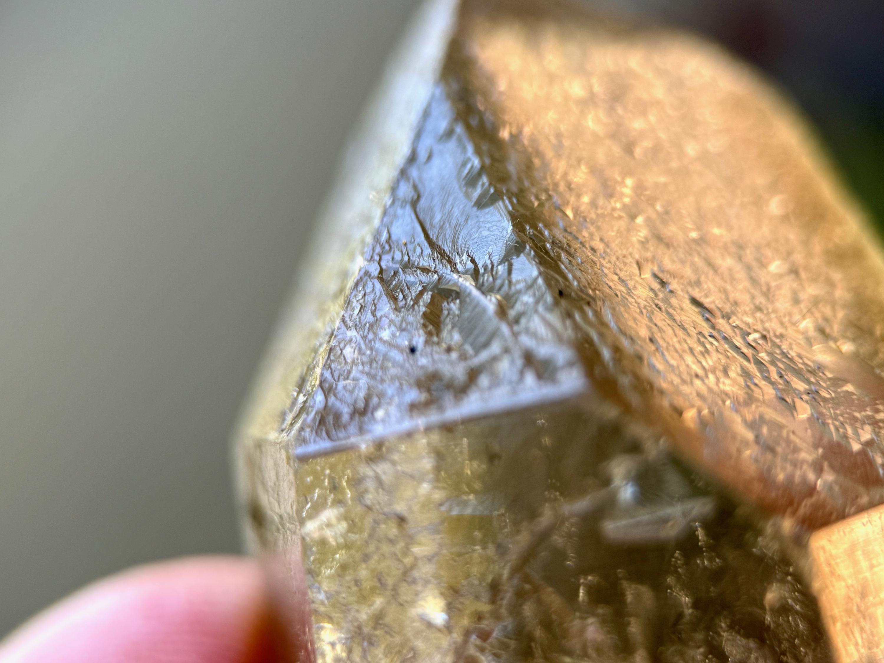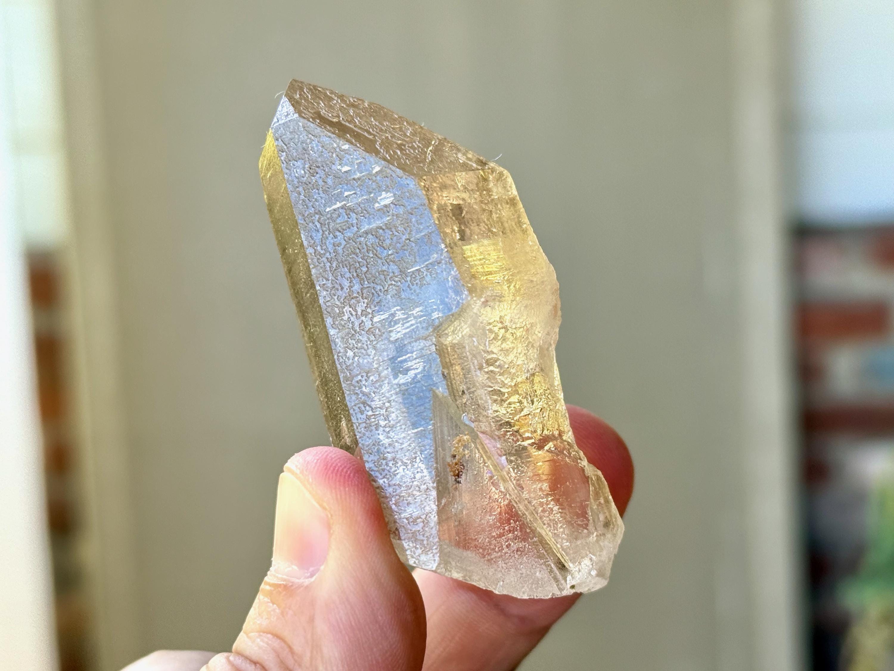 Water clear clarity and a mild golden hue to this lustrous Golden Healer Starbrary Quartz crystal. This piece exhibits an array of etched impressions on the main facet and beautiful Starbrary markings on its sides. The main facet is 7-sided, opposing a 3-sided facet making this a Channeling formation (more on this below). The termination is excellent. Outstanding quality!