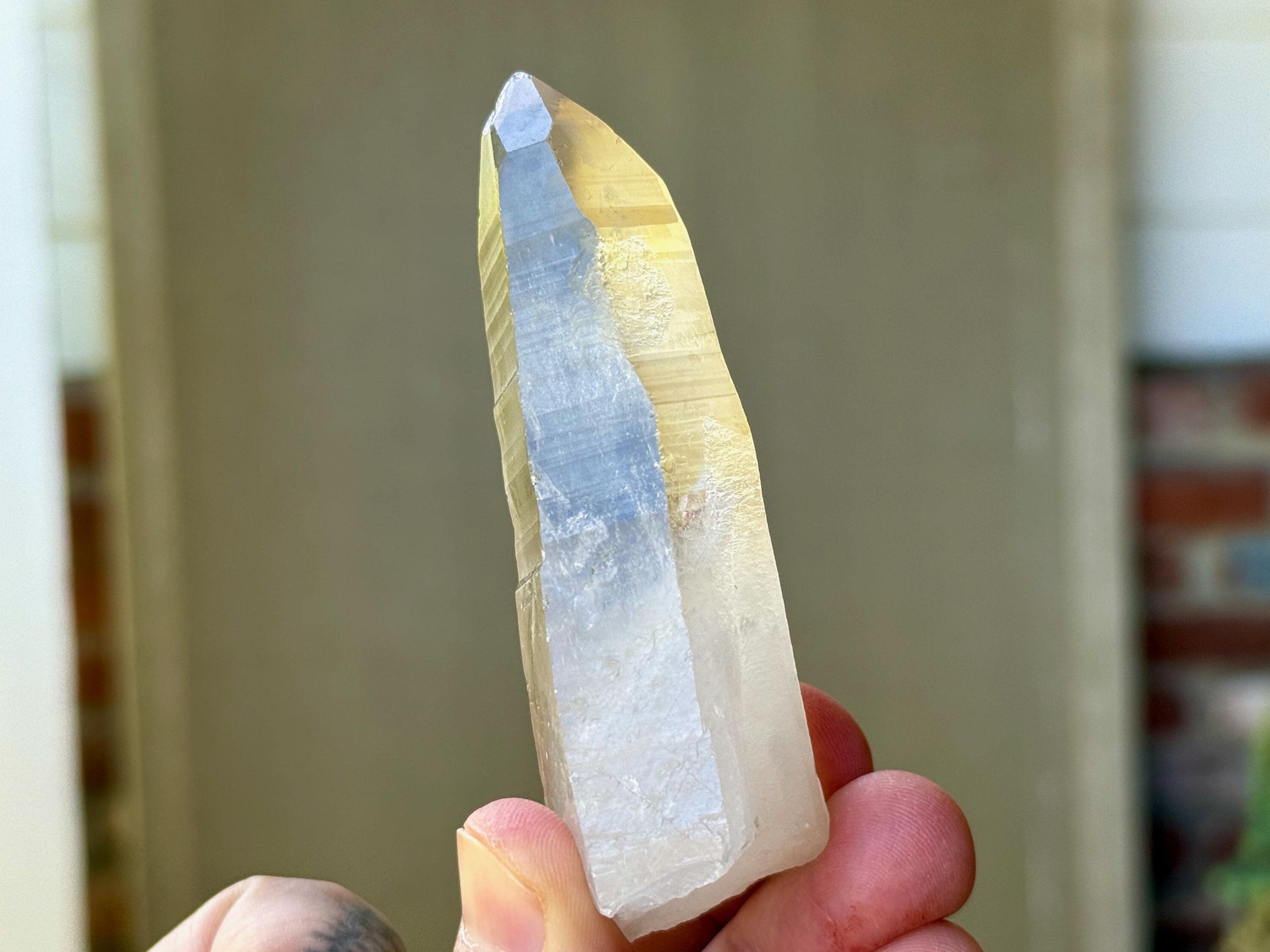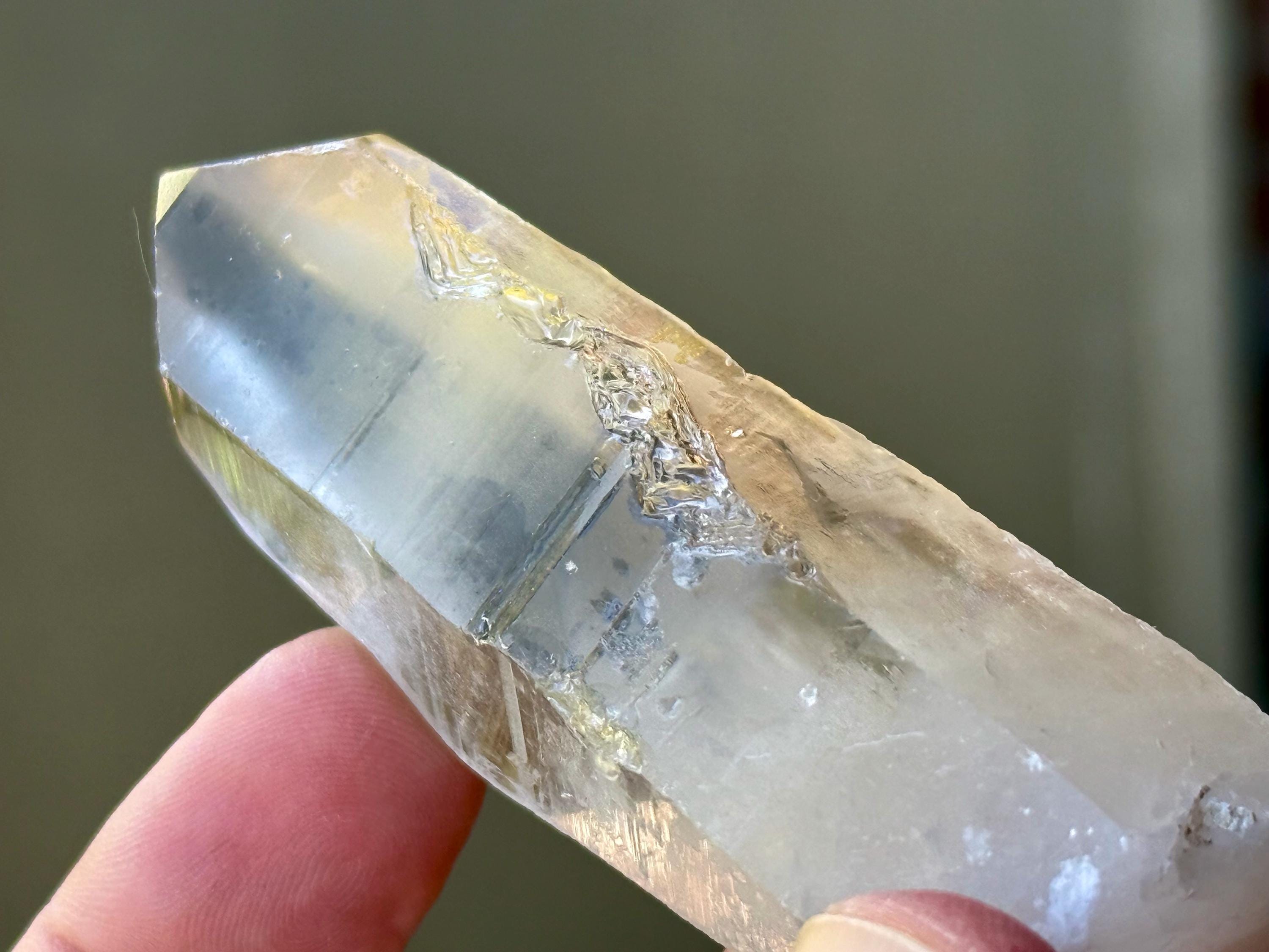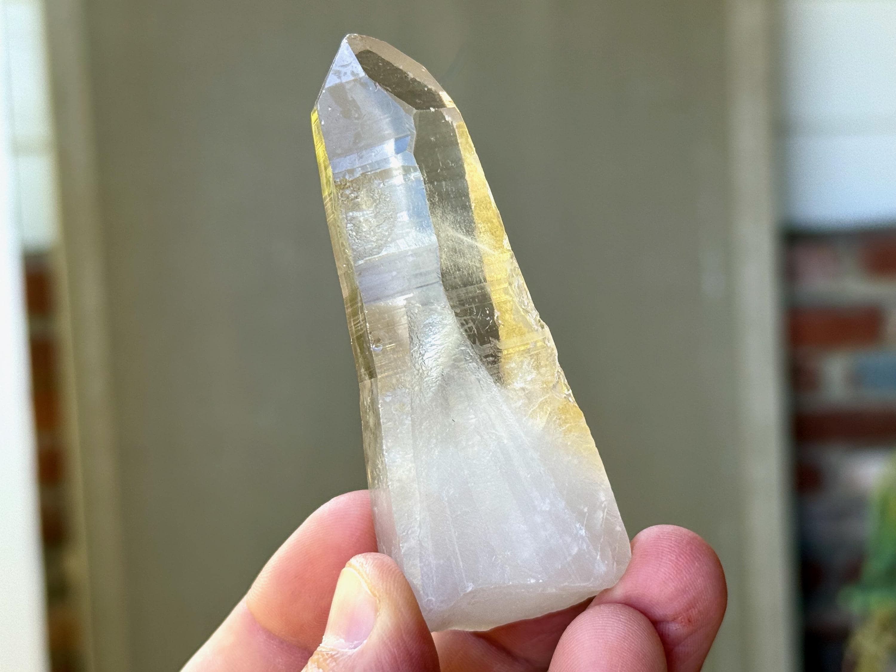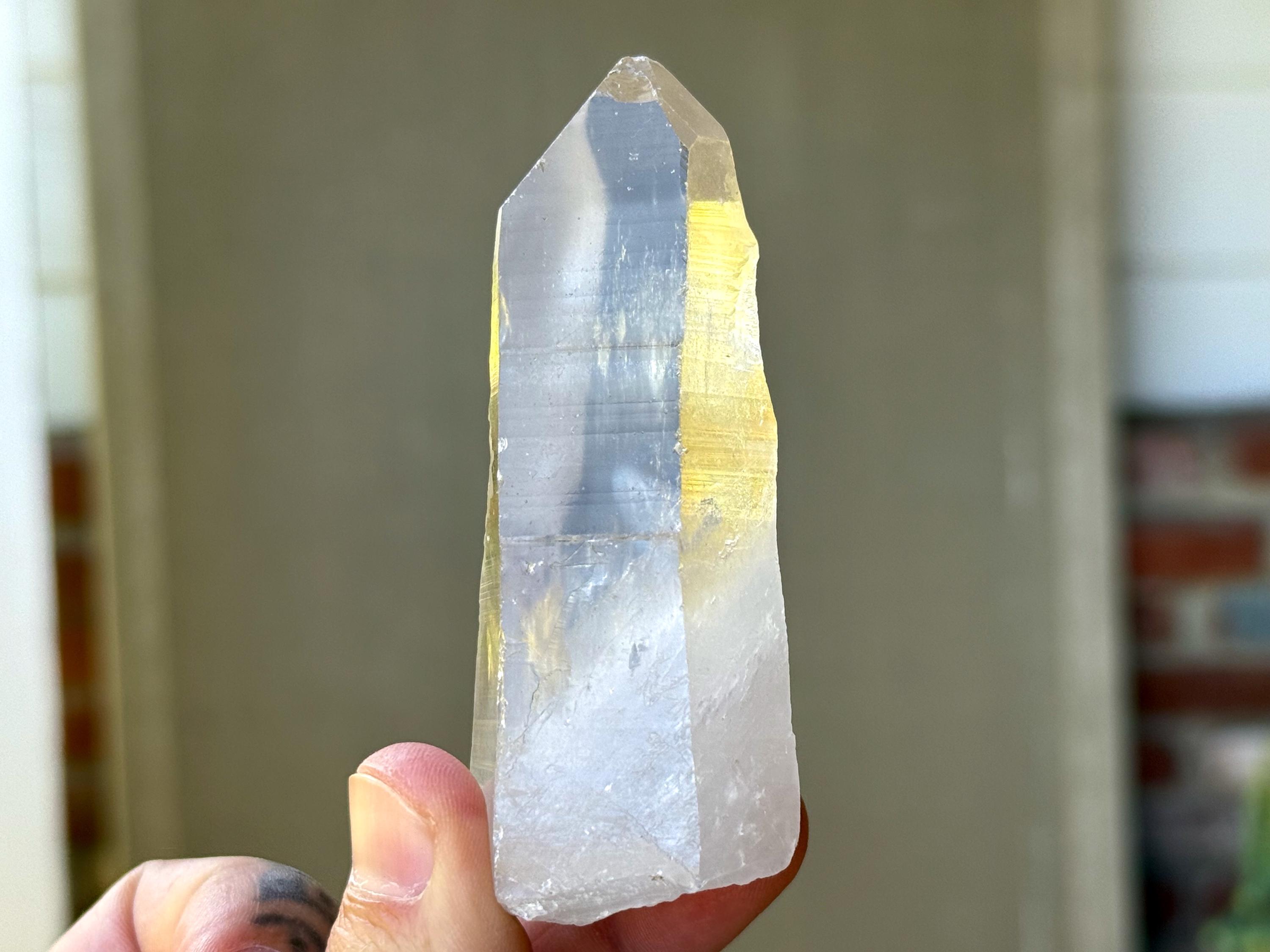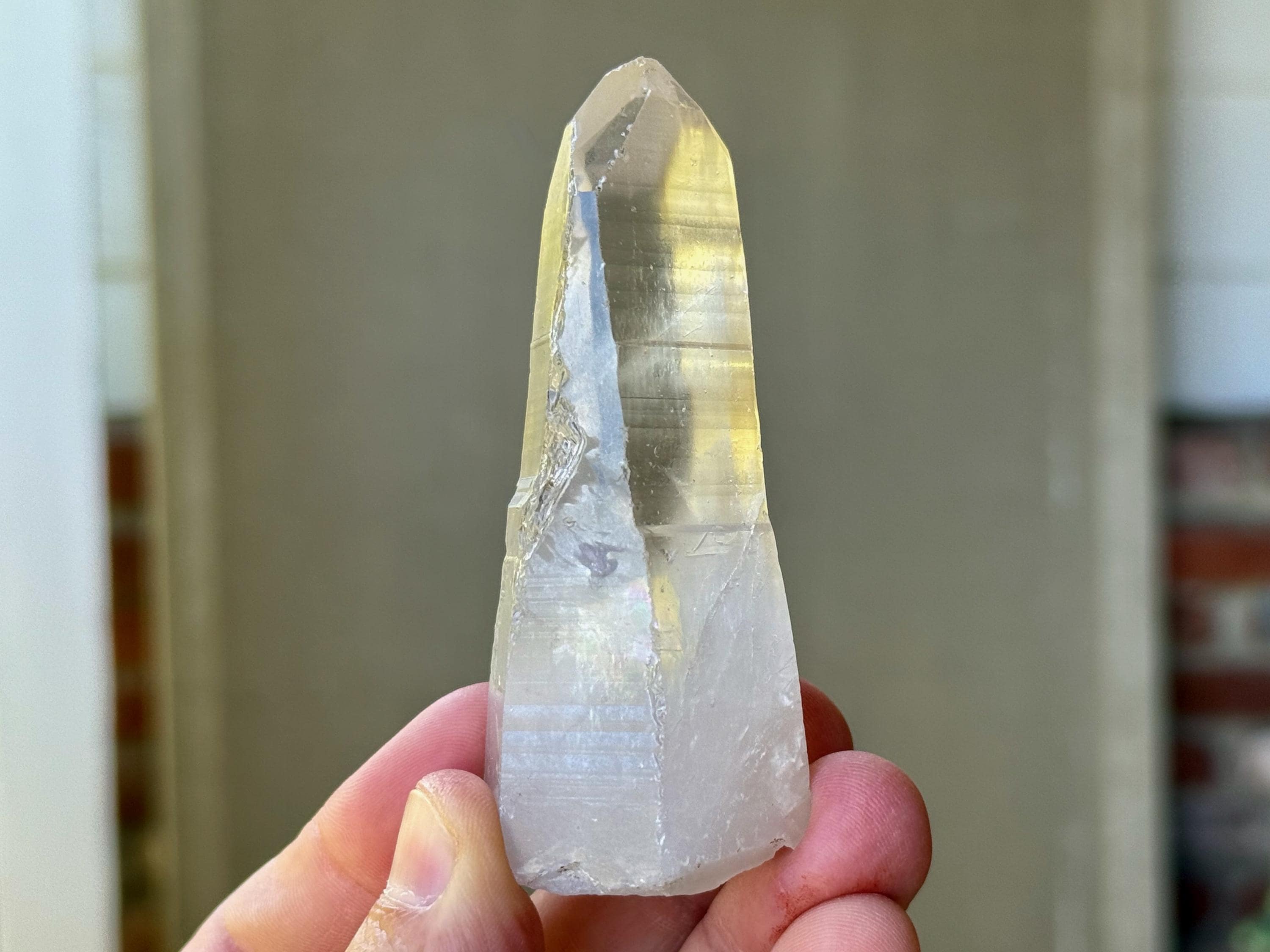 Magnificent clarity and superb luster to this exquisite Lightning Strike Lemurian Citrine with a mild golden hue. This crystal displays a classic formation with well-defined striations on its sides.