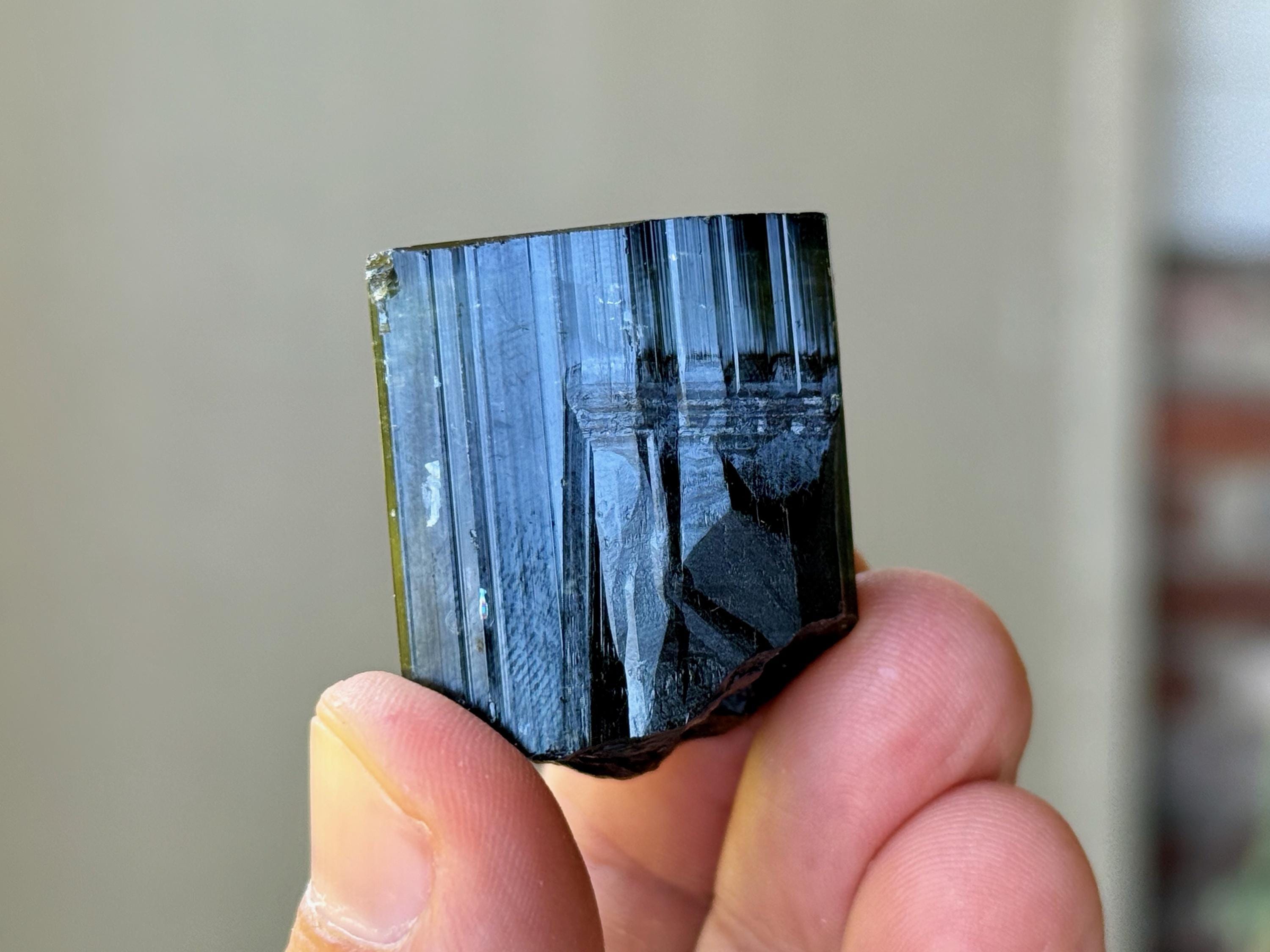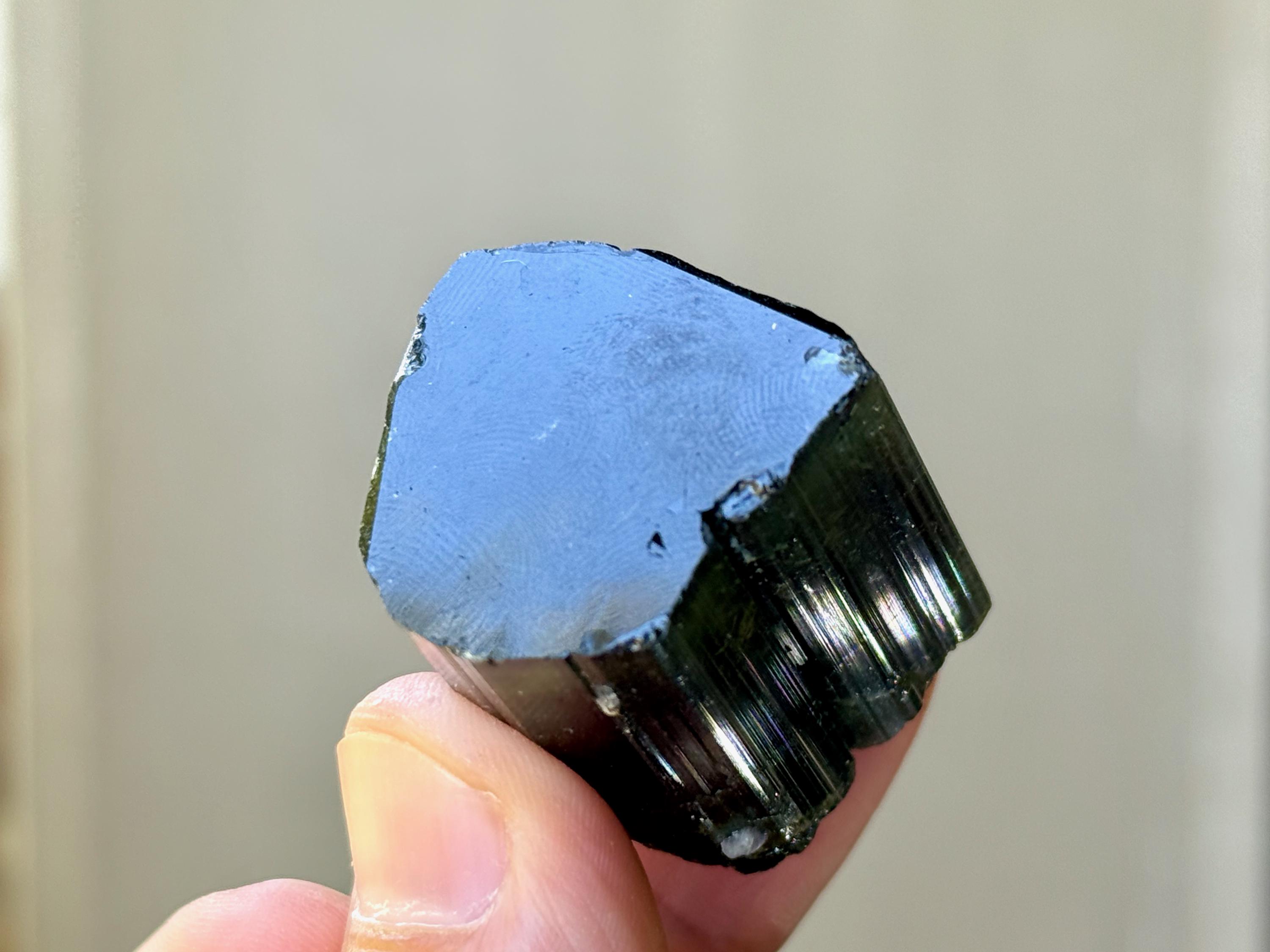 In natural light, this crystal displays a dark and lustrous complexion that appears almost black. However, even in natural light, at certain angles you can make out some hints of color in the upper portion (Photo 3).