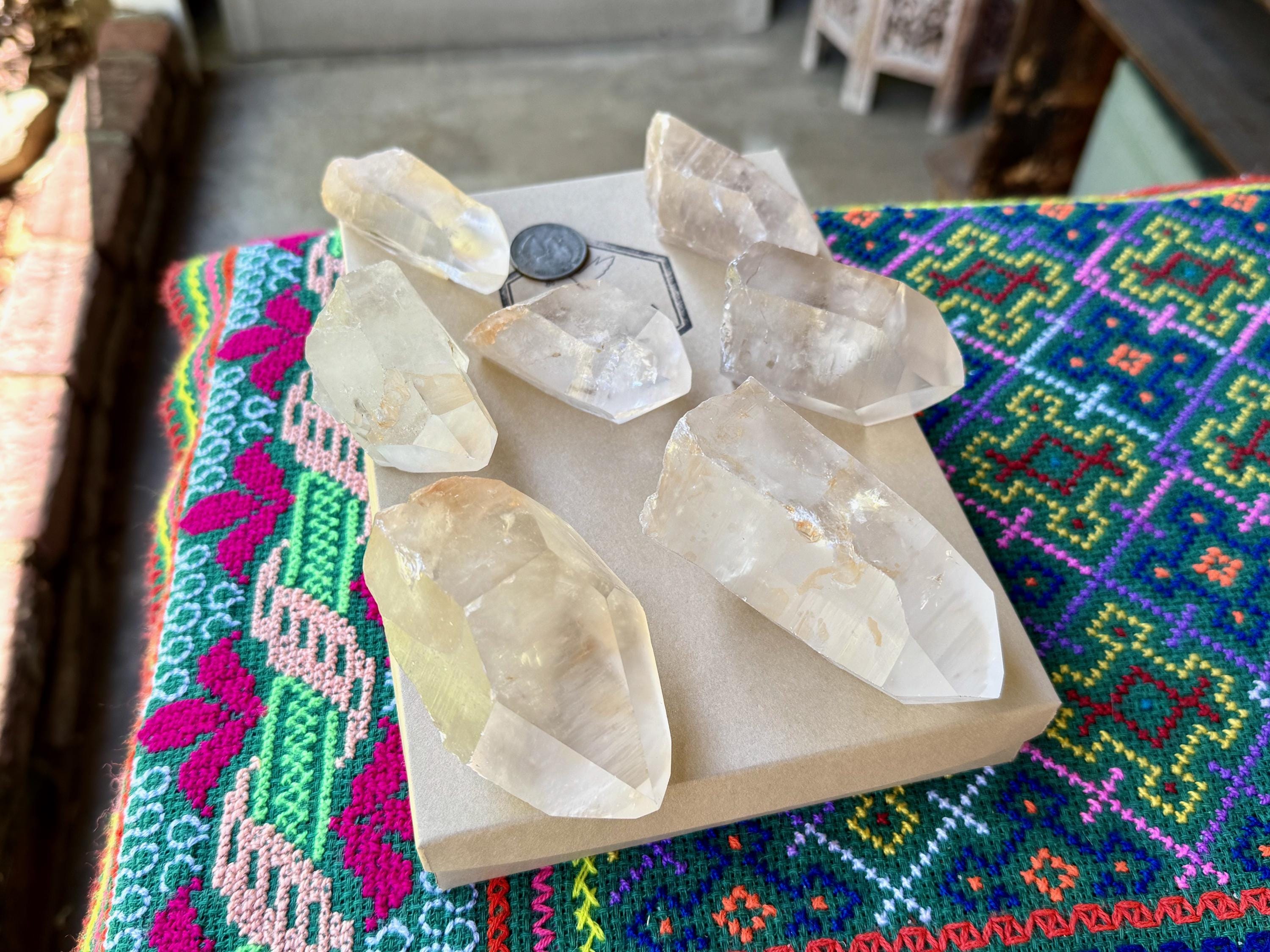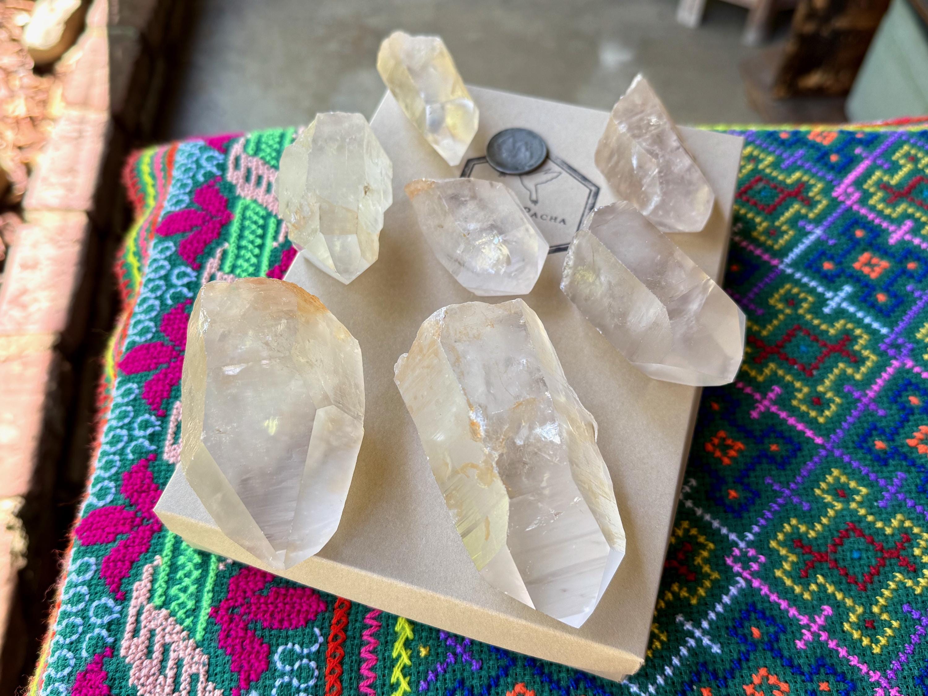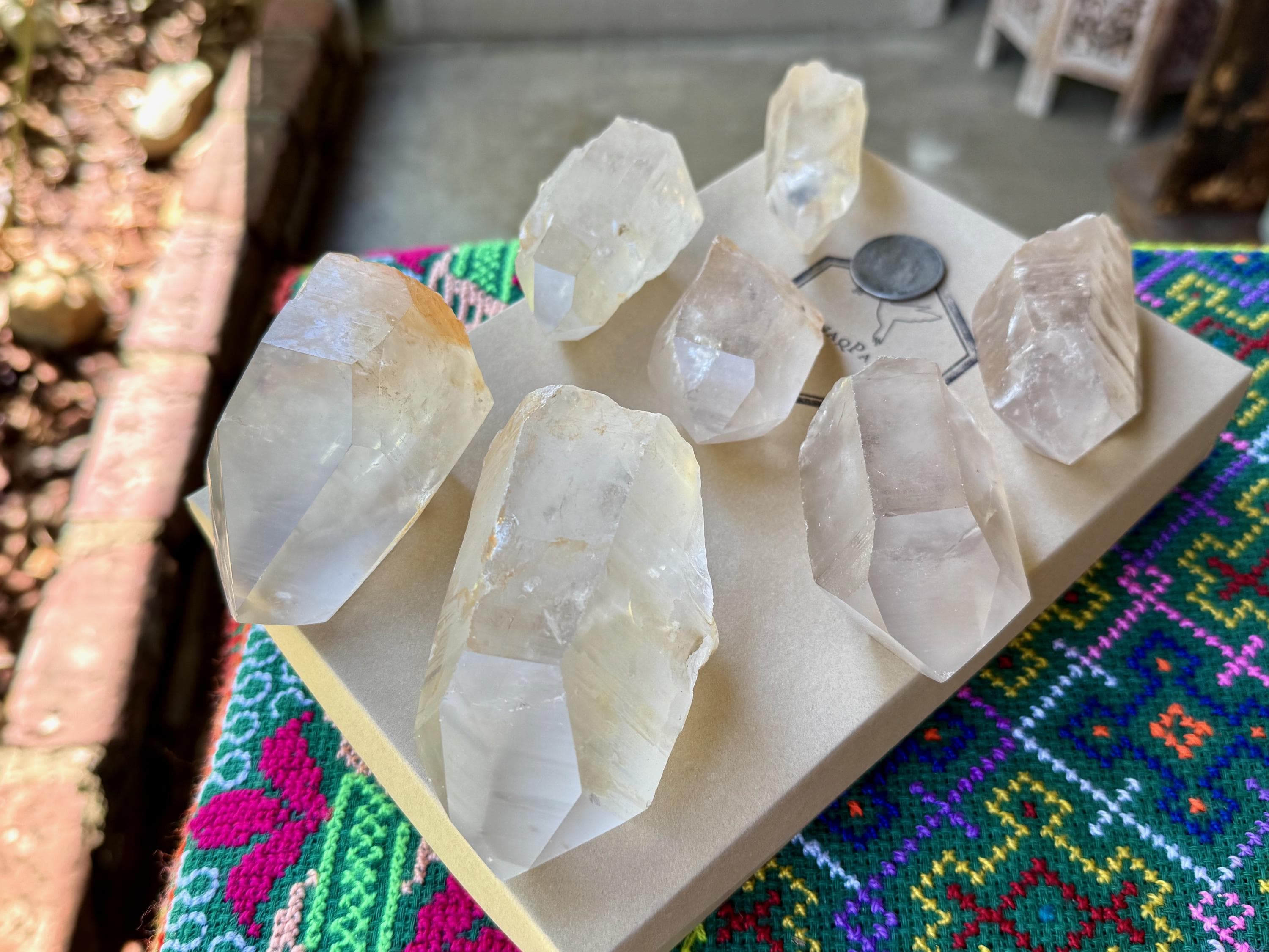 Most of these crystals have very nice clarity and many (though not all) have well-defined Lemurian striations on their sides.