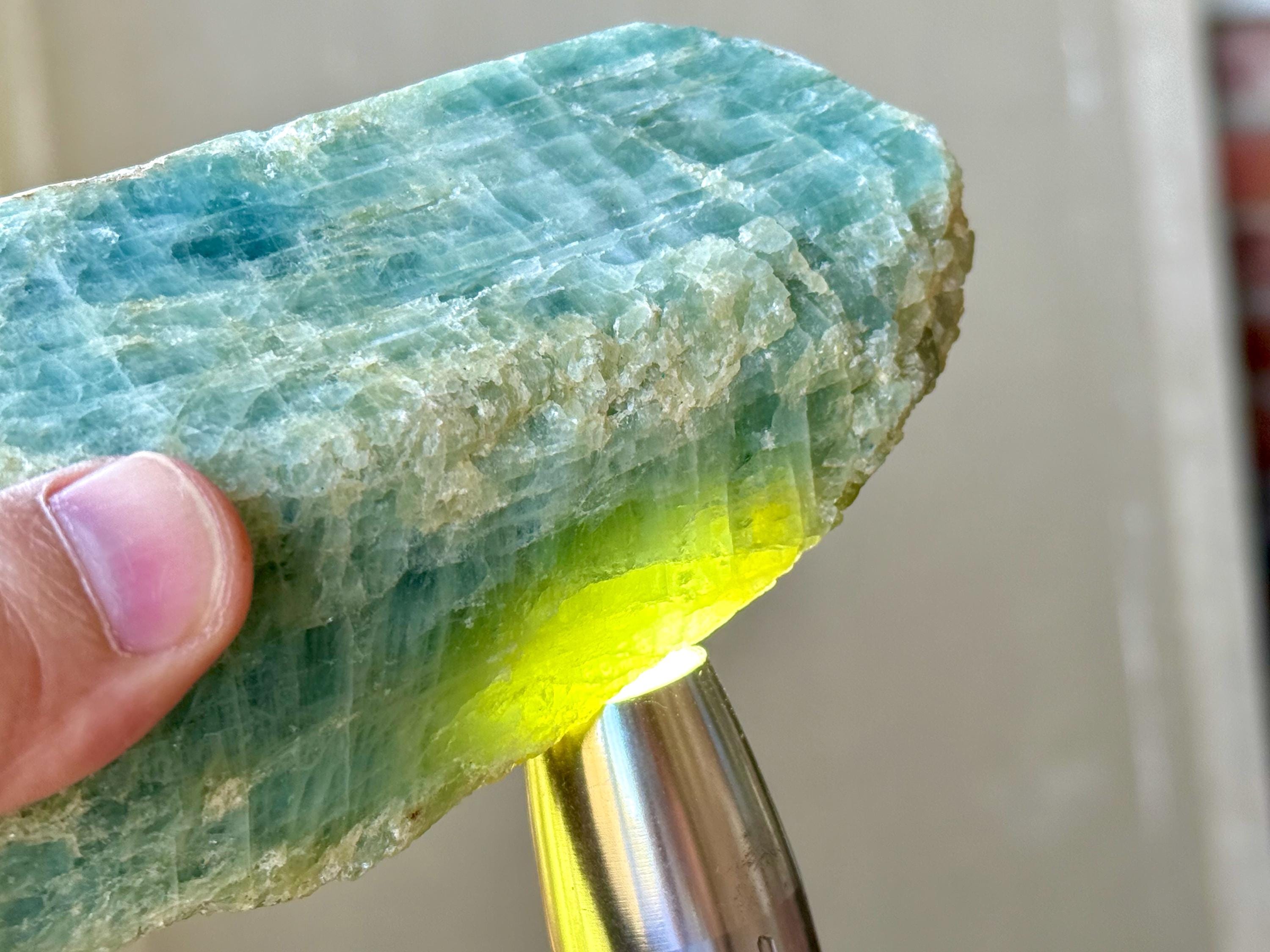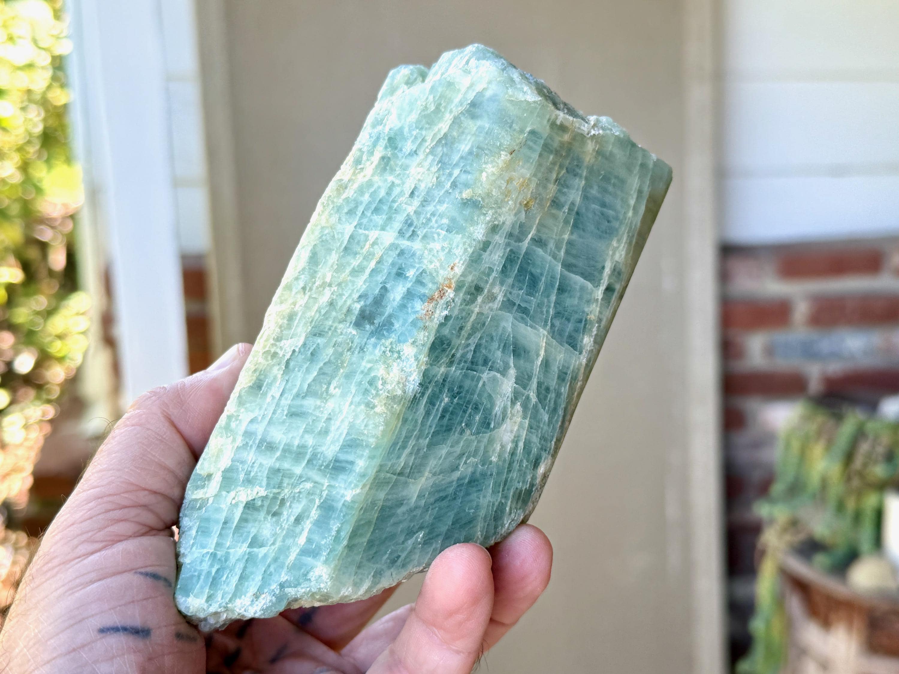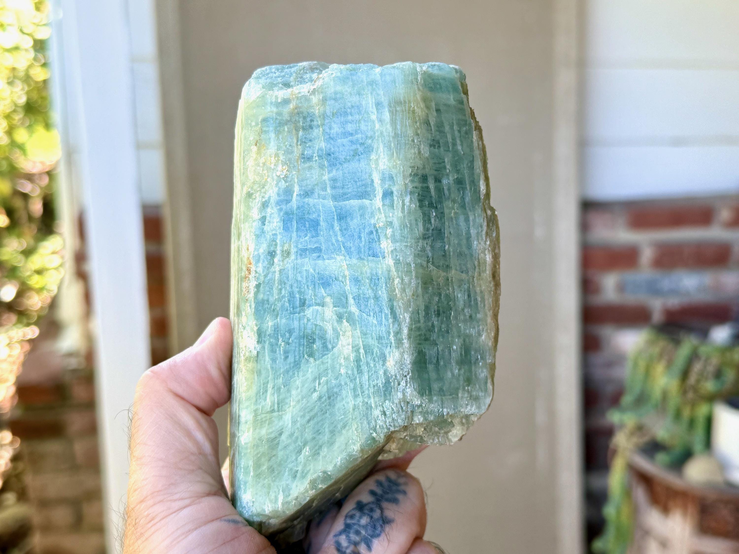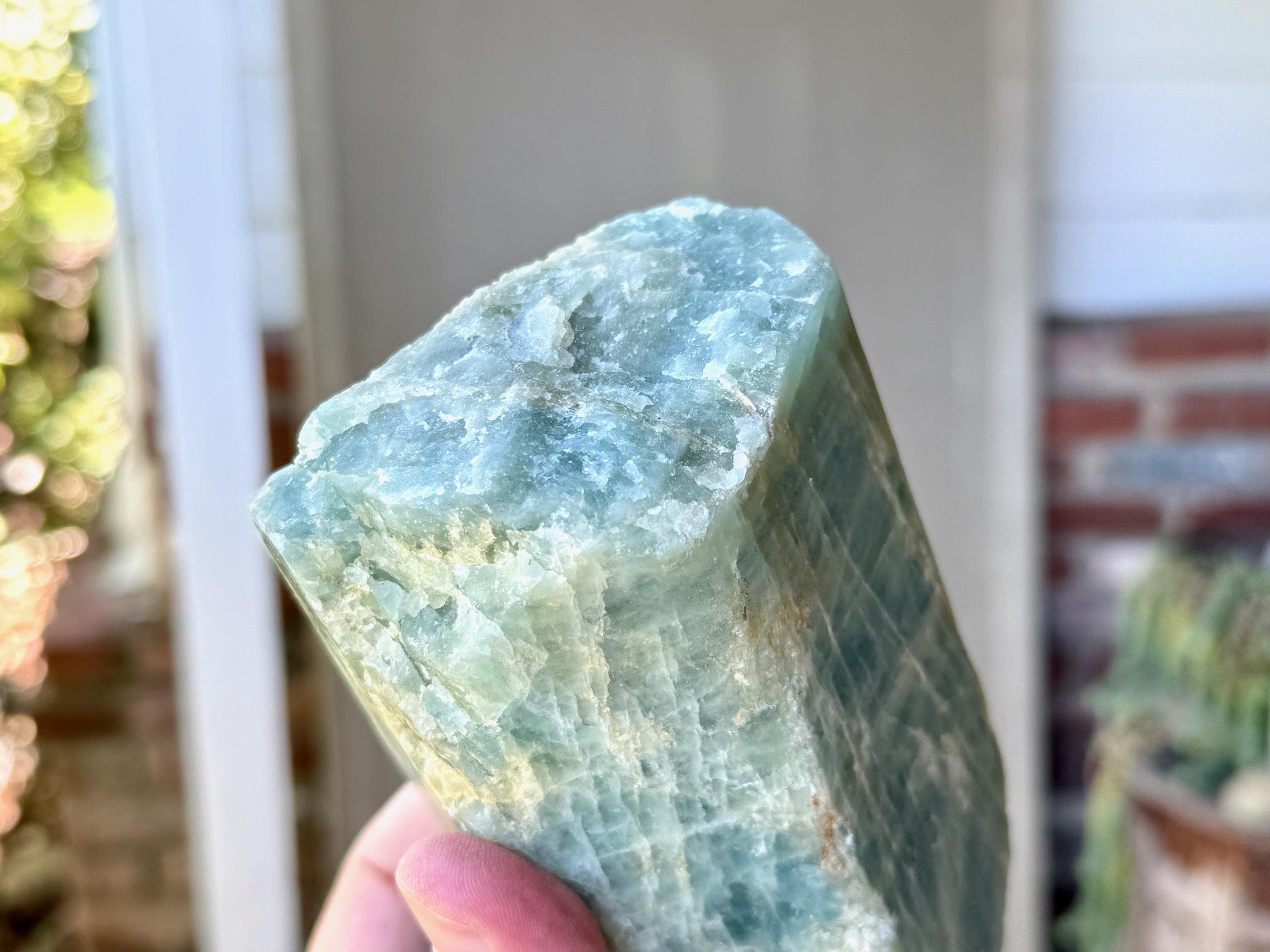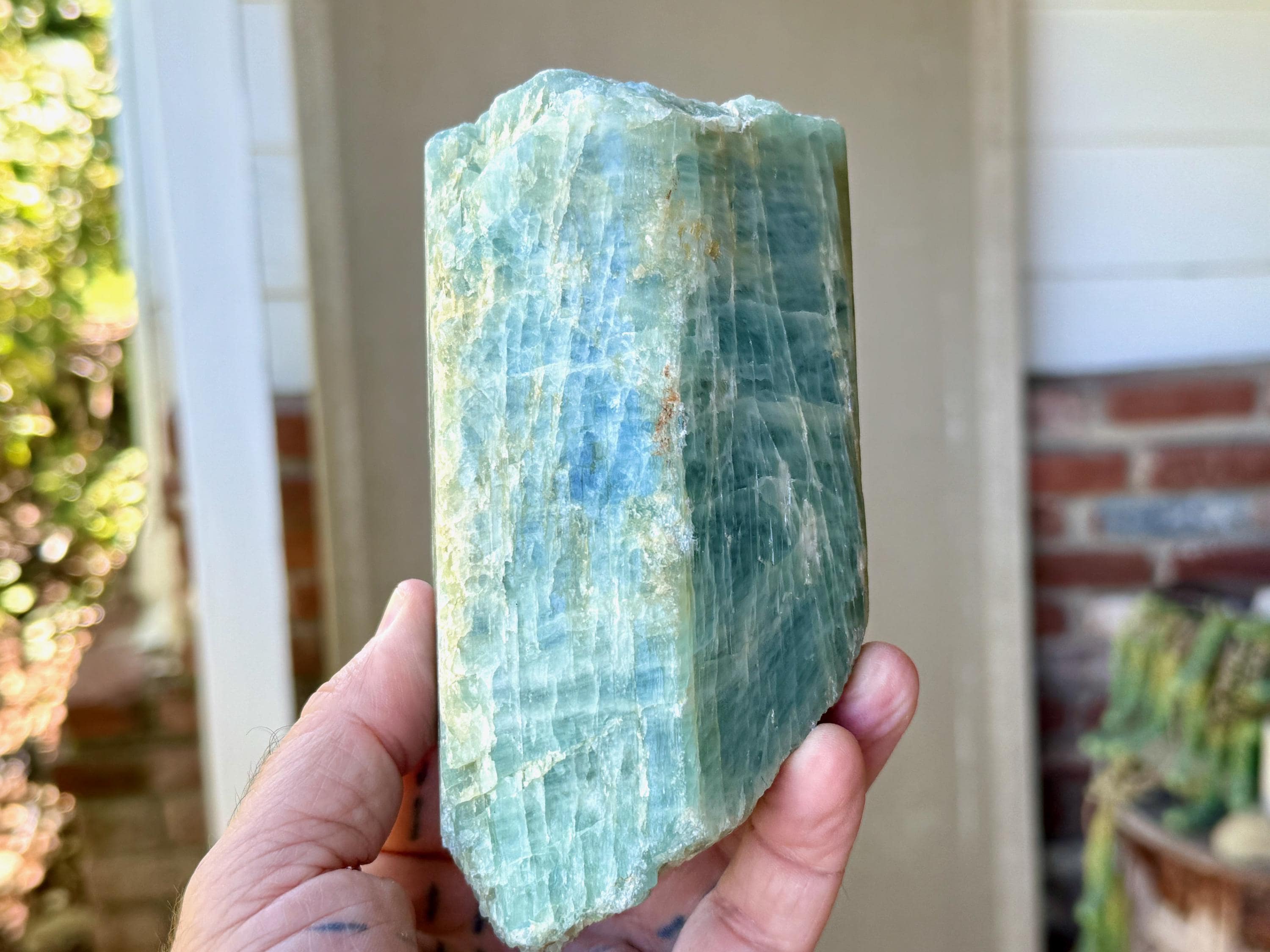 Gorgeous, oceanic hues to this very beautiful Aquamarine! This is a large, elongated crystal with a partial, natural hexagonal formation. It is terminated mostly all around, though one of the long sides shows where it separated from the other half and began to heal over the course of millions of years (Photo 7).