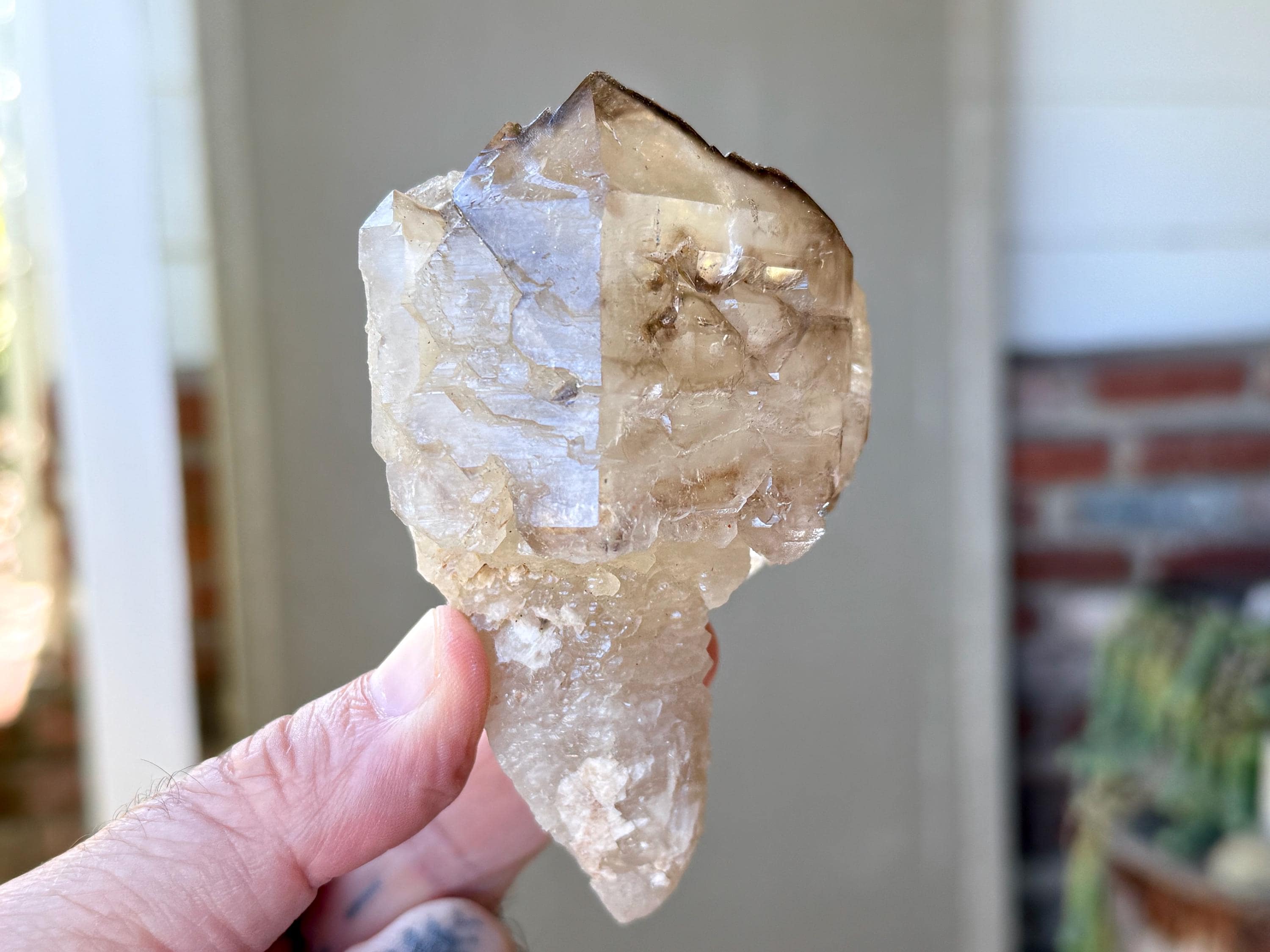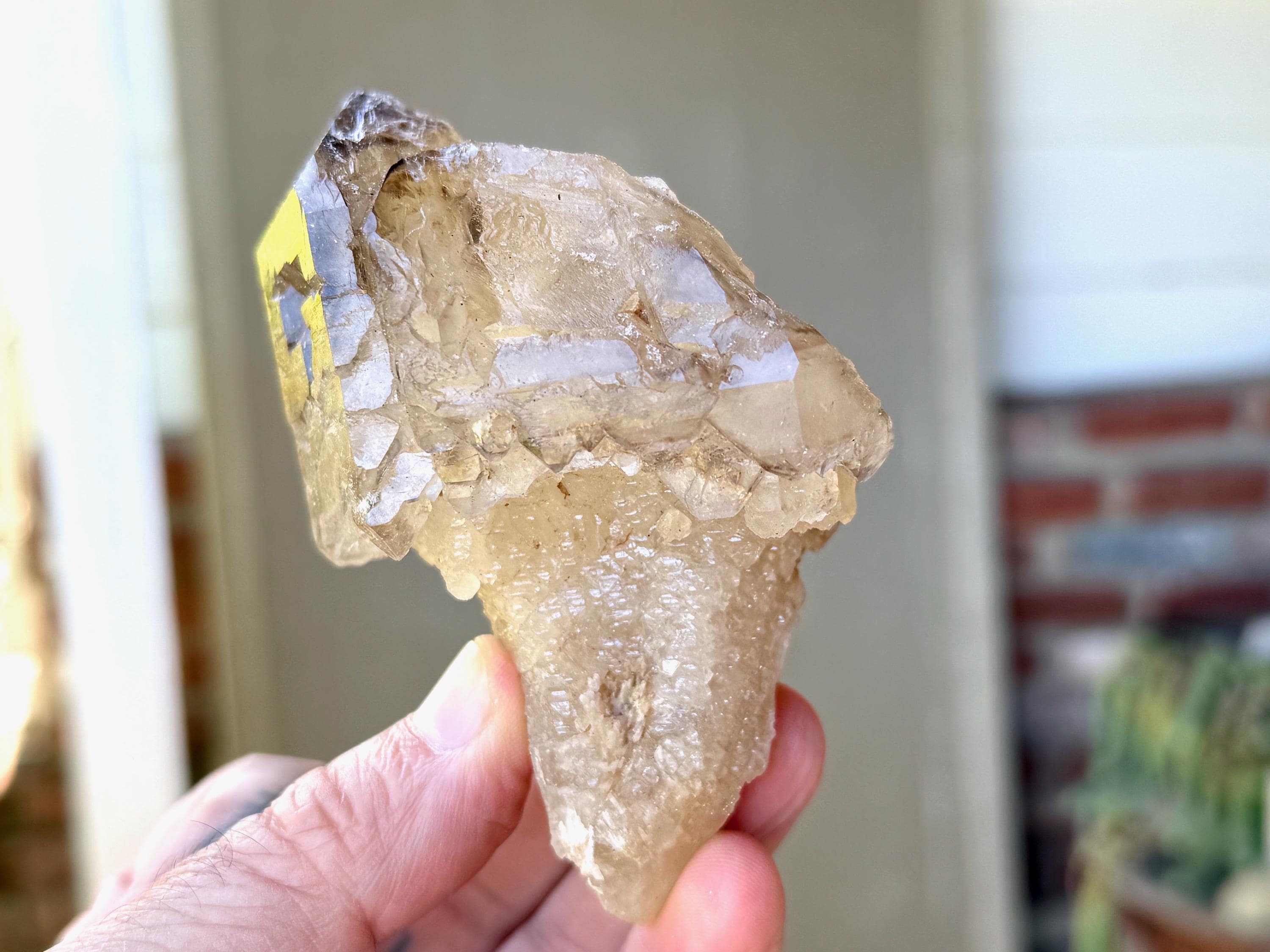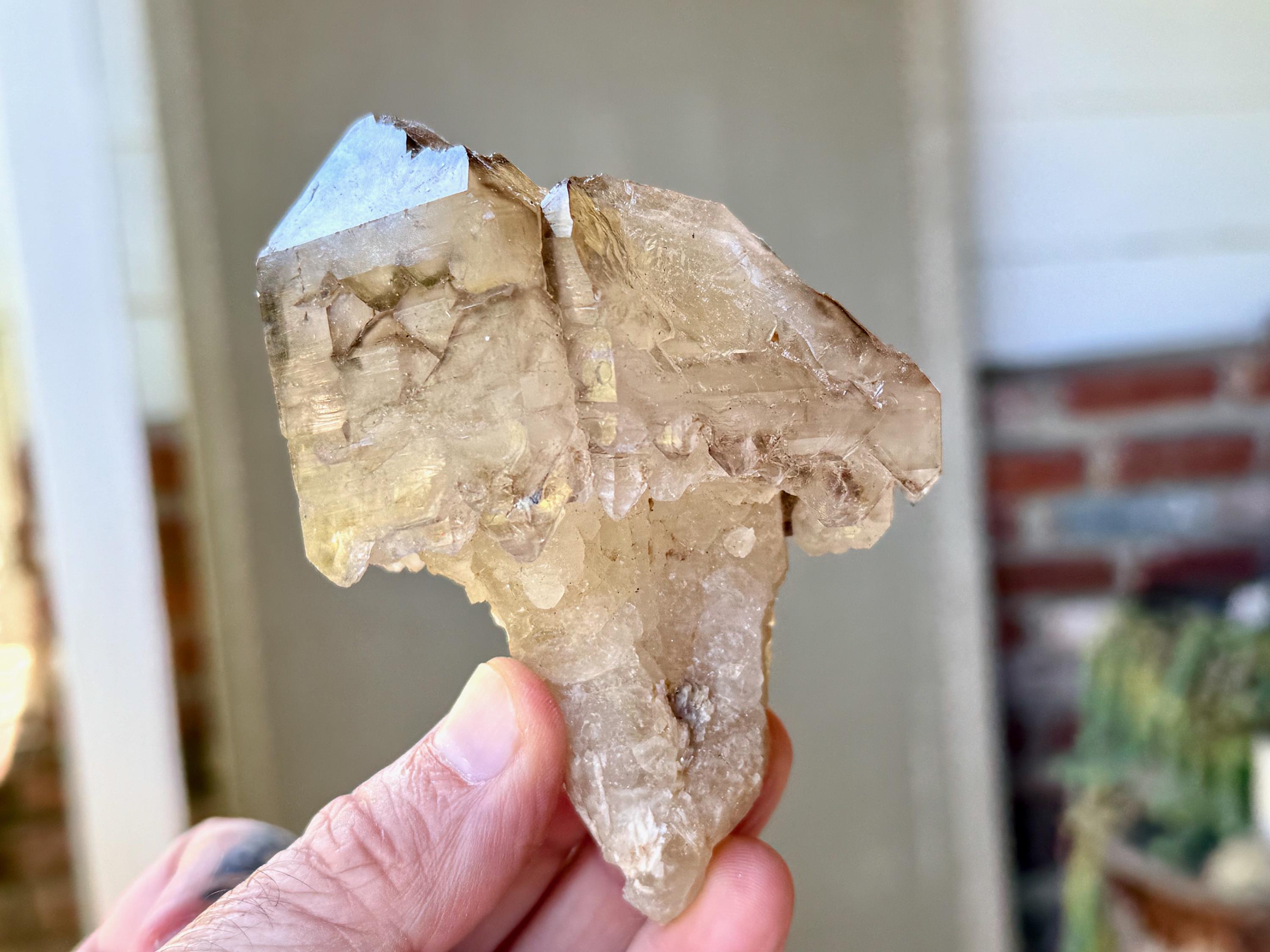 One of the most unusual scepter formations we've ever come across! This is a large and lustrous Elestial Citrine Quartz crystal with mild golden hues and wonderful luster. We love the smoky highlights and textures on the top portion. The mild golden coloring indicates a higher Quartz to Citrine ratio, but there is most certainly Citrine present.