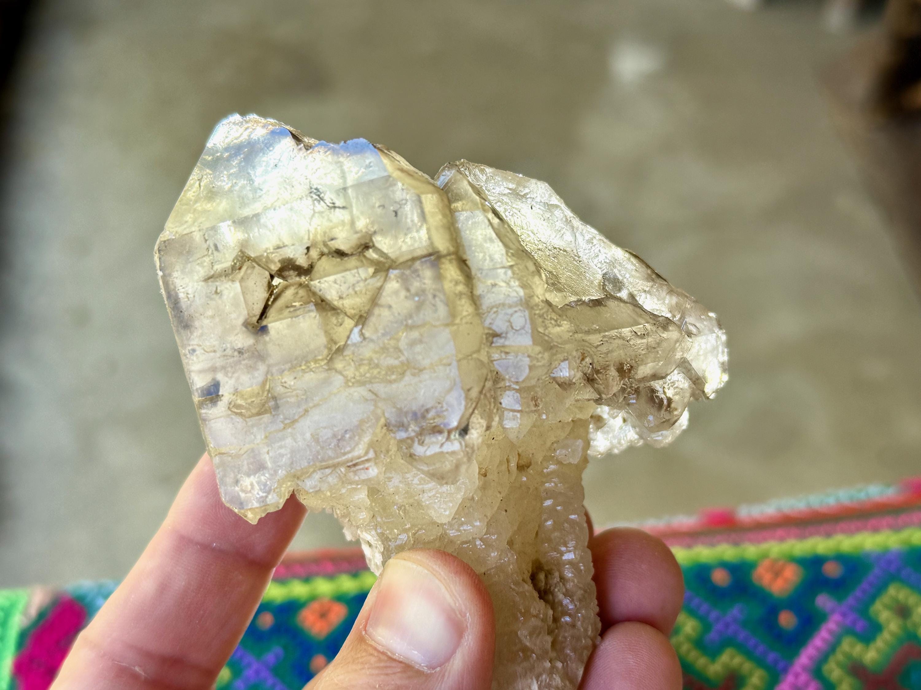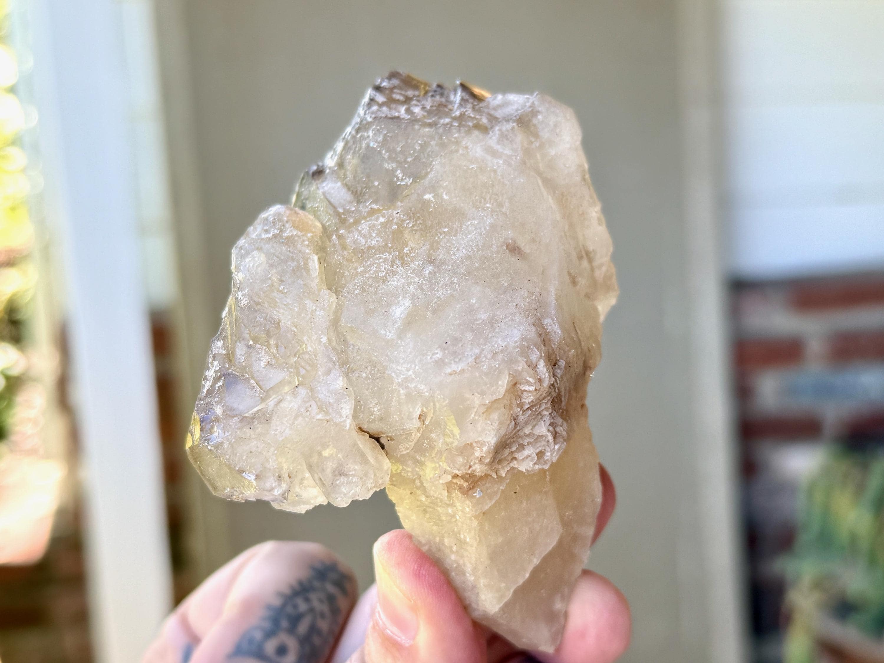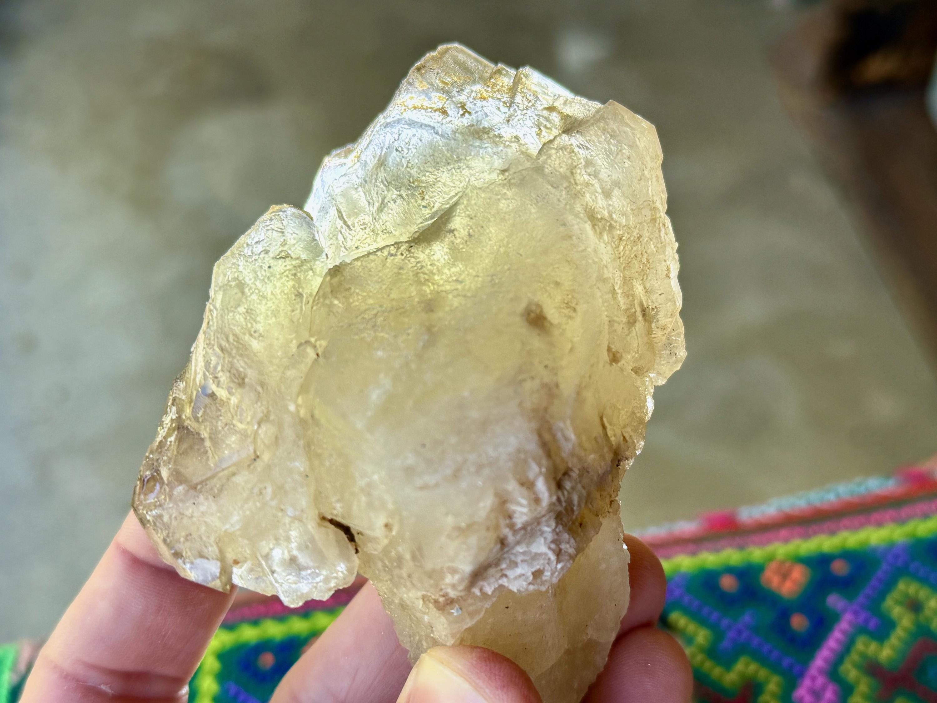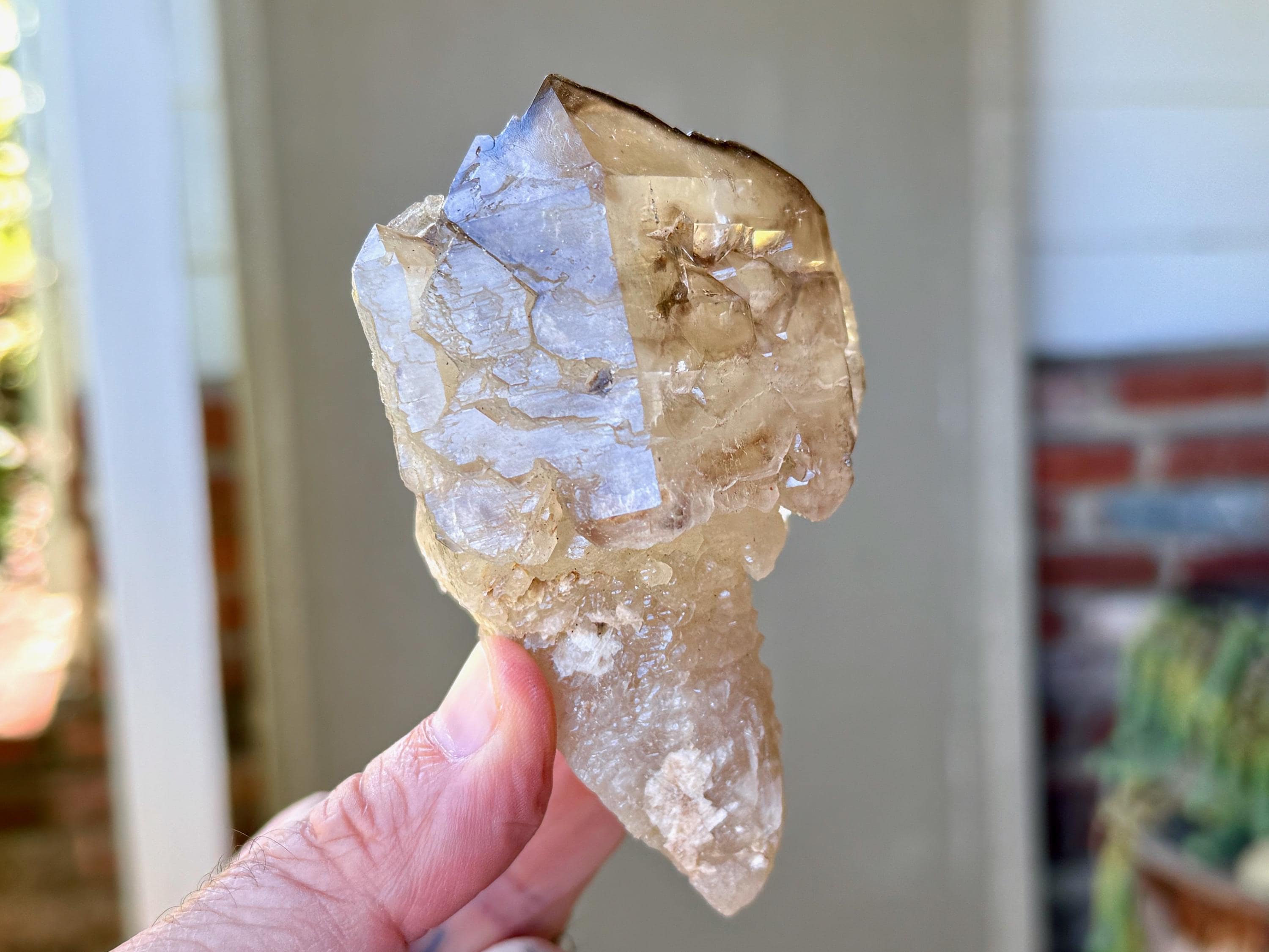 One of the most unusual scepter formations we've ever come across! This is a large and lustrous Elestial Citrine Quartz crystal with mild golden hues and wonderful luster. We love the smoky highlights and textures on the top portion. The mild golden coloring indicates a higher Quartz to Citrine ratio, but there is most certainly Citrine present.