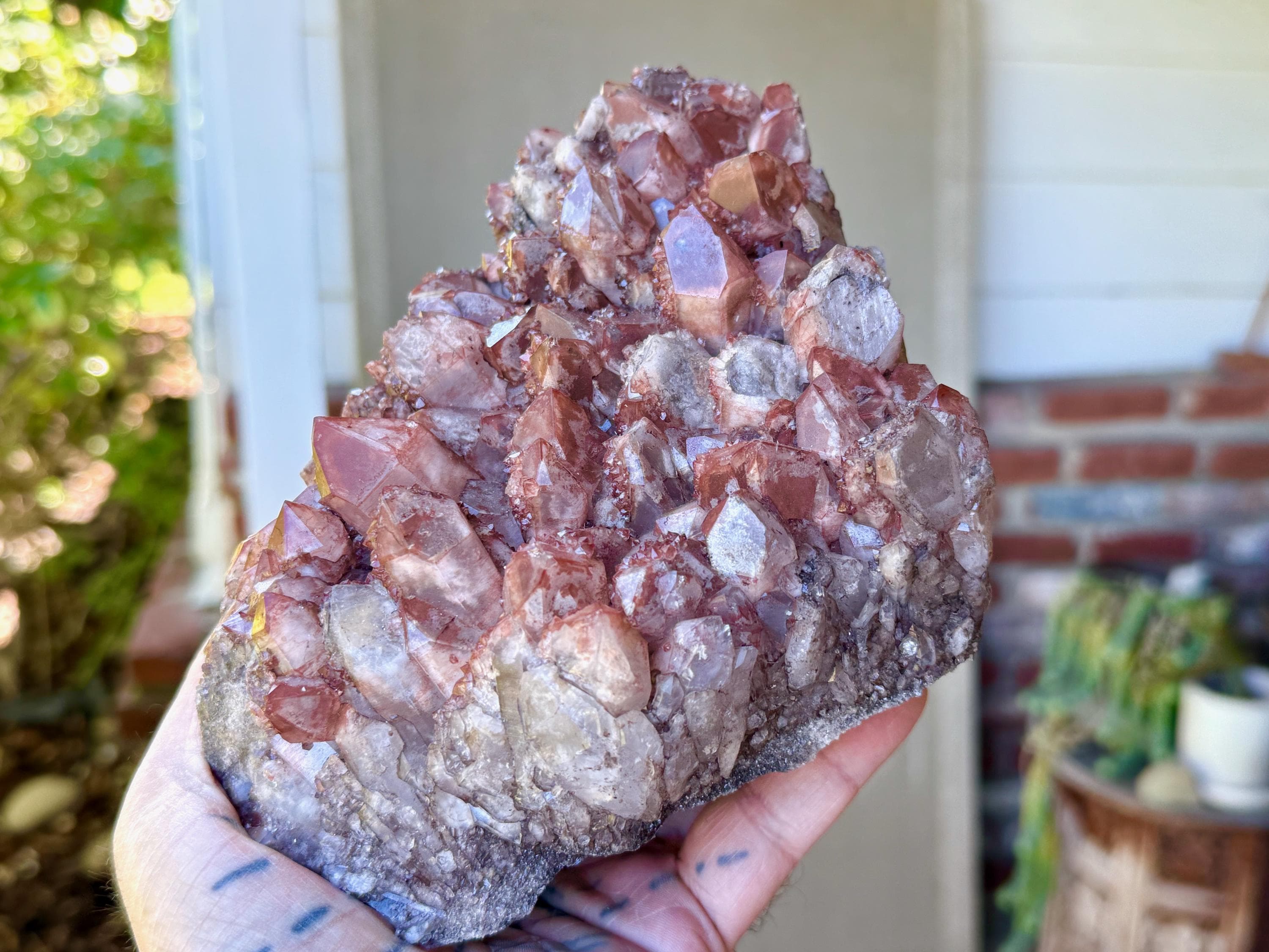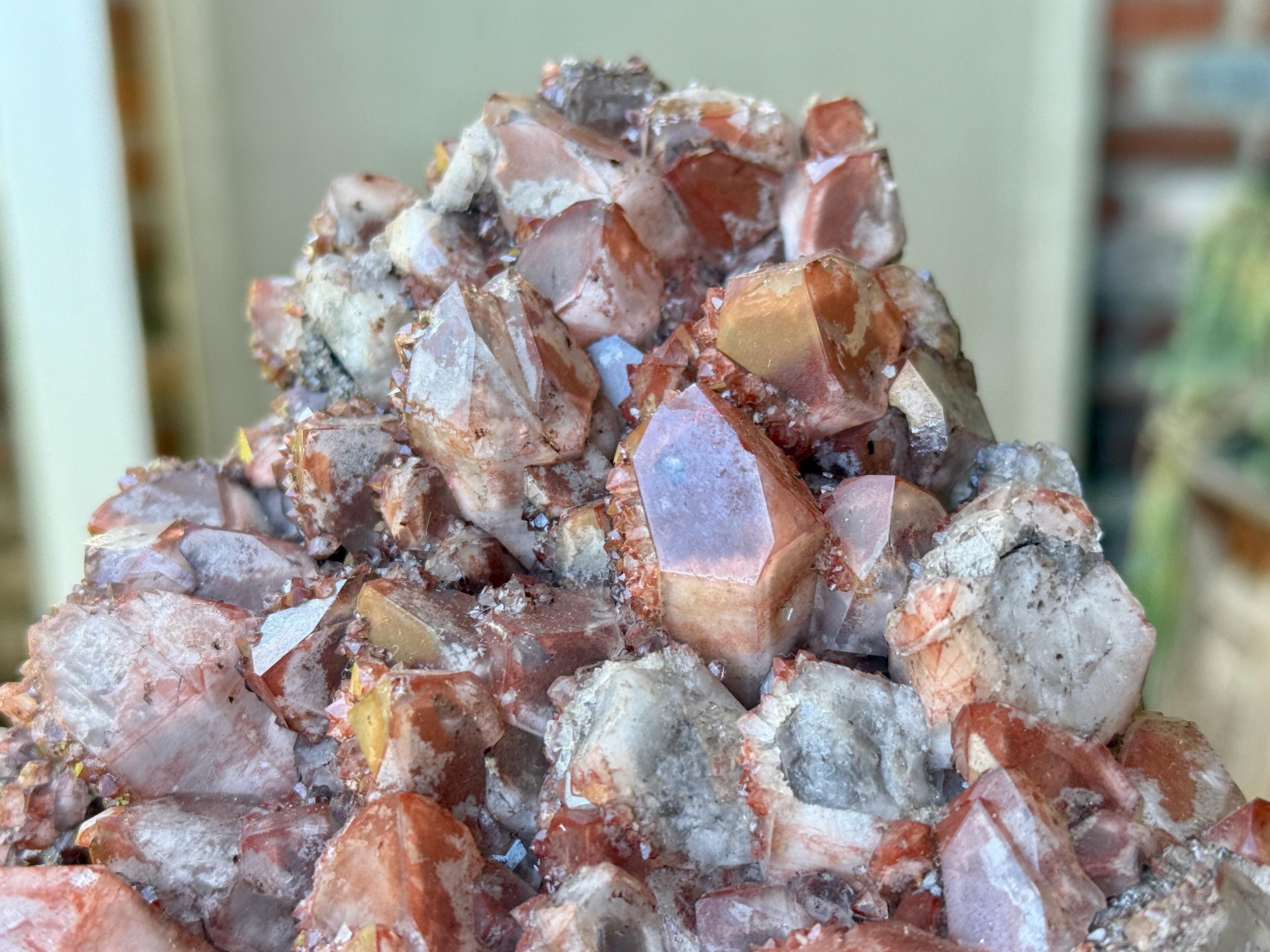 This magnificent Red Hematite Phantom Quartz Cluster with Lithium inclusions comes from a recent find in Minas Gerais, Brazil.