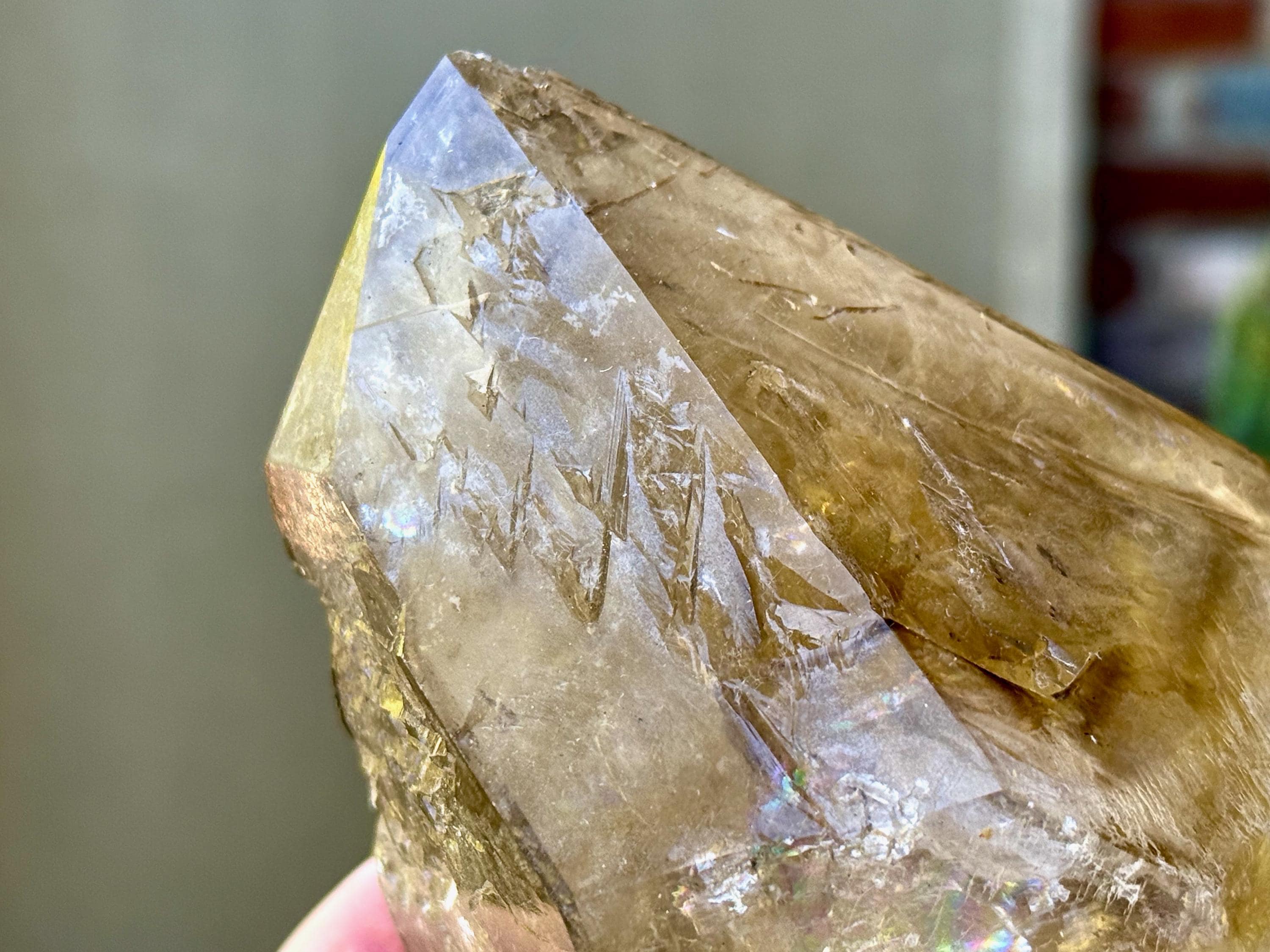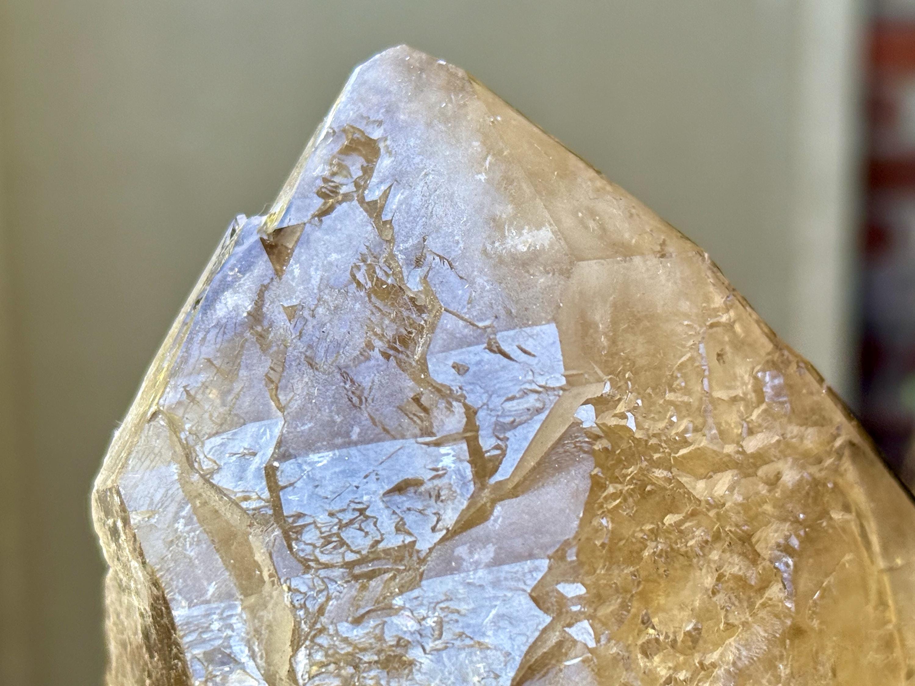 A superb powerhouse of Cathedral Citrine, this massive crystal features brilliant luster and a mild golden hue. This crystal also possesses a giant main facet area that is filled with natural etchings and imprints. In one area, a series of "V" imprints looks a bit trigonic in nature (Photo 4).