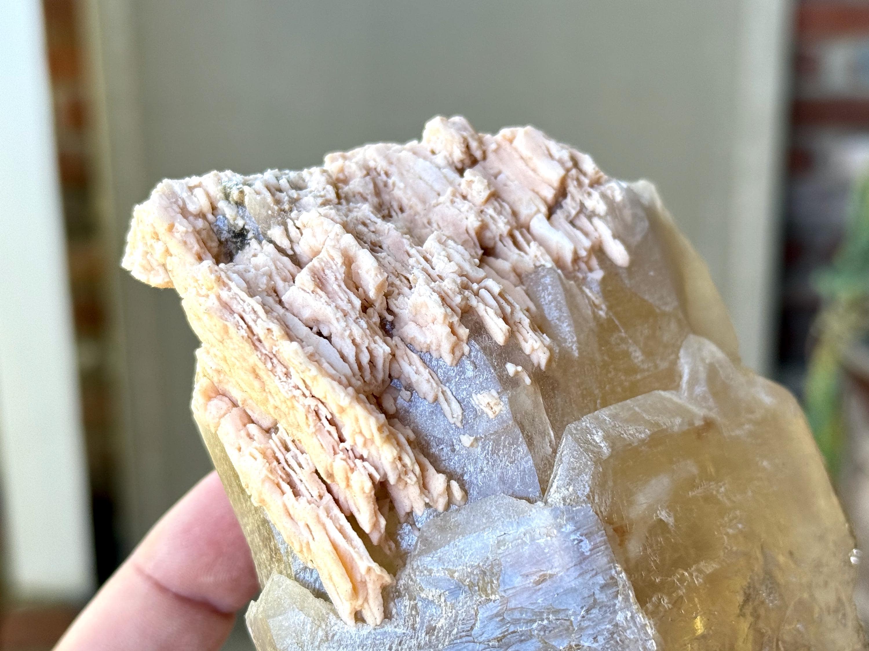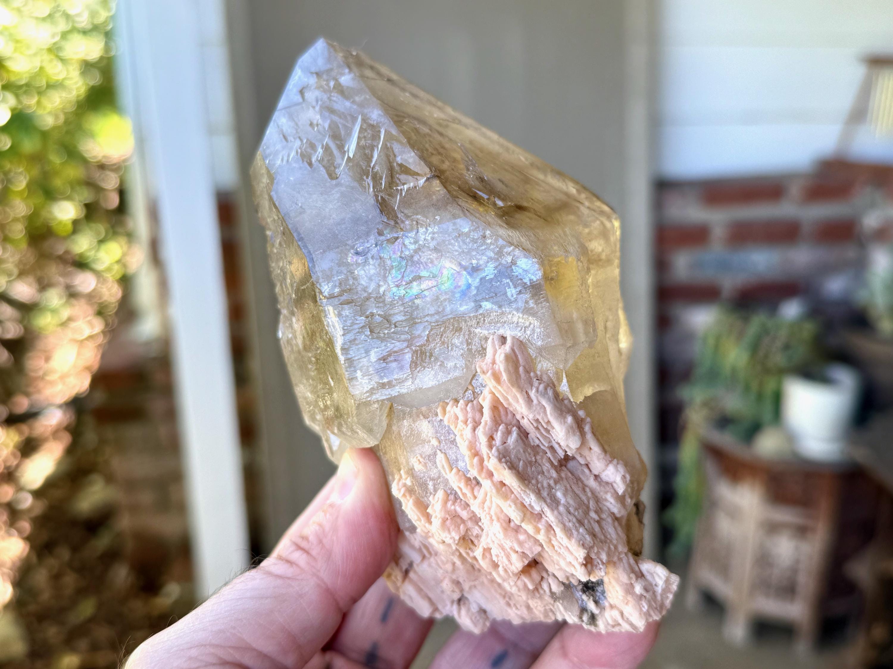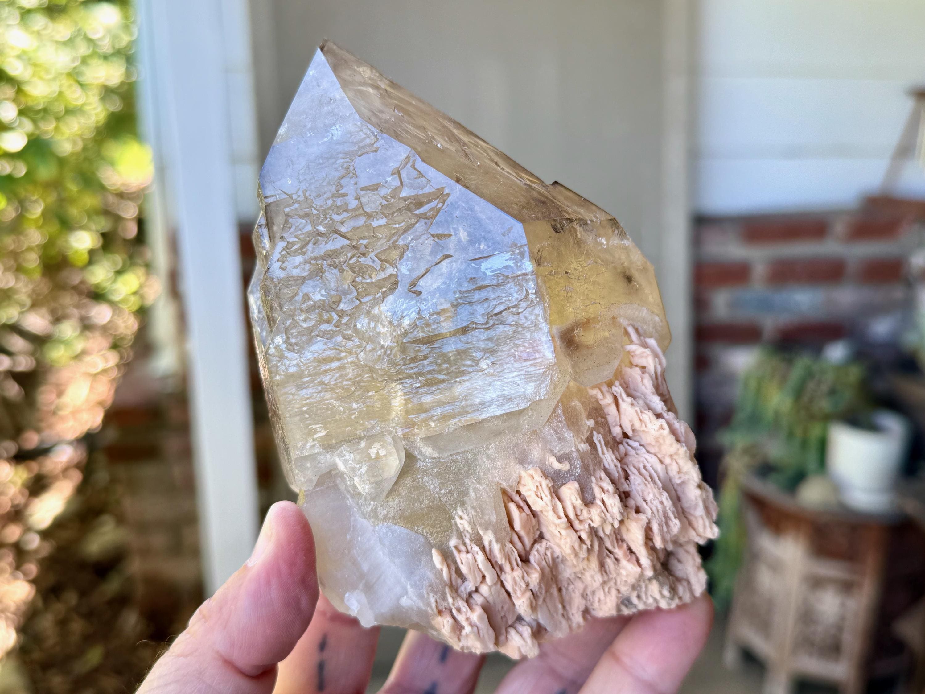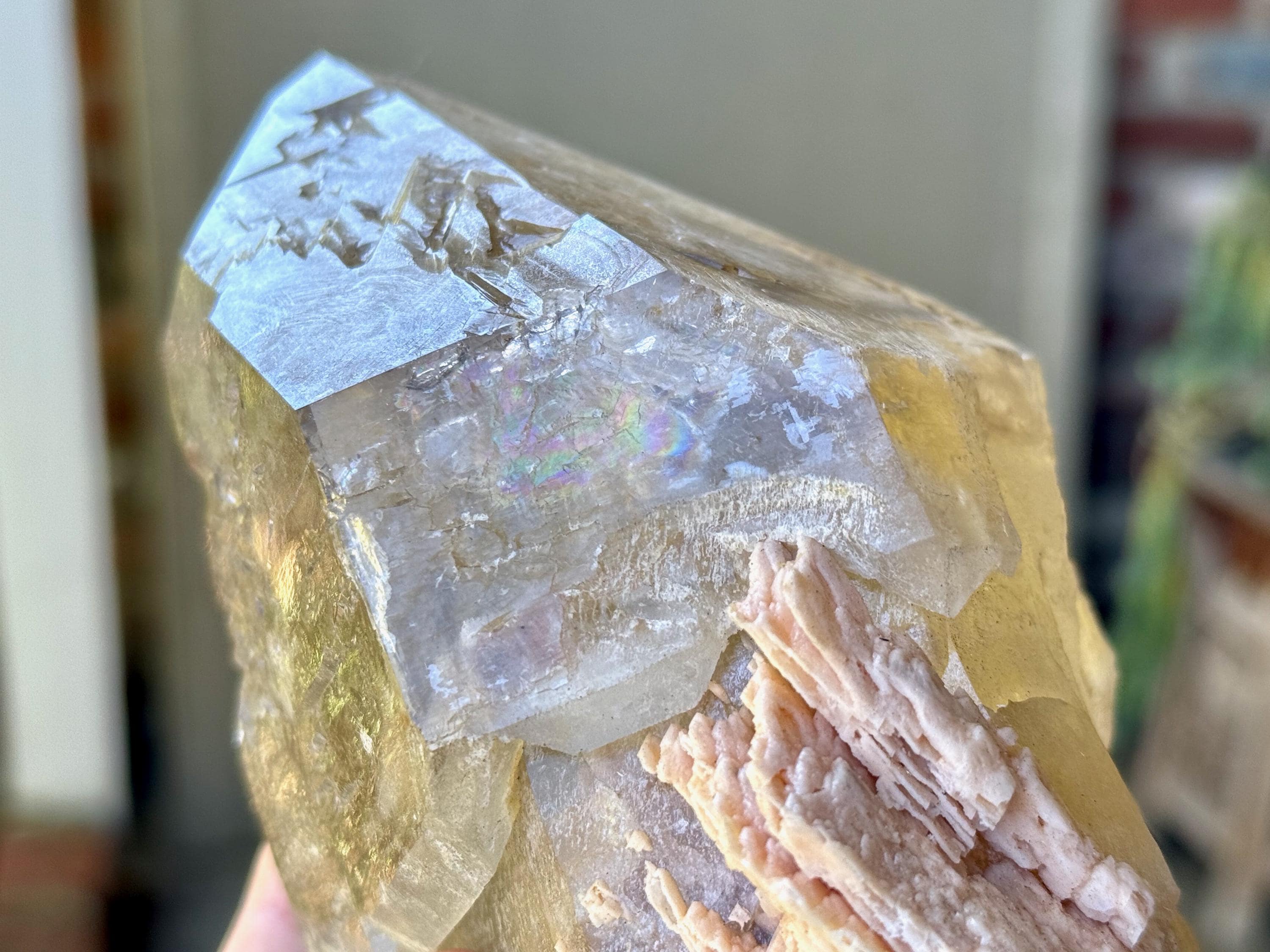 This crystal is one of the largest scepter formations we've ever seen, with a robust "stem" protruding from the base. Attached to the stem is a beautiful inclusion of pink Feldspar on one side.